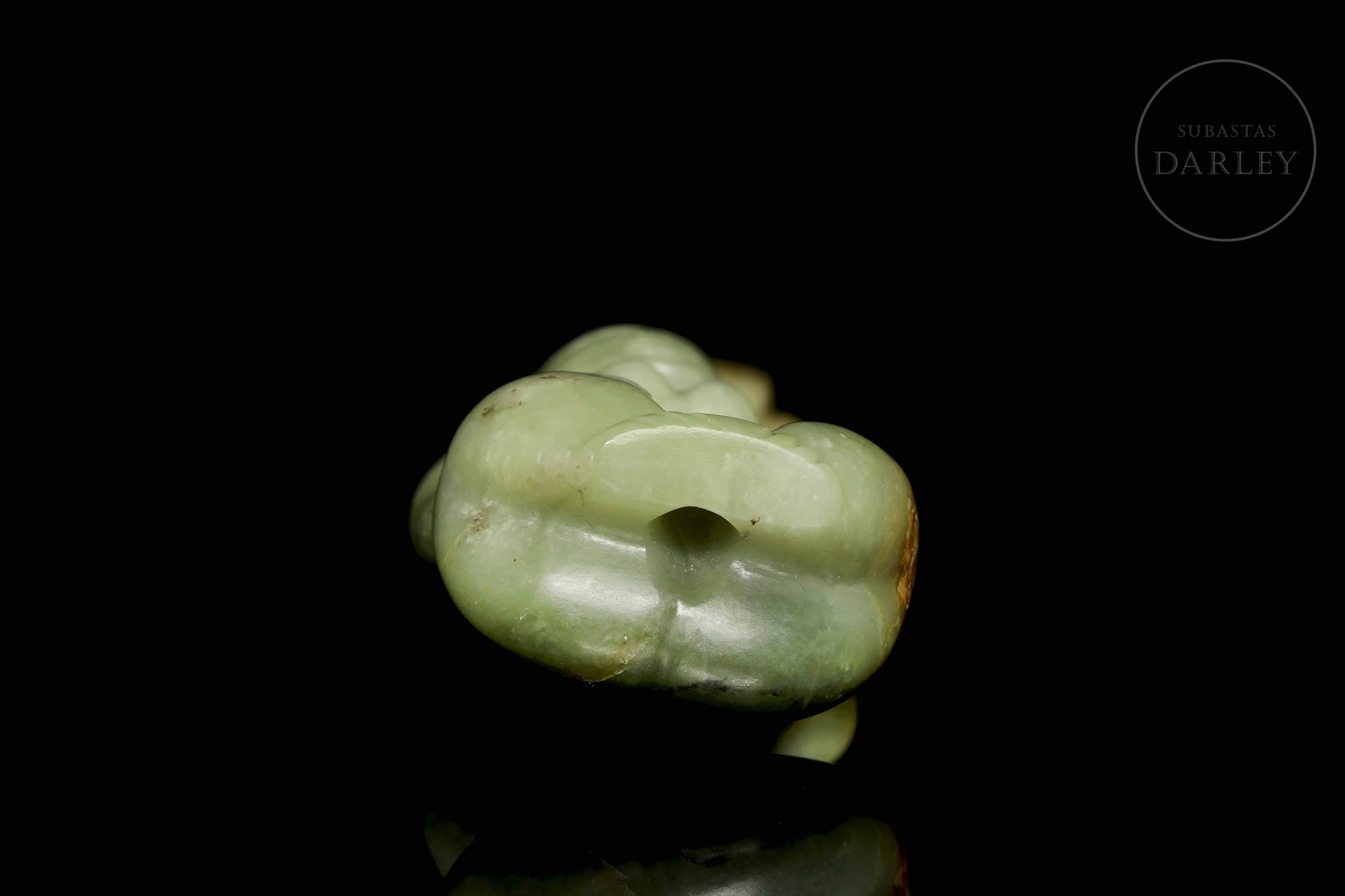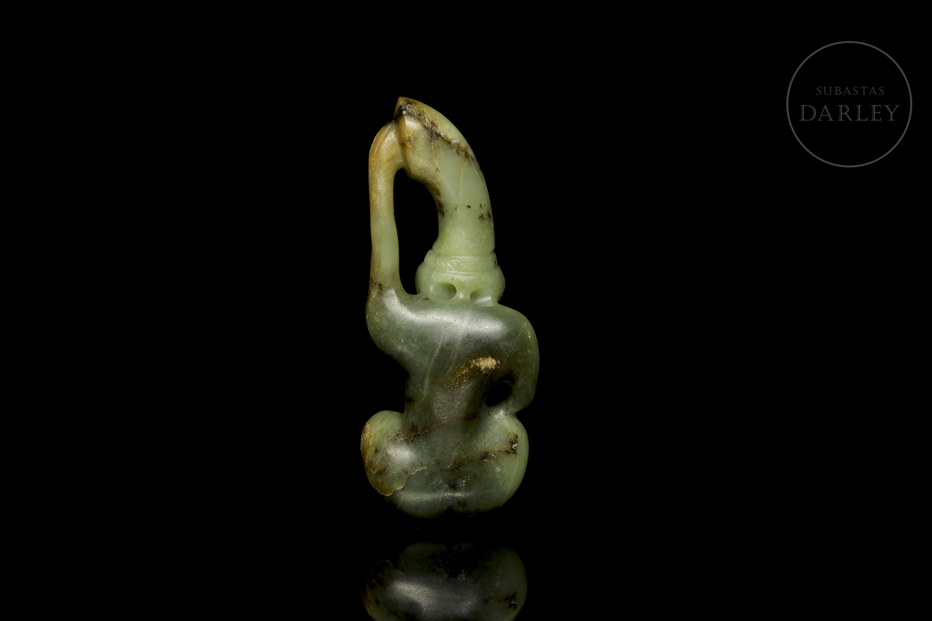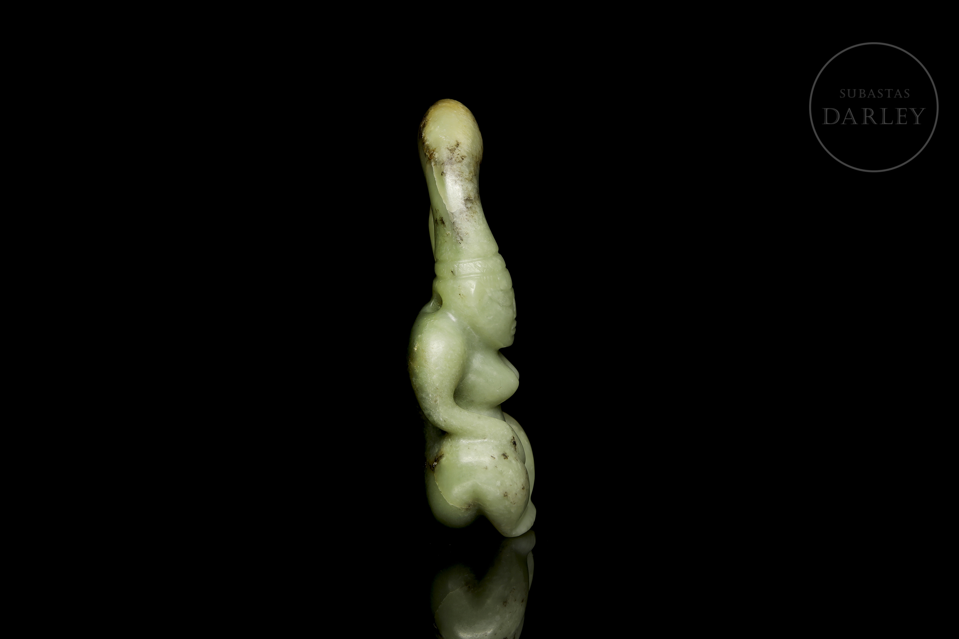 Tallada en jade nefrita natural de tono verde pálido con áreas de ligera translucidez y presencia de pátina de tonos ocre. La pieza representa una figura femenina en posición sedente, con una anatomía estilizada y un tocado prominente y curvado. Presenta rasgos faciales esquemáticos, senos marcados y un brazo descansando sobre las piernas. Cultura Hongshan (aprox. 4000–3000 a.C.) o posterior.