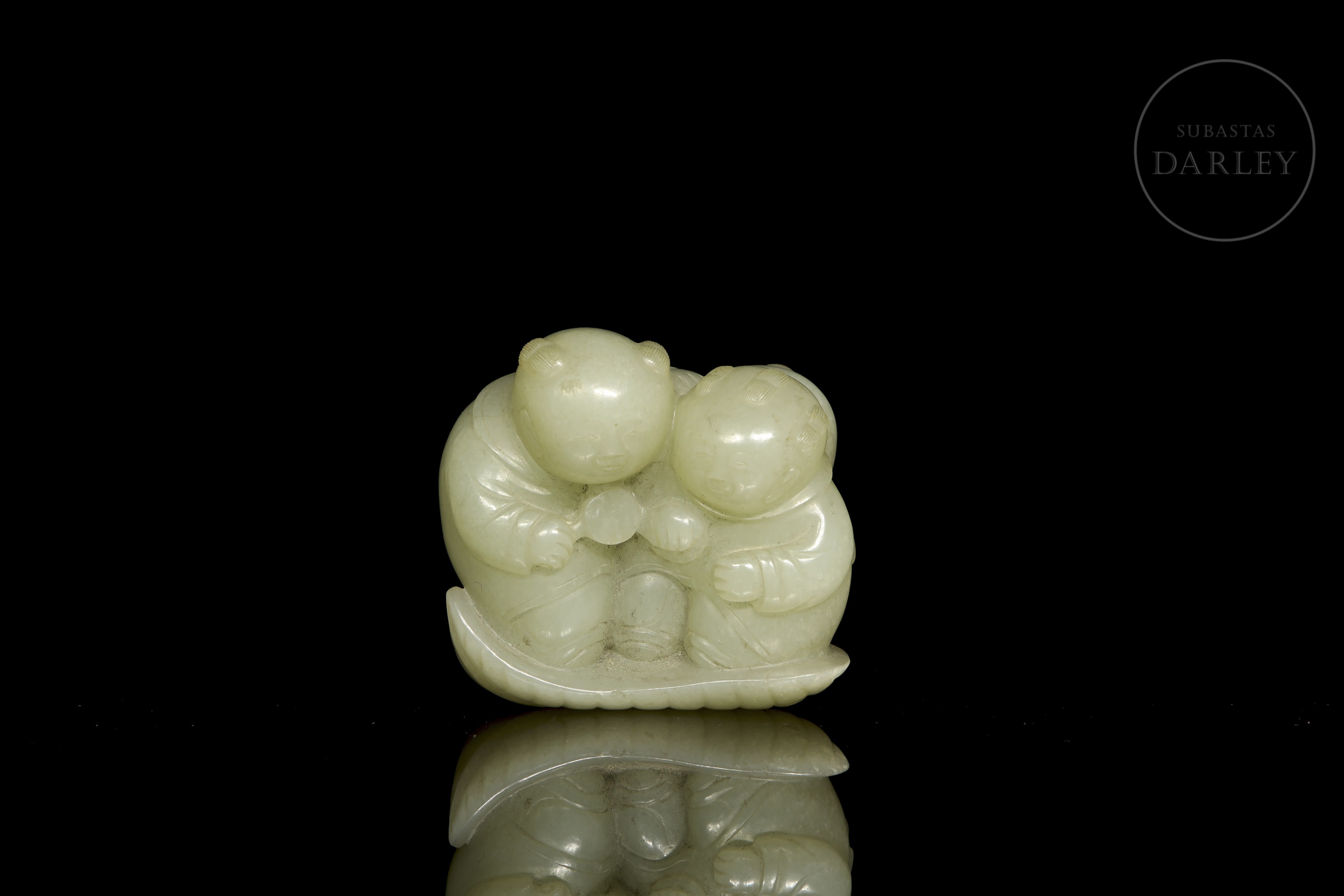 Figura tallada de jade de color blanco cremoso. Se encuentra adornada por un grupo de dos niños o hehe erxian, sentados, en pose de íntima proximidad. La decoración muestra a los niños con cabezas grandes y rostros regordetes característicos, vestidos con túnicas ligeras, sosteniendo un objeto entre ellos. Dinastía Qing (1644–1912).