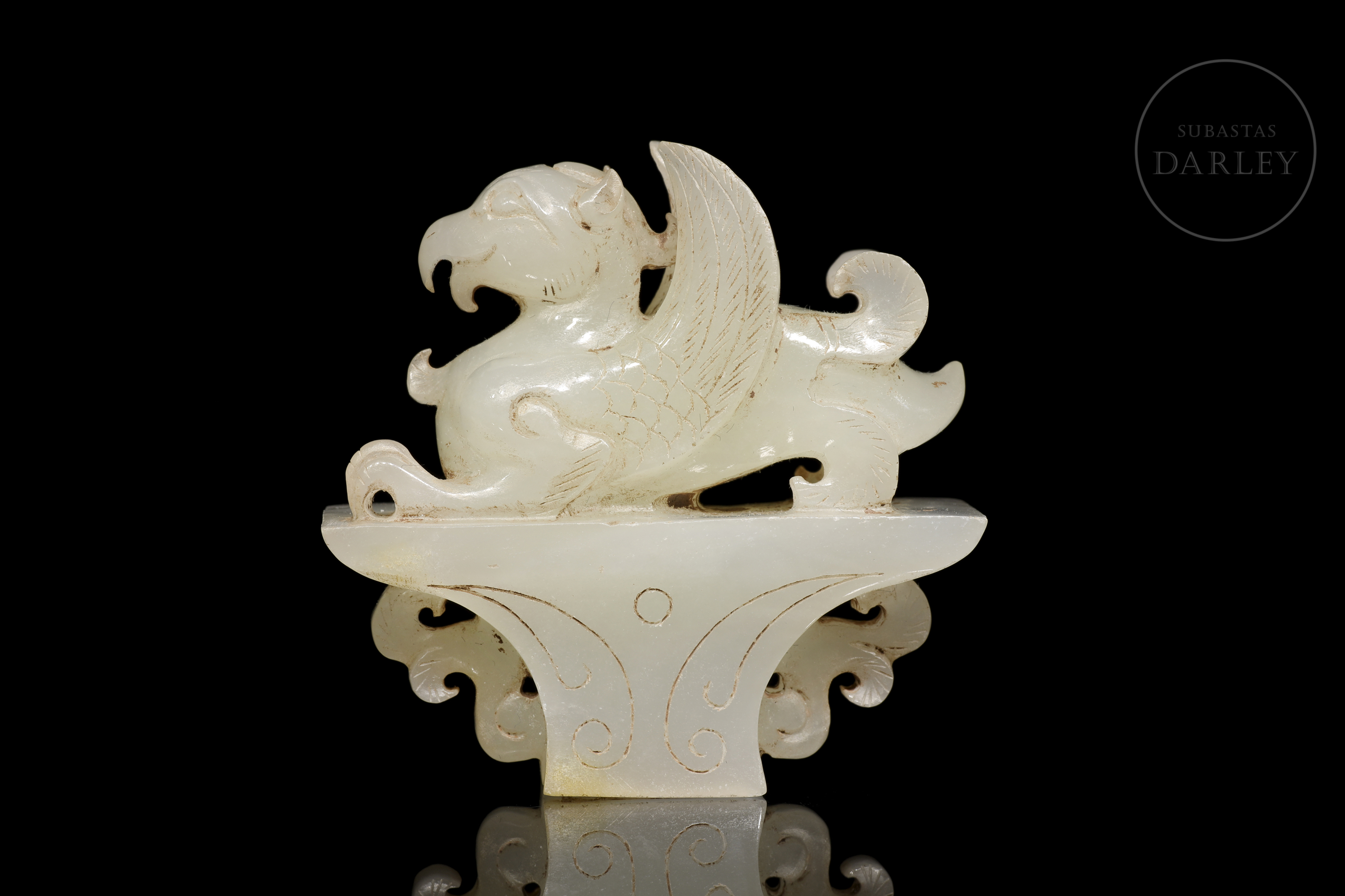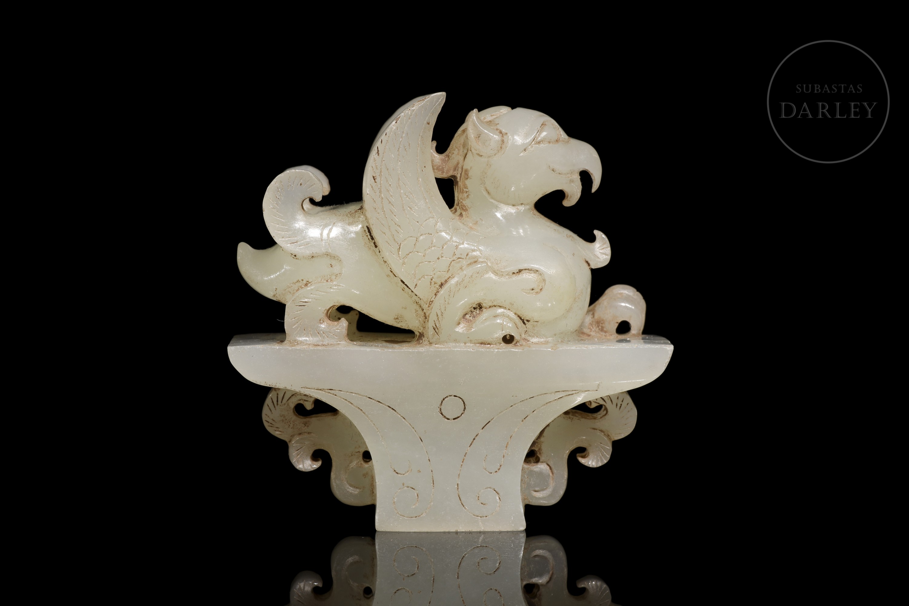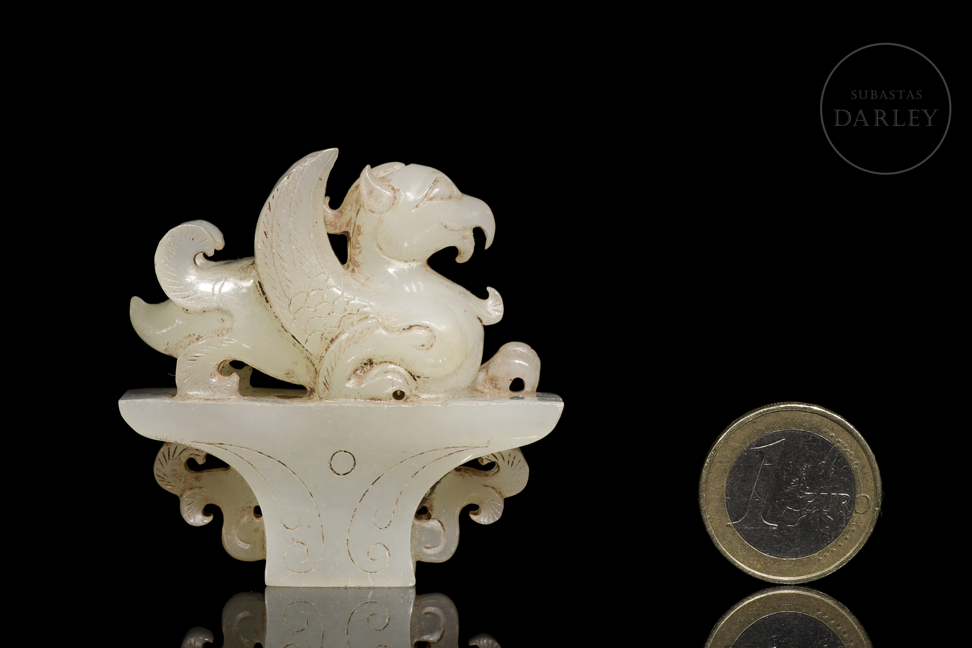 Jade tallado de tonalidad clara con ligeras manchas rojizas. Muestra sobre una base trapezoidal adornada con volutas incisas y dos finas asas laterales caladas, la imagen de una majestuosa ave fénix con las patas flexionadas mirando al frente, las alas extendidas y dispuestas sobre el cuerpo, una cola sinuosa y un afilado pico curvado. Dinastía Han del Oeste (206 a.C. - 25 d.C.).