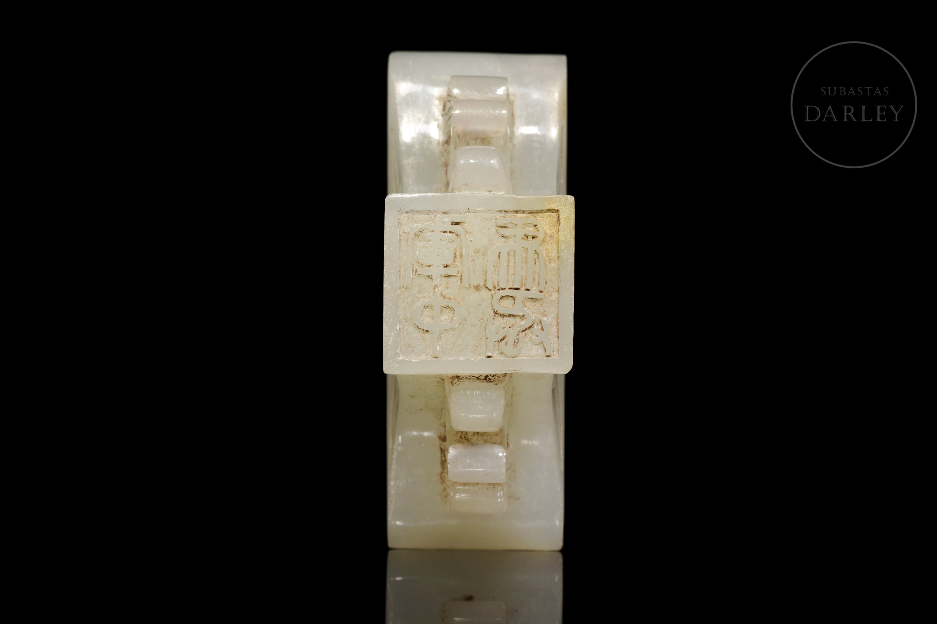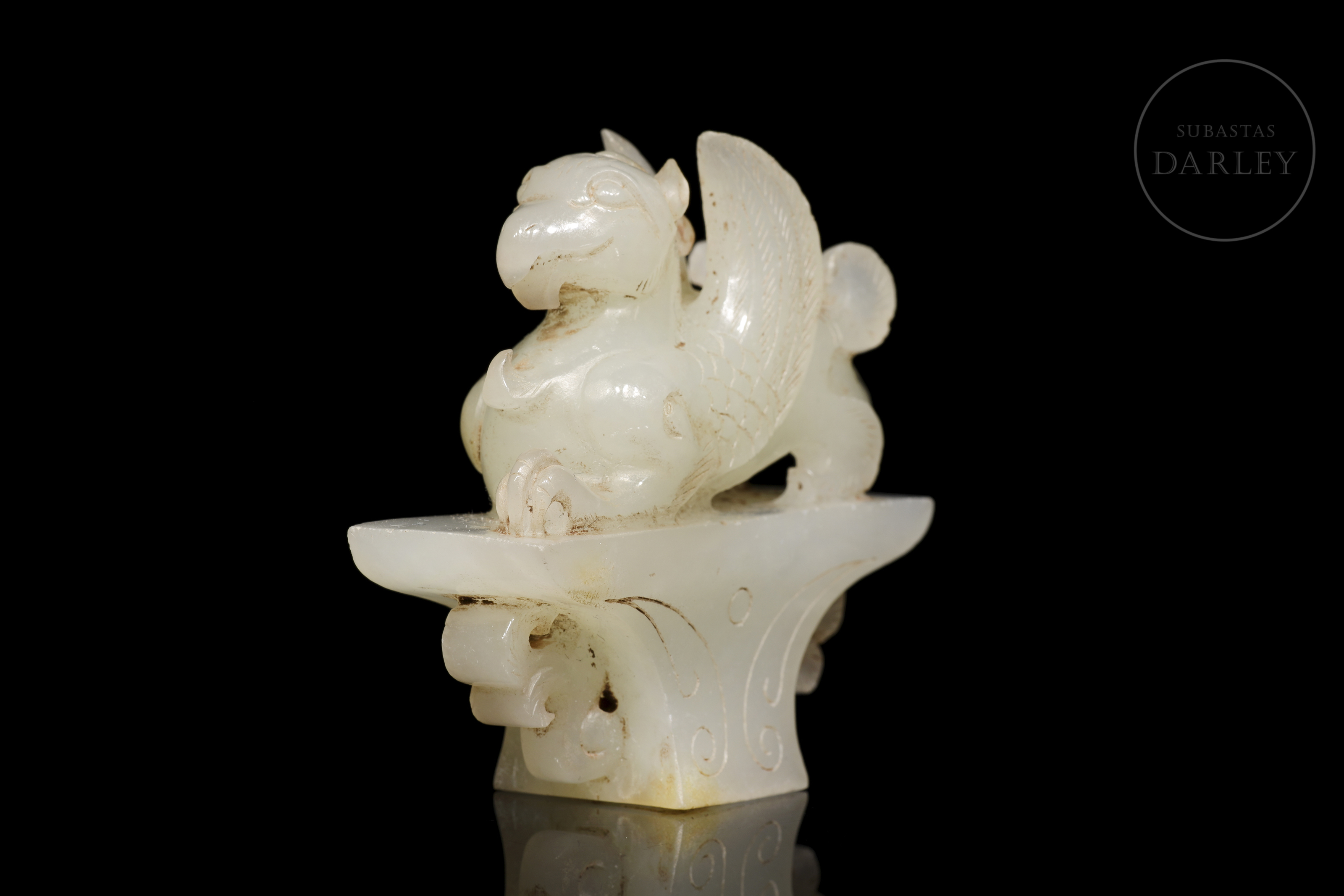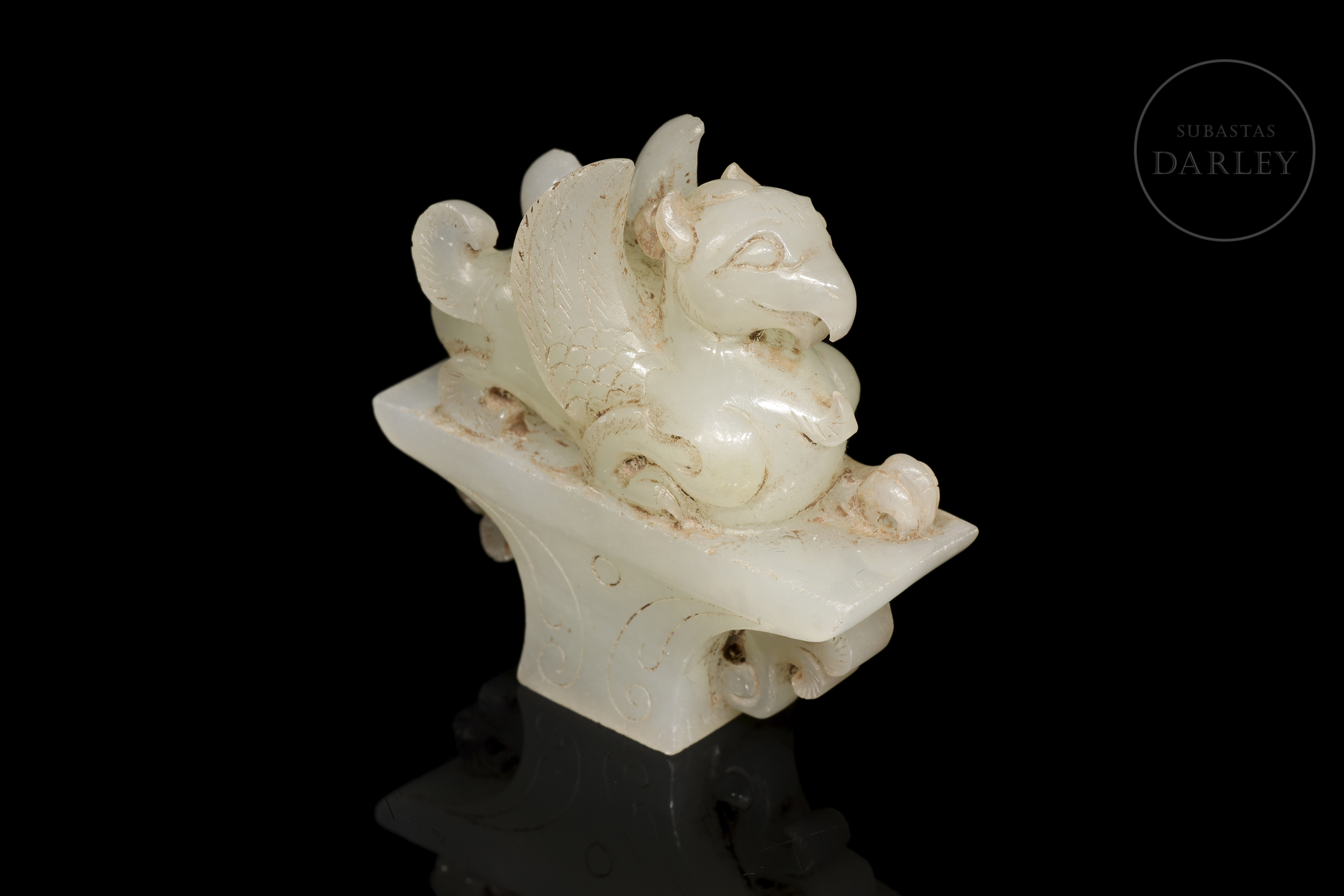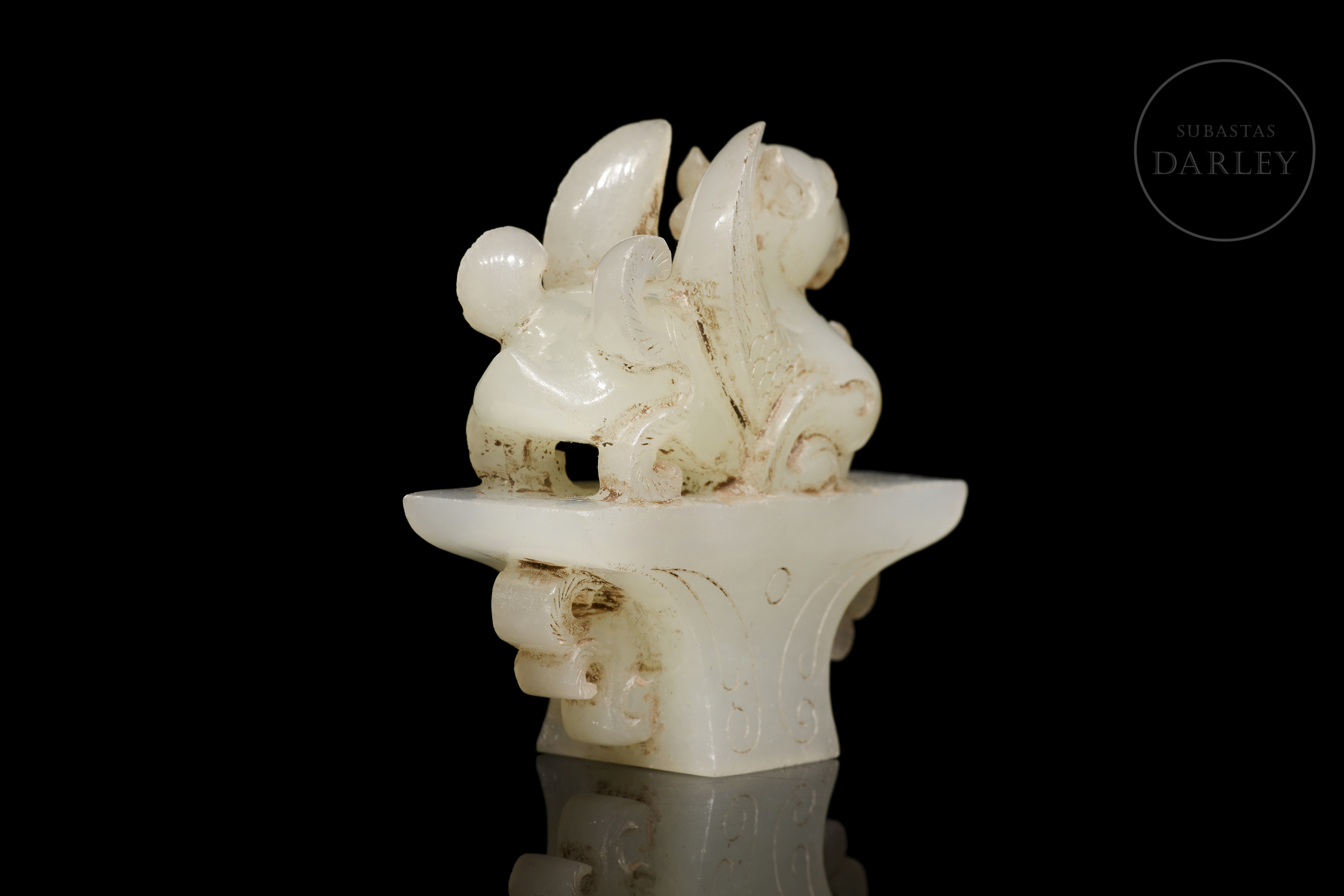 Jade tallado de tonalidad clara con ligeras manchas rojizas. Muestra sobre una base trapezoidal adornada con volutas incisas y dos finas asas laterales caladas, la imagen de una majestuosa ave fénix con las patas flexionadas mirando al frente, las alas extendidas y dispuestas sobre el cuerpo, una cola sinuosa y un afilado pico curvado. Dinastía Han del Oeste (206 a.C. - 25 d.C.).