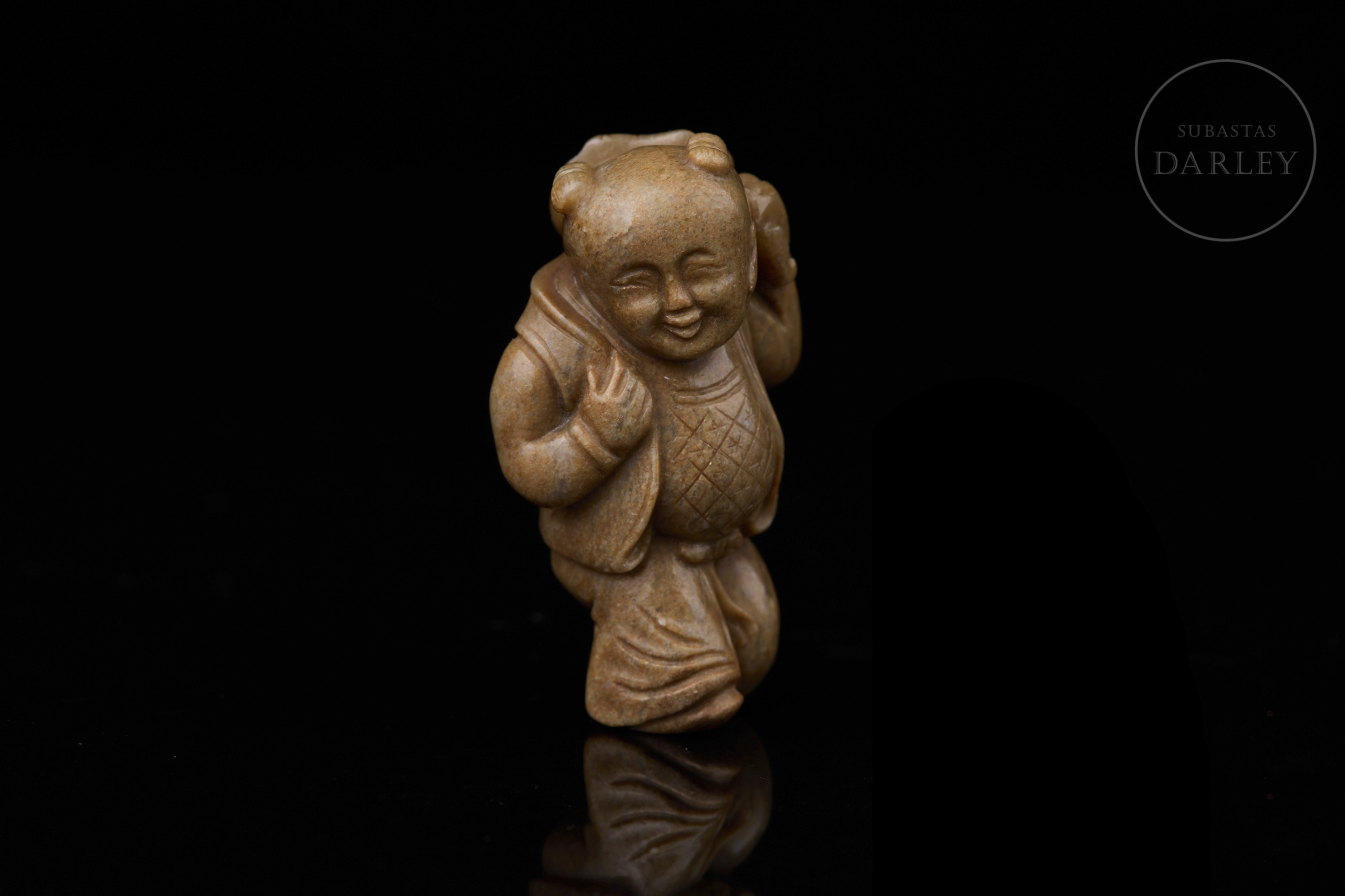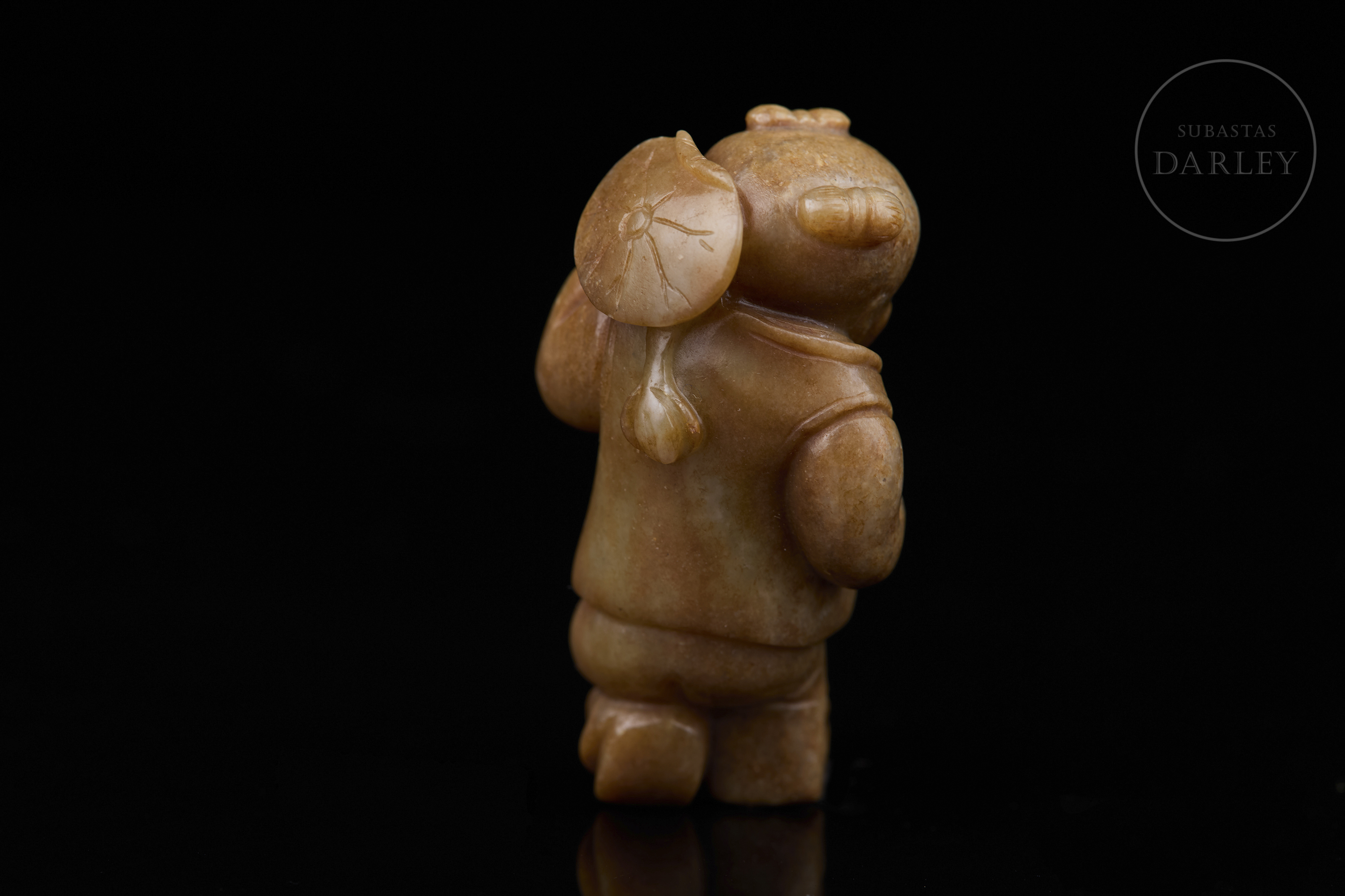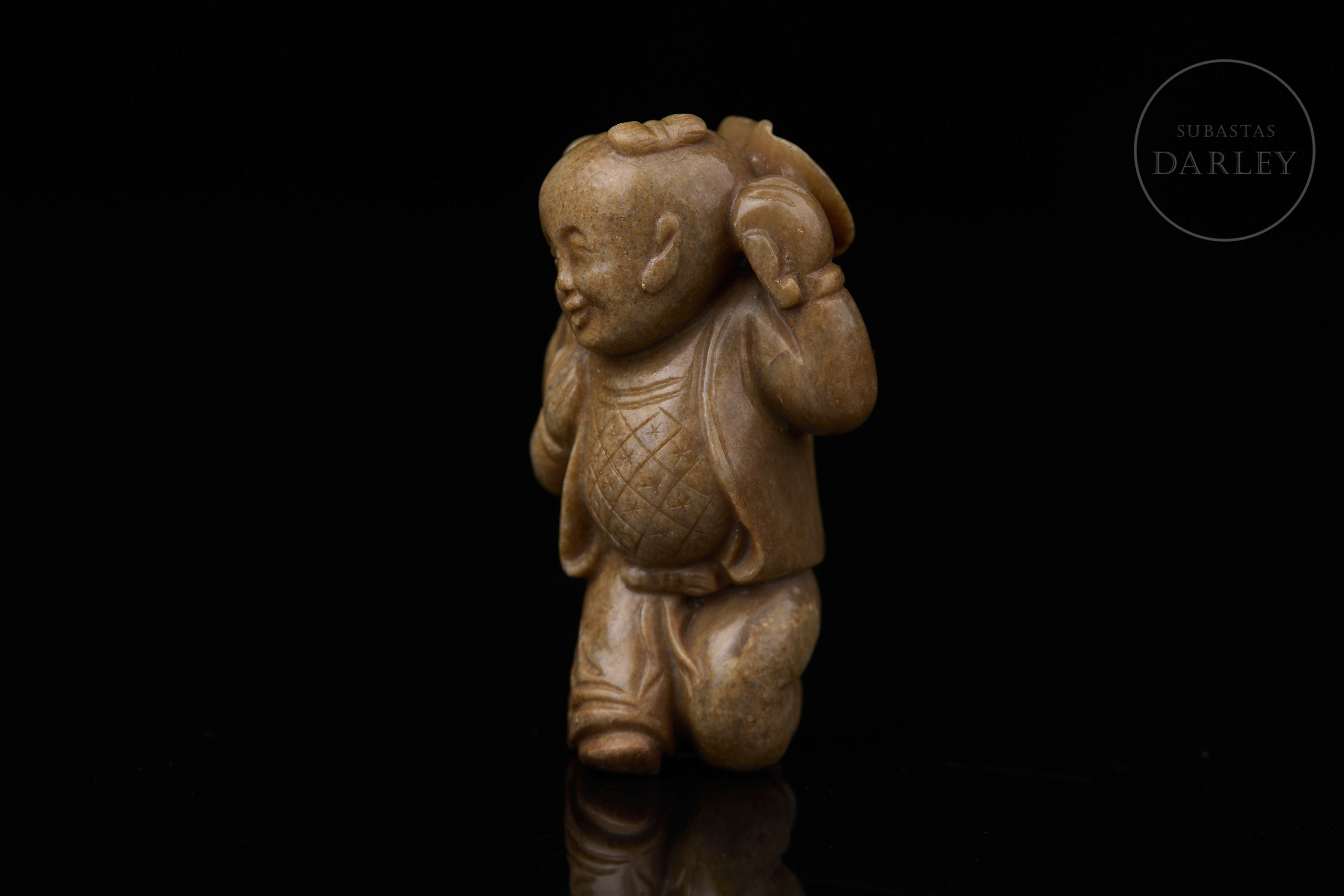 Figura tallado de jade de color marrón rojizo con vetas oscuras y muestras de pátina por antigüedad. Muestra la figura de un niño sonriente de cuerpo robusto y cabeza inclinada, cargando un loto sobre el hombro. Está decorado con relieves y líneas sinuosas que detallan la vestimenta y expresión alegre. Dinastía Ming (1368-1644).