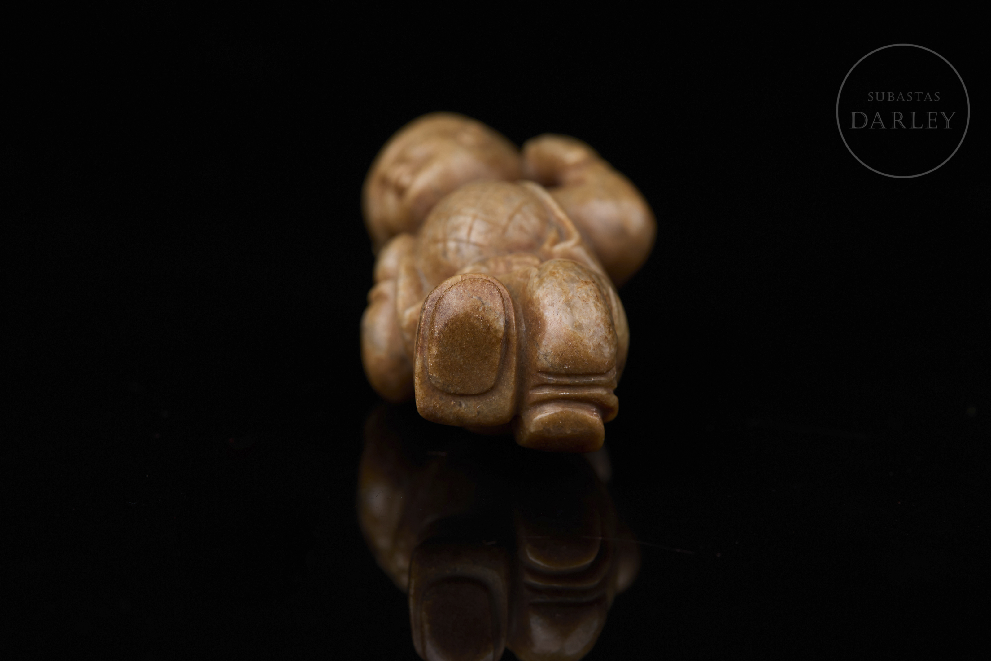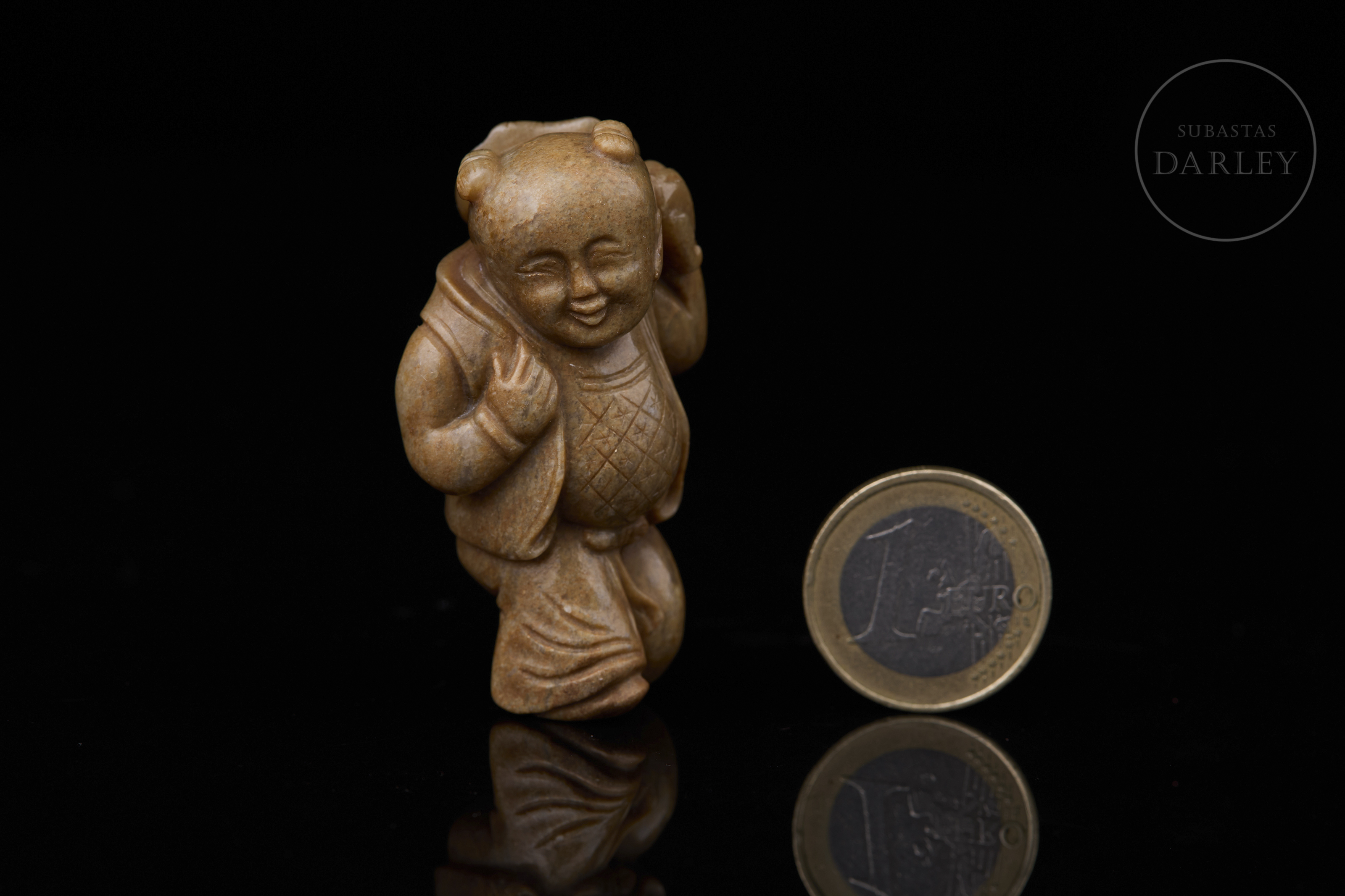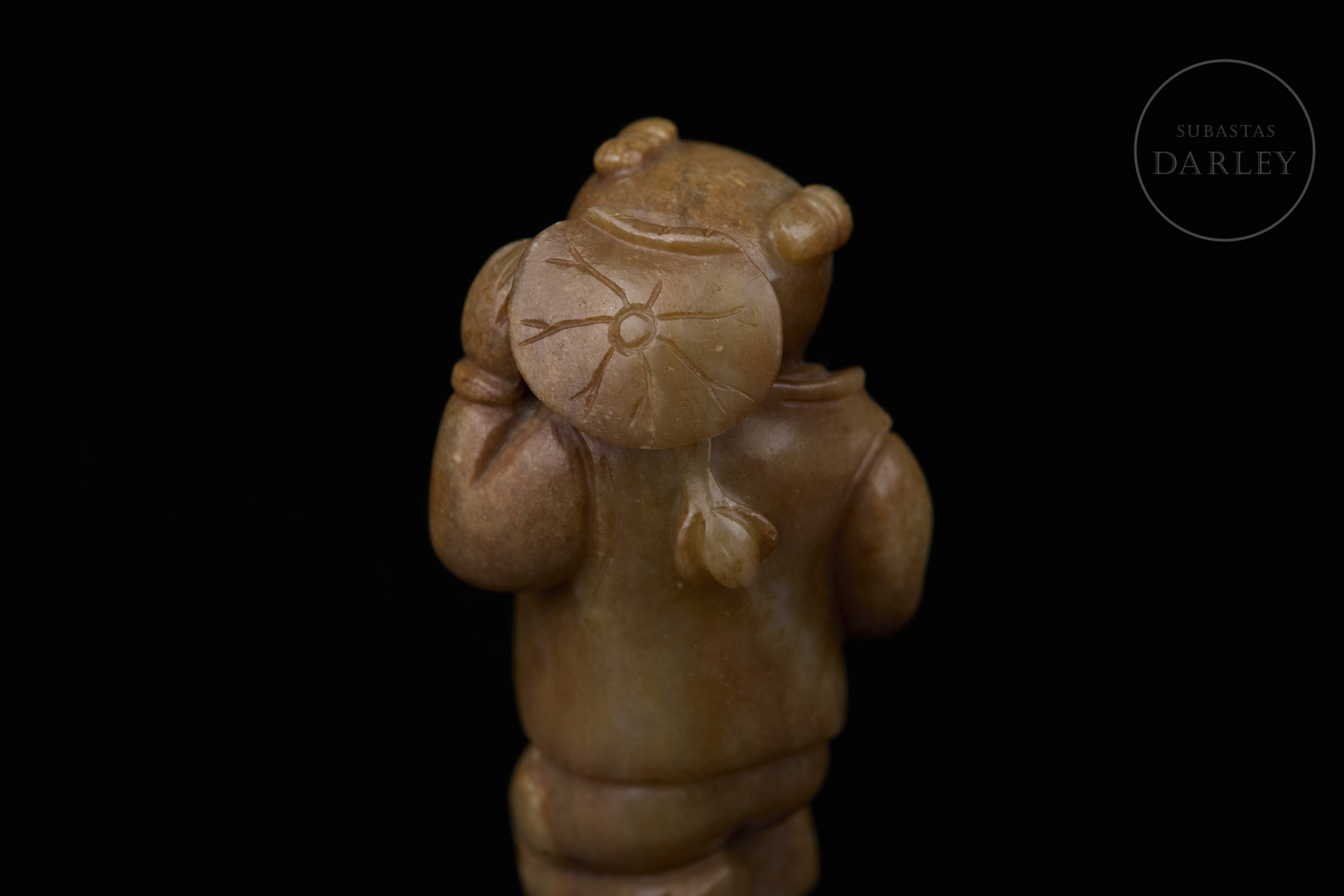 Figura tallado de jade de color marrón rojizo con vetas oscuras y muestras de pátina por antigüedad. Muestra la figura de un niño sonriente de cuerpo robusto y cabeza inclinada, cargando un loto sobre el hombro. Está decorado con relieves y líneas sinuosas que detallan la vestimenta y expresión alegre. Dinastía Ming (1368-1644).