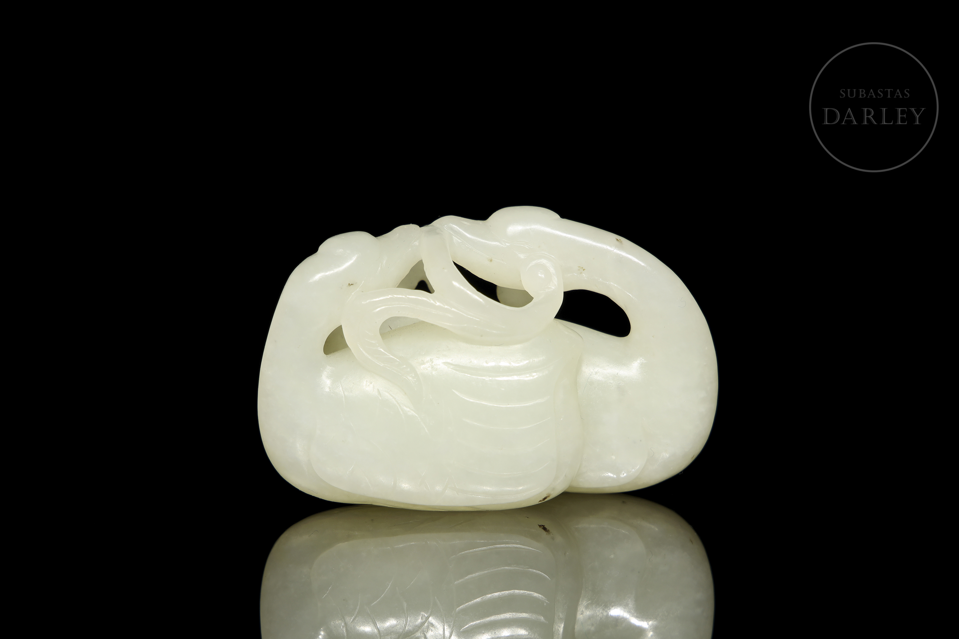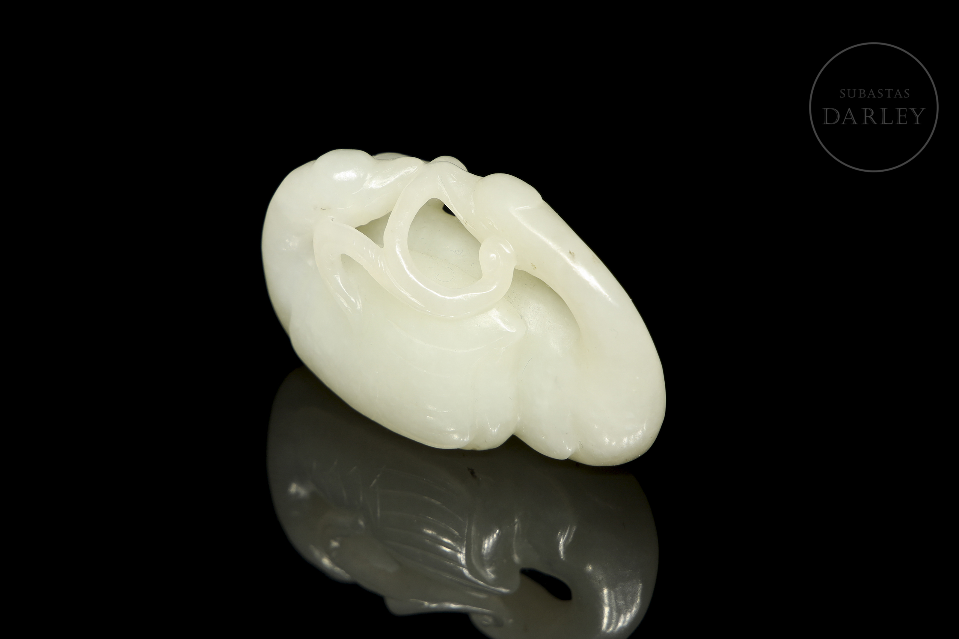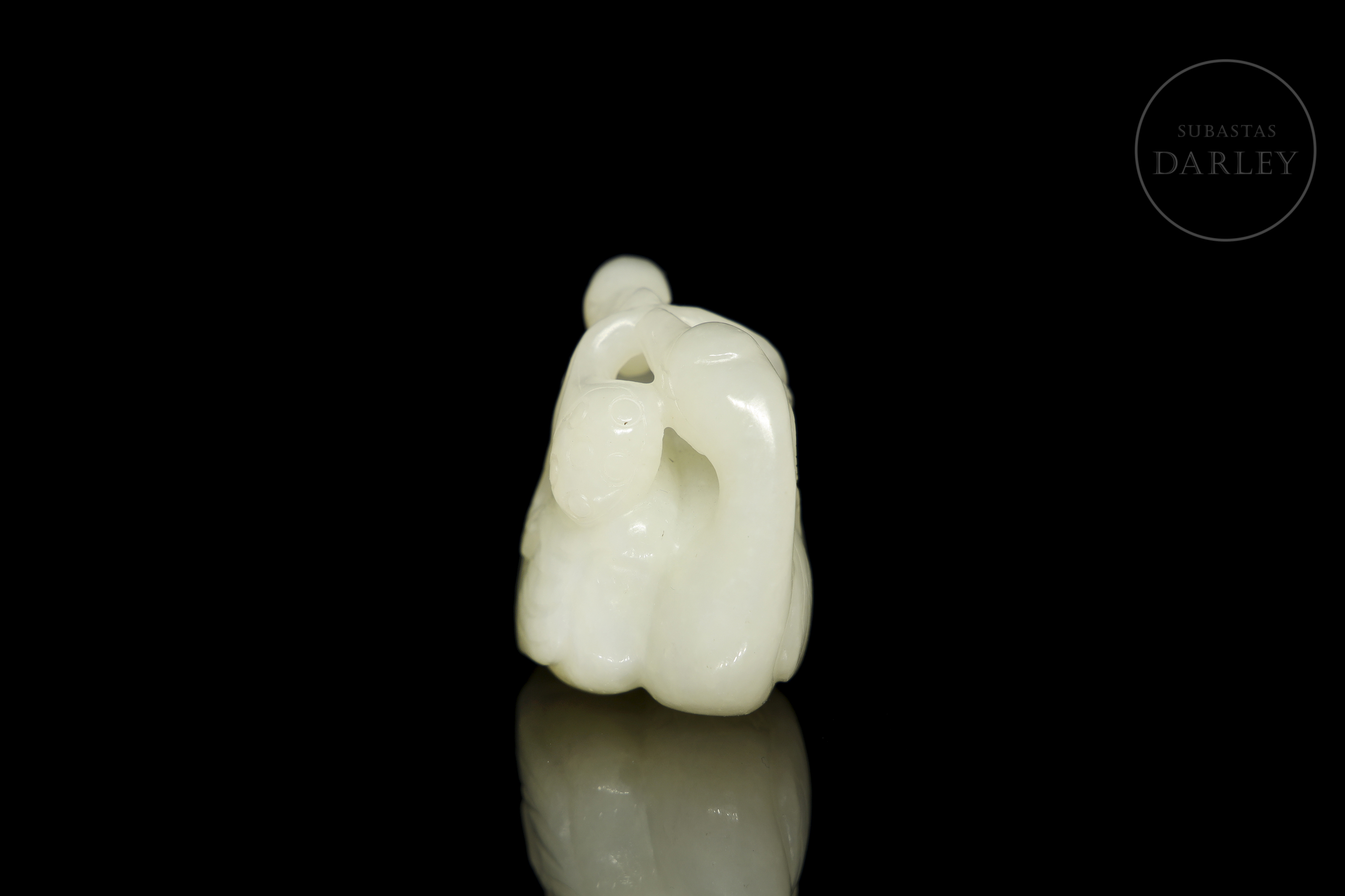 Figura de bulto redondo tallada en jade blanco con un suave acabado pulido. La composición muestra una pareja de ocas en reposo, una junto a la otra, y una de ellas con la cabeza vuelta sobre su lomo, ambas con el pico unido sosteniendo una rama. Este es un potente emblema de fidelidad conyugal y felicidad duradera en el matrimonio.