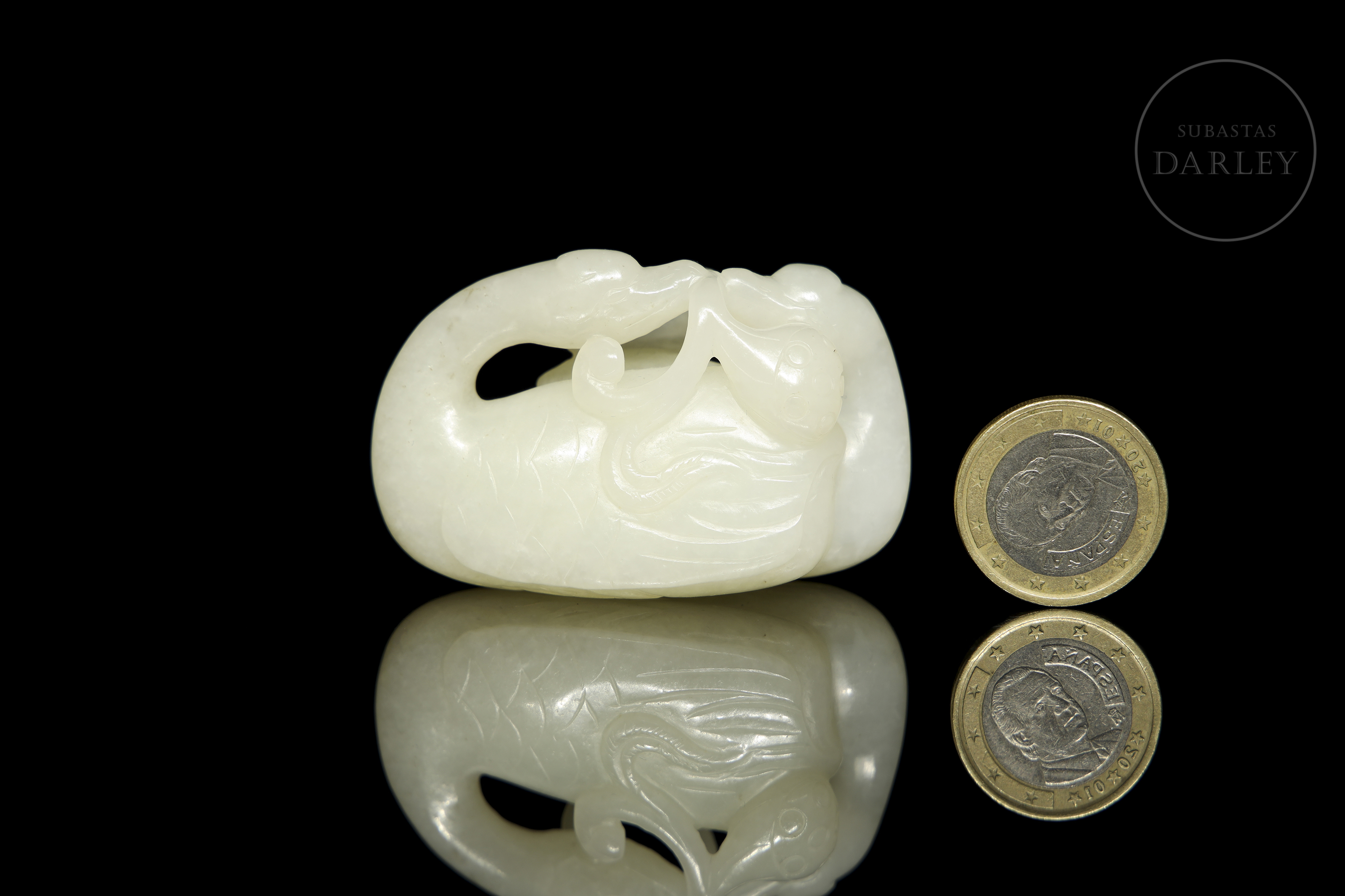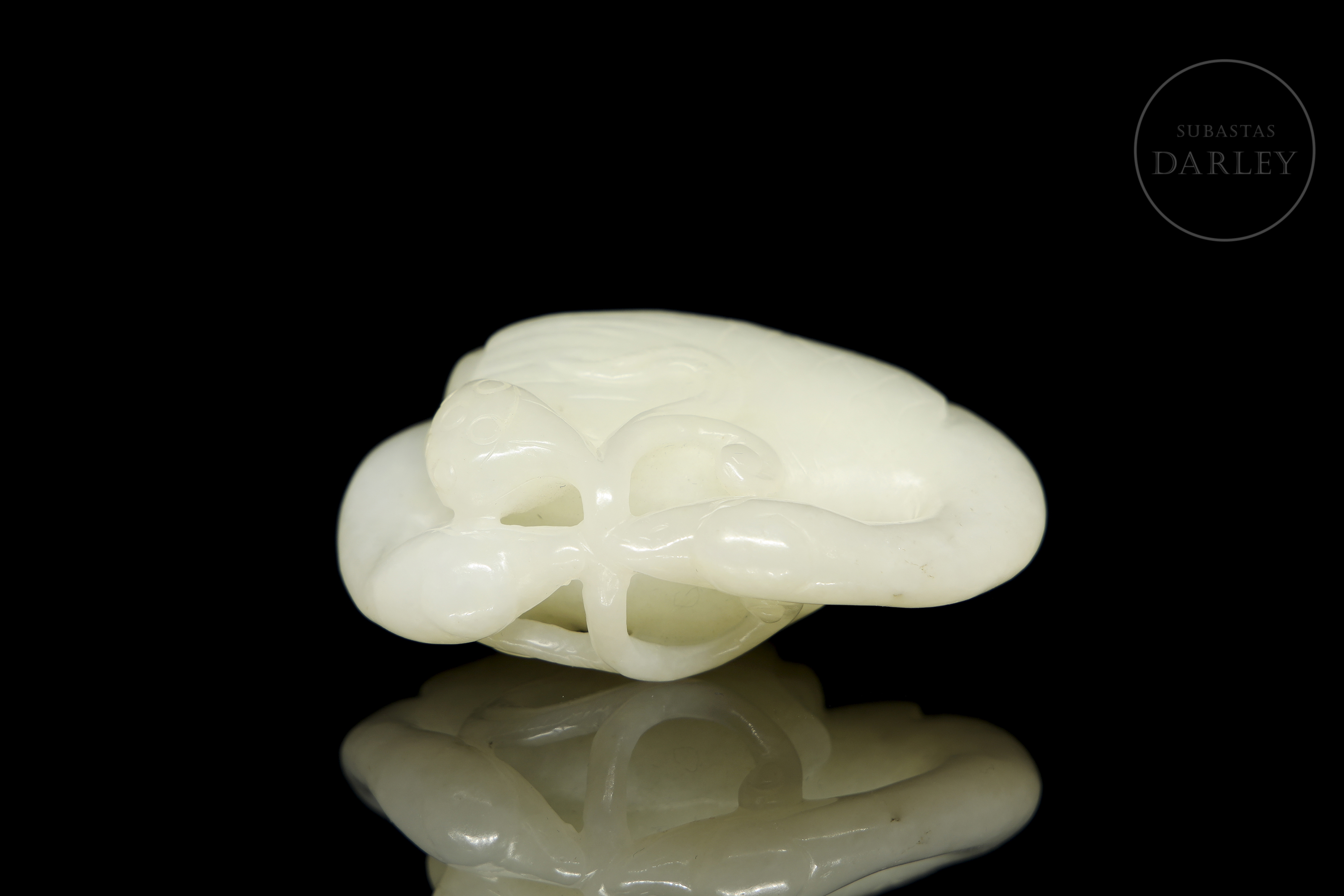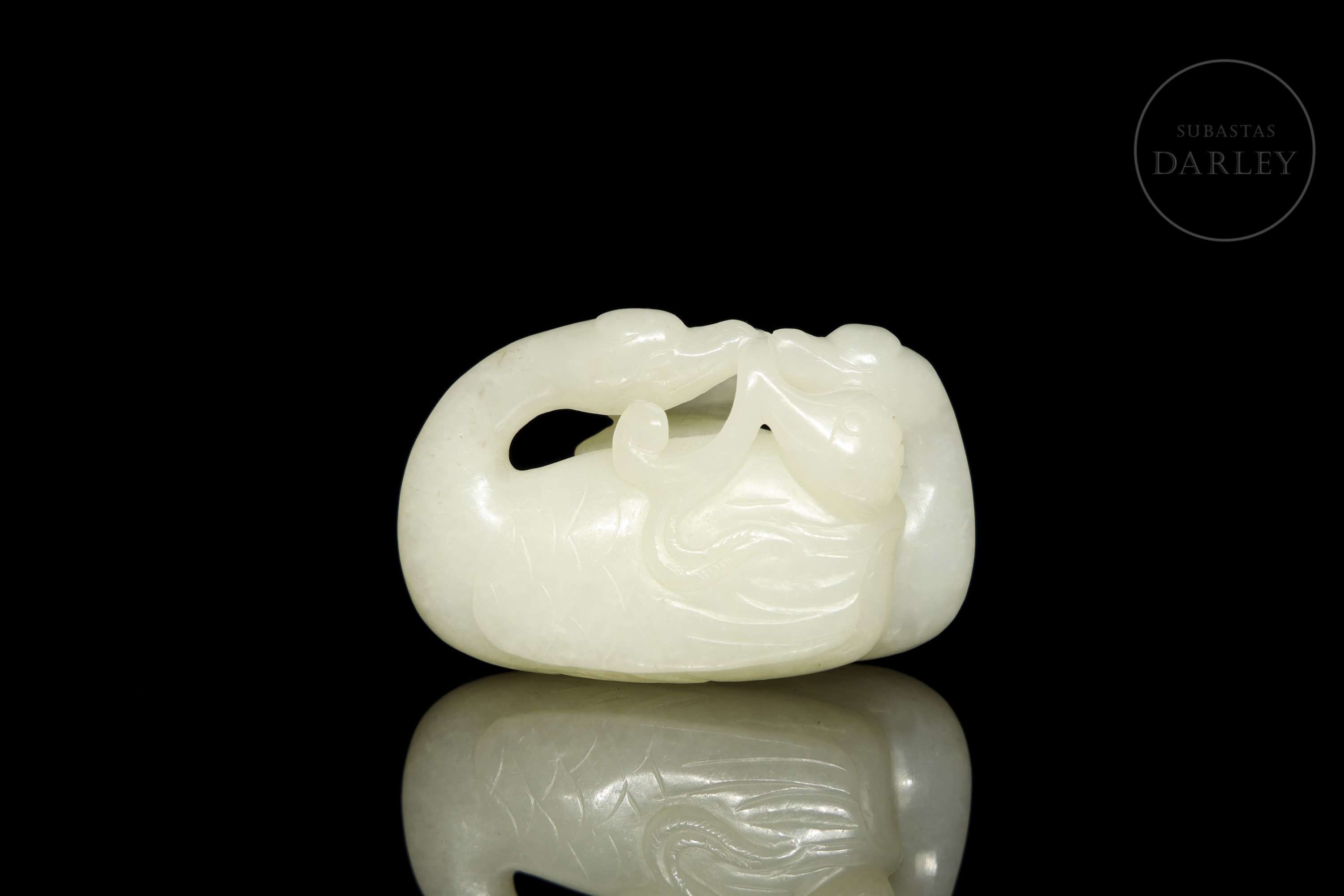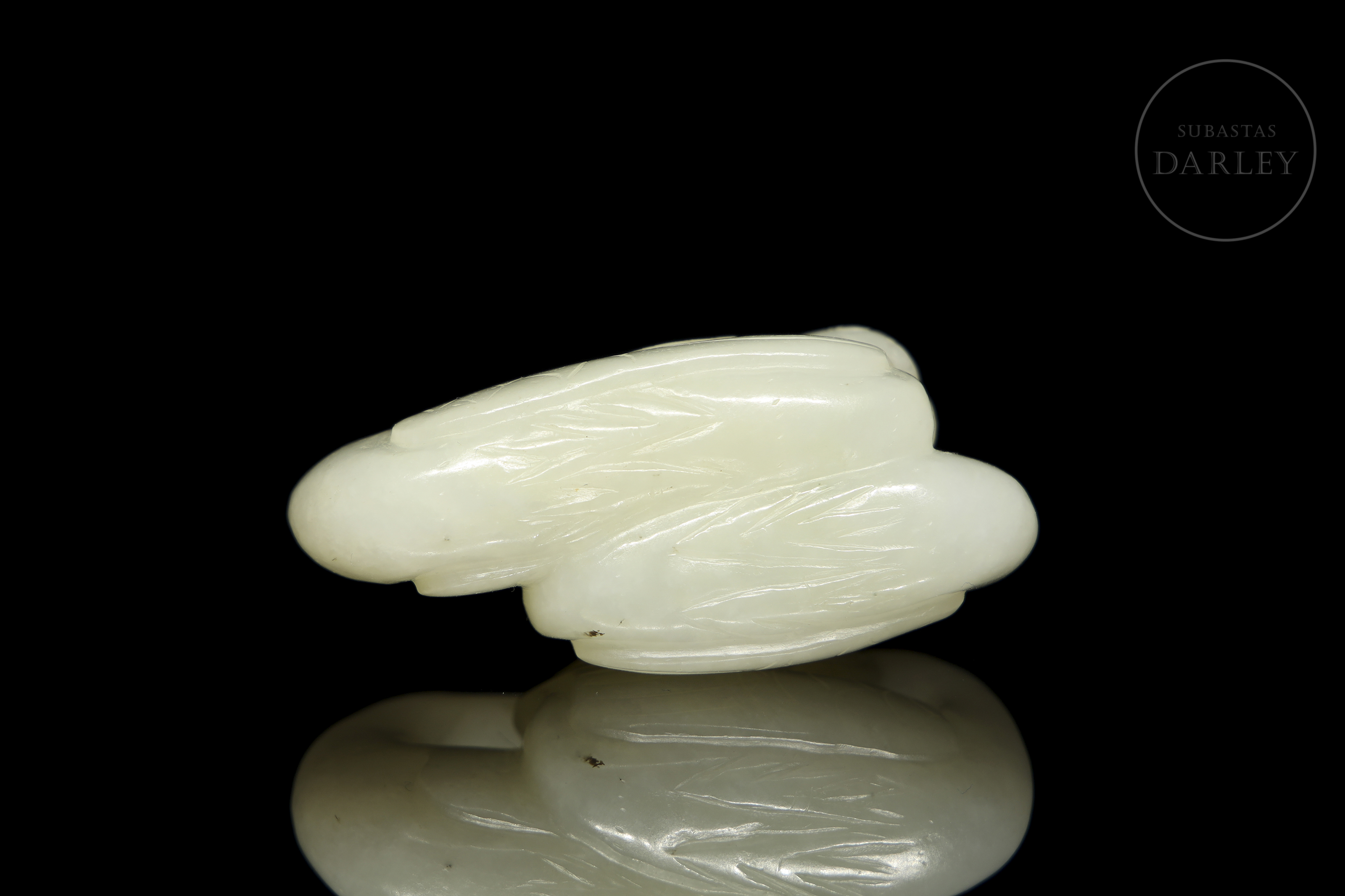 Figura de bulto redondo tallada en jade blanco con un suave acabado pulido. La composición muestra una pareja de ocas en reposo, una junto a la otra, y una de ellas con la cabeza vuelta sobre su lomo, ambas con el pico unido sosteniendo una rama. Este es un potente emblema de fidelidad conyugal y felicidad duradera en el matrimonio.