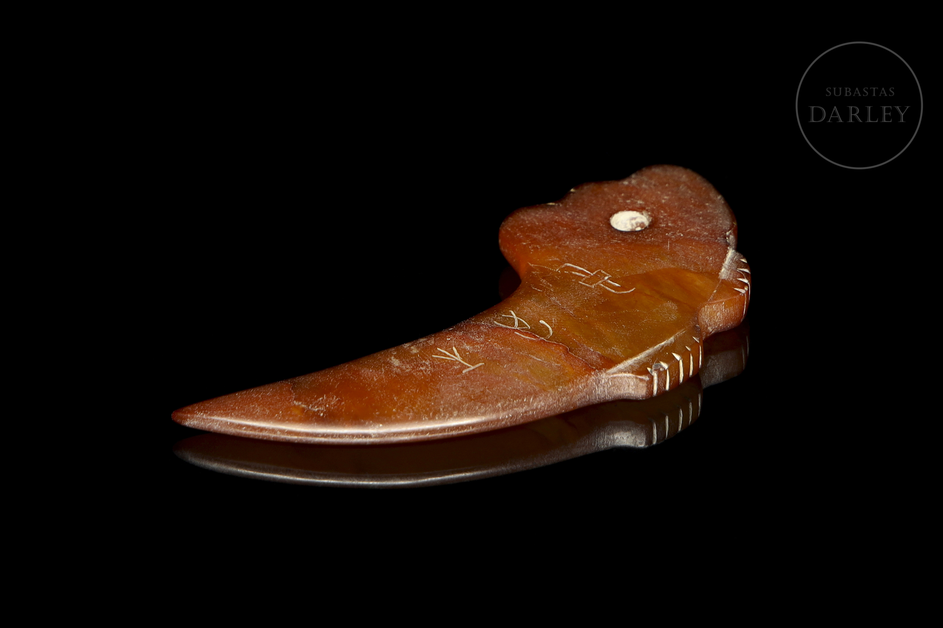 Amuleto arcaico de jade, que muestra un intenso color rojizo. La pieza presenta una forma curva y estilizada que evoca una criatura zoomorfa, con la superficie grabada con caracteres de estilo arcaico. Presenta una perforación, a modo de ojo para su suspensión.