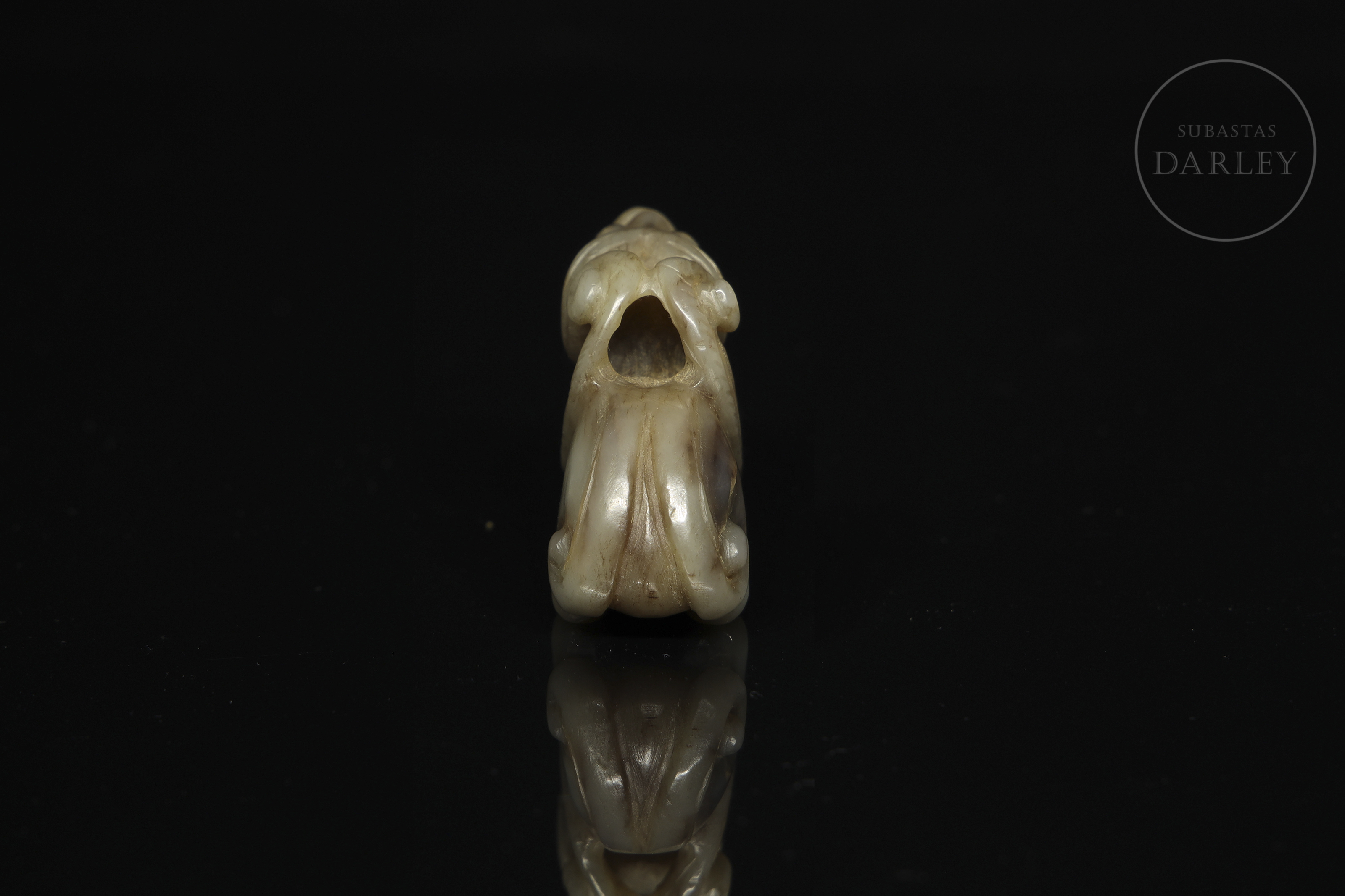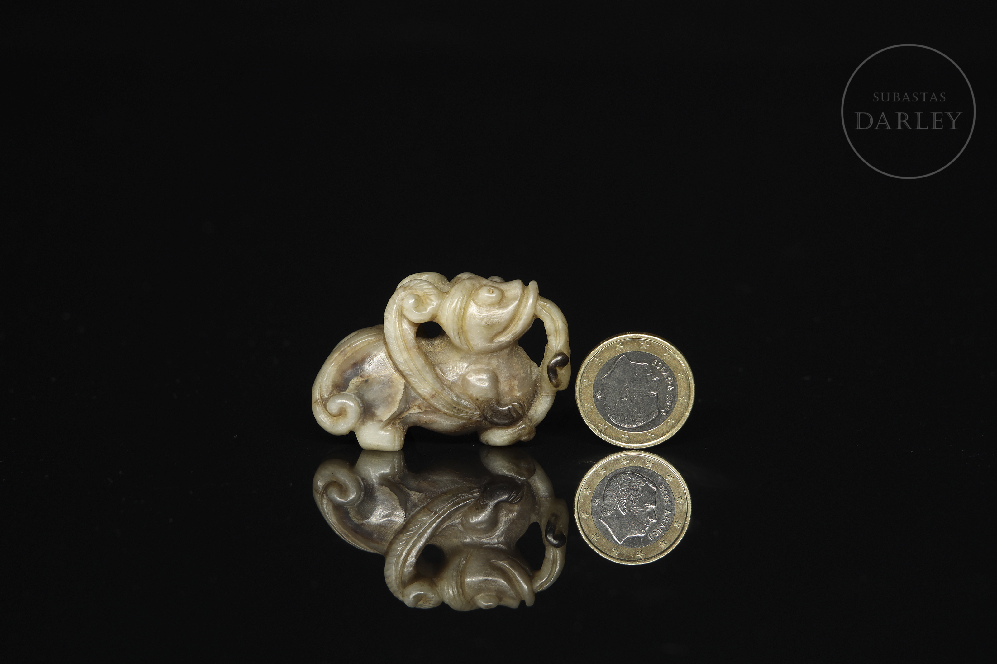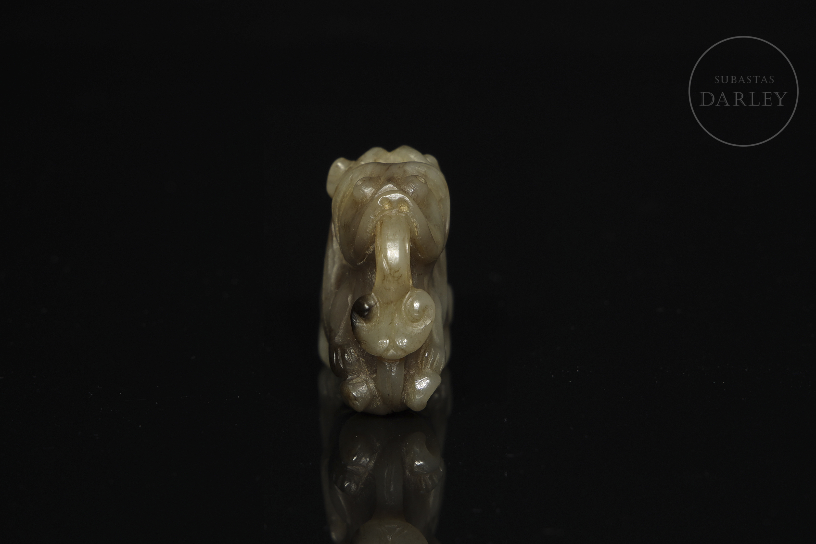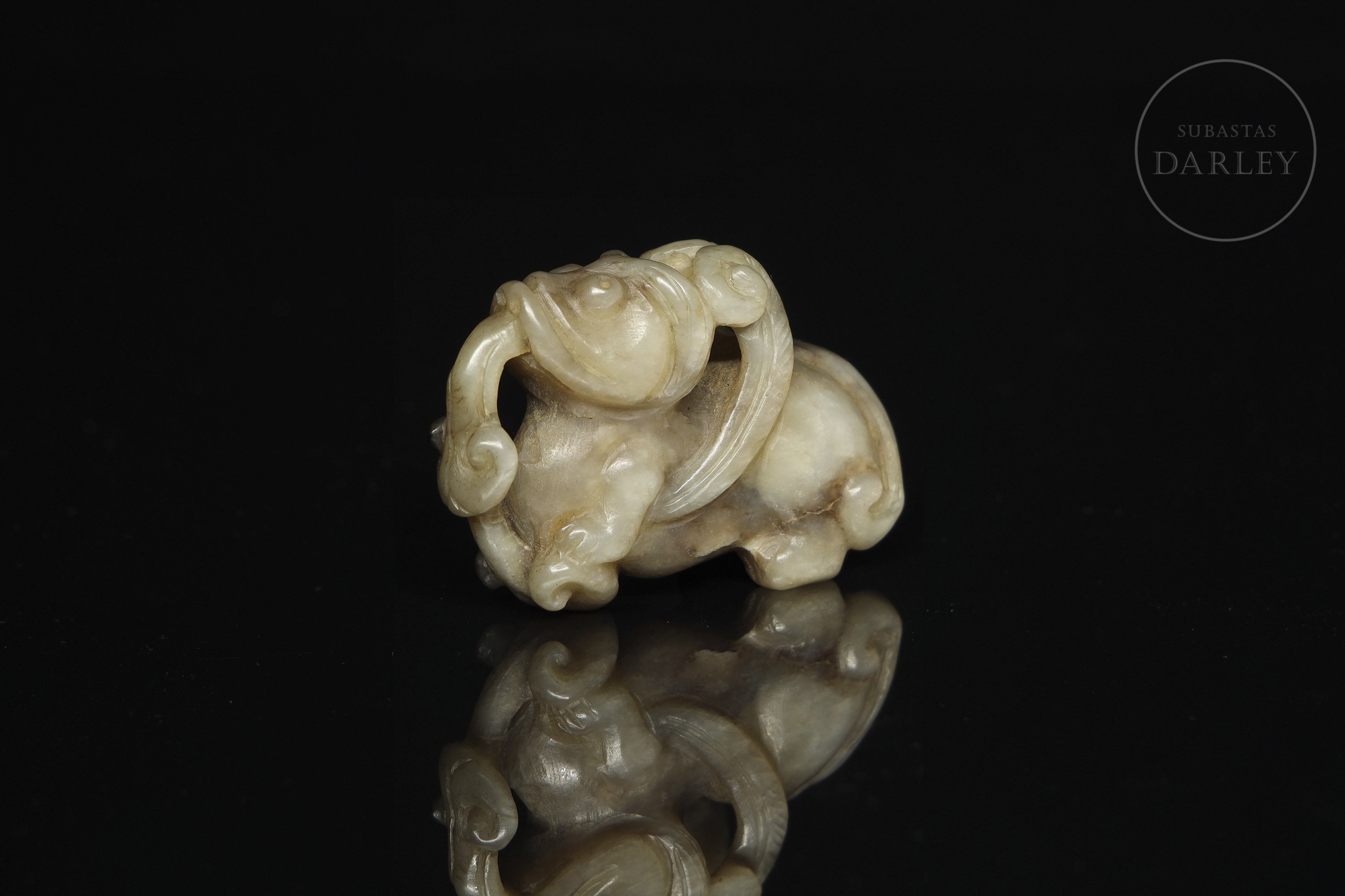 Figura finamente tallada en jade de tonalidades beige y marrón con pátina natural, representando a una criatura mítica de cuerpo compacto y postura recogida. La cabeza muestra rasgos estilizados, con prominentes ojos almendrados y orejas curvas pegadas a los lados. La boca abierta permite apreciar una larga lengua serpentiforme, que se eleva y ondula en volutas decorativas. Destacan unas alas estilizadas o apéndices ornamentales dispuestos a los costados, tallados con líneas. La cola, también rematada en un elegante rizo, equilibra la composición. El tratamiento de las patas es simplificado, con énfasis en las garras. Este tipo de figura se asocia a bestias protectoras, guardianas contra las energías negativas y portadoras de buena fortuna. Dinastía Ming (1368-1644) o posterior.