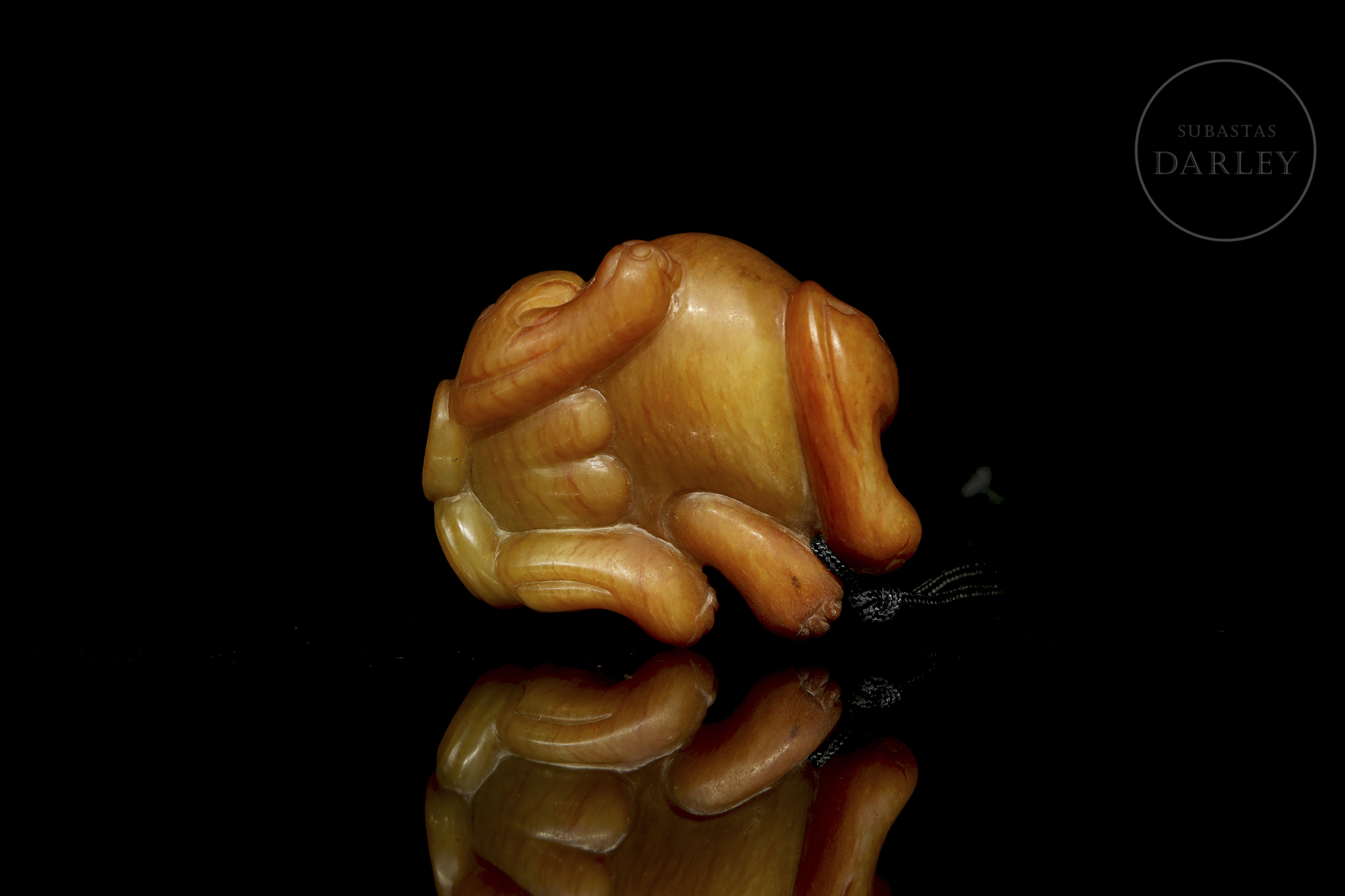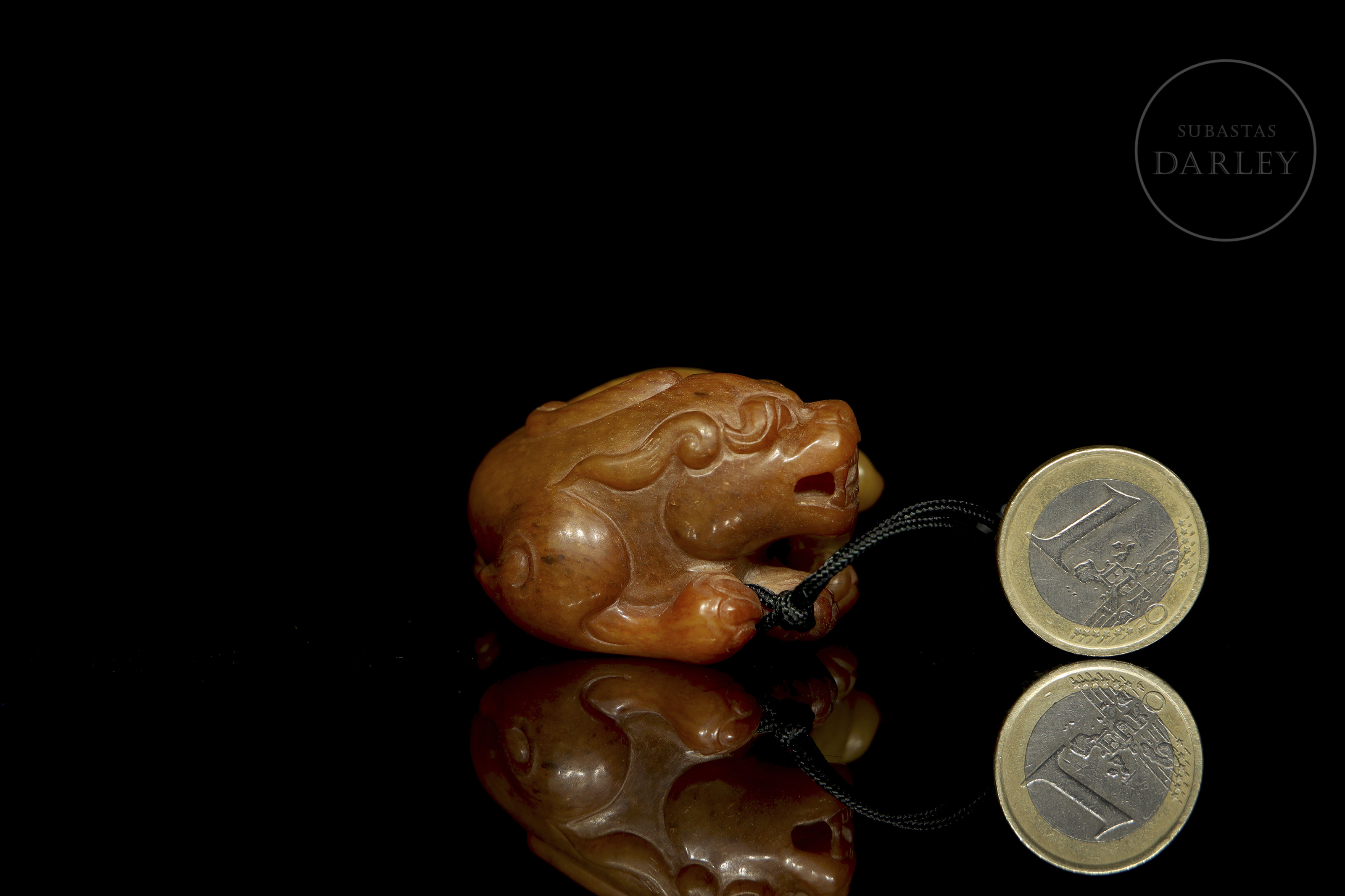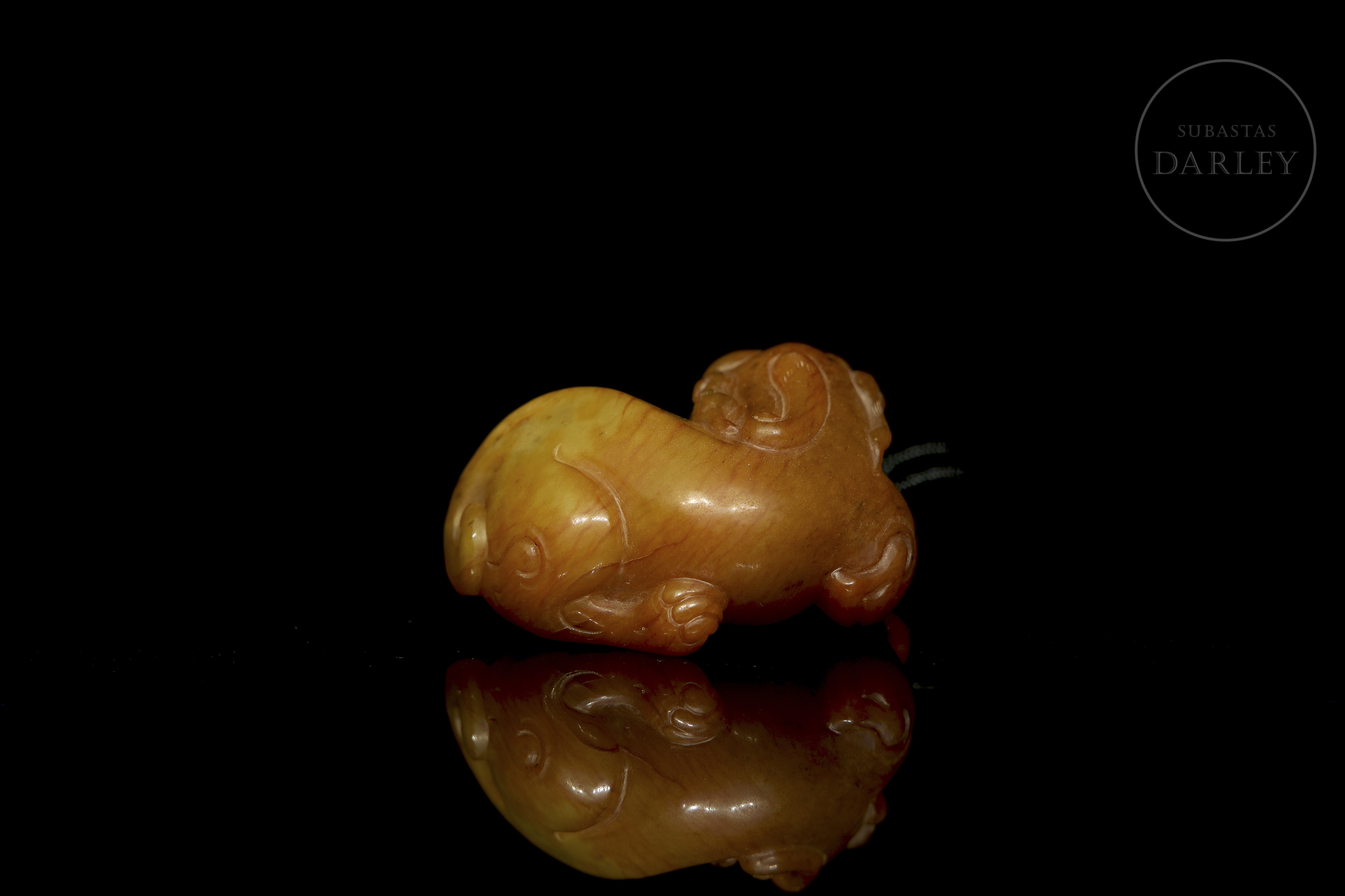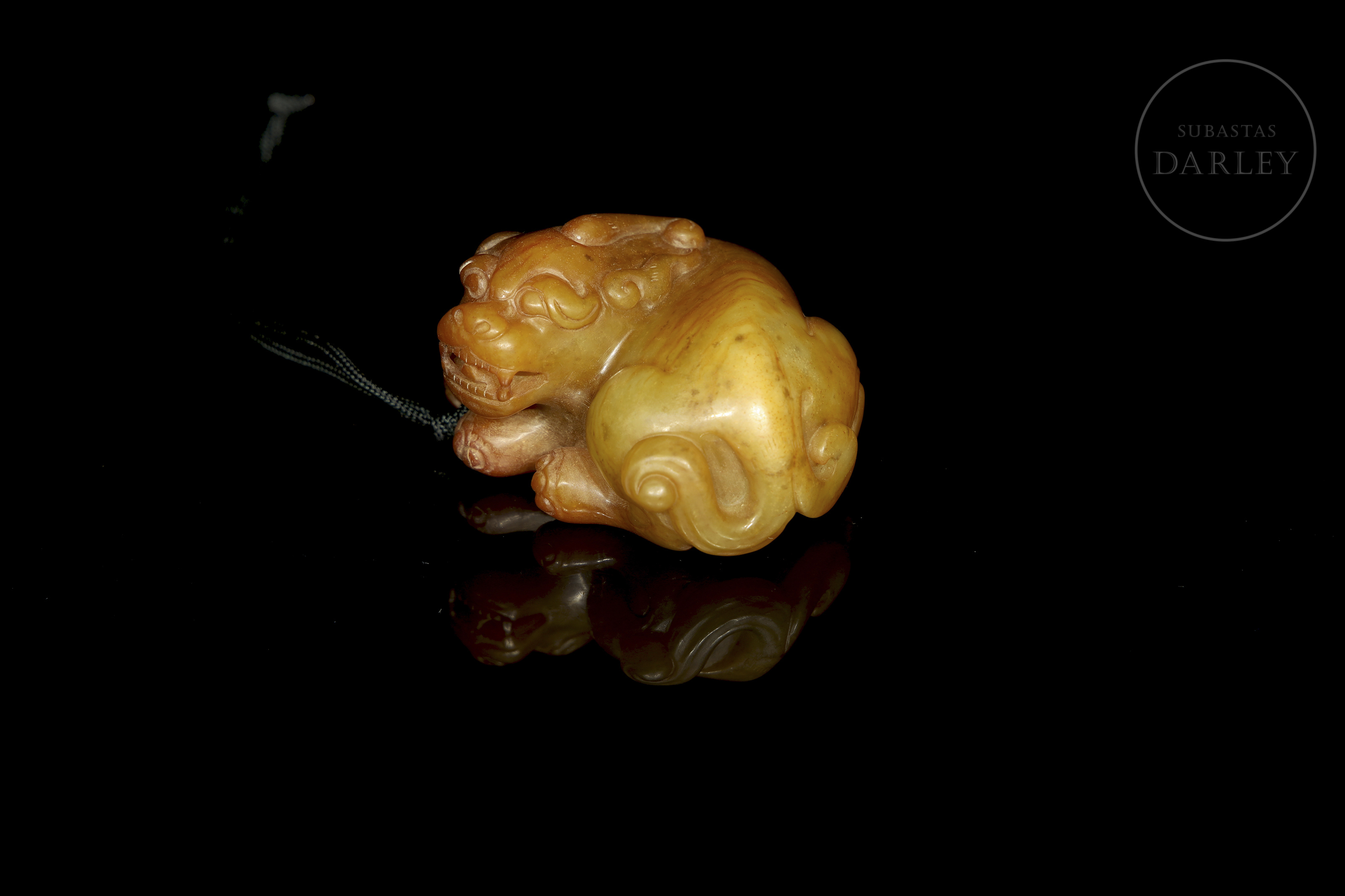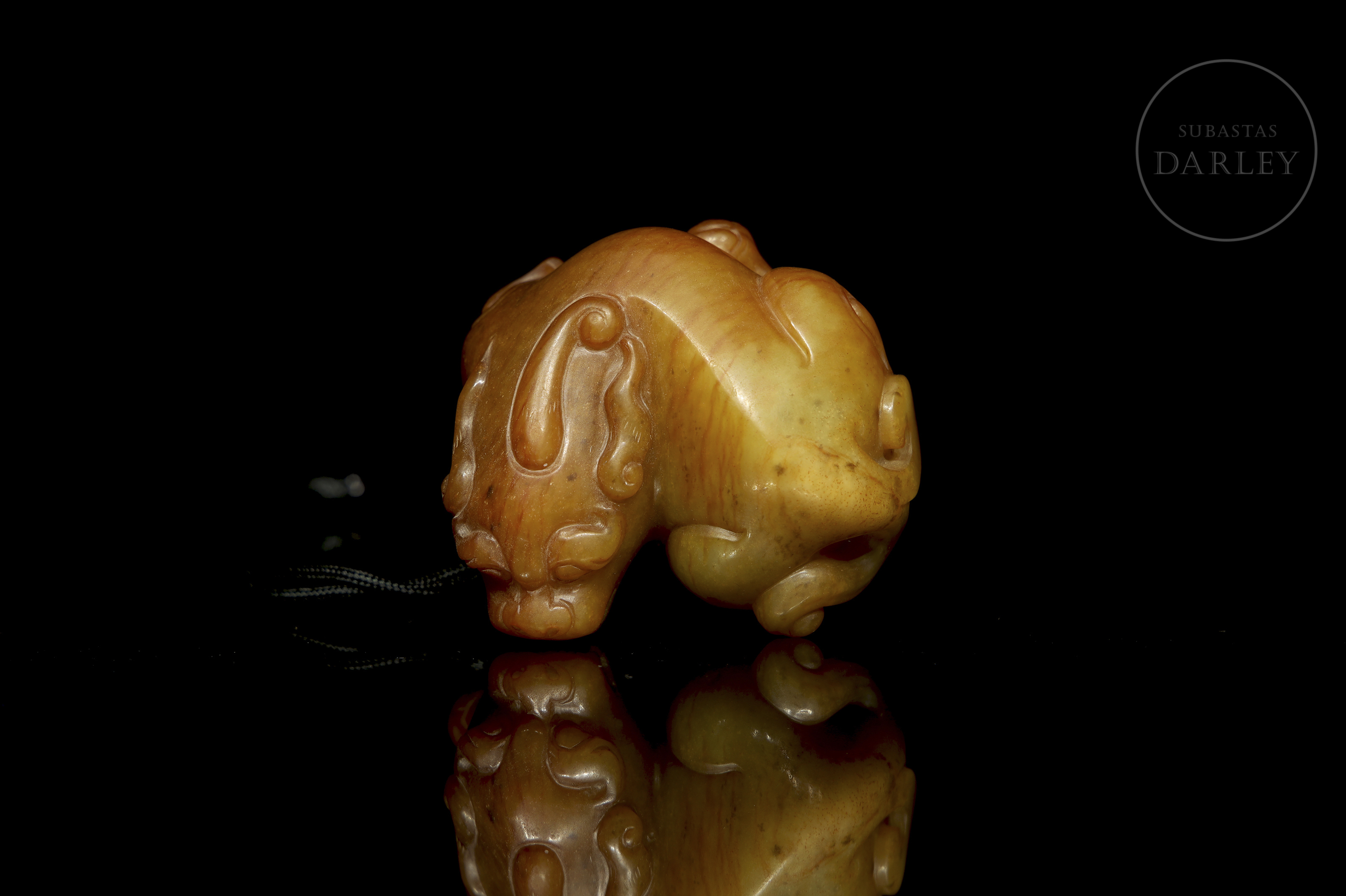 Escultura de bulto redondo tallada en jade, que representa una robusta bestia mítica en postura de descanso, con el cuerpo sobre las robustas patas y la cabeza ladeada, mirando al frente, mostrando unos ojos penetrantes y afilados colmillos. El jade es de tono amarillo con vetas rojizas. Dinastía Han (206 a.C. - 220 d.C.).