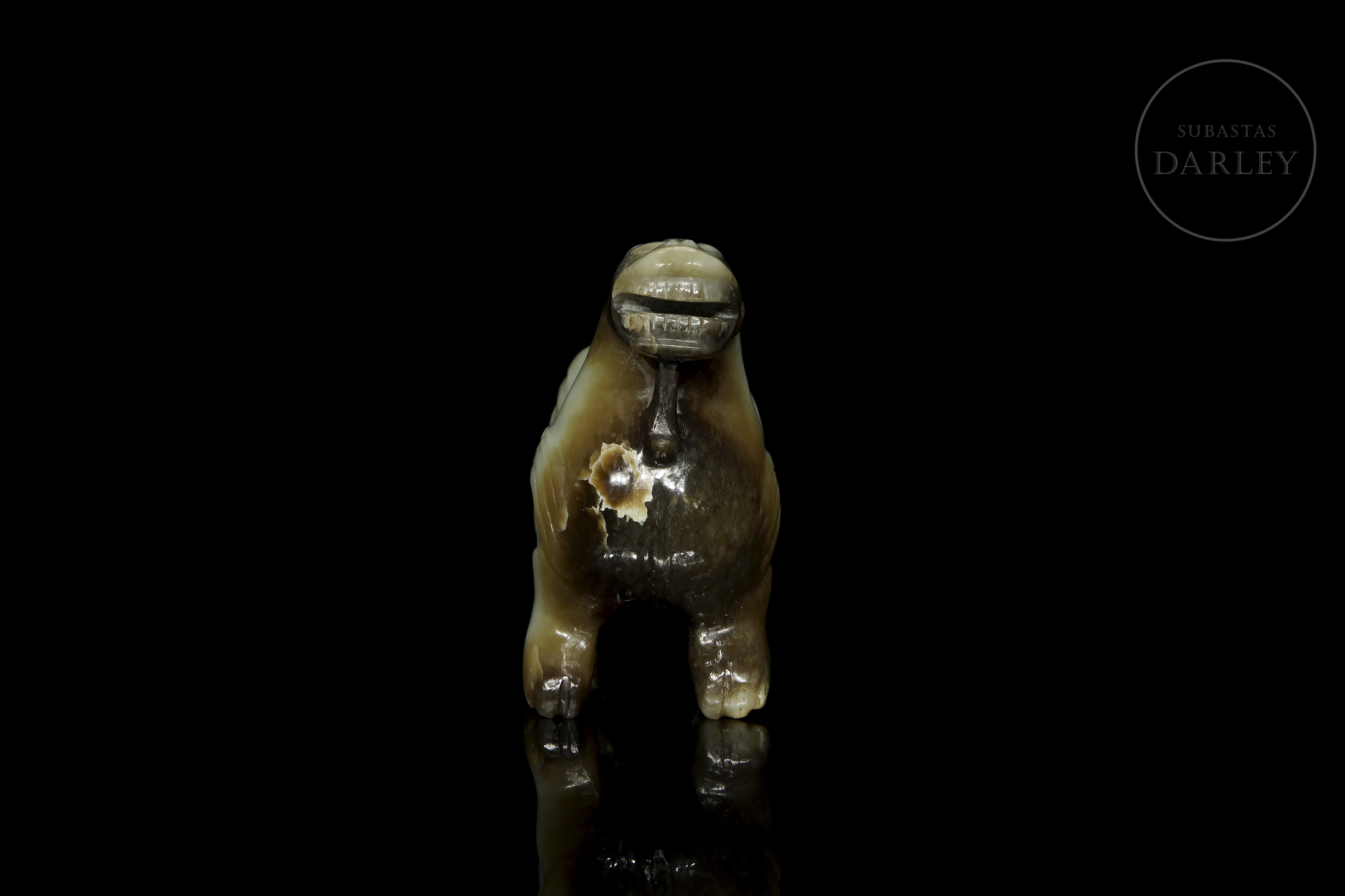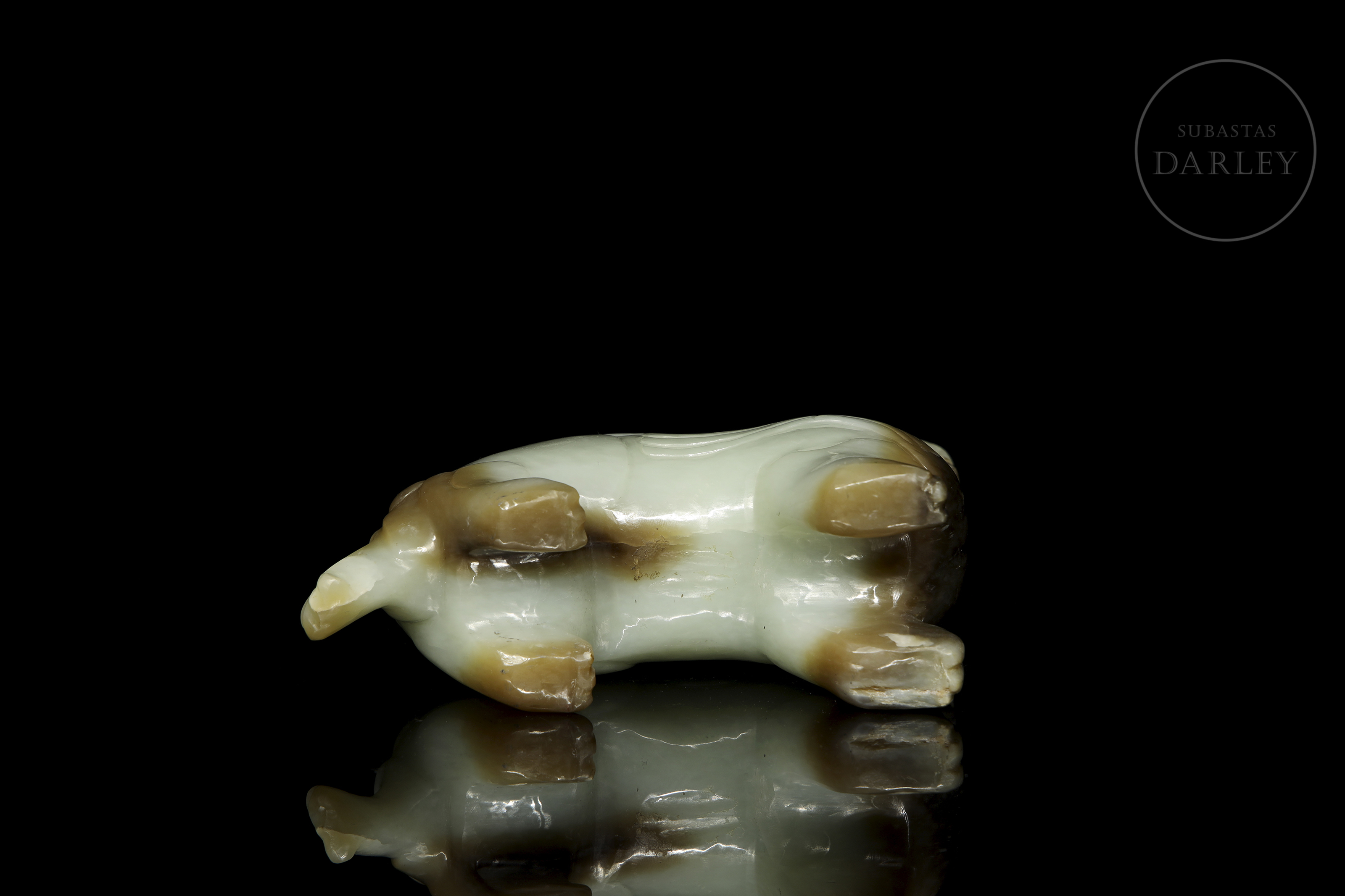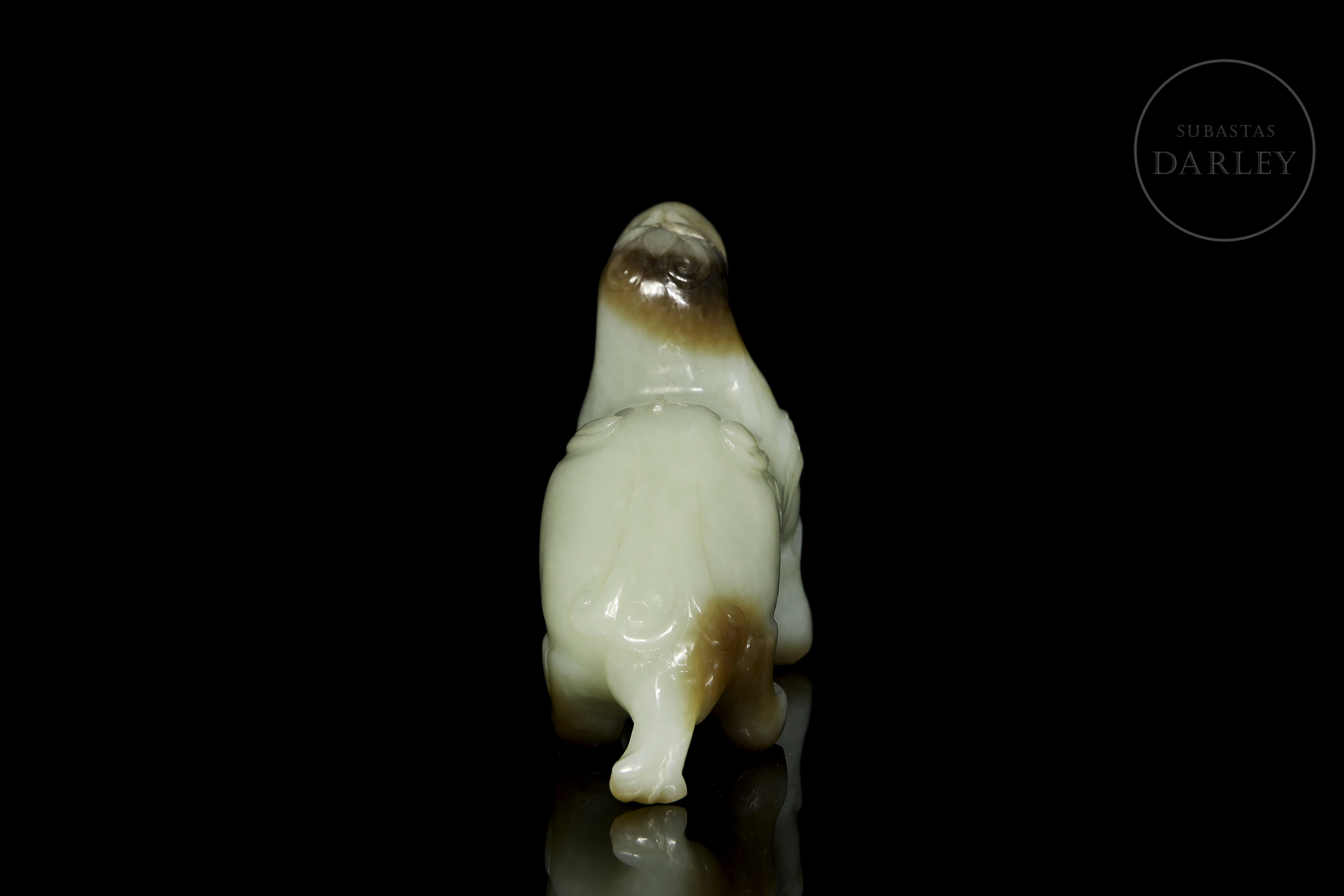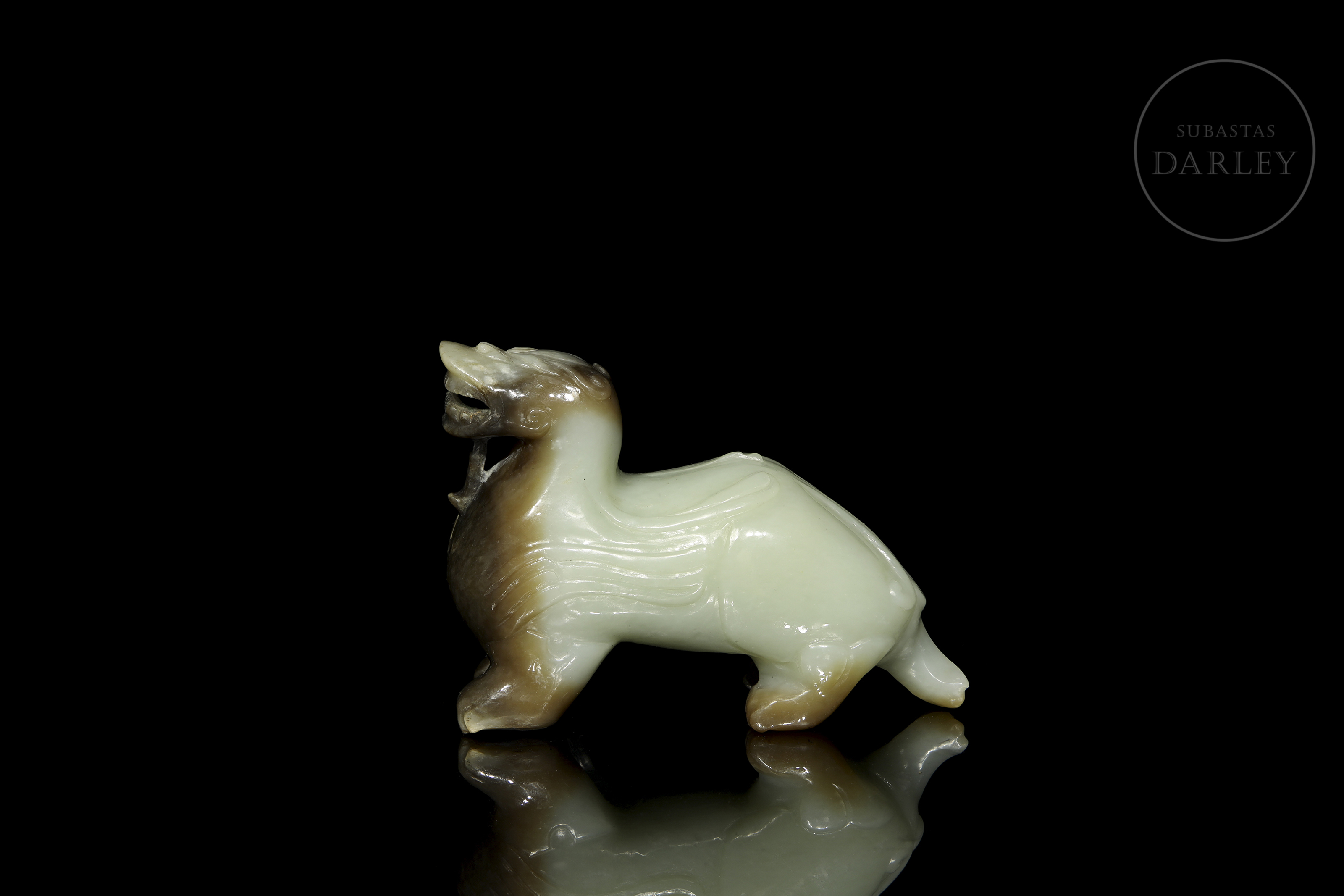 Realizada en jade celadón con áreas de coloración parda y oscura. Representa a una bestia mítica en actitud alerta, apoyada sobre sus cuatro patas, con una musculatura poderosa y rasgos zoomorfos vigorosos. La cabeza muestra una expresión feroz con la boca abierta, revelando los dientes. El cuerpo presenta motivos de volutas arcaizantes en bajorrelieve.
