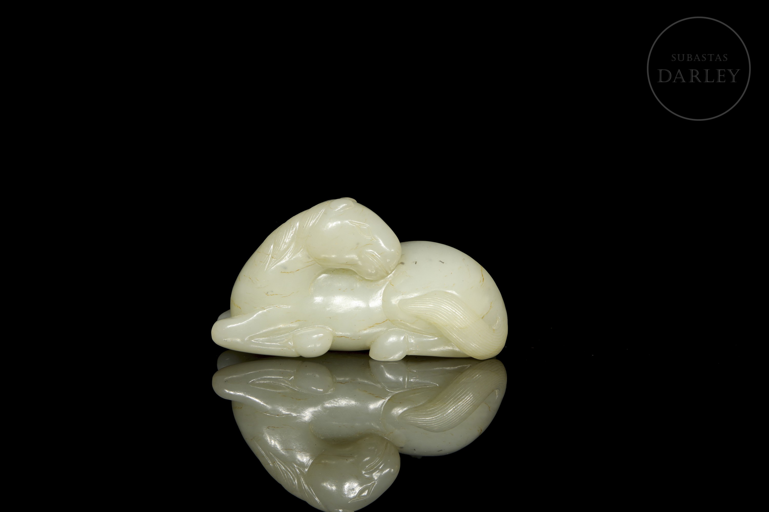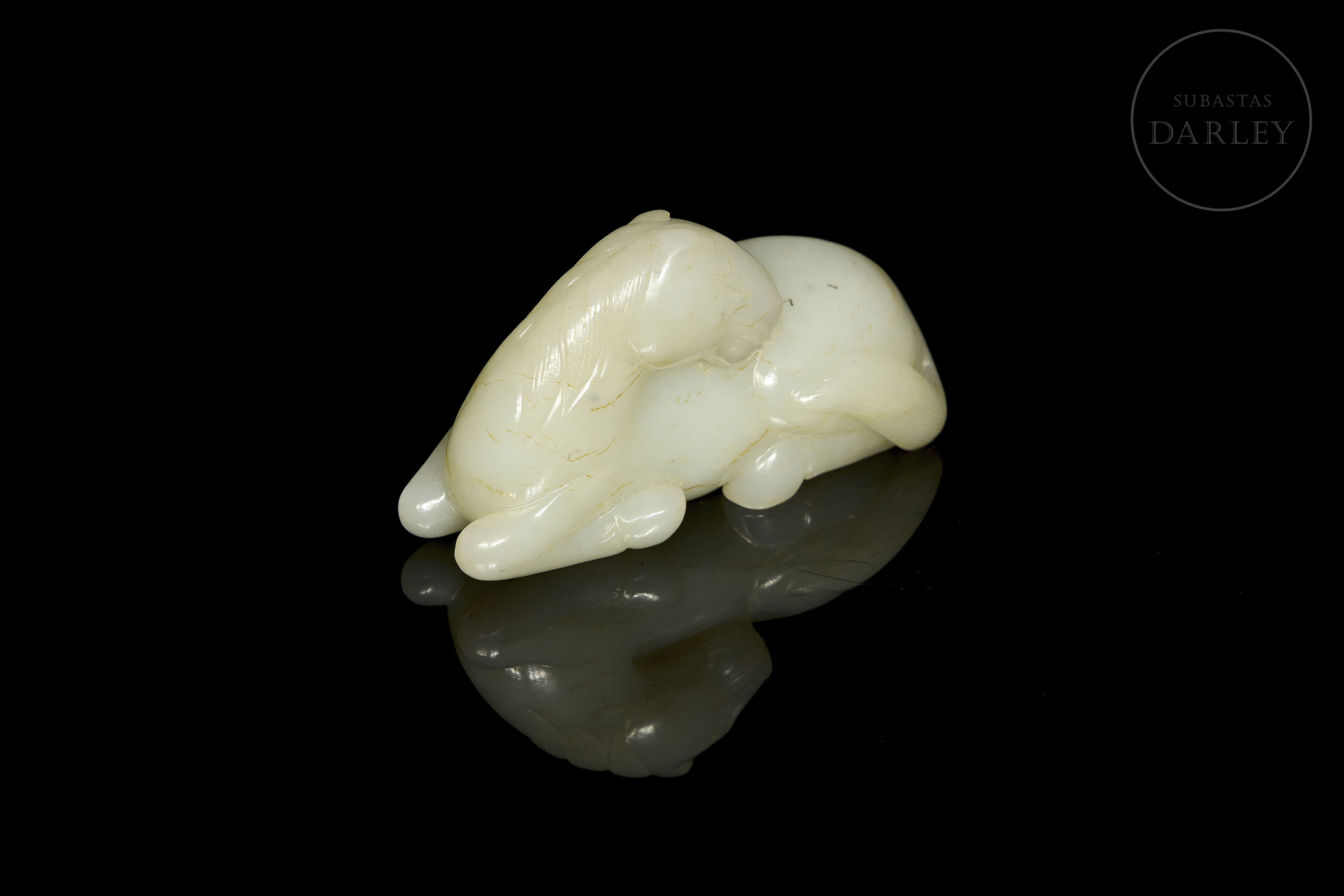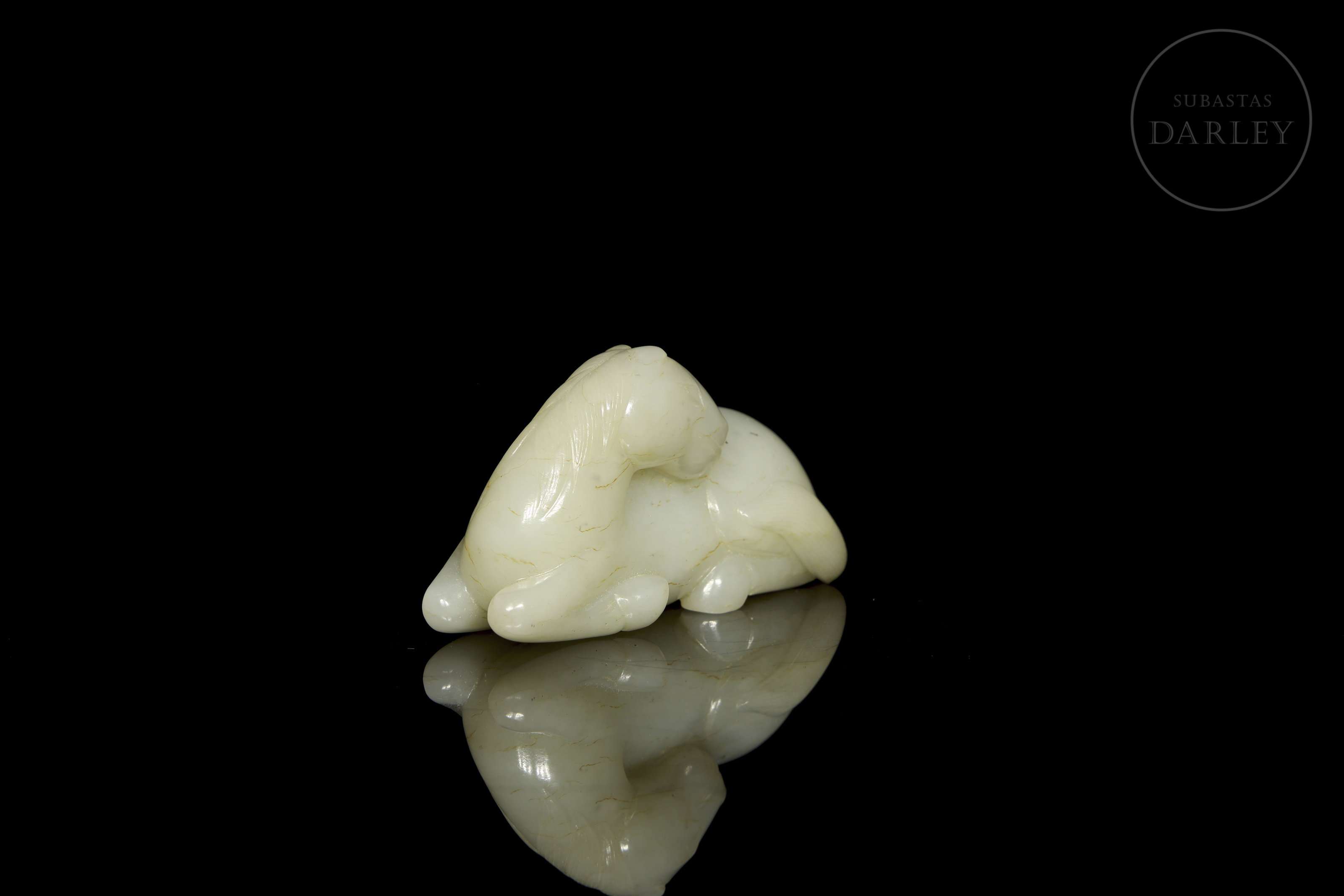 Figura de jade de tono blanco con morfología de animal, representando un caballo recostado. El tallado y pulido de la piedra, muestran al animal en una pose de descanso, con la cabeza girada hacia atrás, sobre el lomo, y las patas recogidas bajo el vientre, con detalles incisos para la melena, cola y rostro. Dinastía Qing (1644-1912).