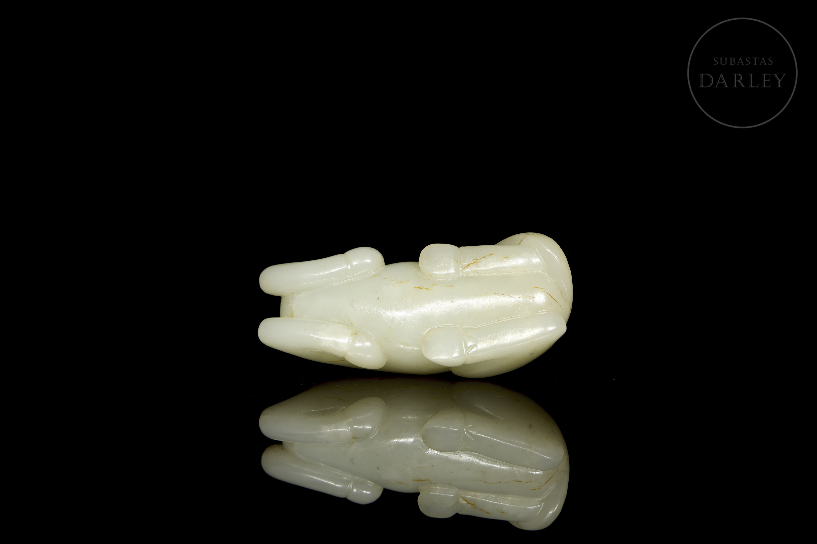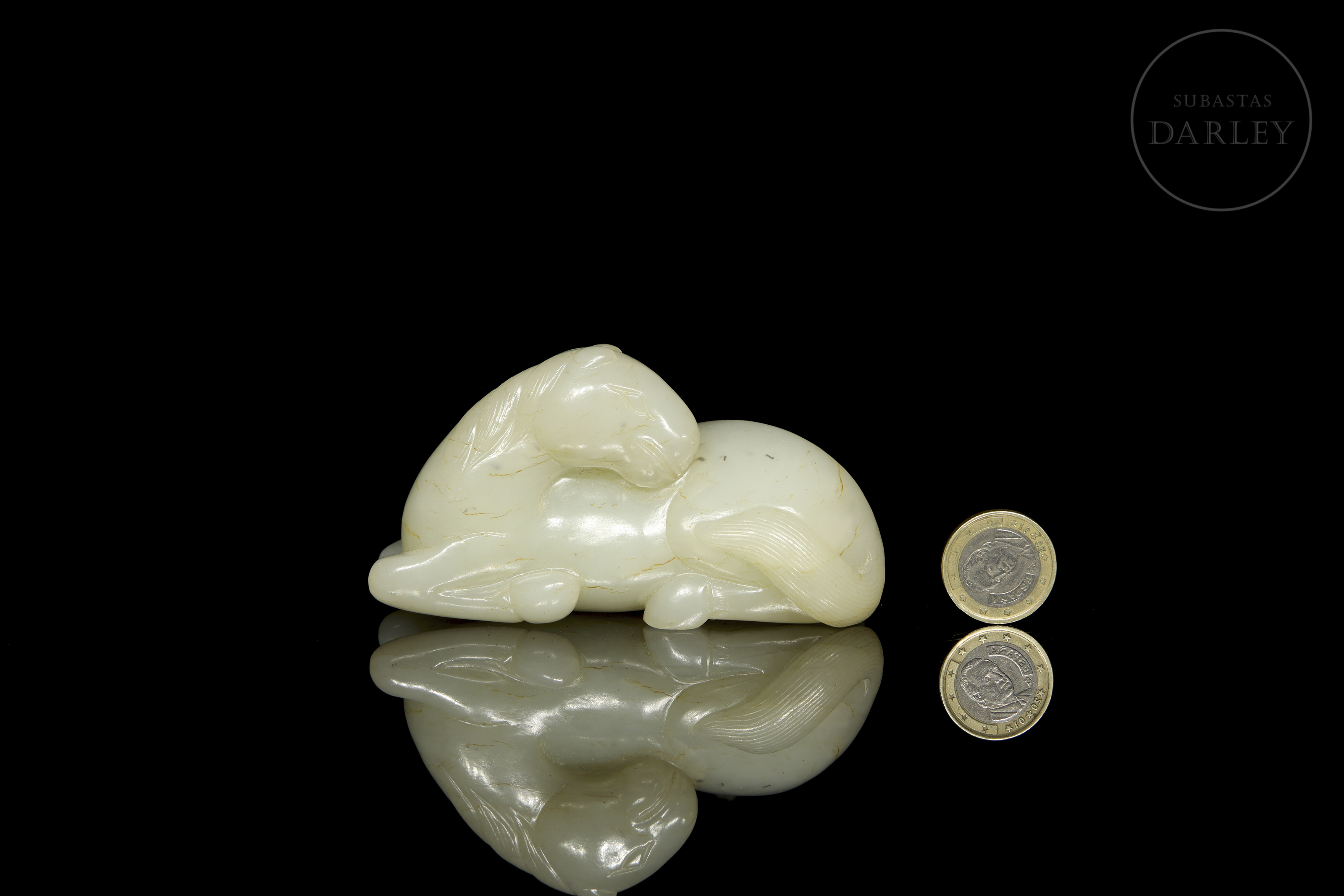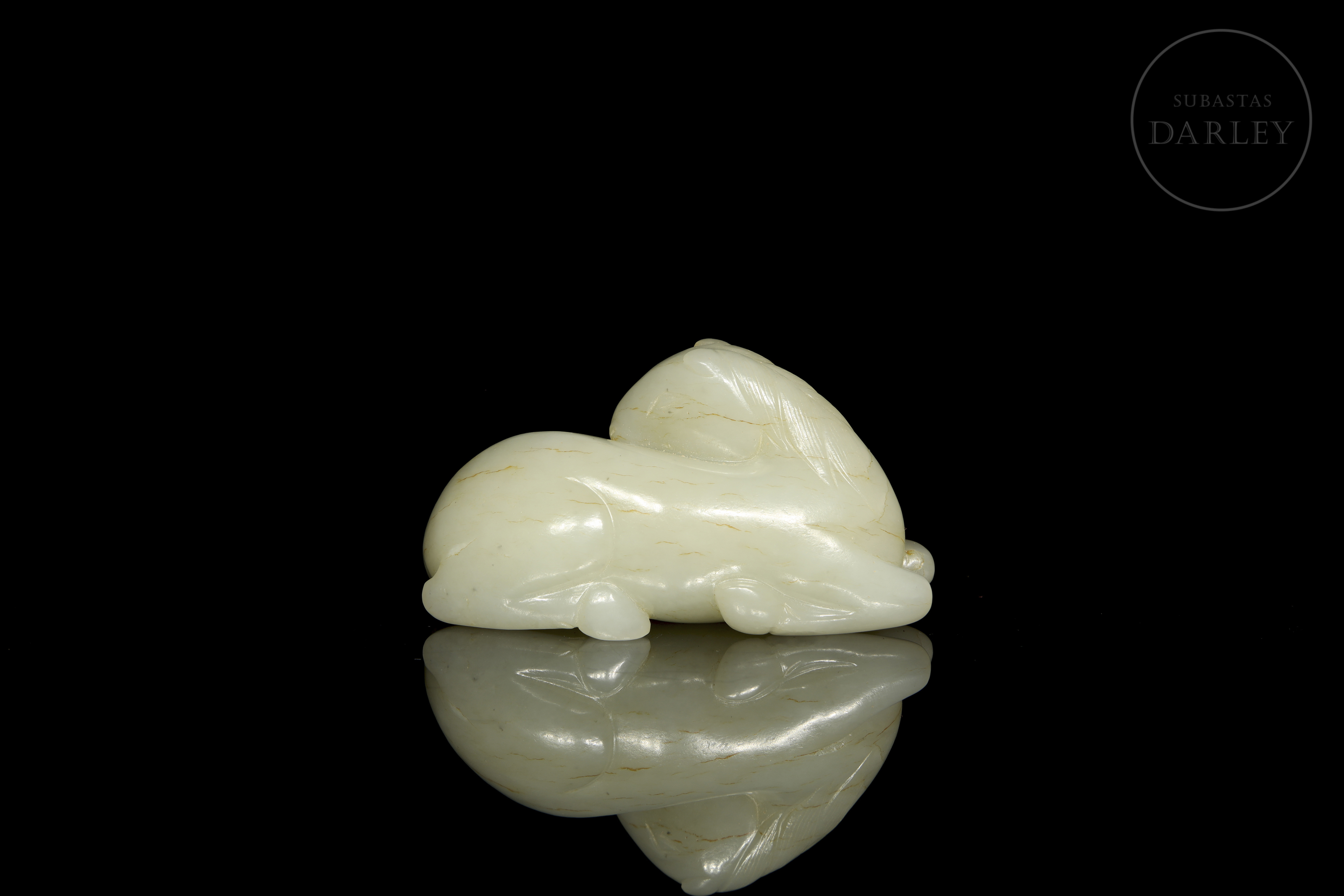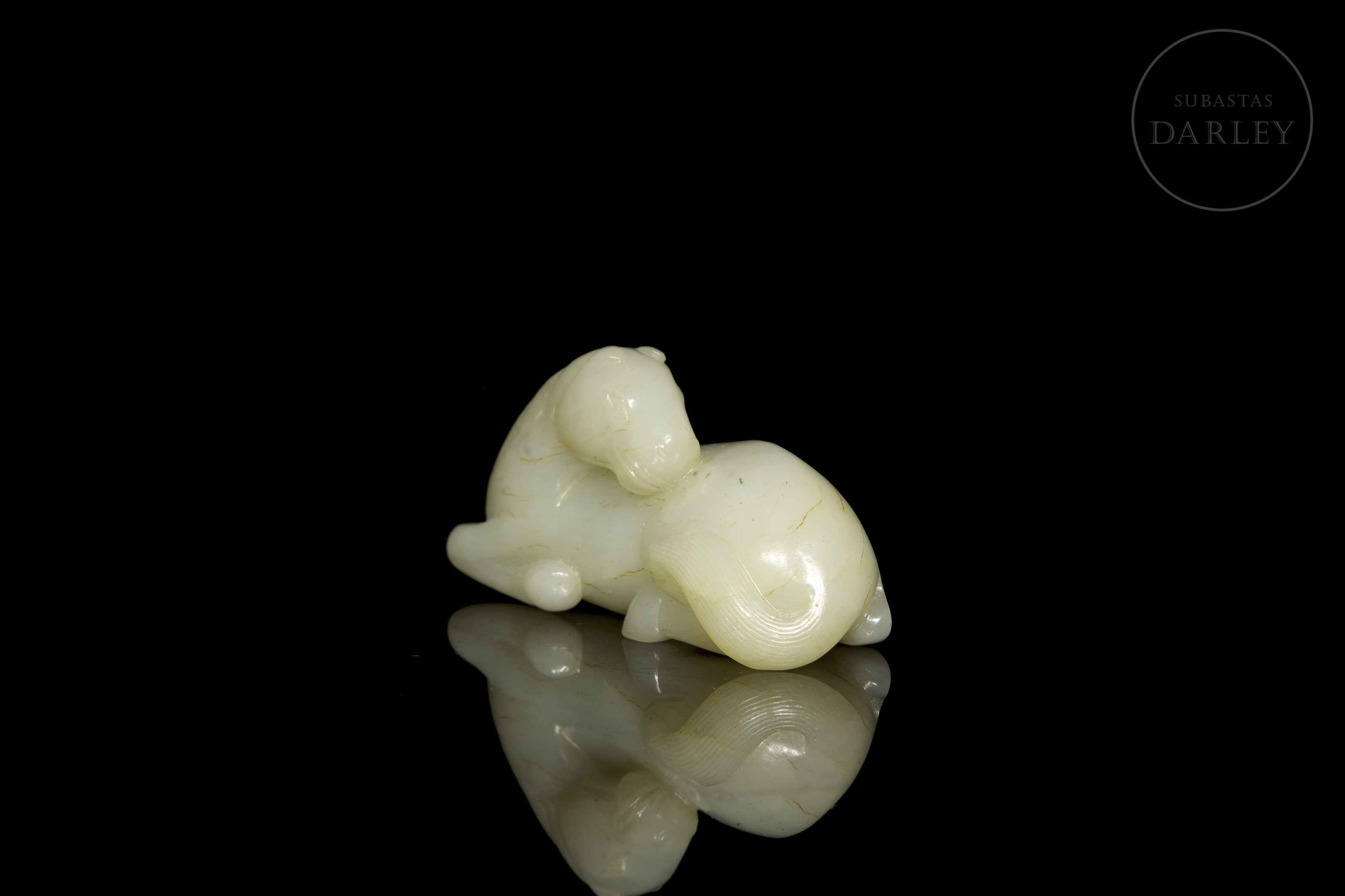 Figura de jade de tono blanco con morfología de animal, representando un caballo recostado. El tallado y pulido de la piedra, muestran al animal en una pose de descanso, con la cabeza girada hacia atrás, sobre el lomo, y las patas recogidas bajo el vientre, con detalles incisos para la melena, cola y rostro. Dinastía Qing (1644-1912).