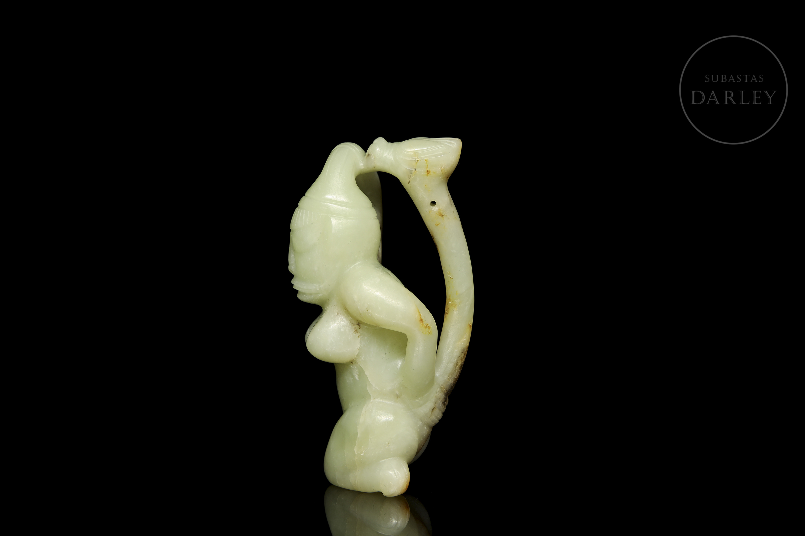 Figura antropomorfa de jade (玉人神). La pieza representa una deidad de pie, con rasgos faciales prominentes y estilizados, destacando el torso y las extremidades. La parte posterior de la figura se apoya sobre una forma enroscada que evoca a un dragón o "Zhulong". El jade presenta una pálida tonalidad verde con inclusiones marrones y ocres.
