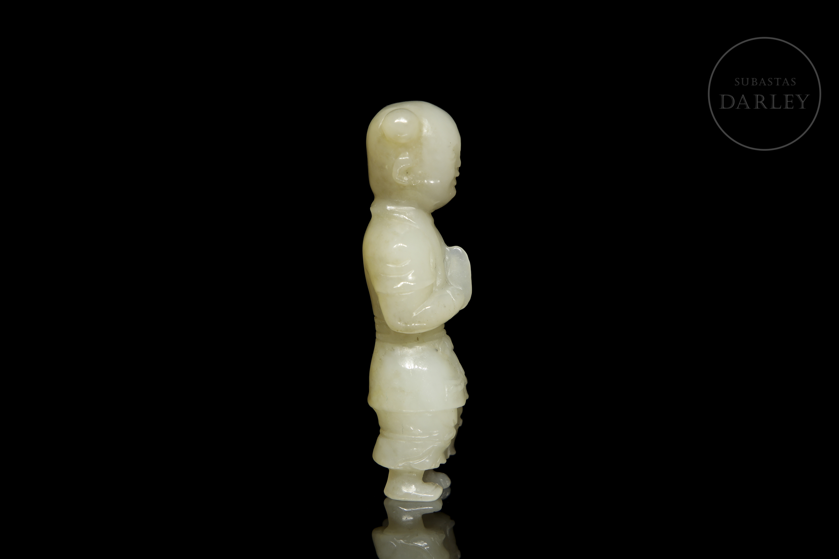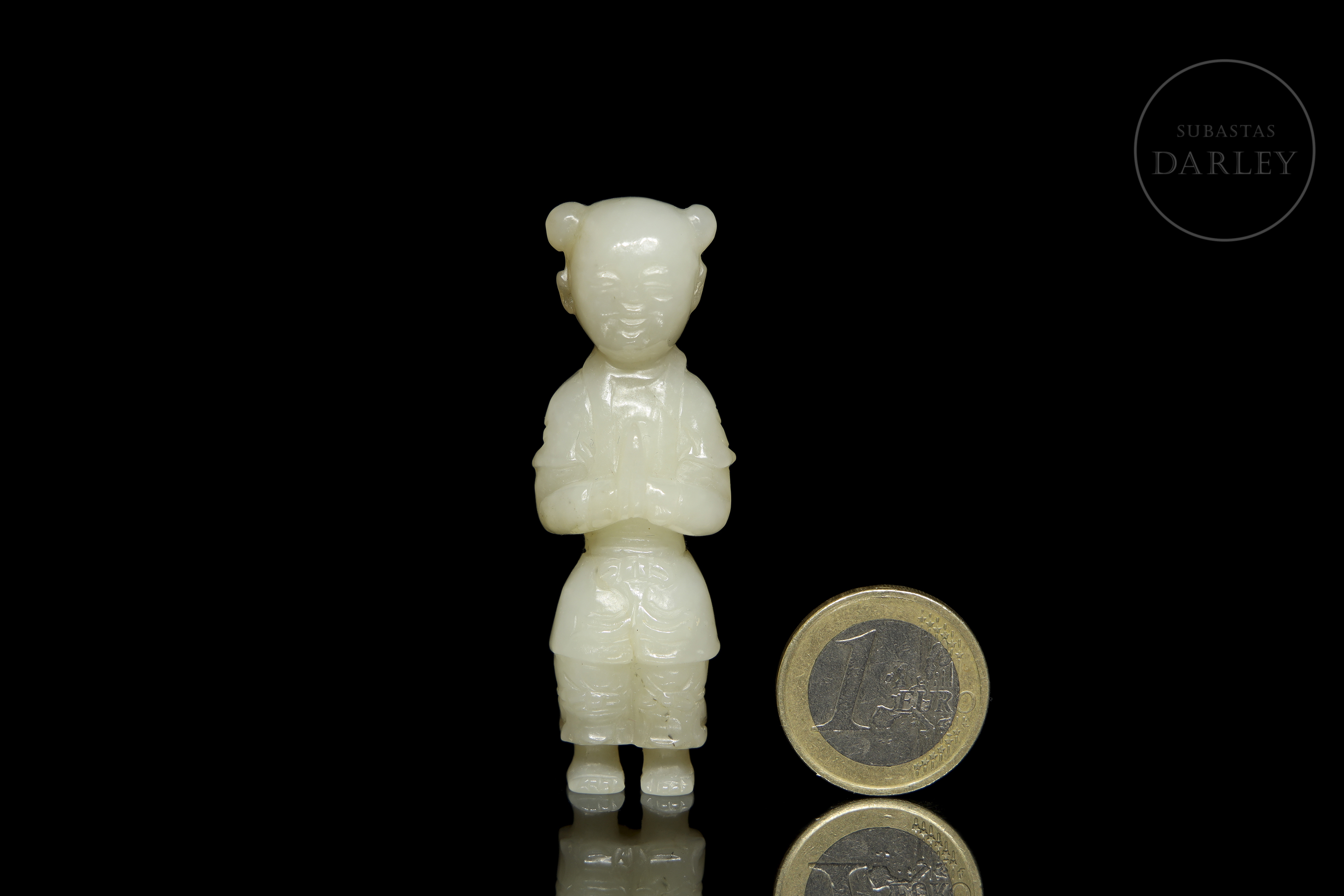 Escultura en jade de tono blanquecino, representando a una joven de pie con las manos juntas al frente, ataviada con vestimenta tradicional y peinado con dos moños. La talla resalta por el delicado modelado de los rasgos y detalles. Dinastía Qing (1644-1912).