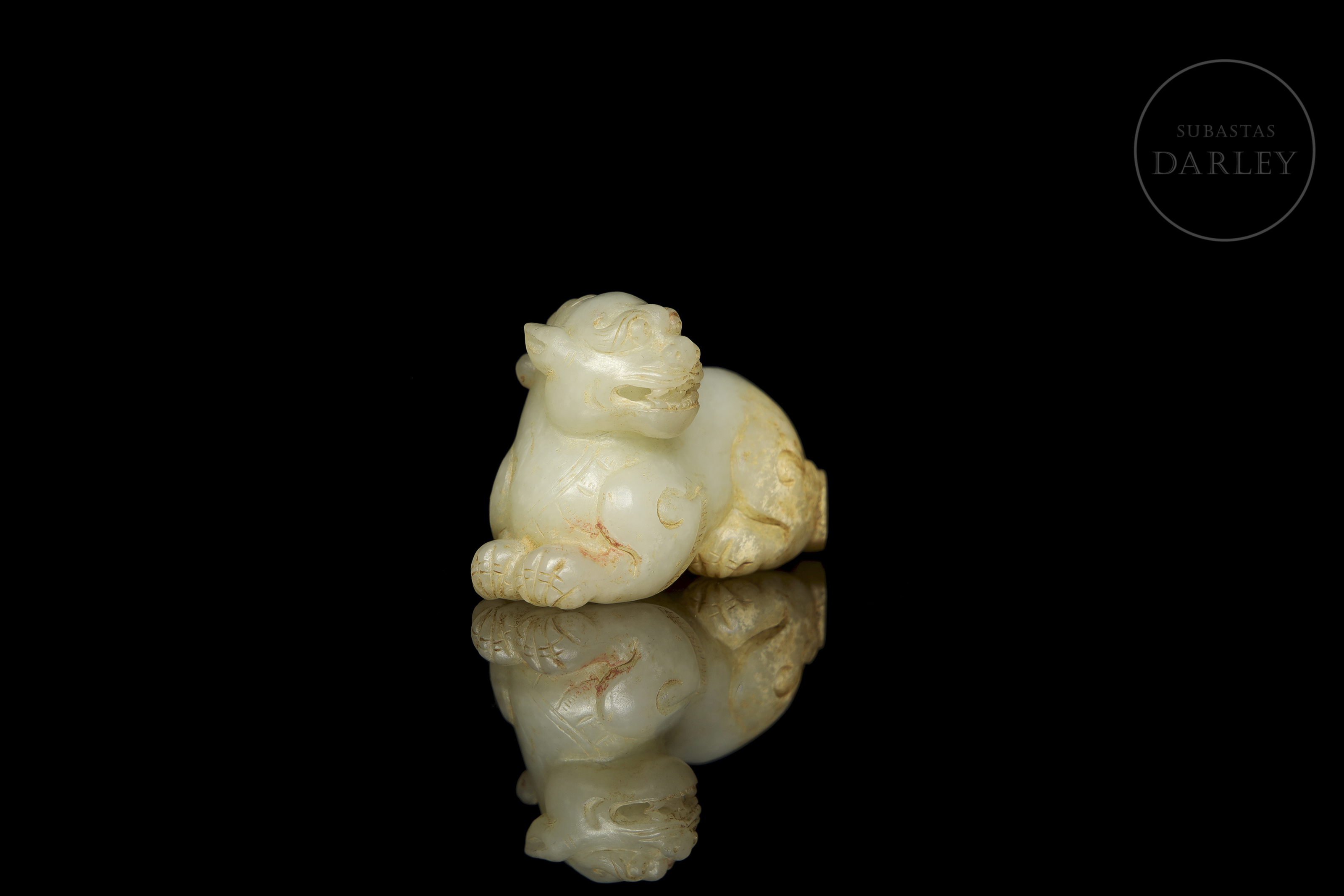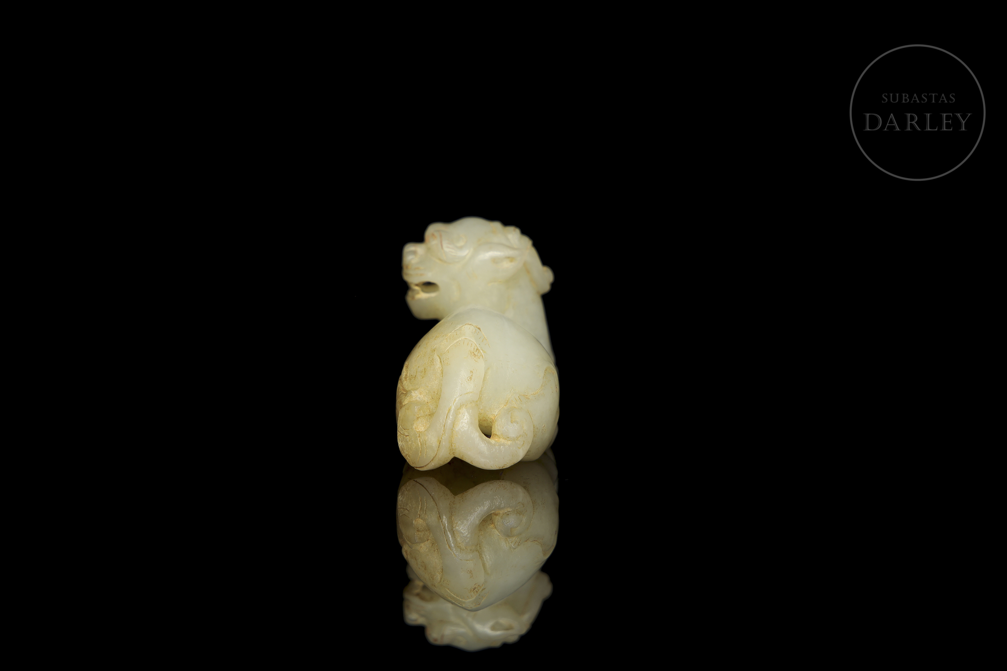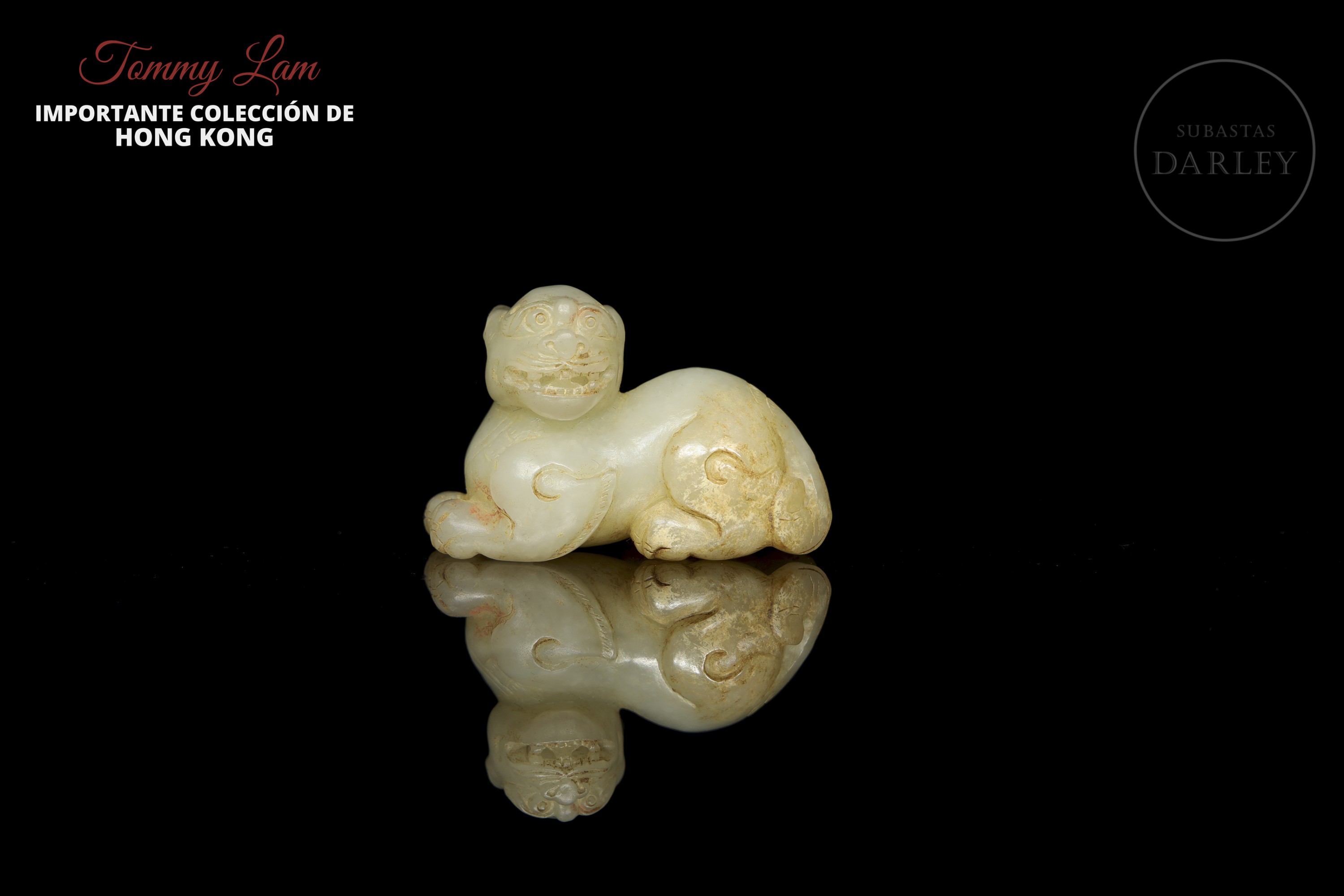 Jade de tonalidad blanca con áreas de pátina de color ocre y pequeñas manchas ferruginosas. Representa a un tigre en actitud de reposo, con la cabeza erguida y expresión poderosa de mandíbula entreabierta. El trabajo de talla define la musculatura, garras y rasgos faciales. Muestra decoraciones de volutas estilizadas y finas incisiones que sugieren el pelaje. Dinastía Han del Este (25–220 d.C.) o posterior.