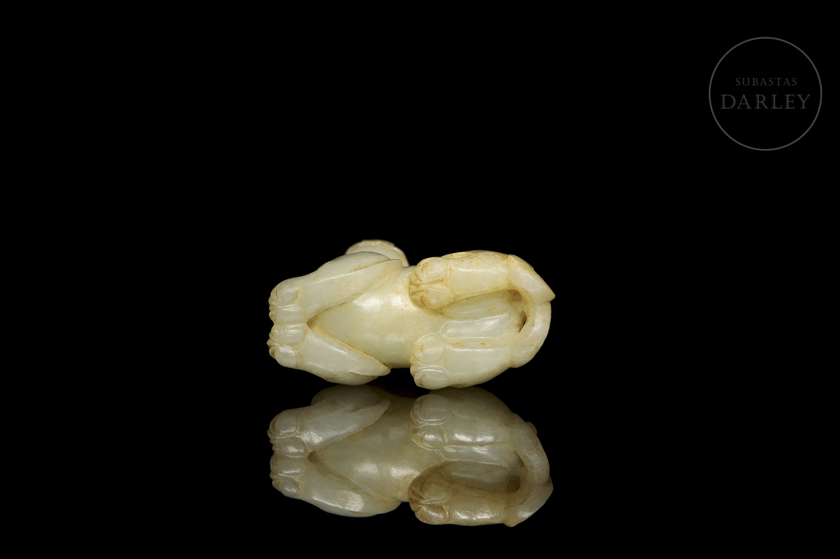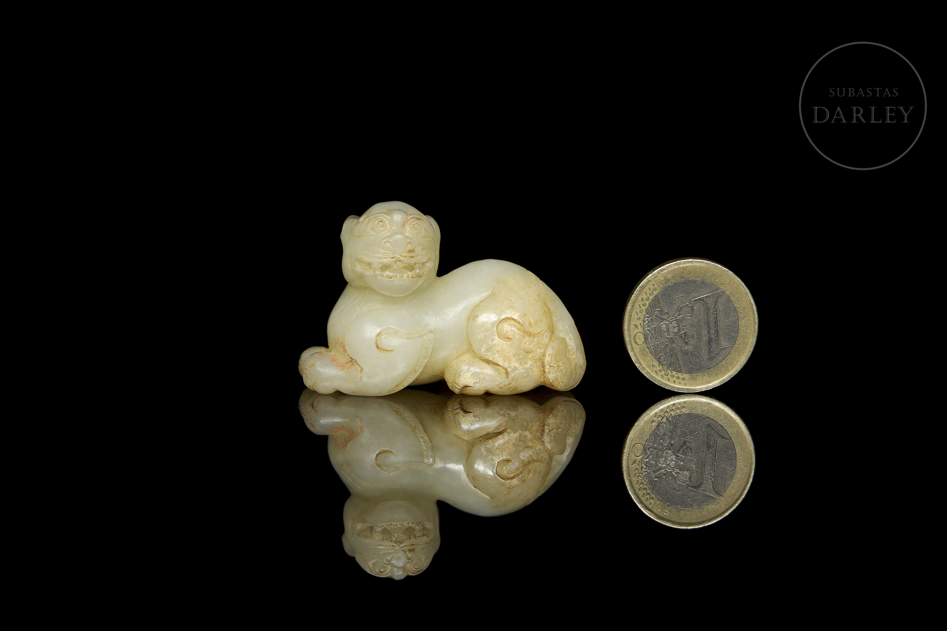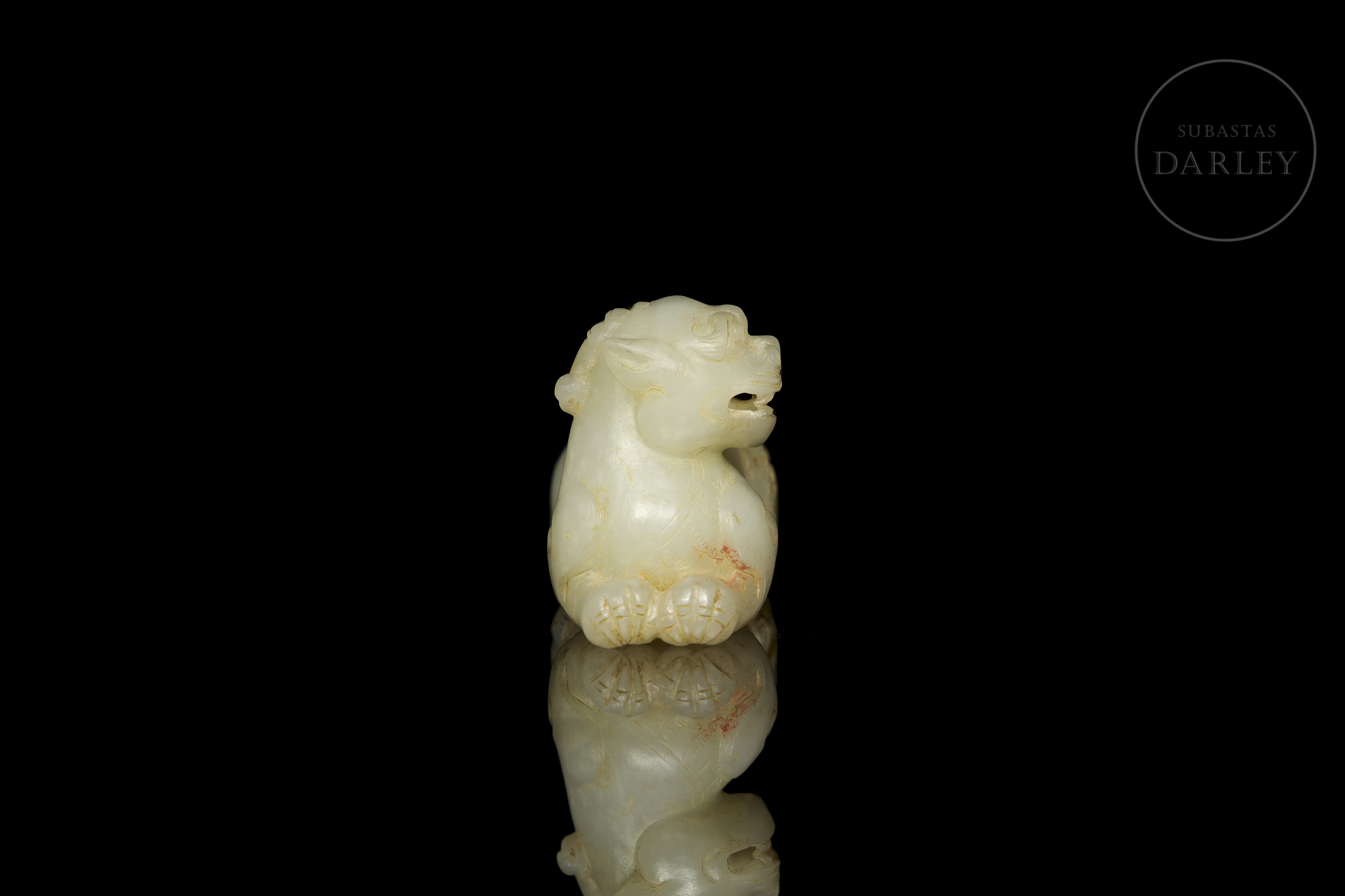 Jade de tonalidad blanca con áreas de pátina de color ocre y pequeñas manchas ferruginosas. Representa a un tigre en actitud de reposo, con la cabeza erguida y expresión poderosa de mandíbula entreabierta. El trabajo de talla define la musculatura, garras y rasgos faciales. Muestra decoraciones de volutas estilizadas y finas incisiones que sugieren el pelaje. Dinastía Han del Este (25–220 d.C.) o posterior.