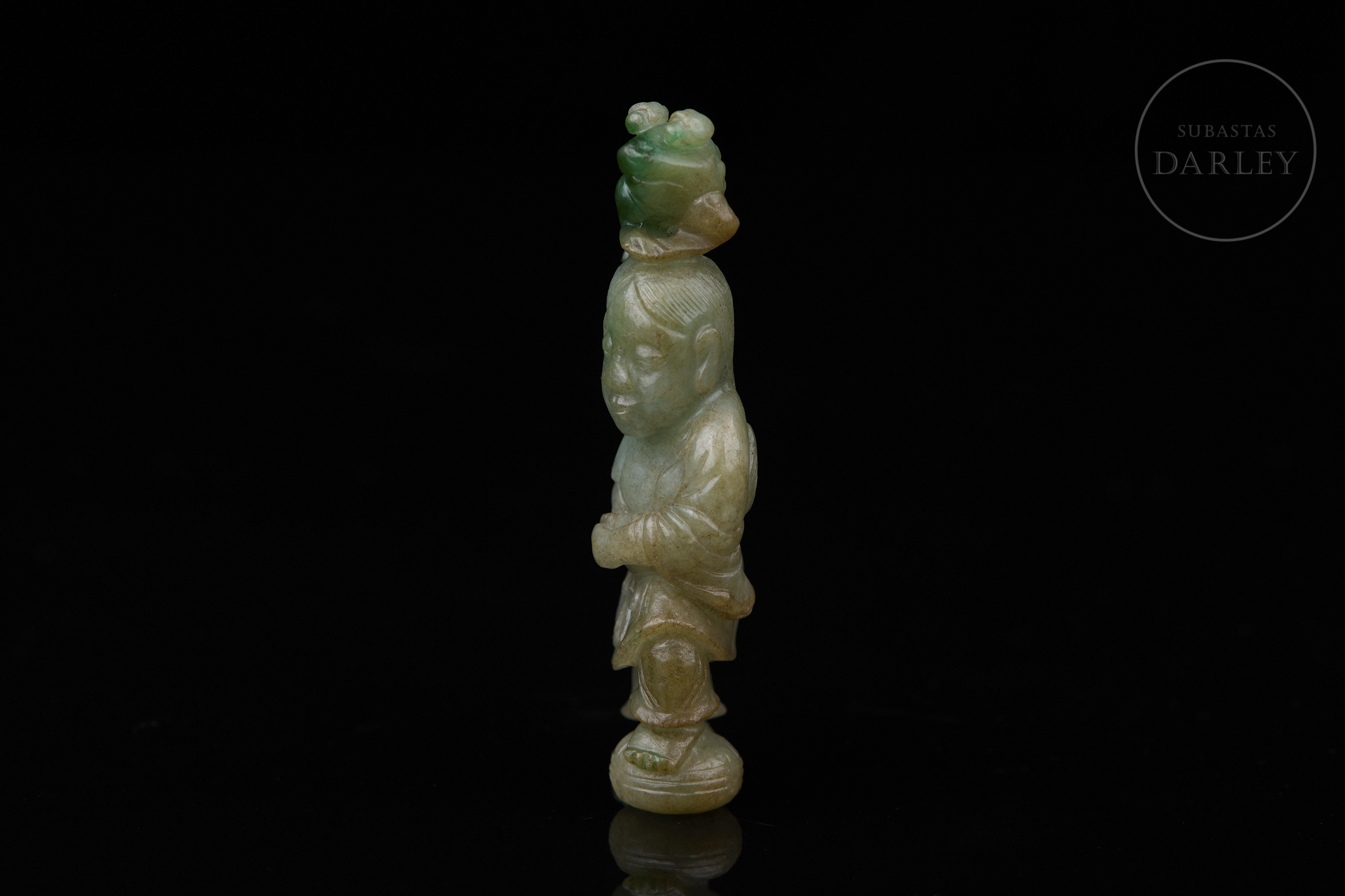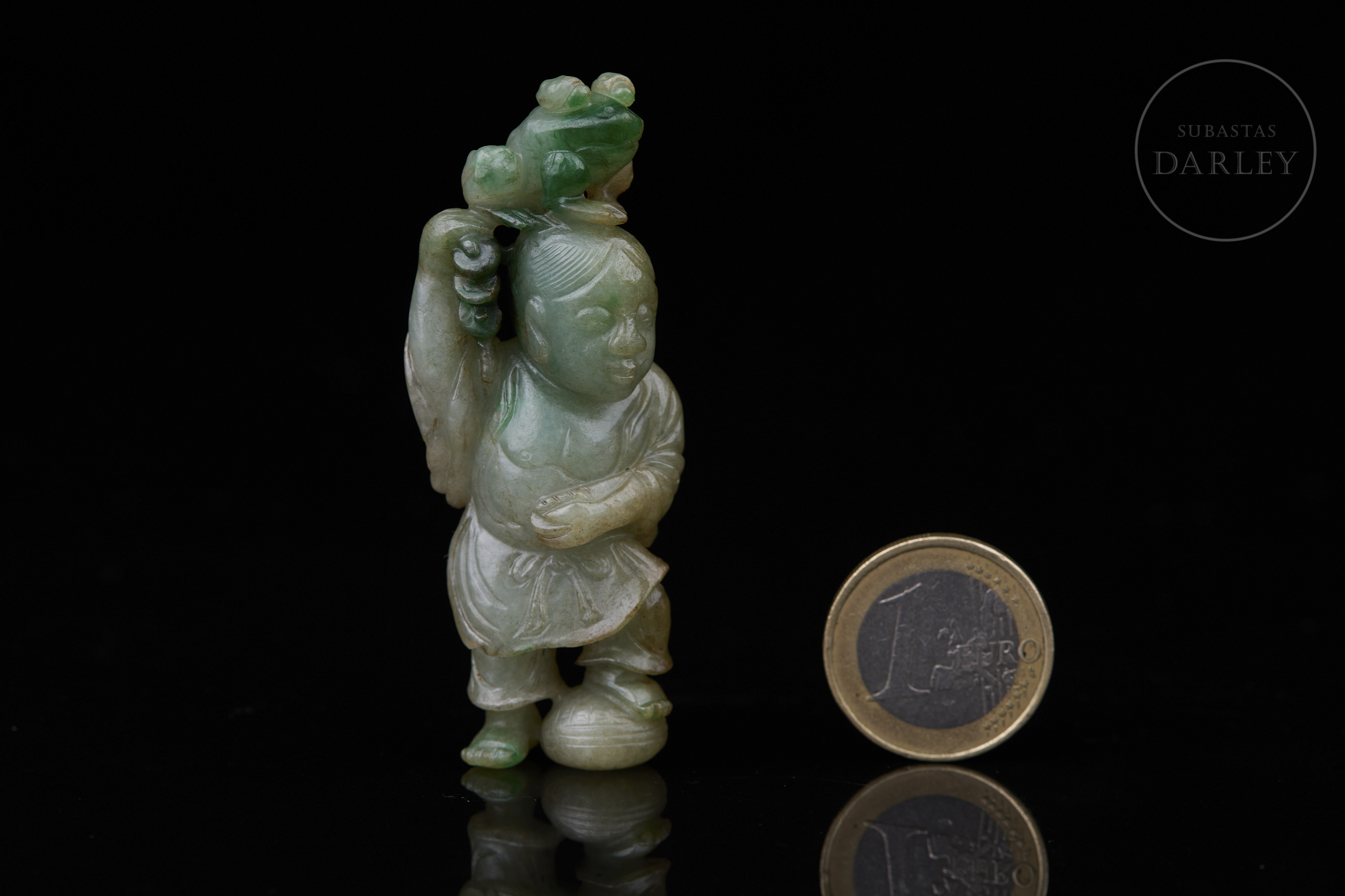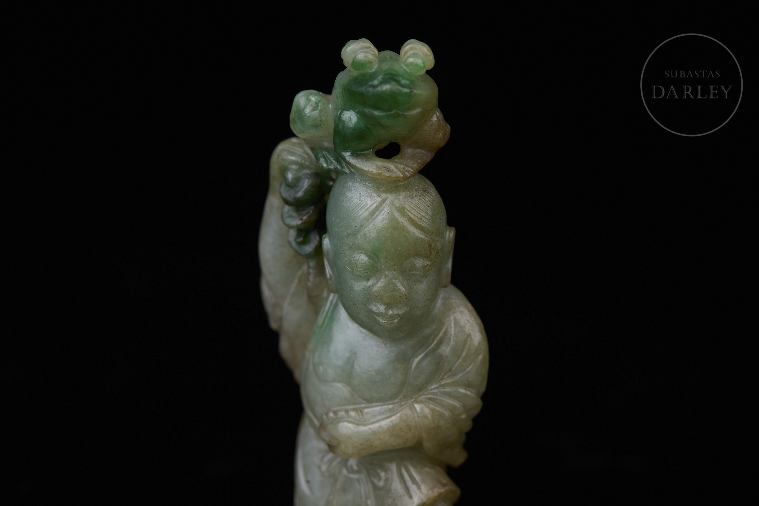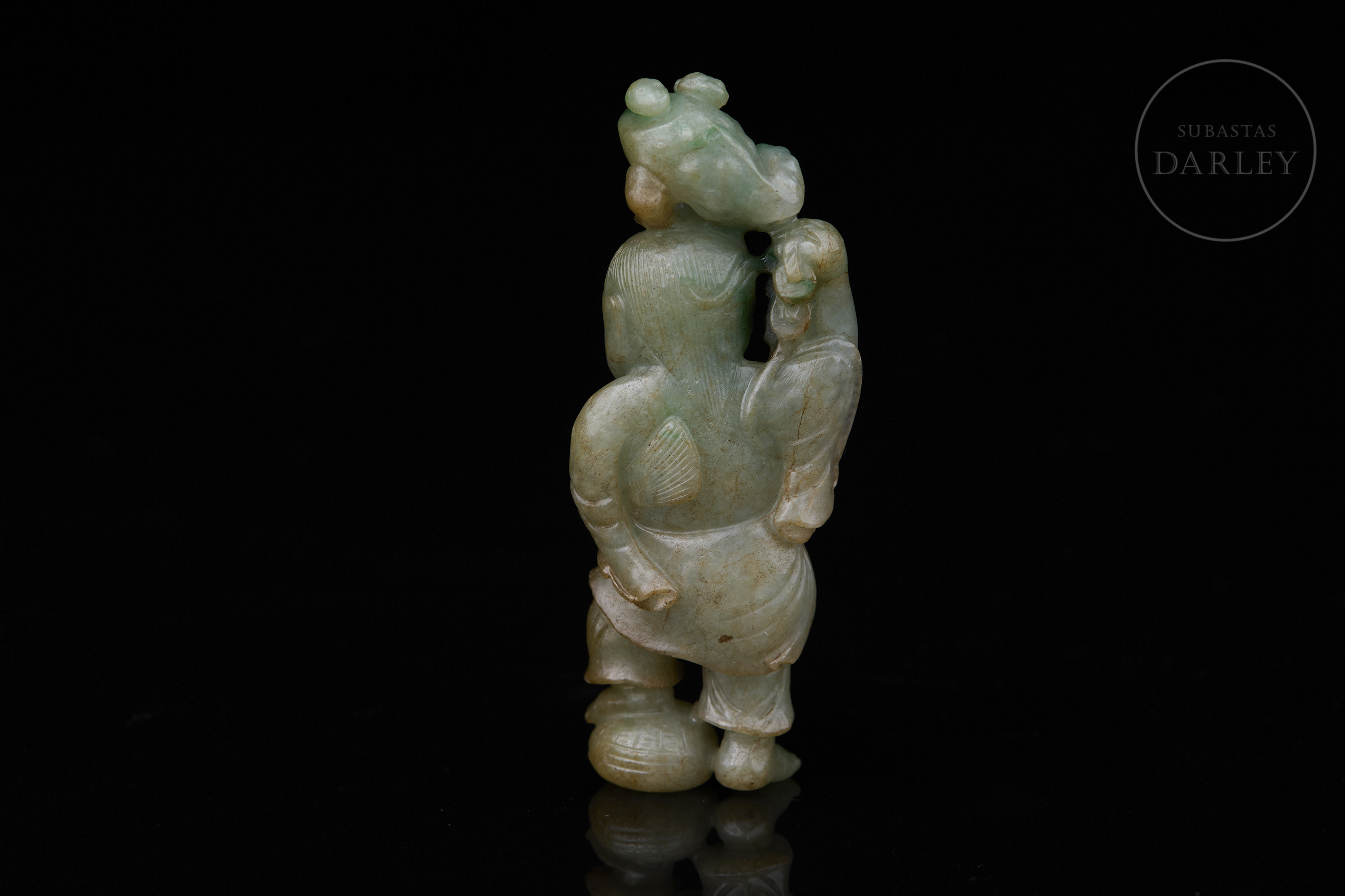 Jadeíta de tonalidad verde pálido con intensas manchas de color esmeralda. La pieza presenta una talla vertical que representa al inmortal Liu Hai en una actitud alegre y dinámica, con su vestimenta tradicional, sosteniendo sobre su cabeza al sapo de tres patas. En una de sus manos porta una sarta de monedas calada, mientras que sus pies descansan sobre un recipiente redondeado. Dinastía Qing (1644–1912).