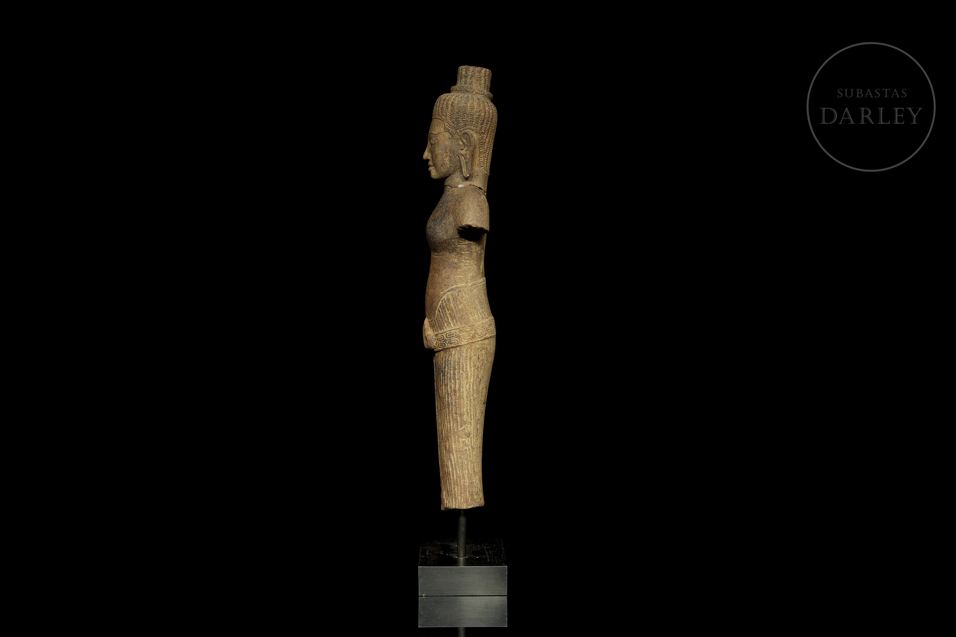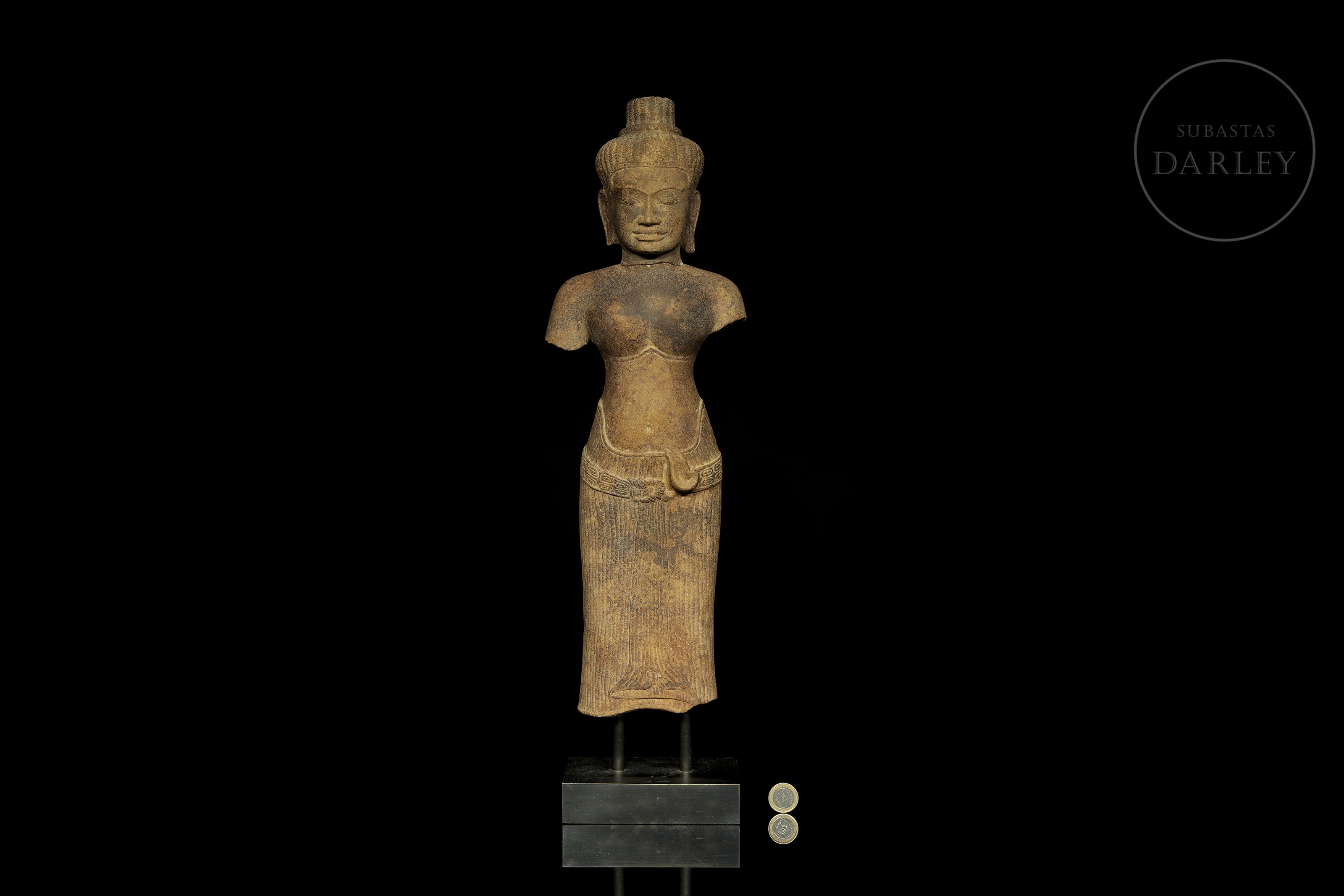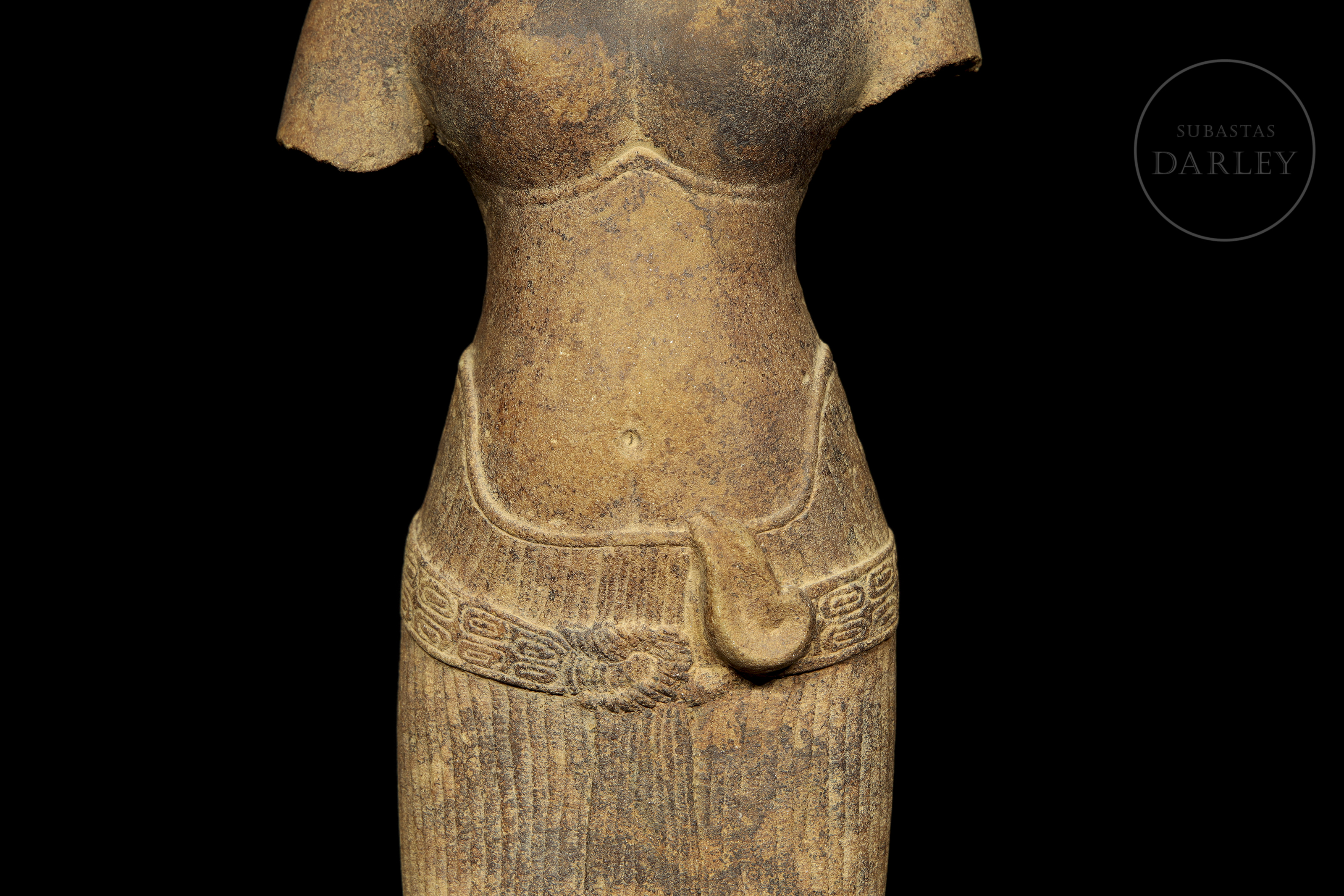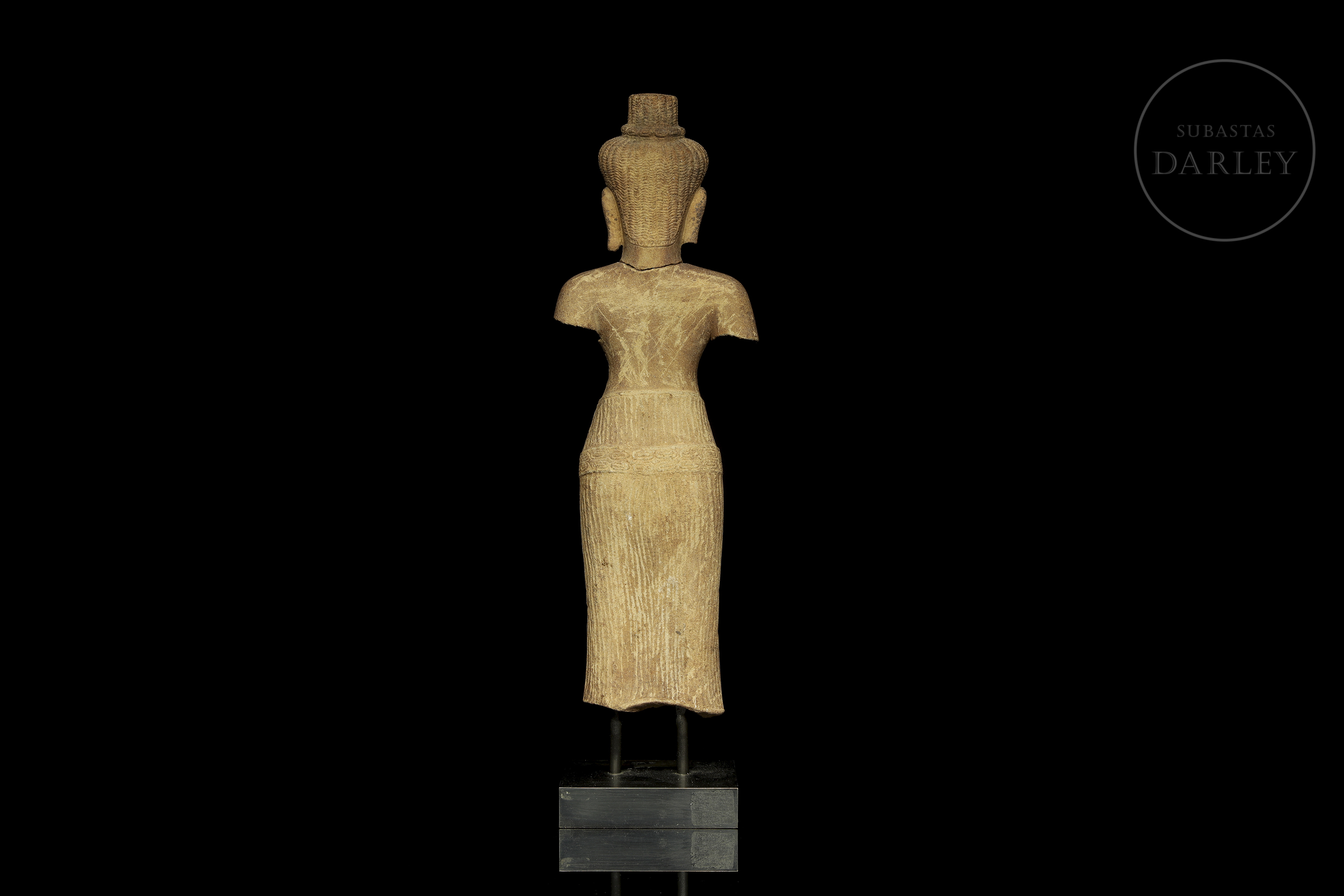 Escultura en piedra arenisca que representa el torso de una deidad femenina, característica del estilo Baphuon. La figura, erguida y de porte sereno, luce un elaborado peinado recogido en un alto moño cilíndrico y grandes orejeras. Viste una falda larga tradicional o sampot, ceñida a la cintura con un cinturón decorativo. A pesar de la erosión y la falta de los brazos, la pieza conserva la elegancia y la gracia propias de su estilo. Se presenta sobre una diseñada a medida. Adjunta certificado.