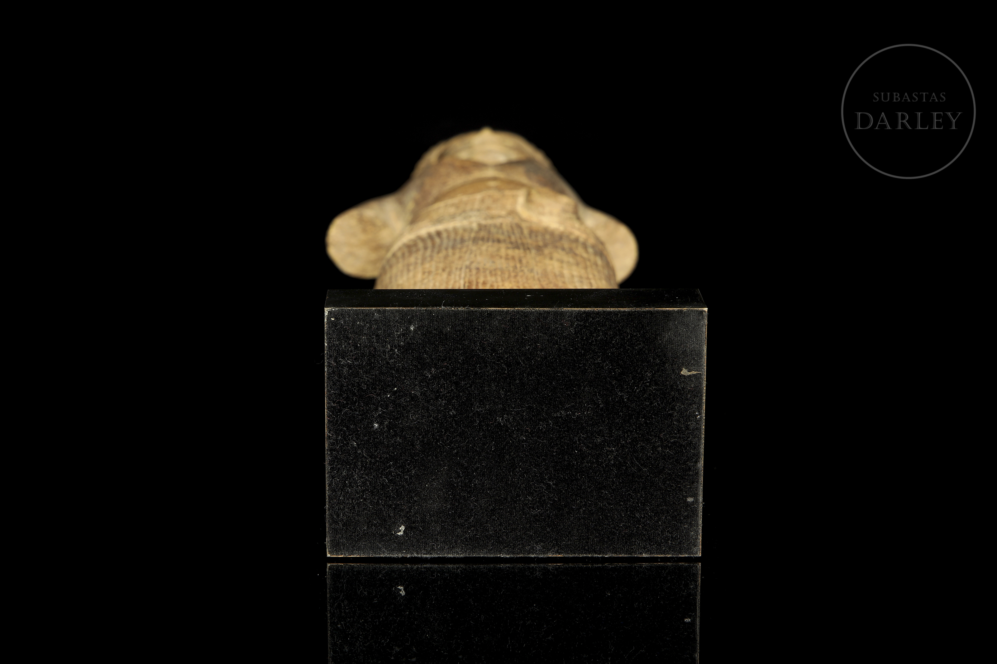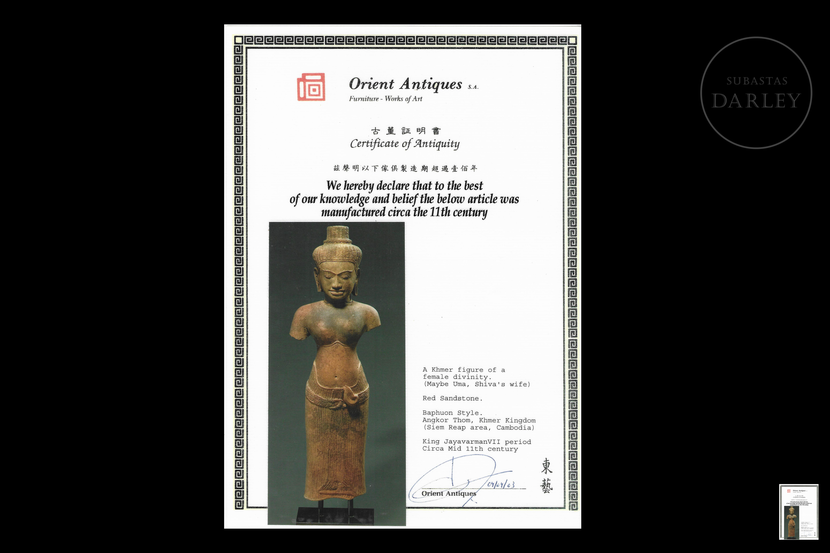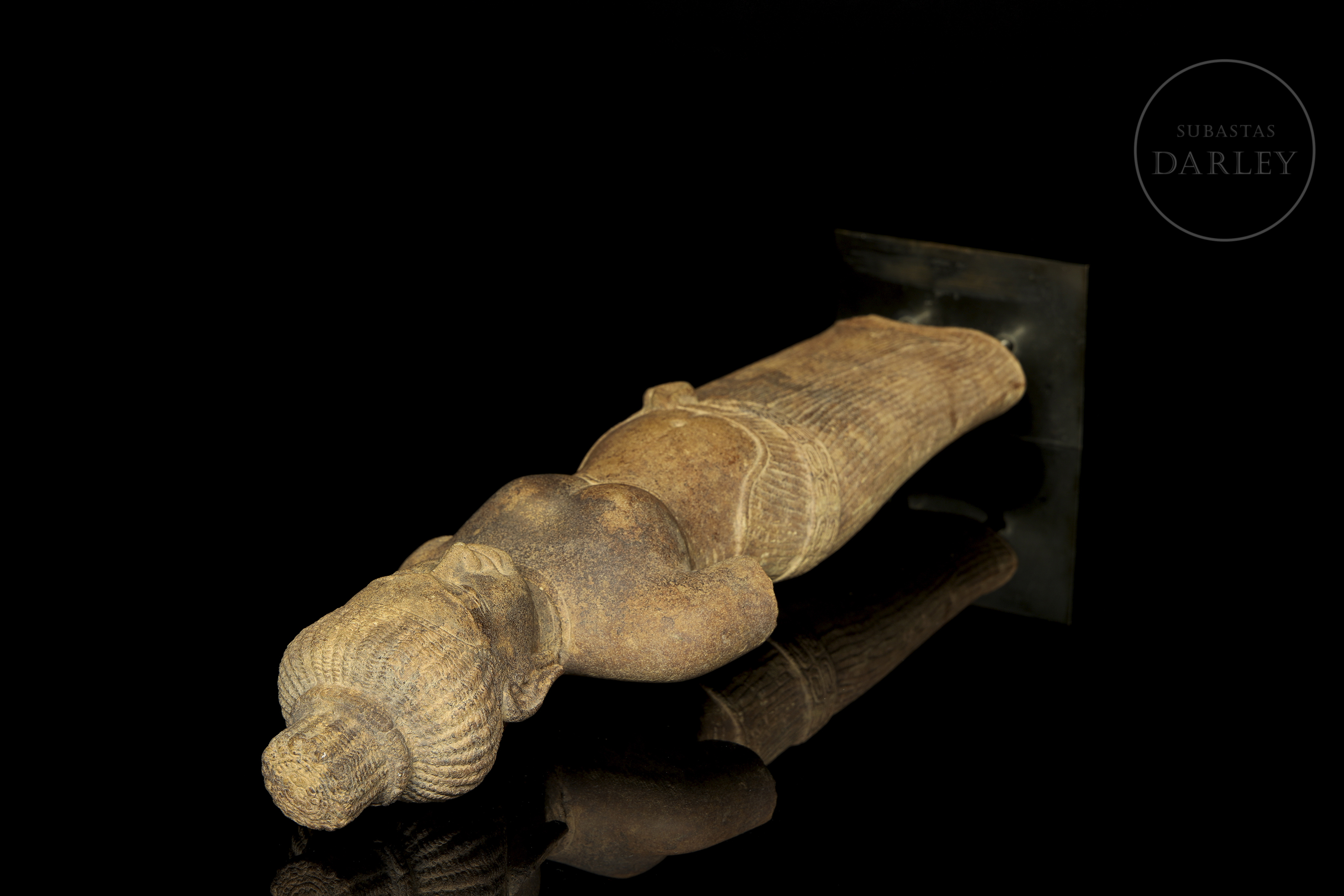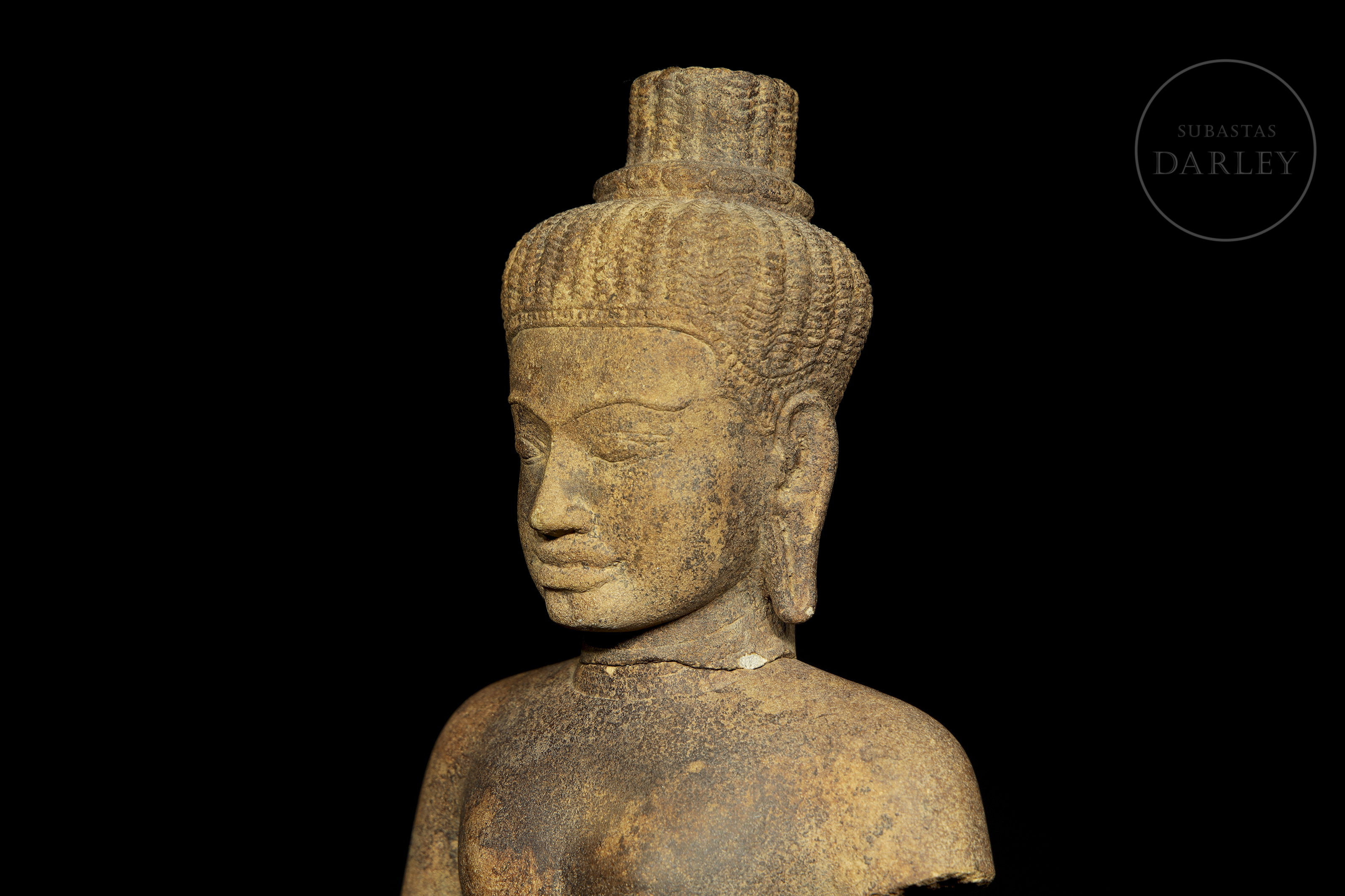 Escultura en piedra arenisca que representa el torso de una deidad femenina, característica del estilo Baphuon. La figura, erguida y de porte sereno, luce un elaborado peinado recogido en un alto moño cilíndrico y grandes orejeras. Viste una falda larga tradicional o sampot, ceñida a la cintura con un cinturón decorativo. A pesar de la erosión y la falta de los brazos, la pieza conserva la elegancia y la gracia propias de su estilo. Se presenta sobre una diseñada a medida. Adjunta certificado.