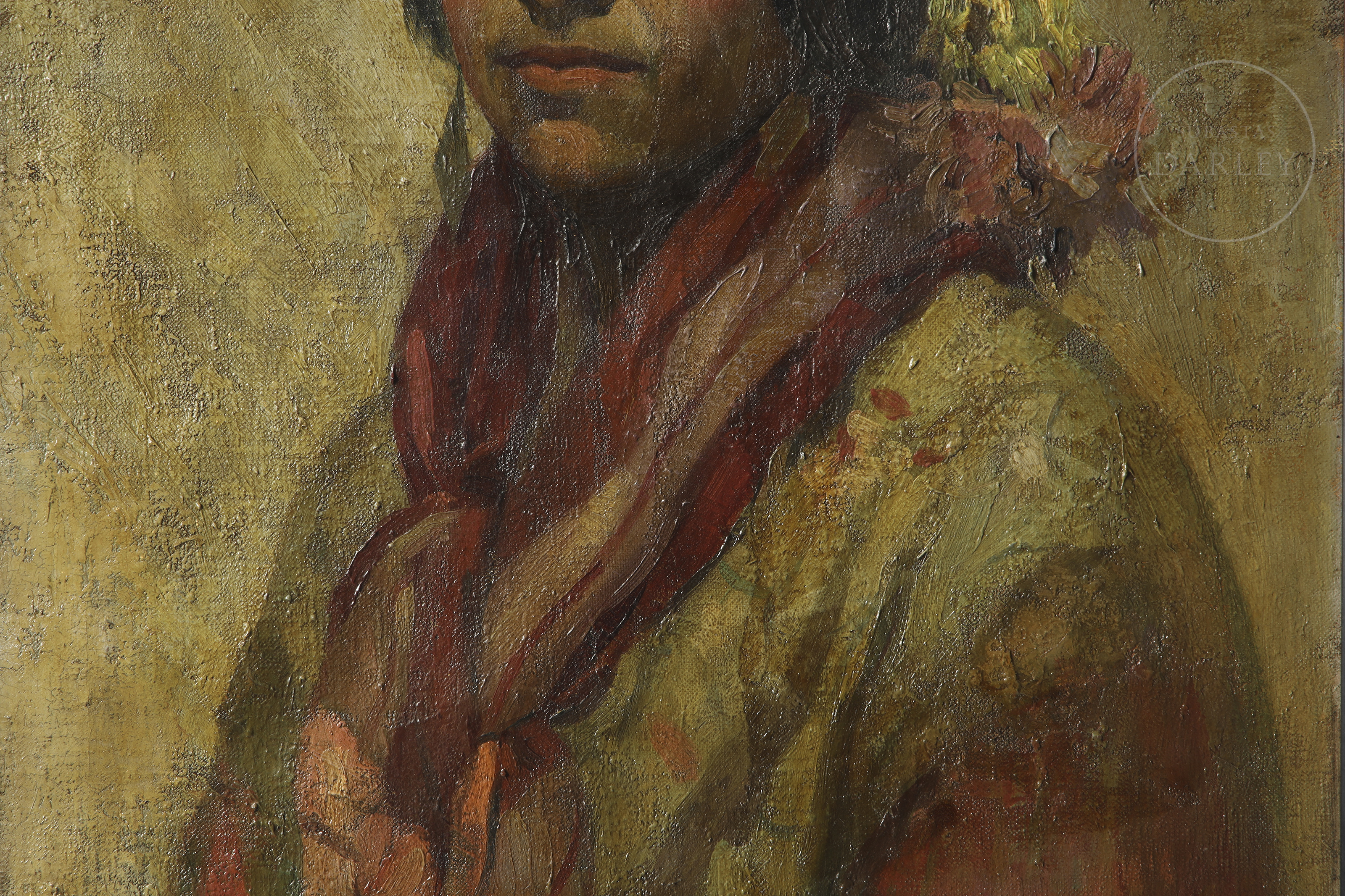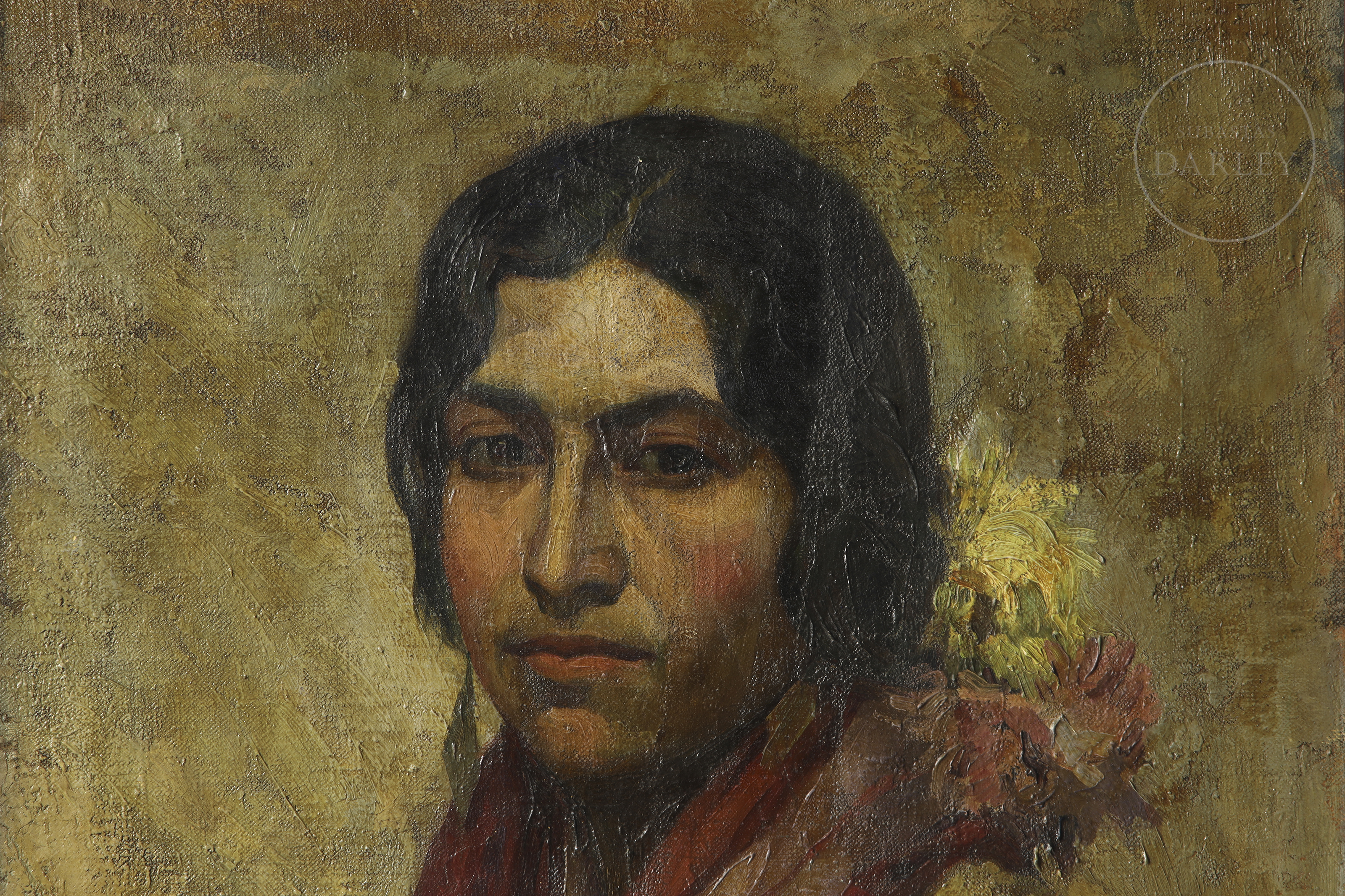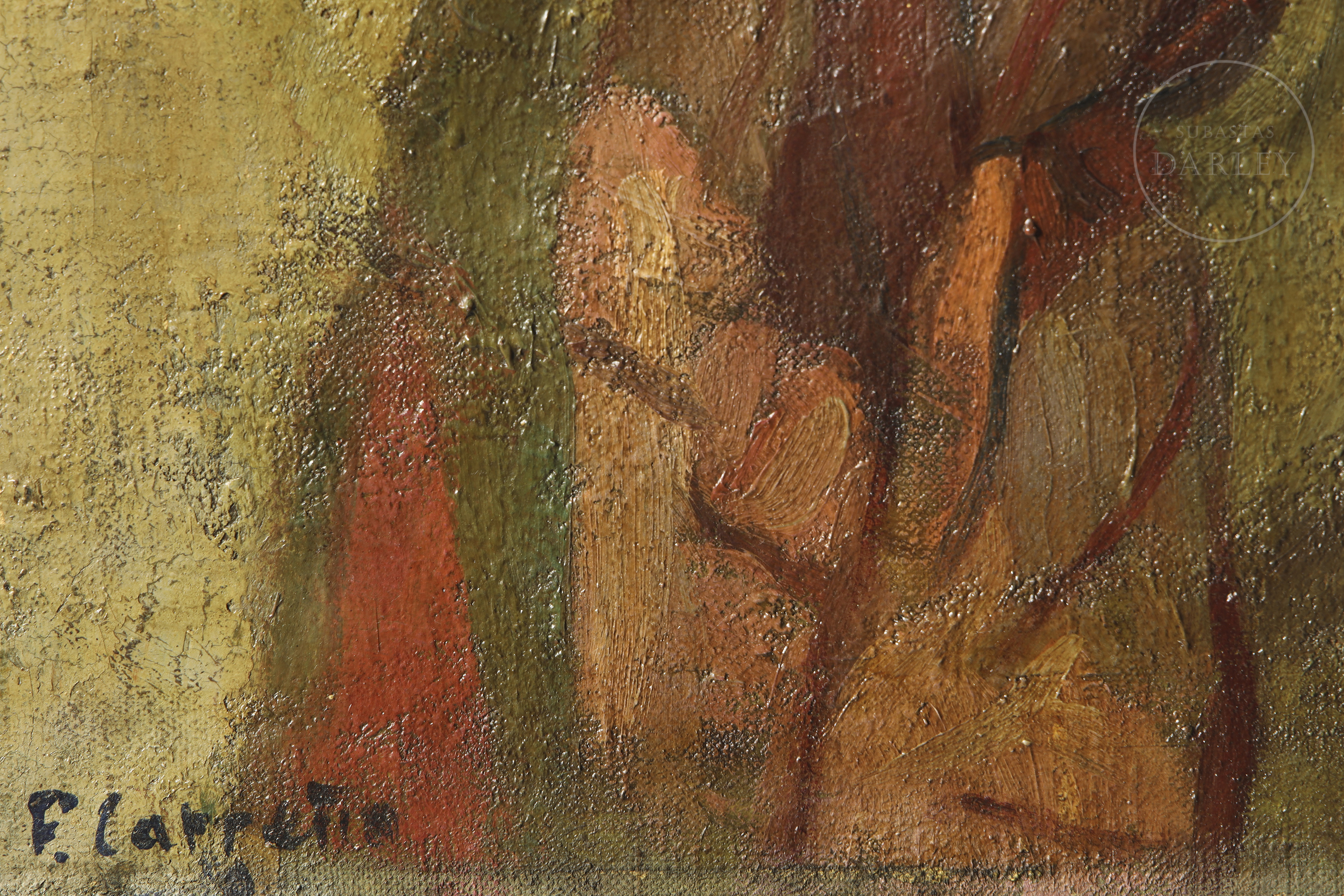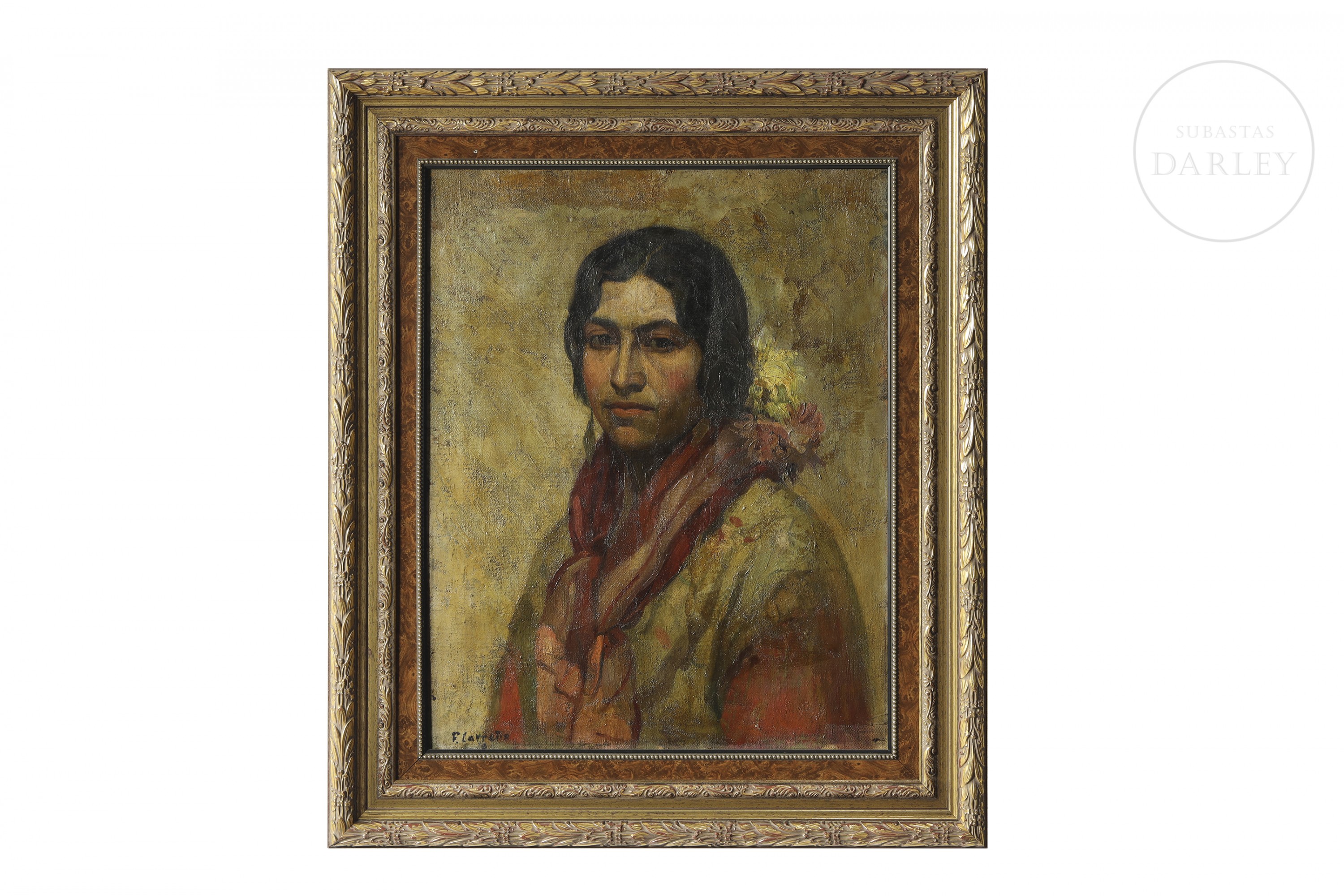 Ólseo sobre lienzo. Obra de carácter matérico y gestual que representa el busto de una joven con un pañuelo rojo al cuello y una flor en el cabello. Firmado "F. Carreño" en la esquina inferior izquierda.