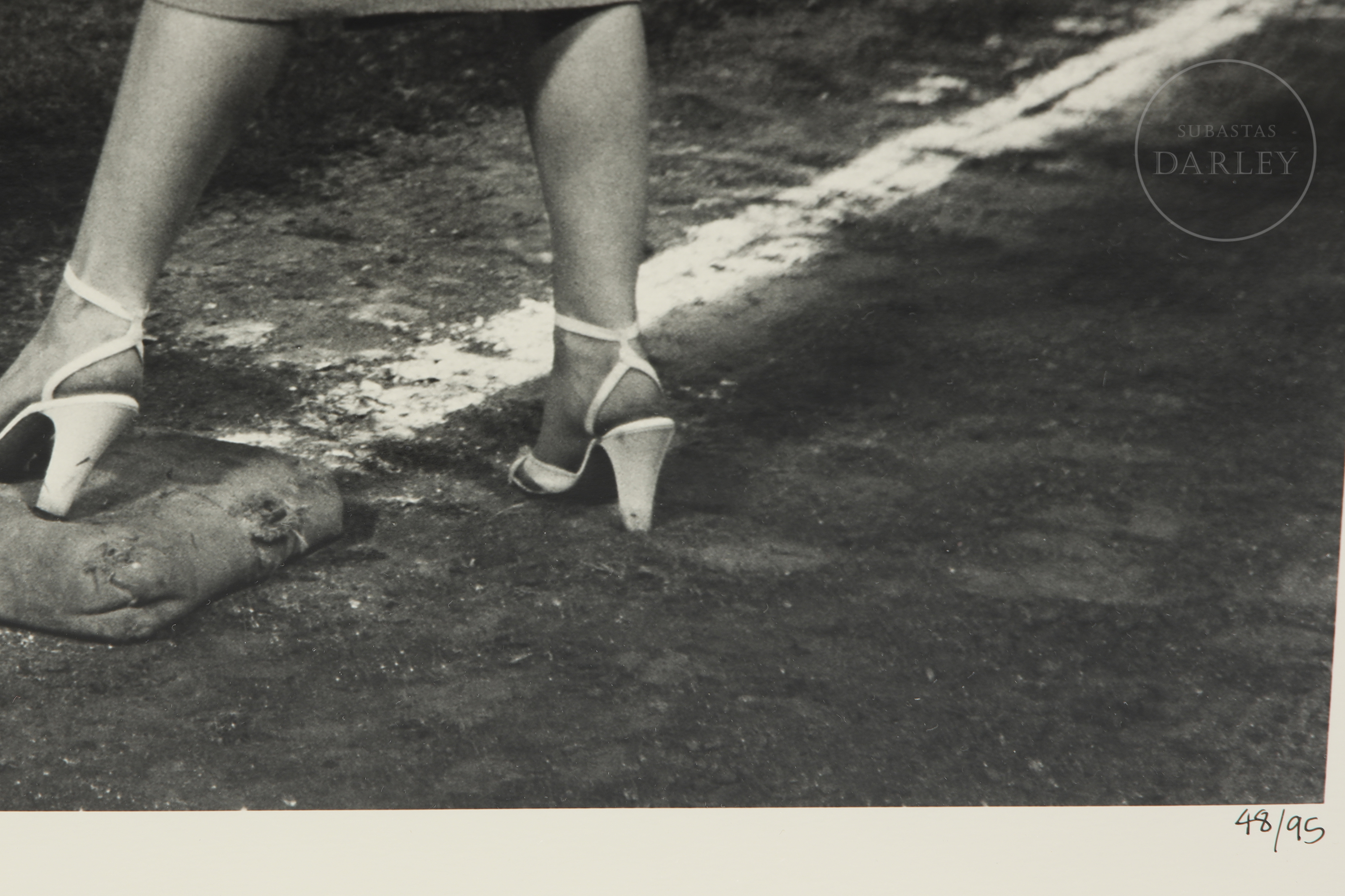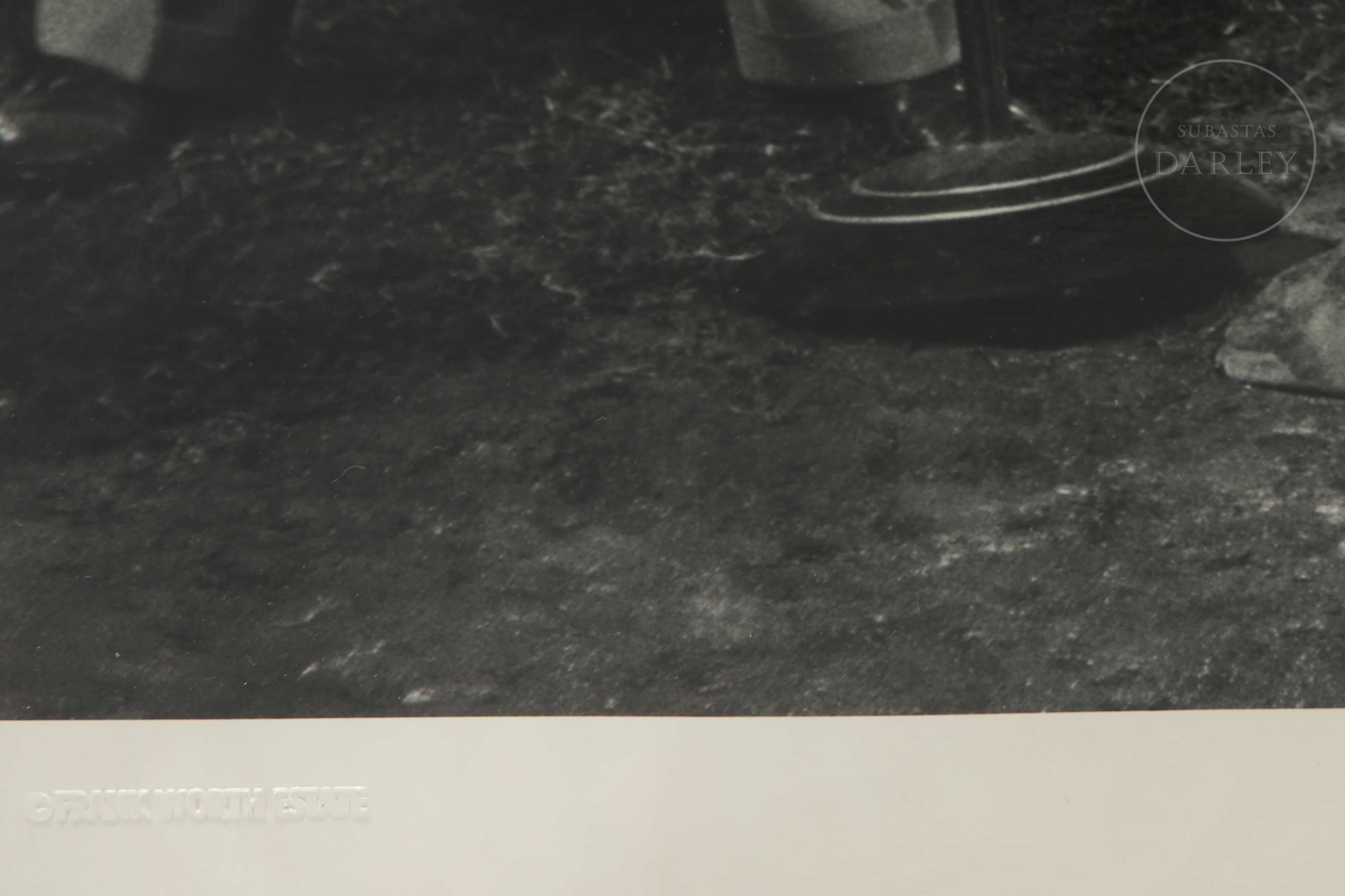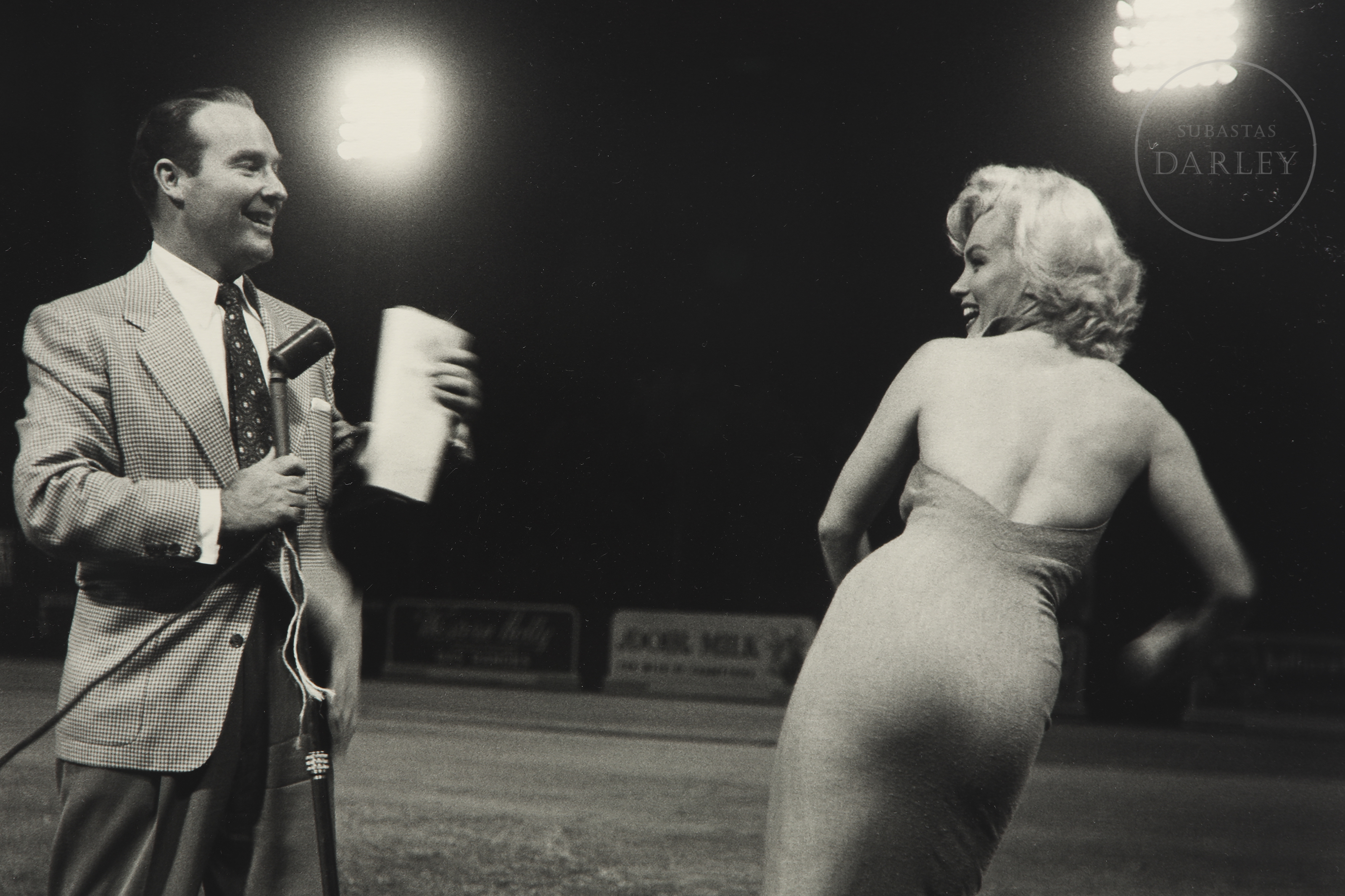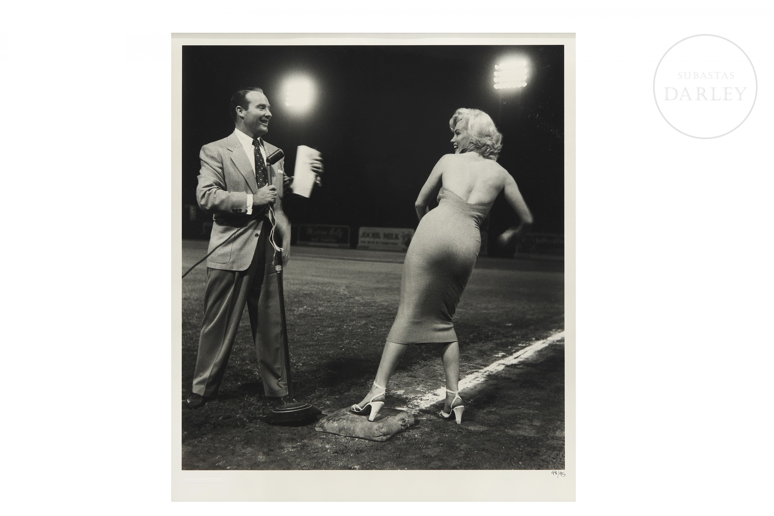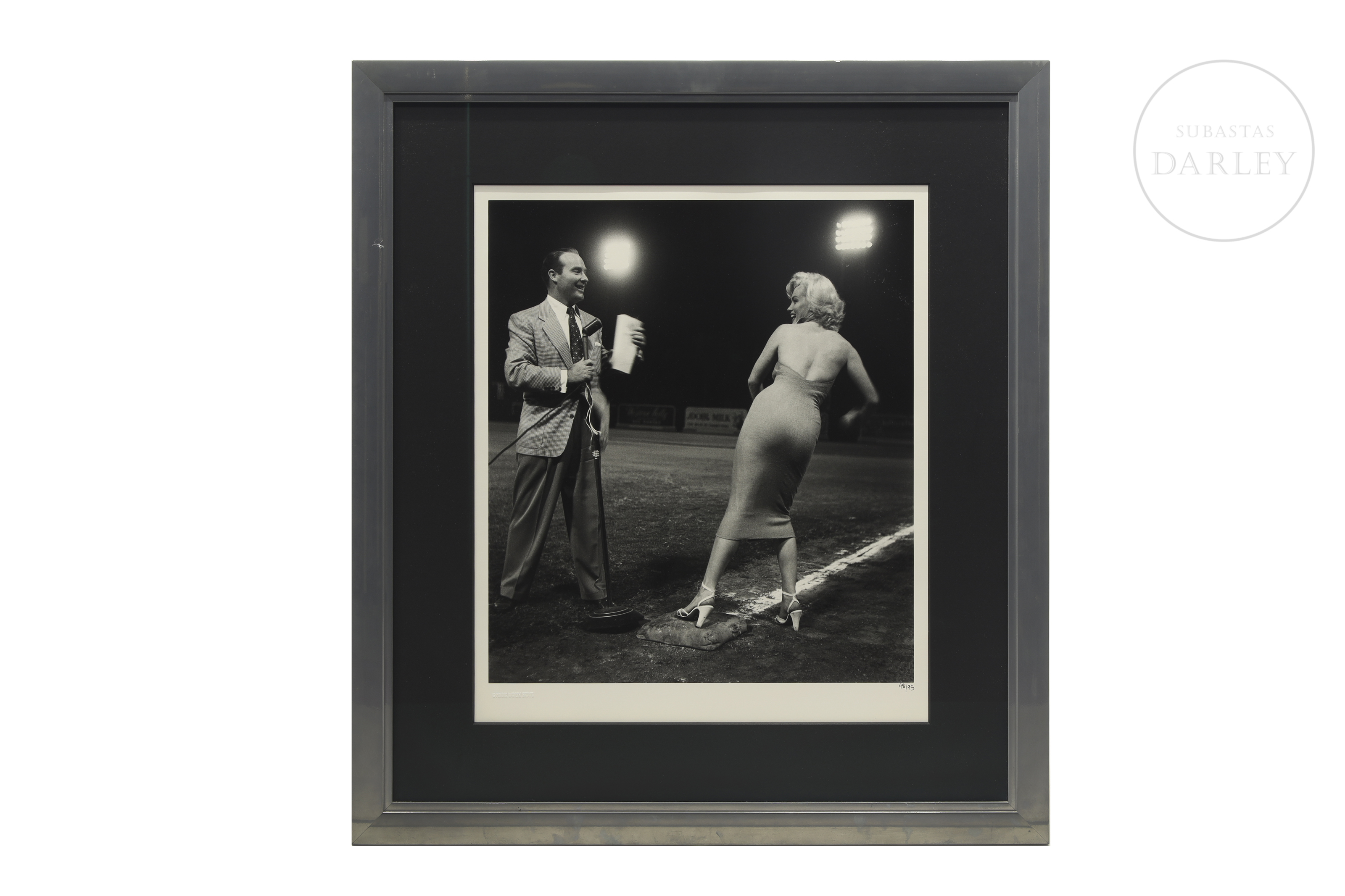 Impresión en blanco y negro a partir de una fotografía de Frank Worth. En ella, aparecen plasmados Marilyn Monroe y Ralph Edwards, en un campo de béisbol de Hollywood. Edición limitada, sellada en el borde inferior izquierdo por "Frank Worth Estate" y numerada 48/95 en la esquina inferior derecha.