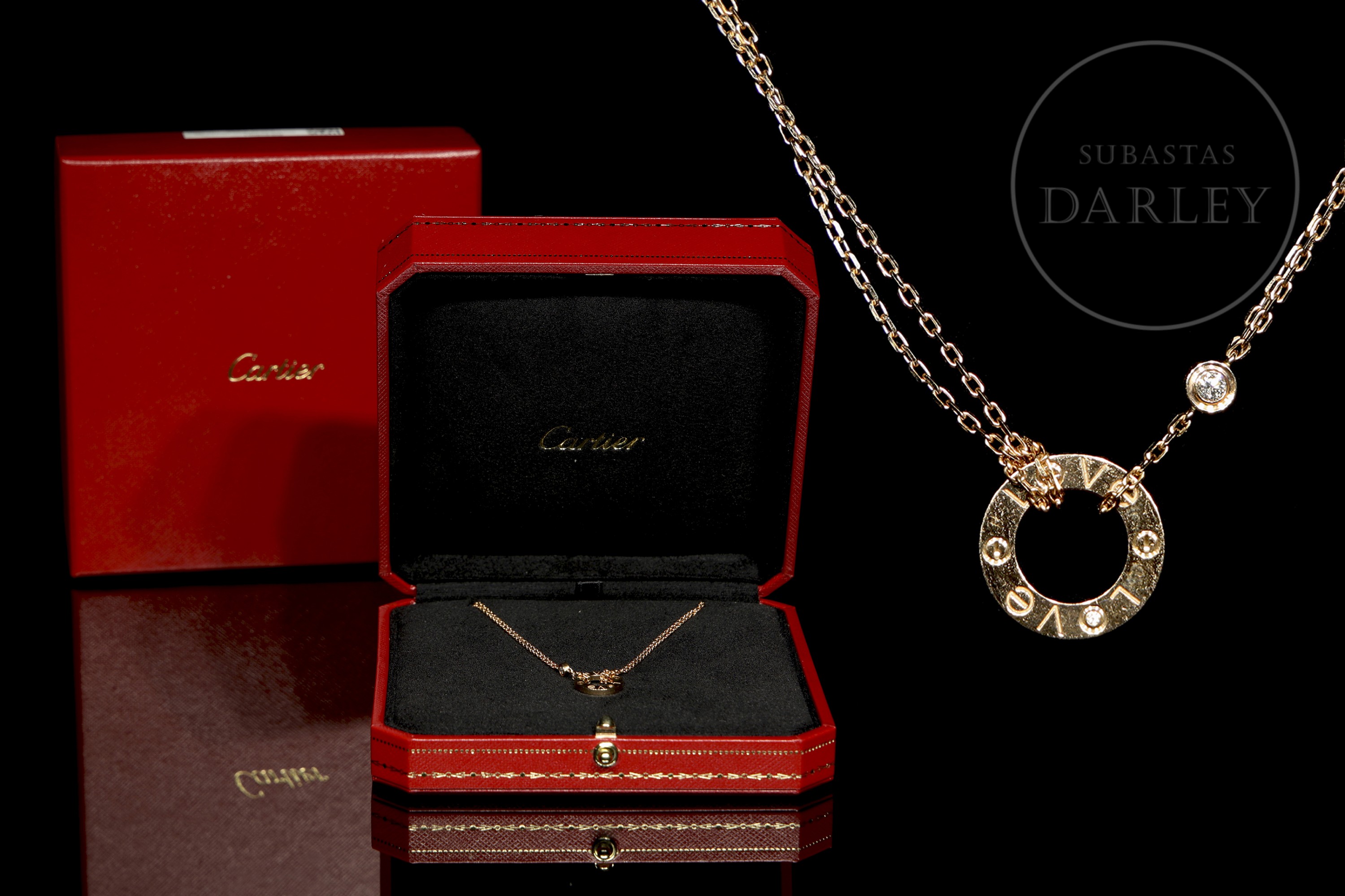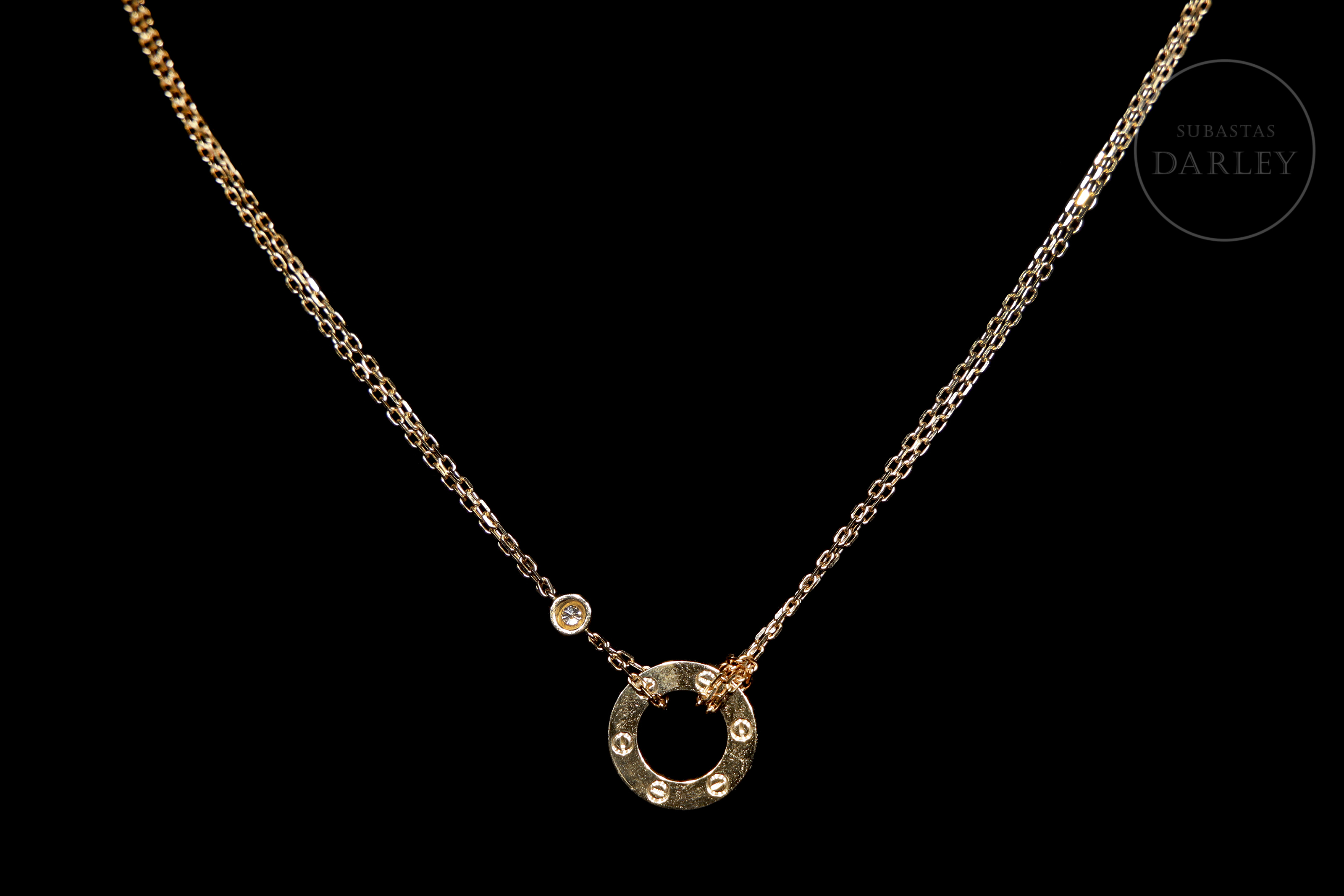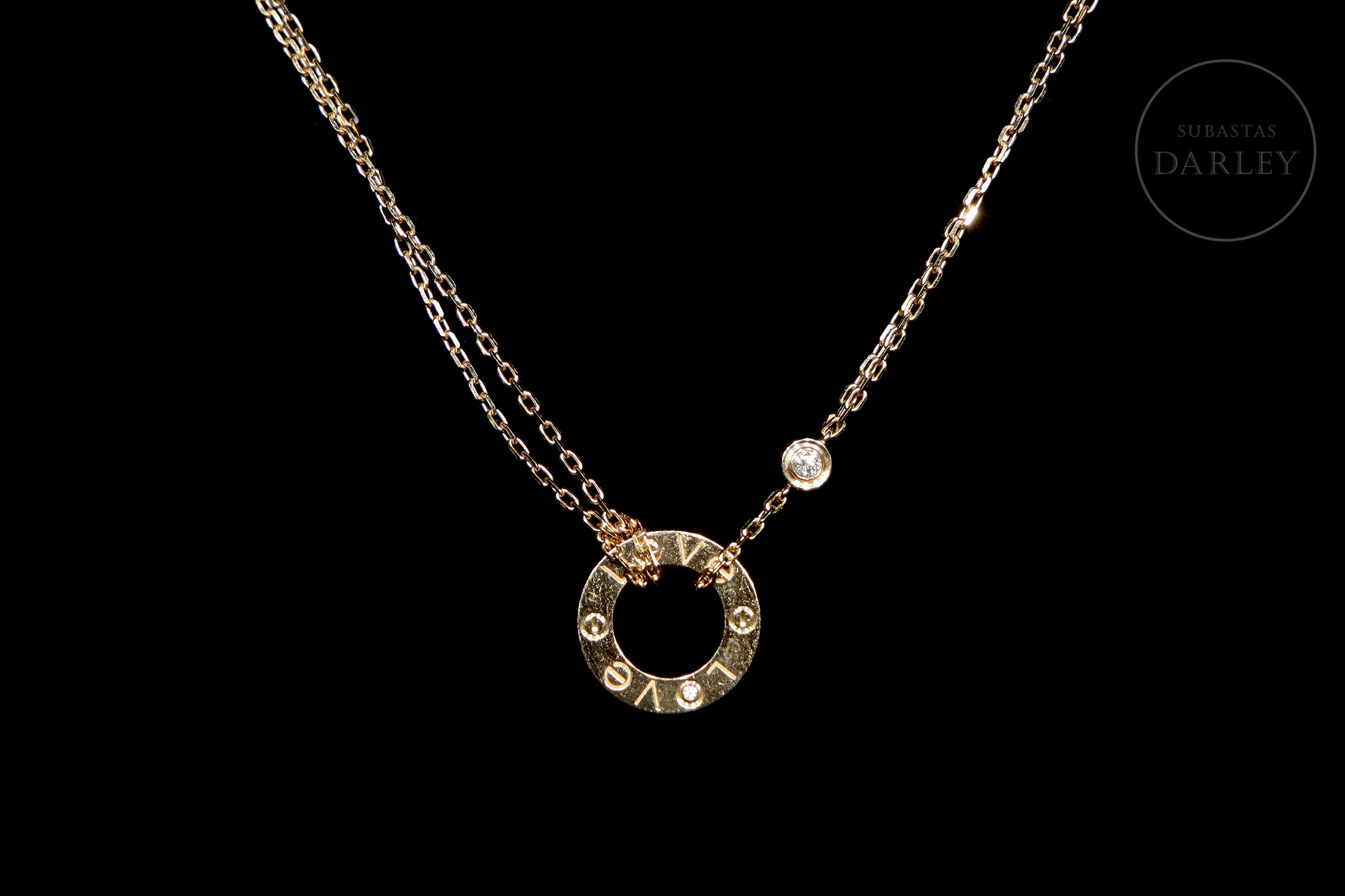 Gargantilla original de Cartier perteneciente a la colección Love, confeccionada en oro rosa de 18 kt. Presenta una cadena doble de eslabones finos y un colgante circular decorado con los característicos tornillos, junto a un diamante engastado en bisel en la cadena.