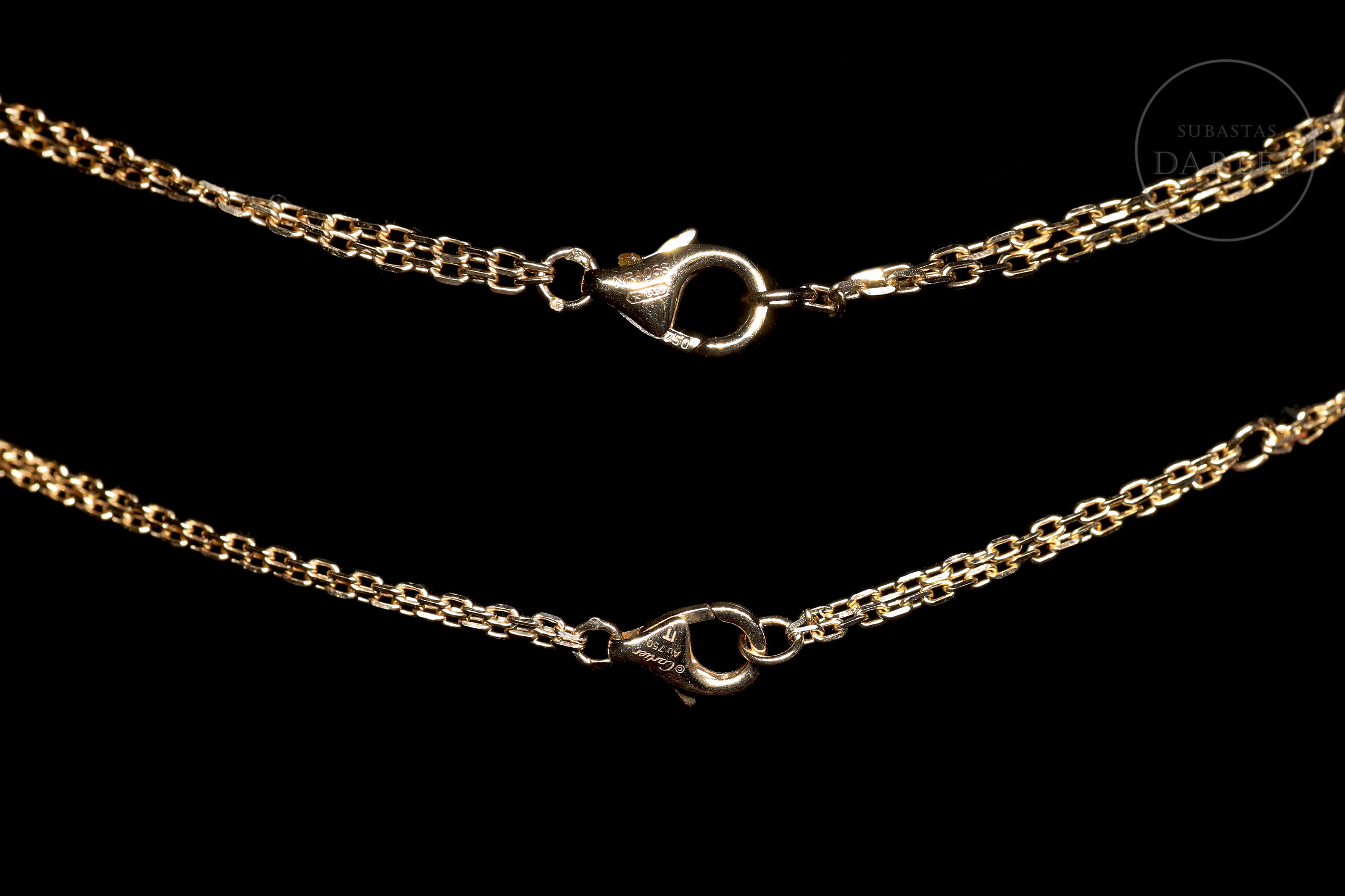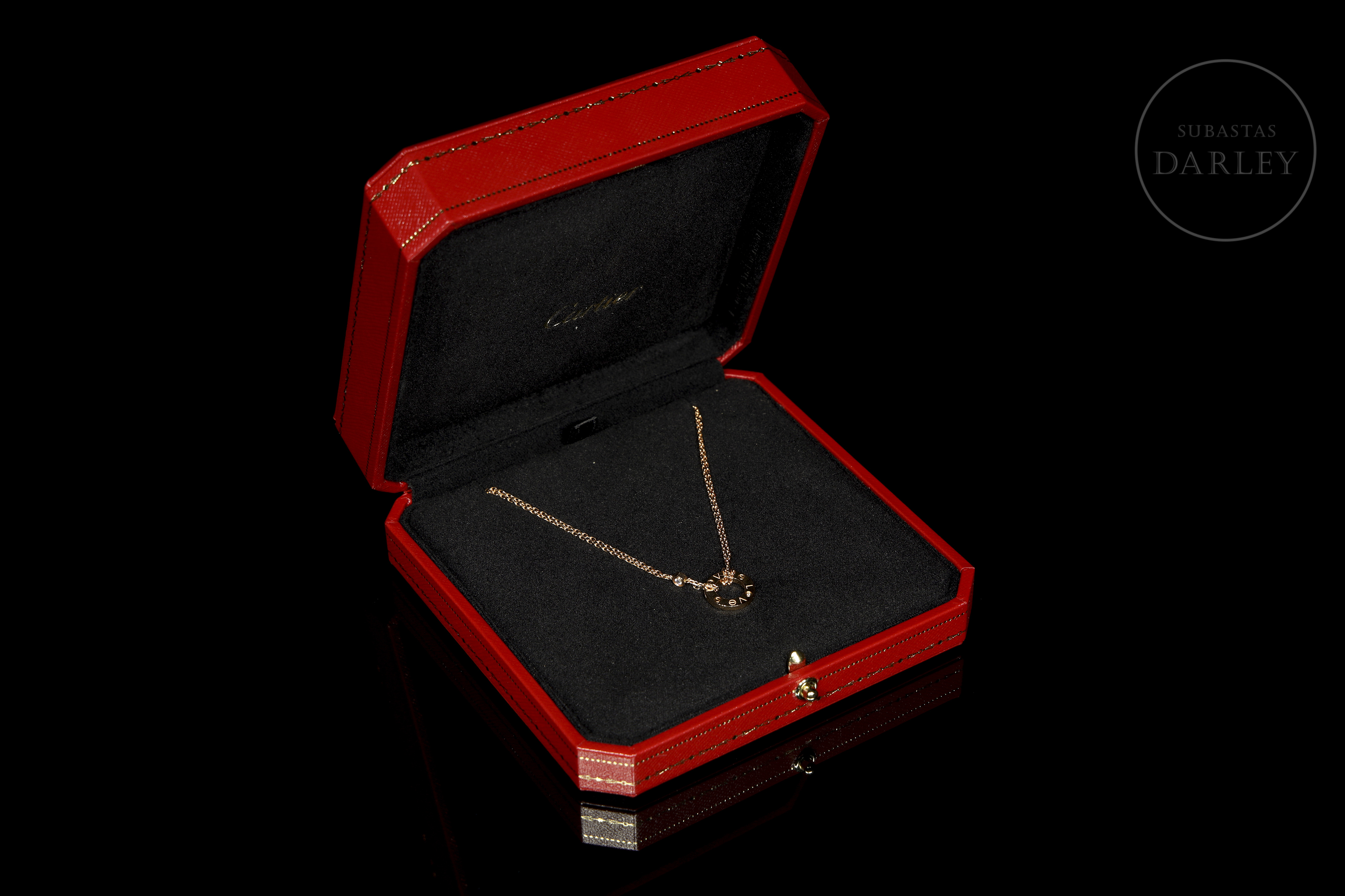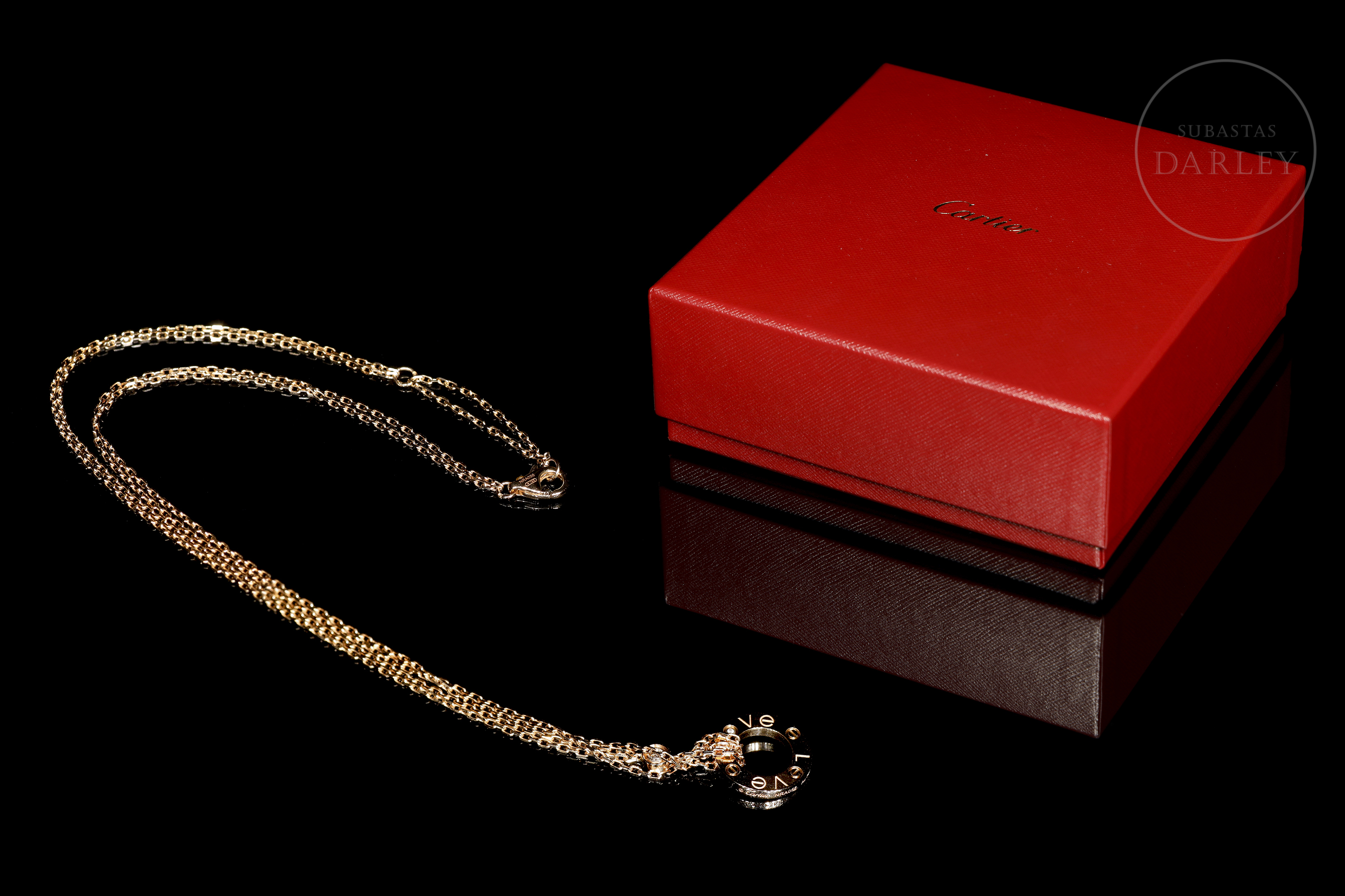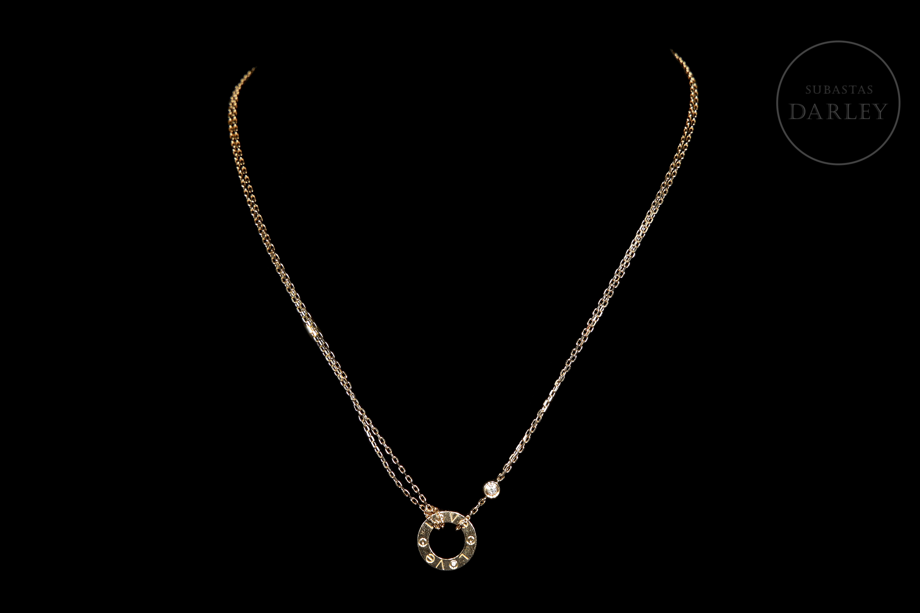 Gargantilla original de Cartier perteneciente a la colección Love, confeccionada en oro rosa de 18 kt. Presenta una cadena doble de eslabones finos y un colgante circular decorado con los característicos tornillos, junto a un diamante engastado en bisel en la cadena.