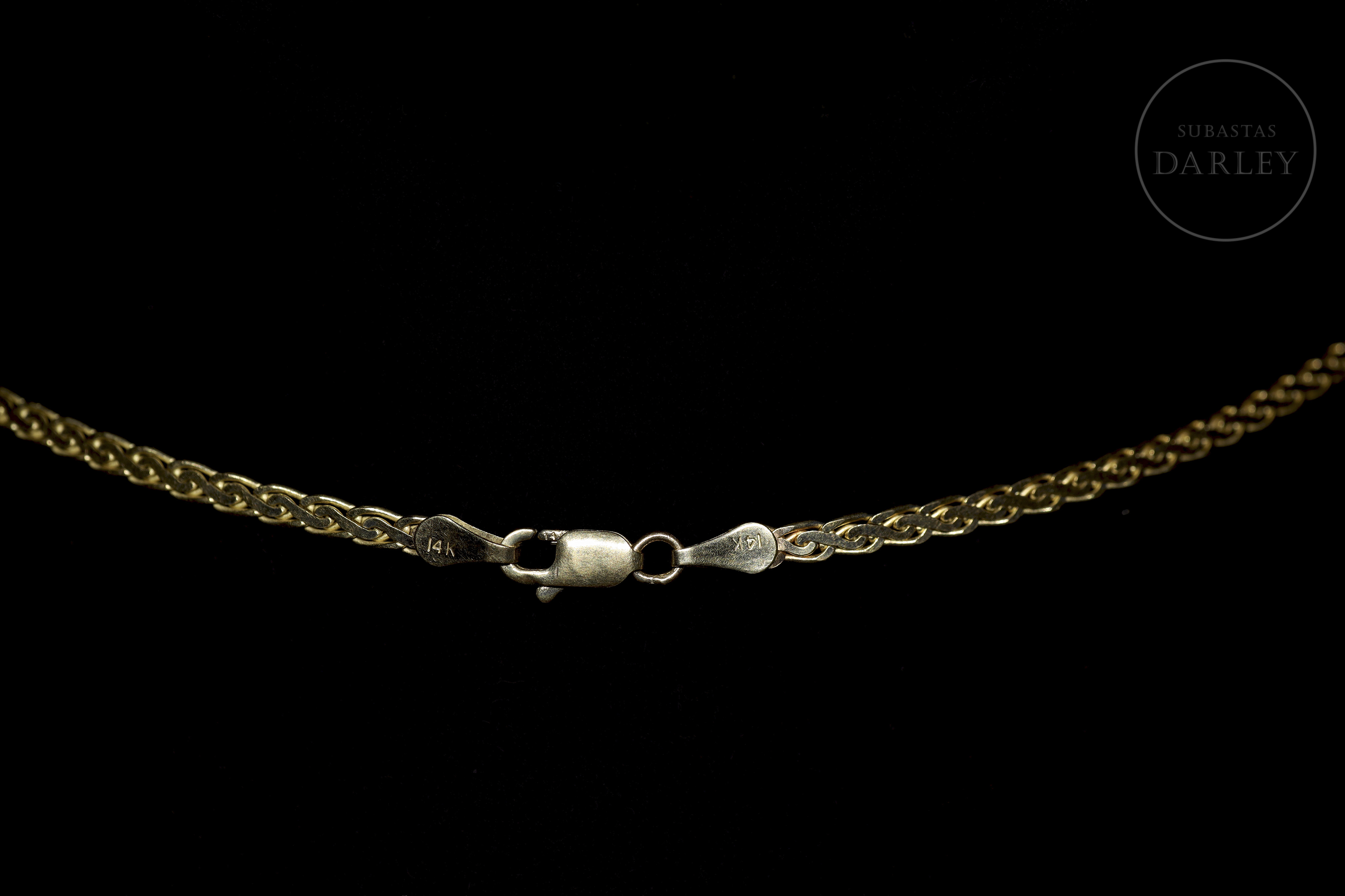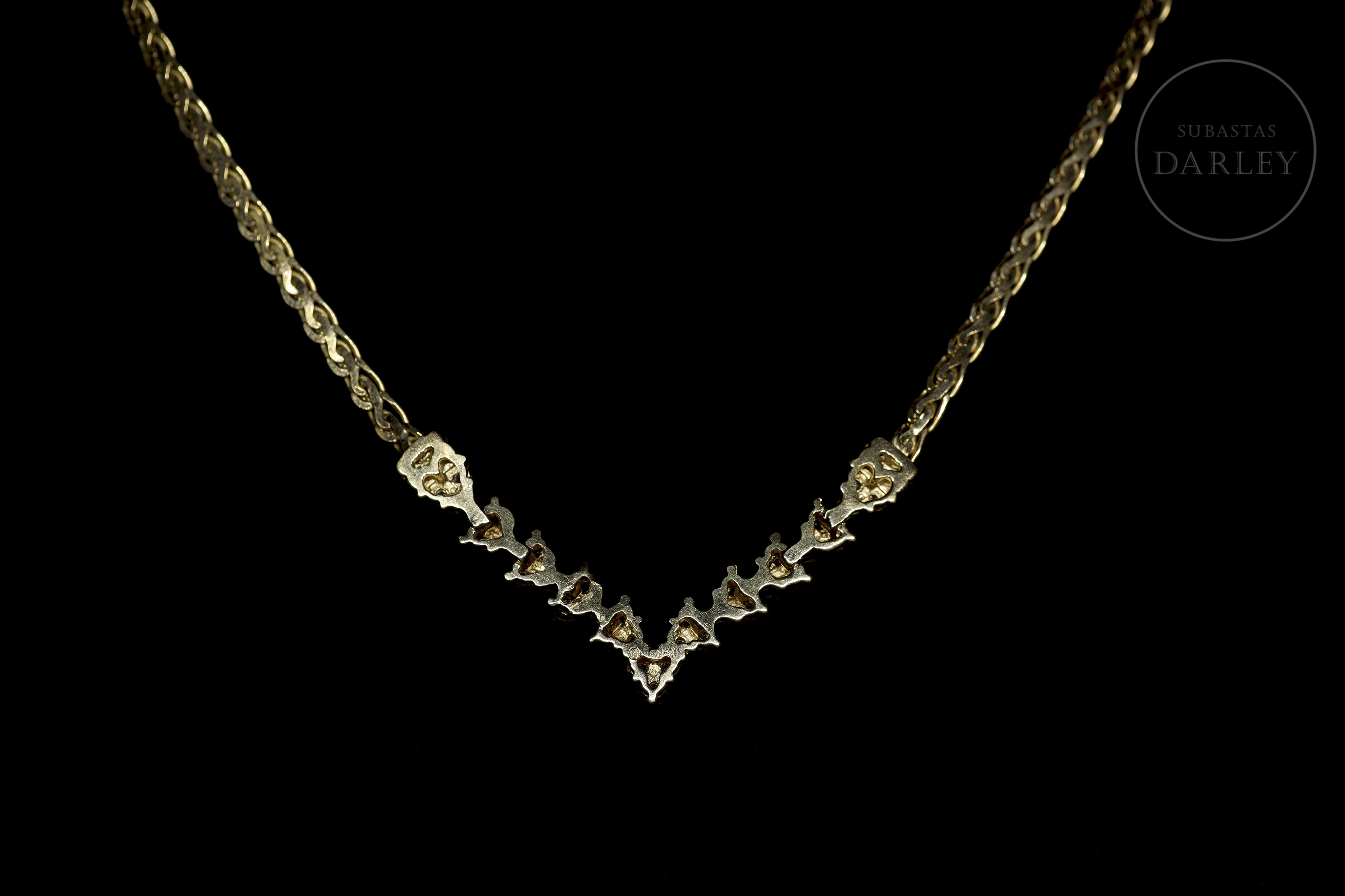 Gargantilla en oro amarillo de 14k, compuesta por una cadena de eslabón trenzado y un elegante diseño central en forma de “V”. El centro está adornado con un total de 15 esmeraldas de vivos tonos verdes y 18 diamantes talla brillante, alternando entre sí para crear un efecto de contraste. Las piedras están engastadas en garras. Cierre de tipo mosquetón.