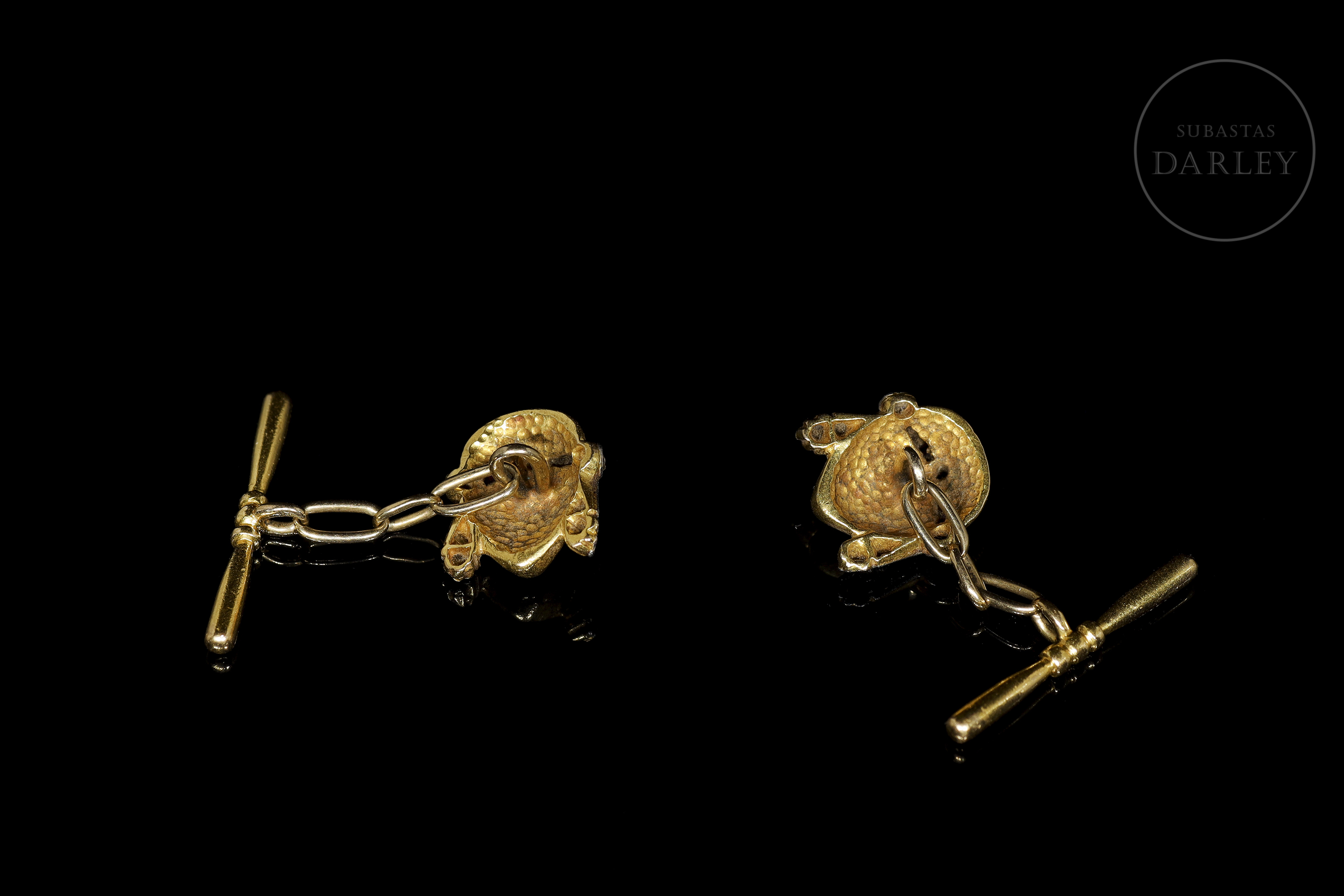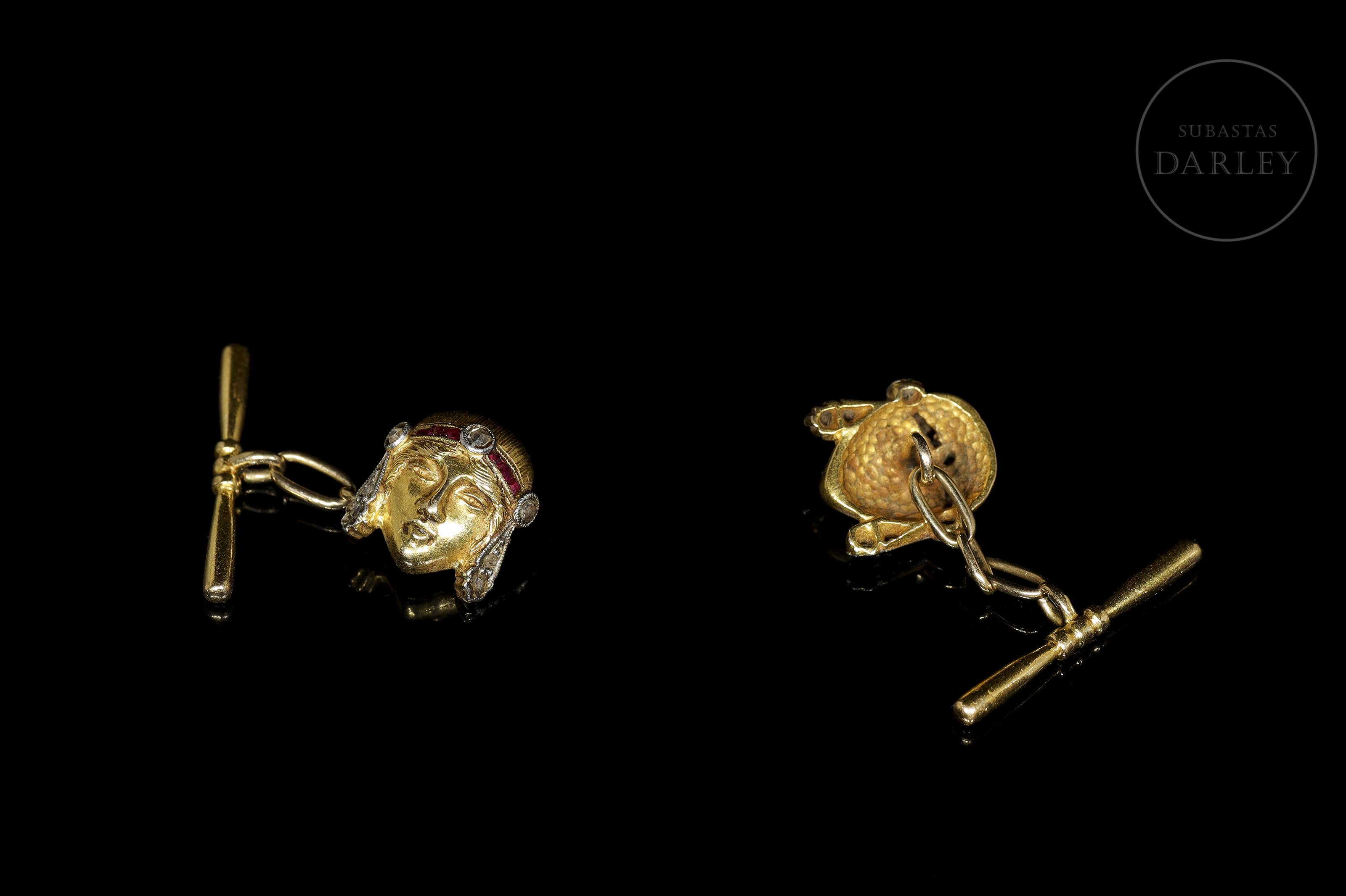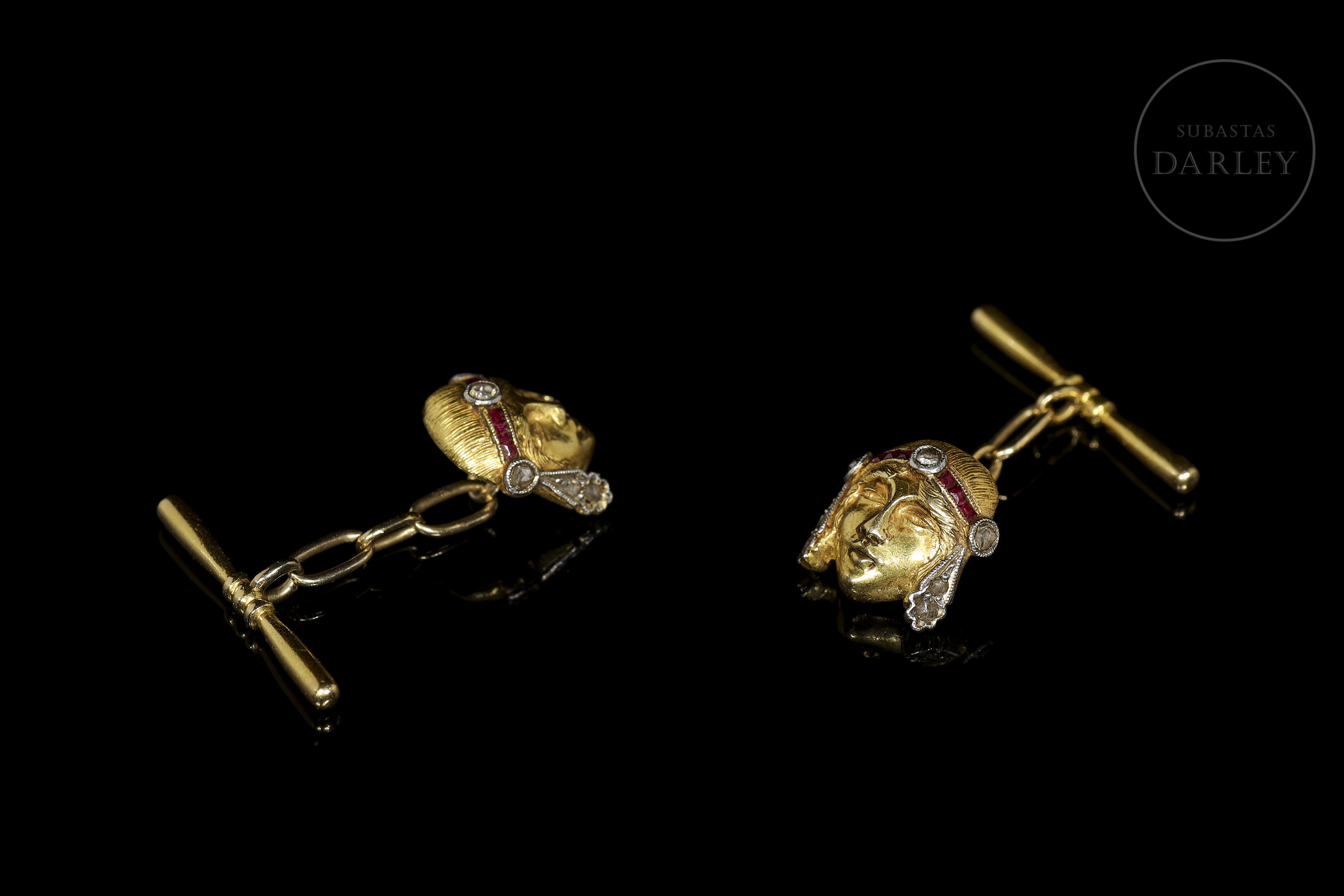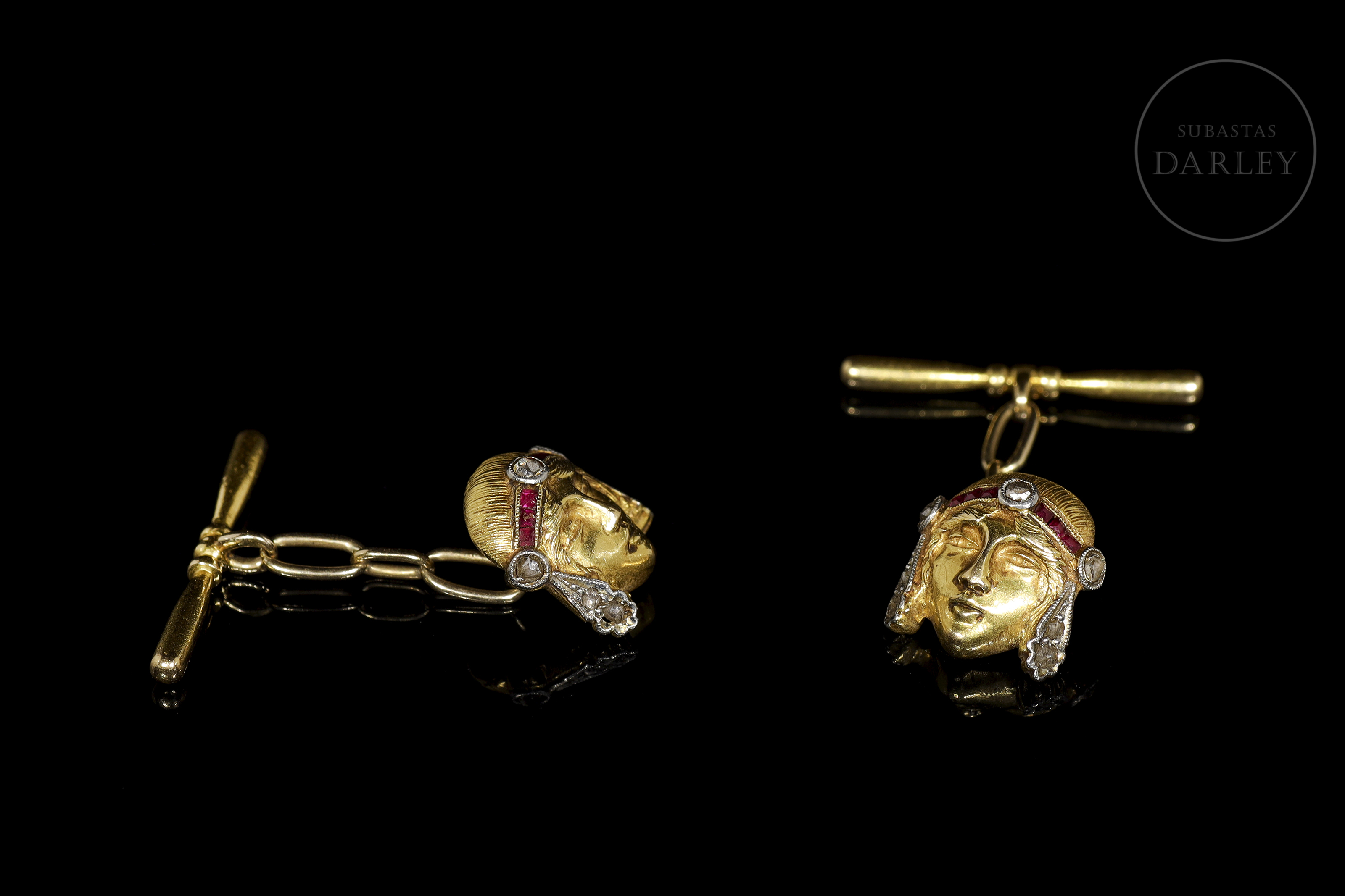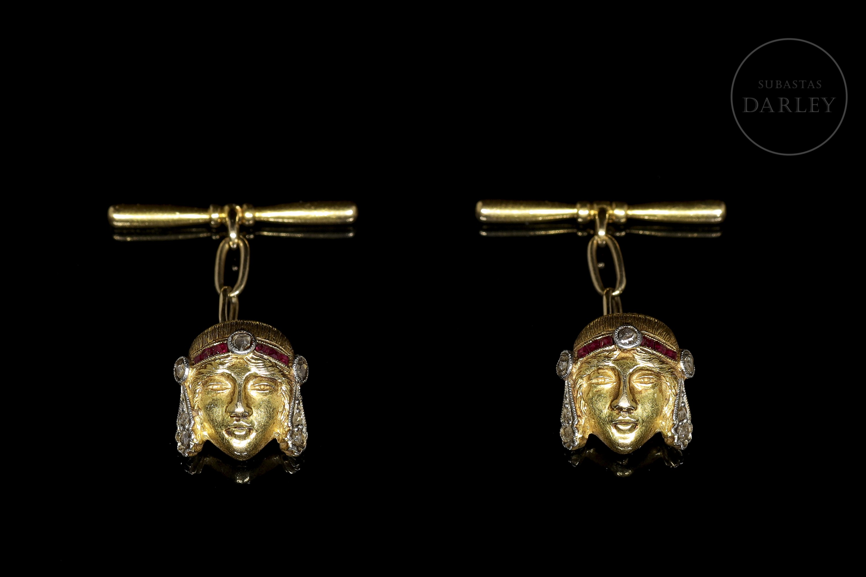 Pareja de gemelos estilo Art Déco realizados en oro amarillo de 18 kt, modelados en forma de rostros femeninos con tocado. Cada pieza presenta una labor de grabado y cincelado, con detalles en esmalte rojo y pequeños diamantes talla rosa dispuestos en la diadema y pendientes. Cierre de barra móvil articulada mediante eslabón doble.