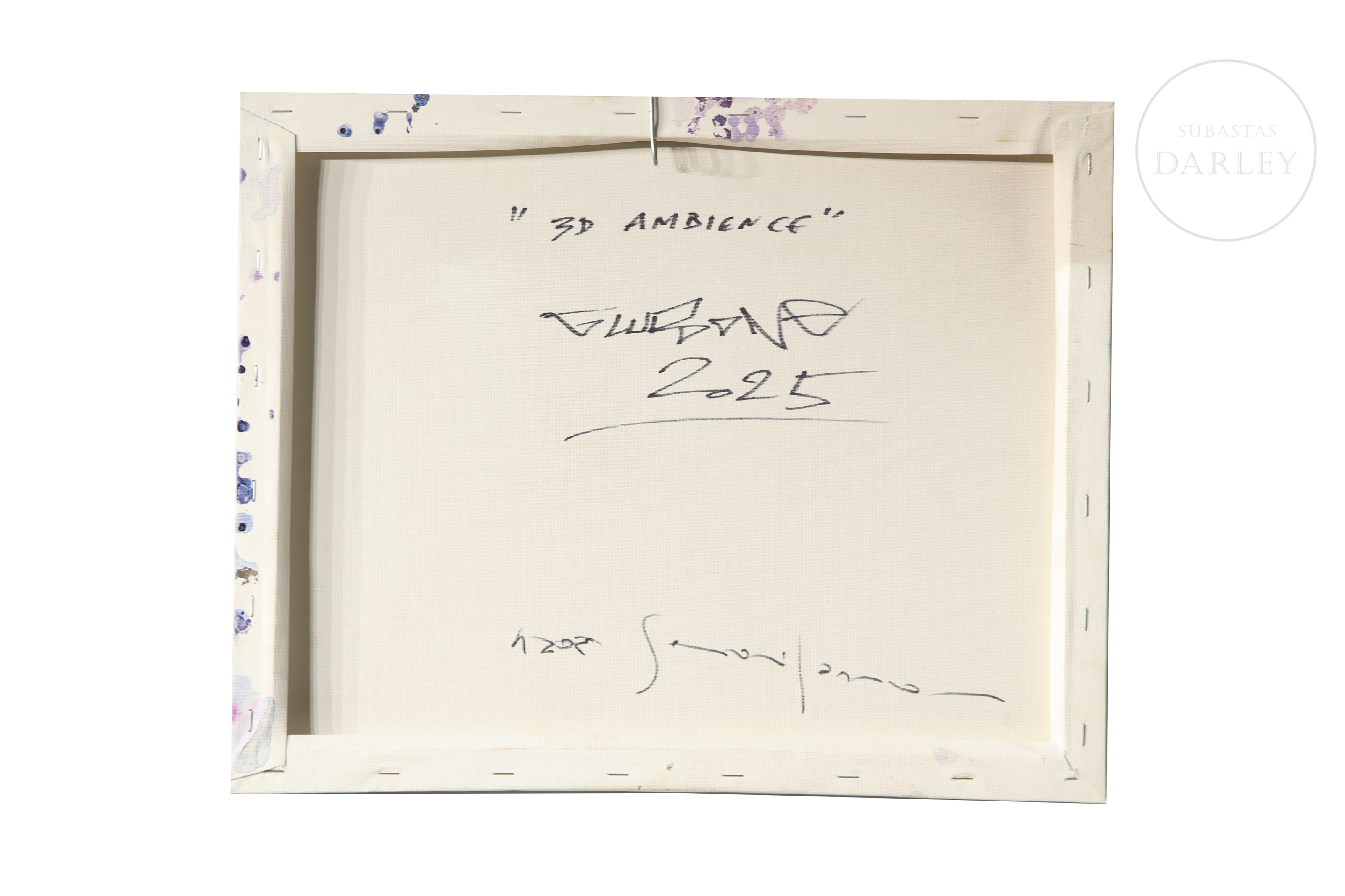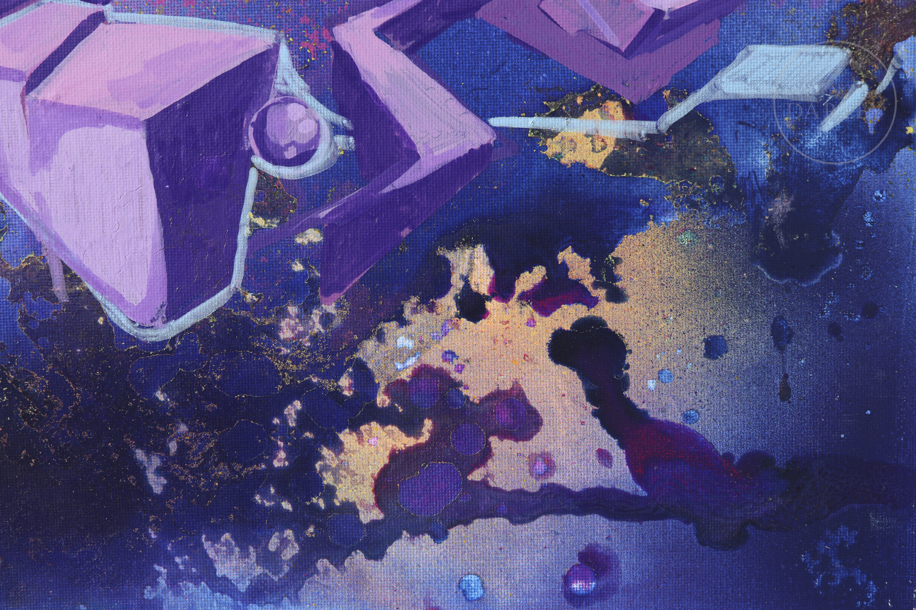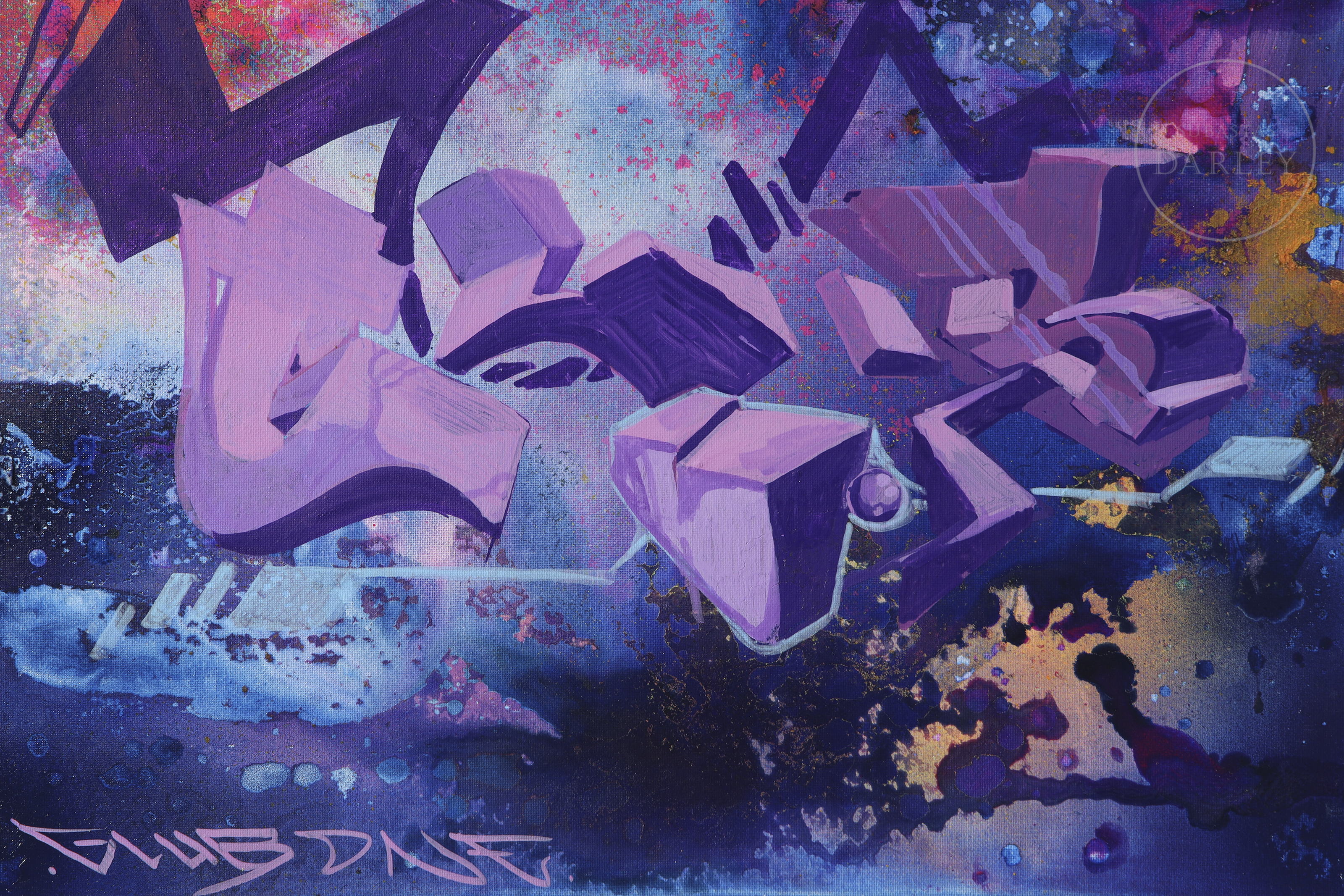 Técnica mixta sobre lienzo. Composición contemporánea de estética graffiti que presenta formas tridimensionales entrelazadas en tonos violeta y lavanda sobre un fondo cósmico. Titulado, firmado y fechado en el reverso.