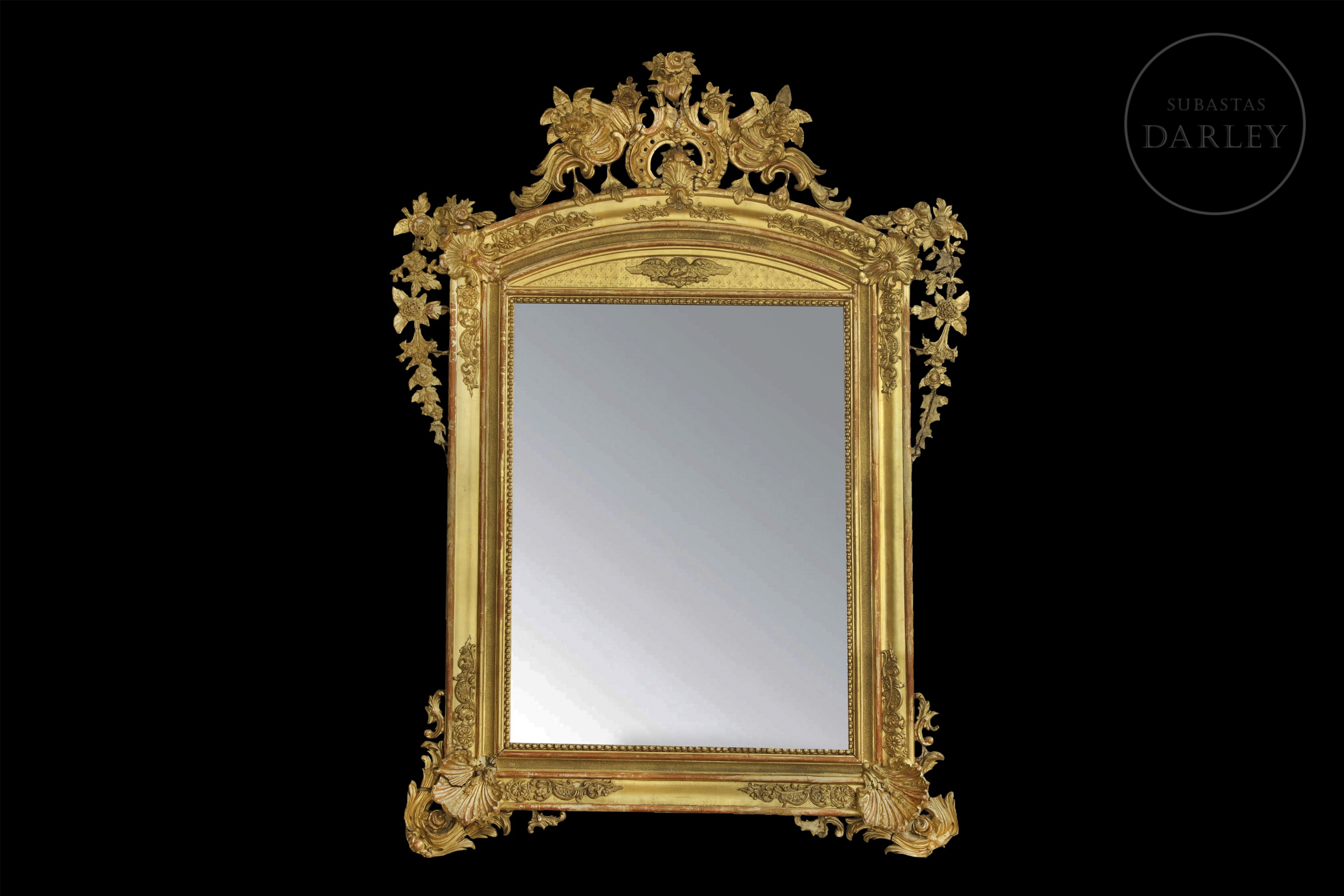 Espejo de madera dorada, estilo Luis XVI adornado por tallas ornamentadas y elementos de diseño neoclásico. Presenta un motivo central superior de urna clásica, flanqueado por follaje ondulado y guirnaldas de flores o de hojas en cascada, con terminaciones en forma de concha y un águila en el centro de la parte superior.