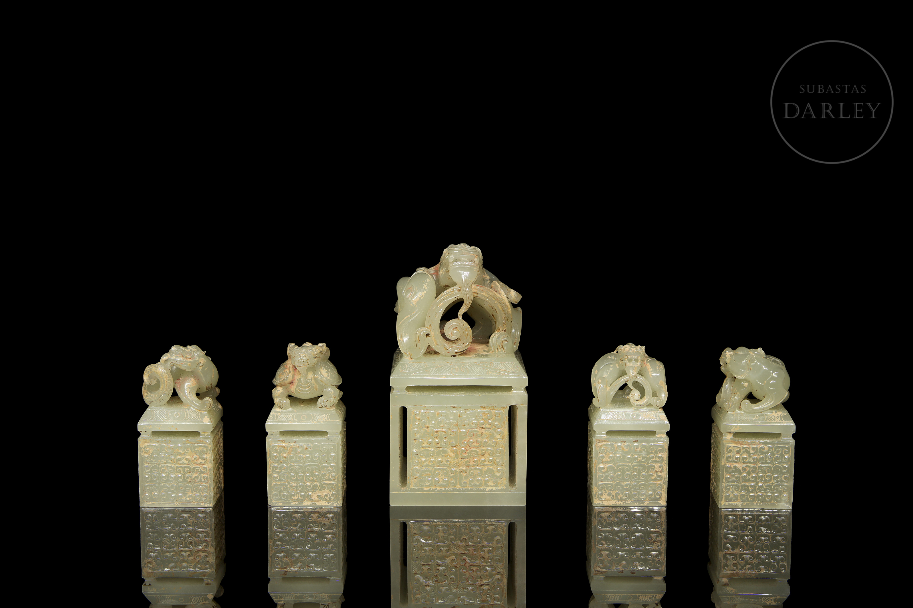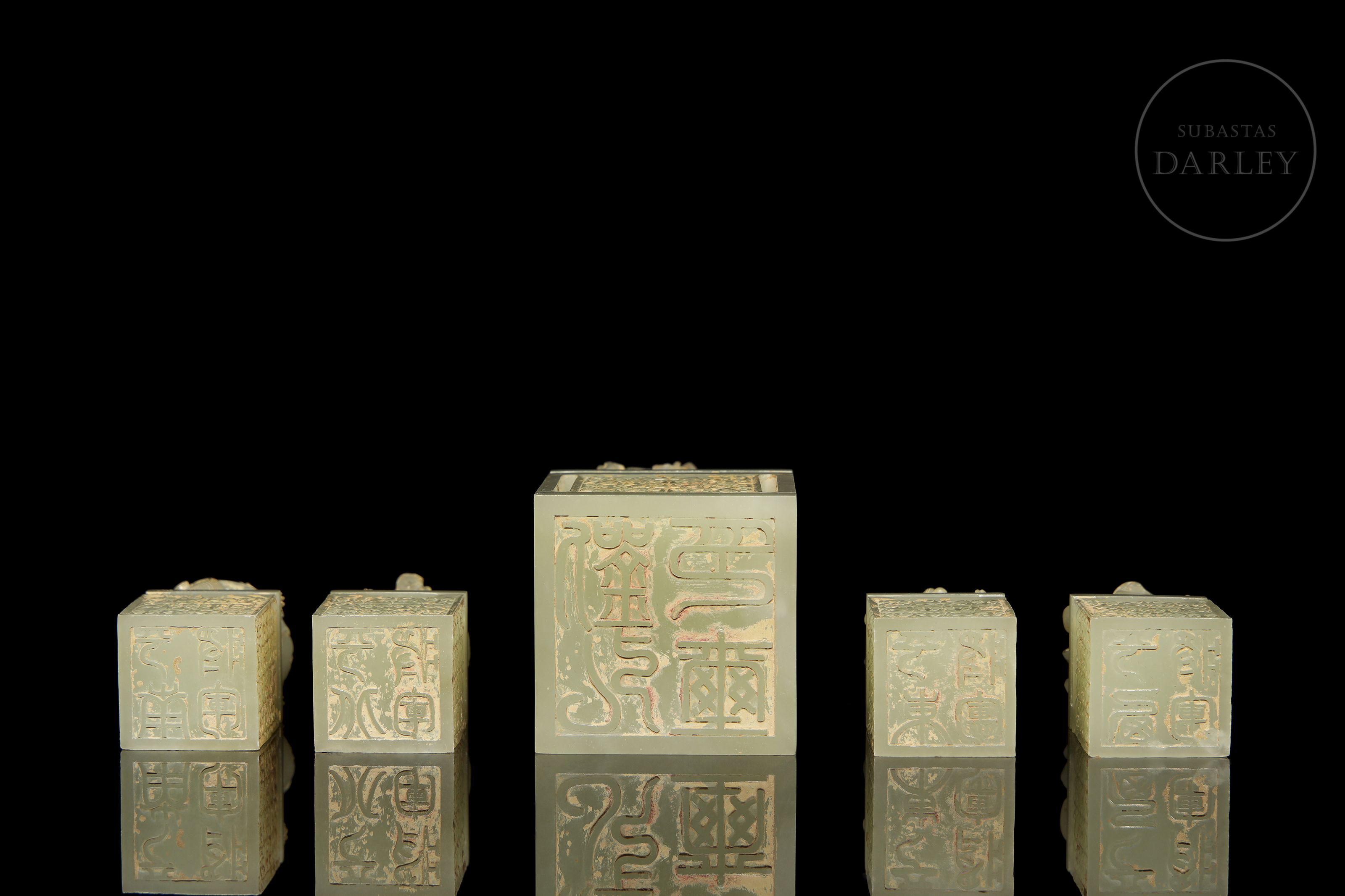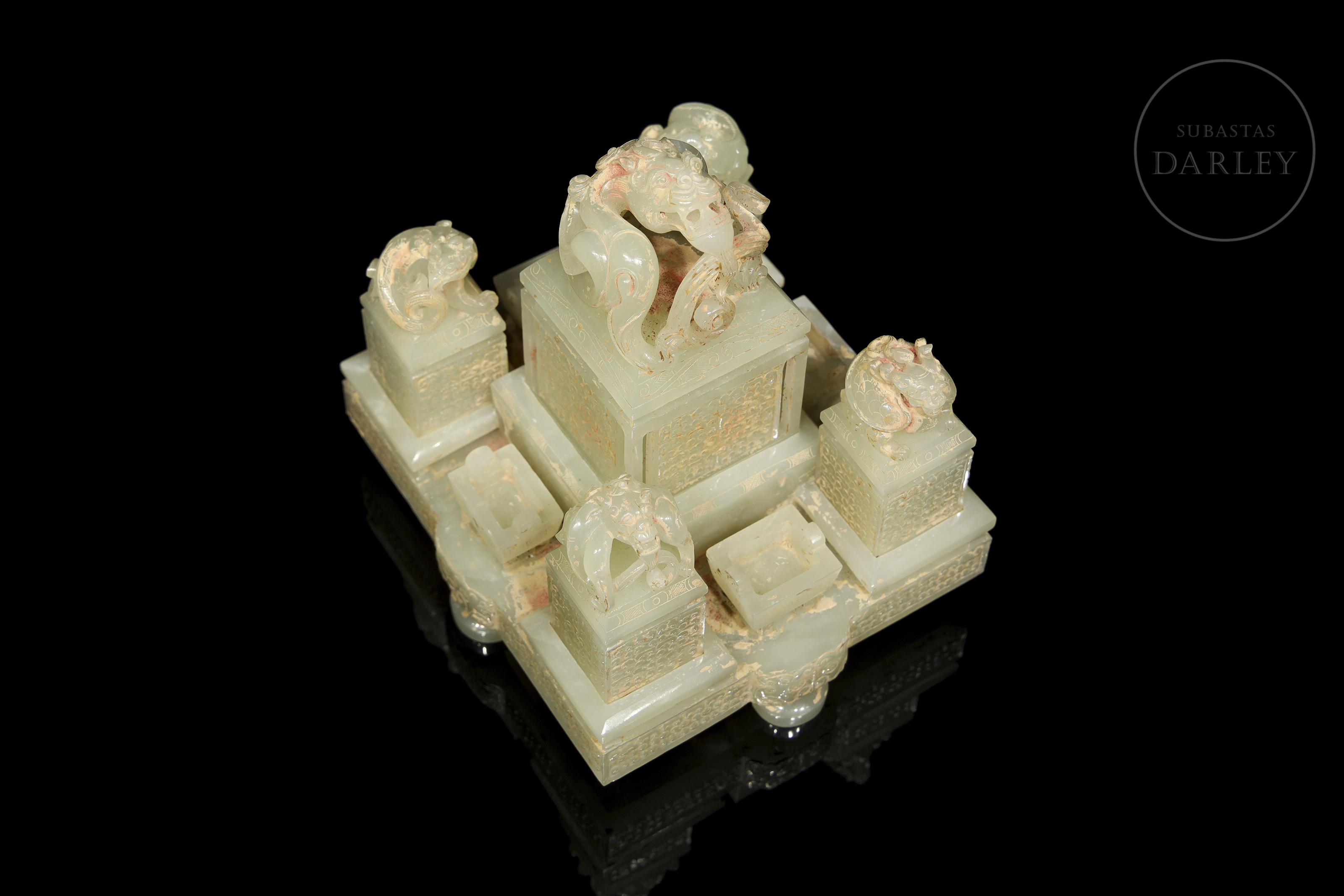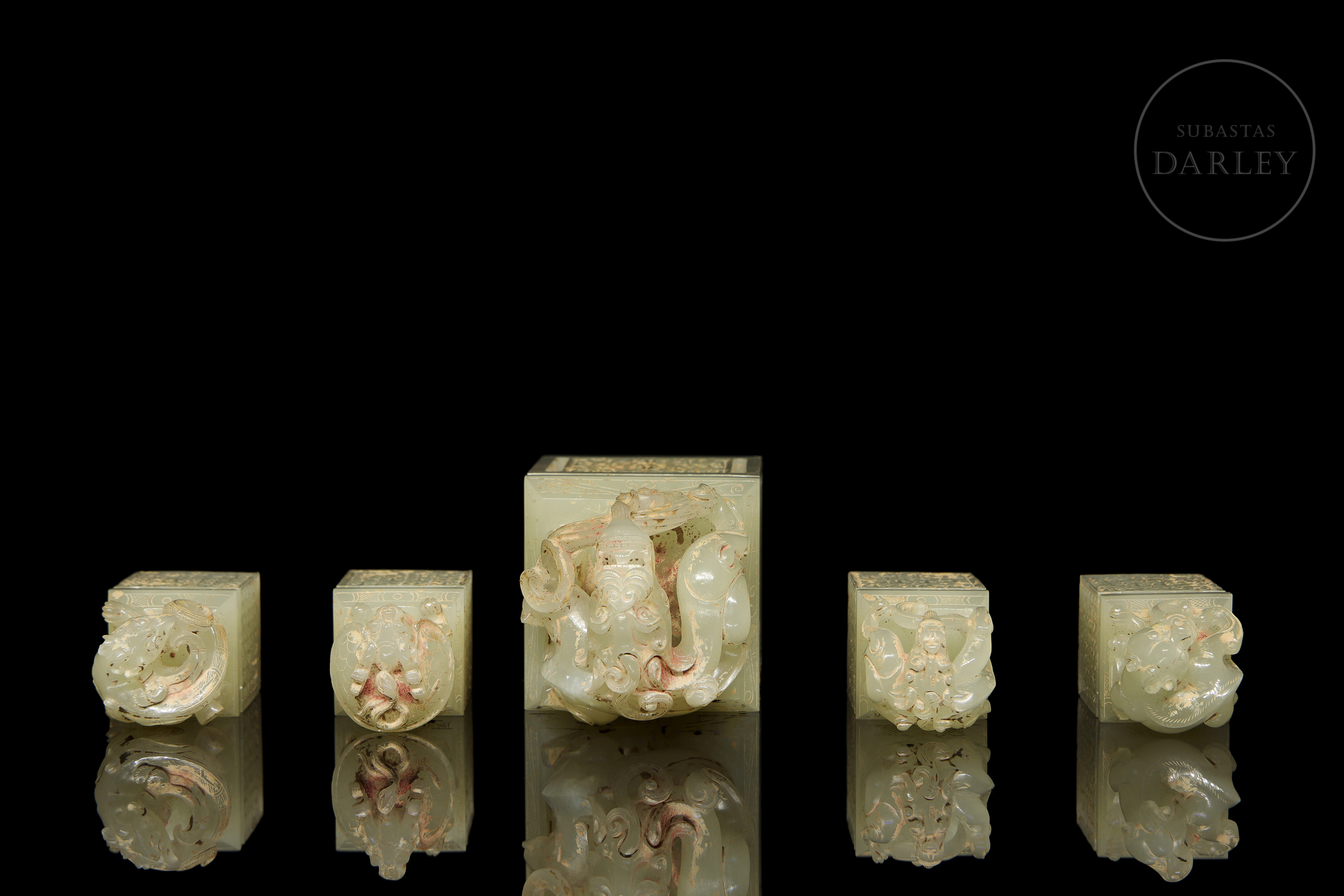 Excepcional conjunto de cinco sellos con base, tallado en jade amarillo de tono verde-amarillento pálido. La pieza es una soberbia representación del orden cosmológico imperial, con el poder central (el Emperador) flanqueado por los cuatro guardianes direccionales.