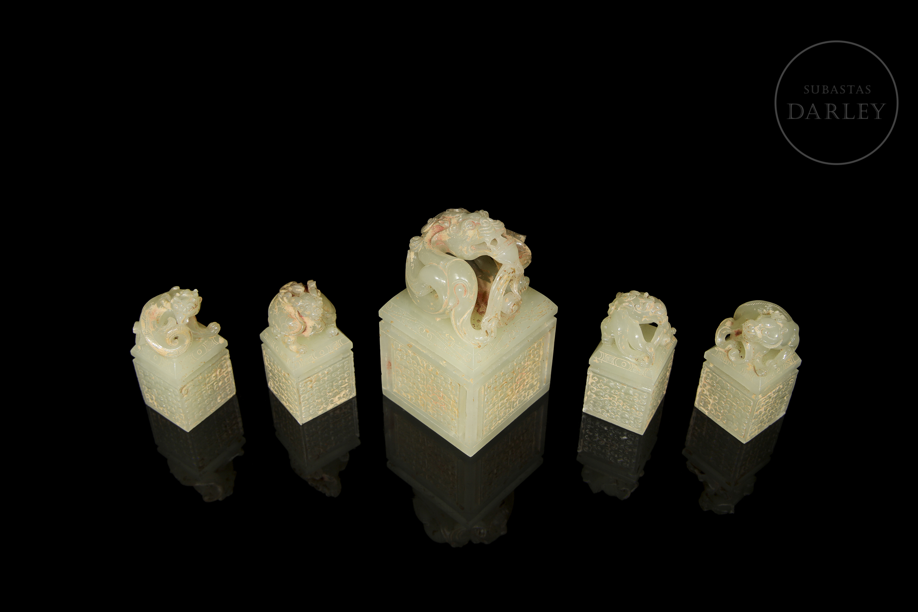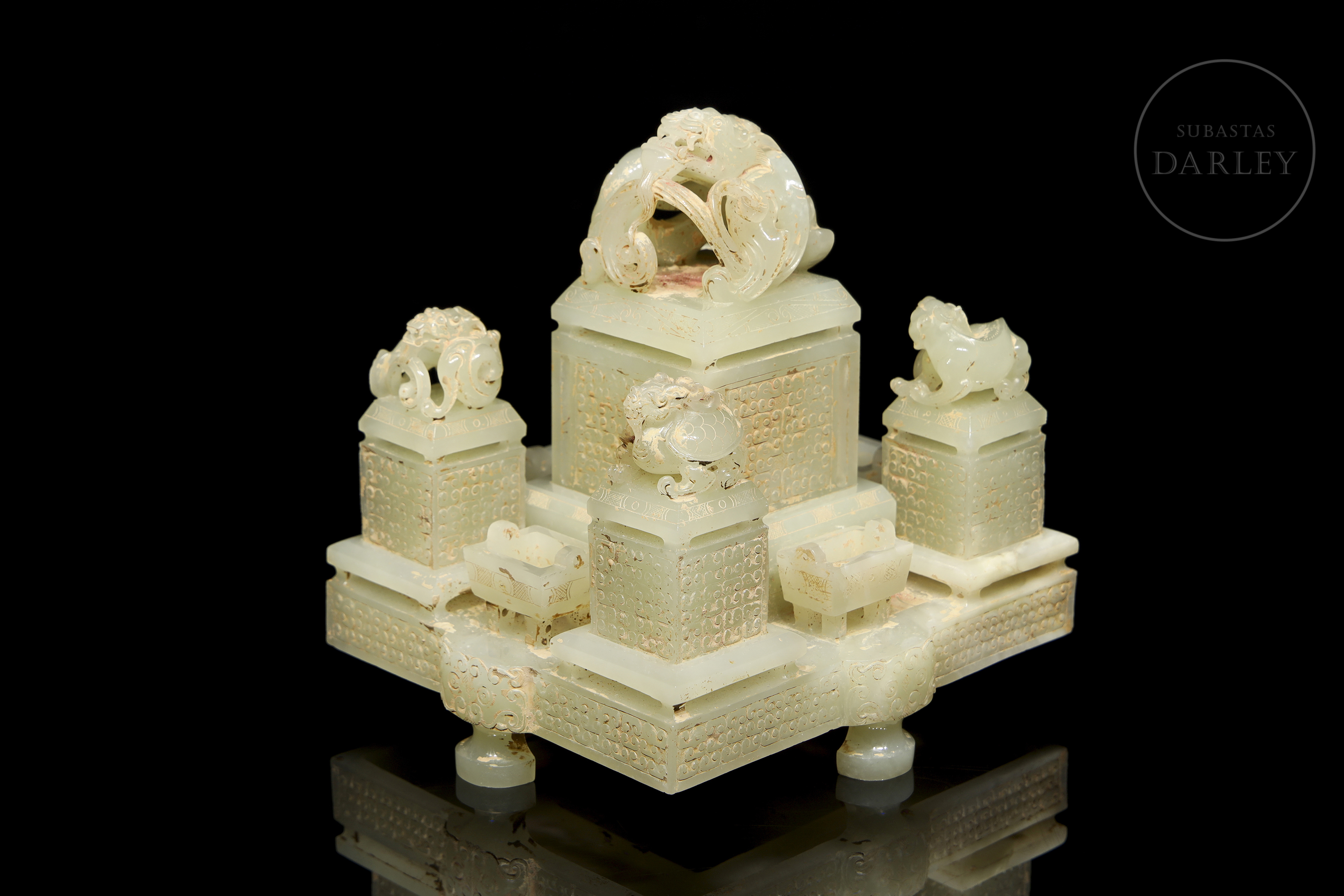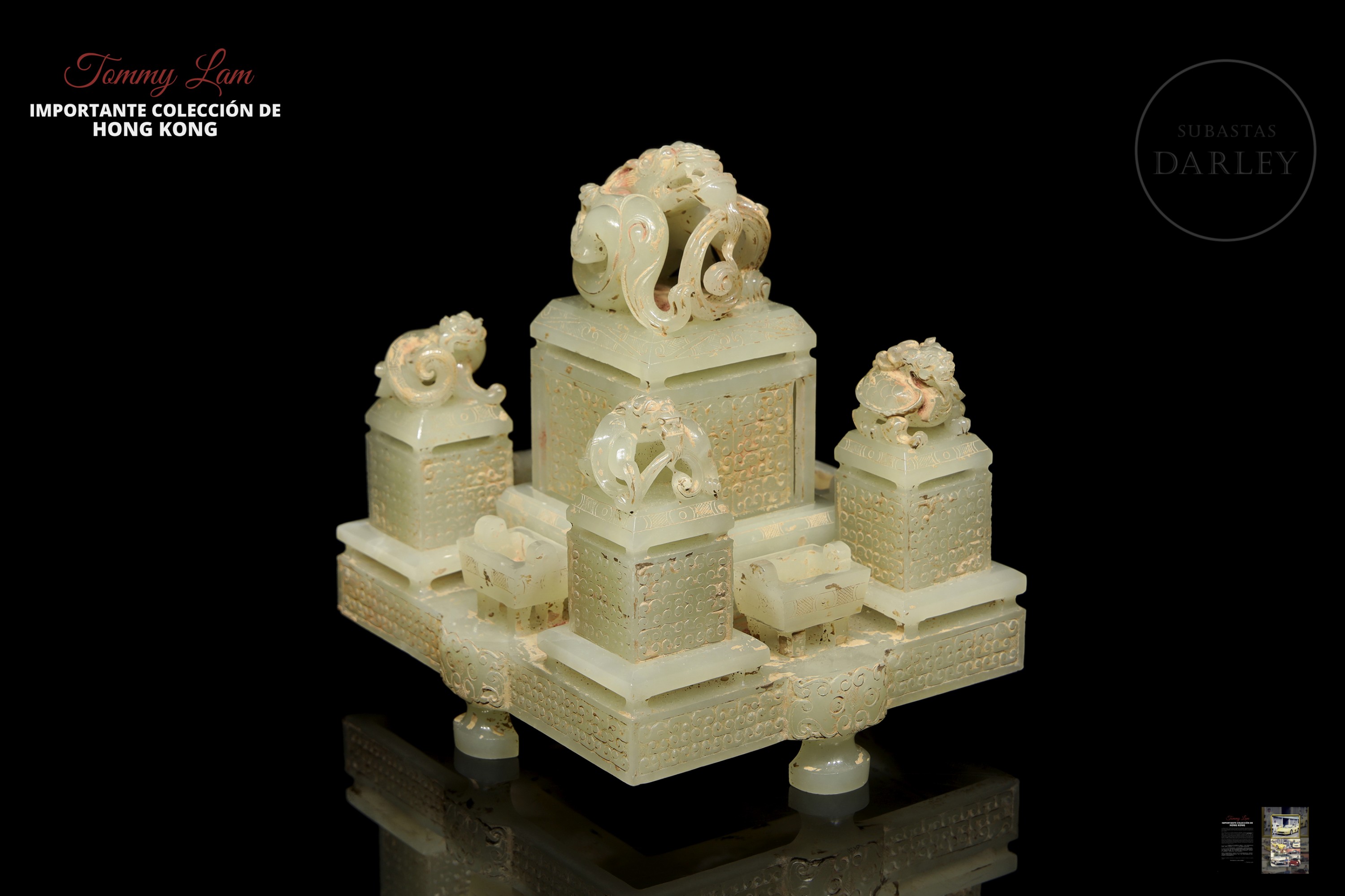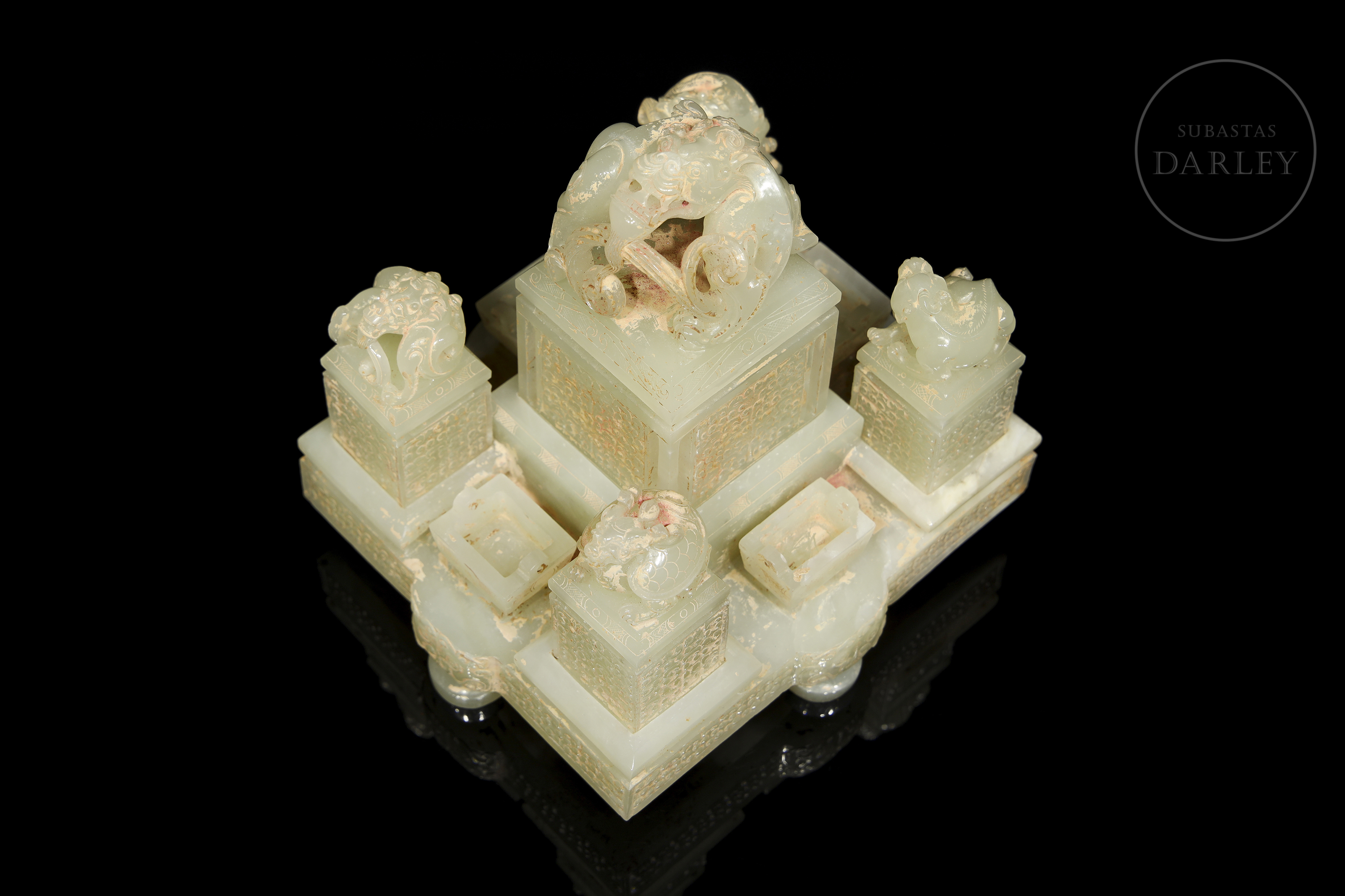 Excepcional conjunto de cinco sellos con base, tallado en jade amarillo de tono verde-amarillento pálido. La pieza es una soberbia representación del orden cosmológico imperial, con el poder central (el Emperador) flanqueado por los cuatro guardianes direccionales.