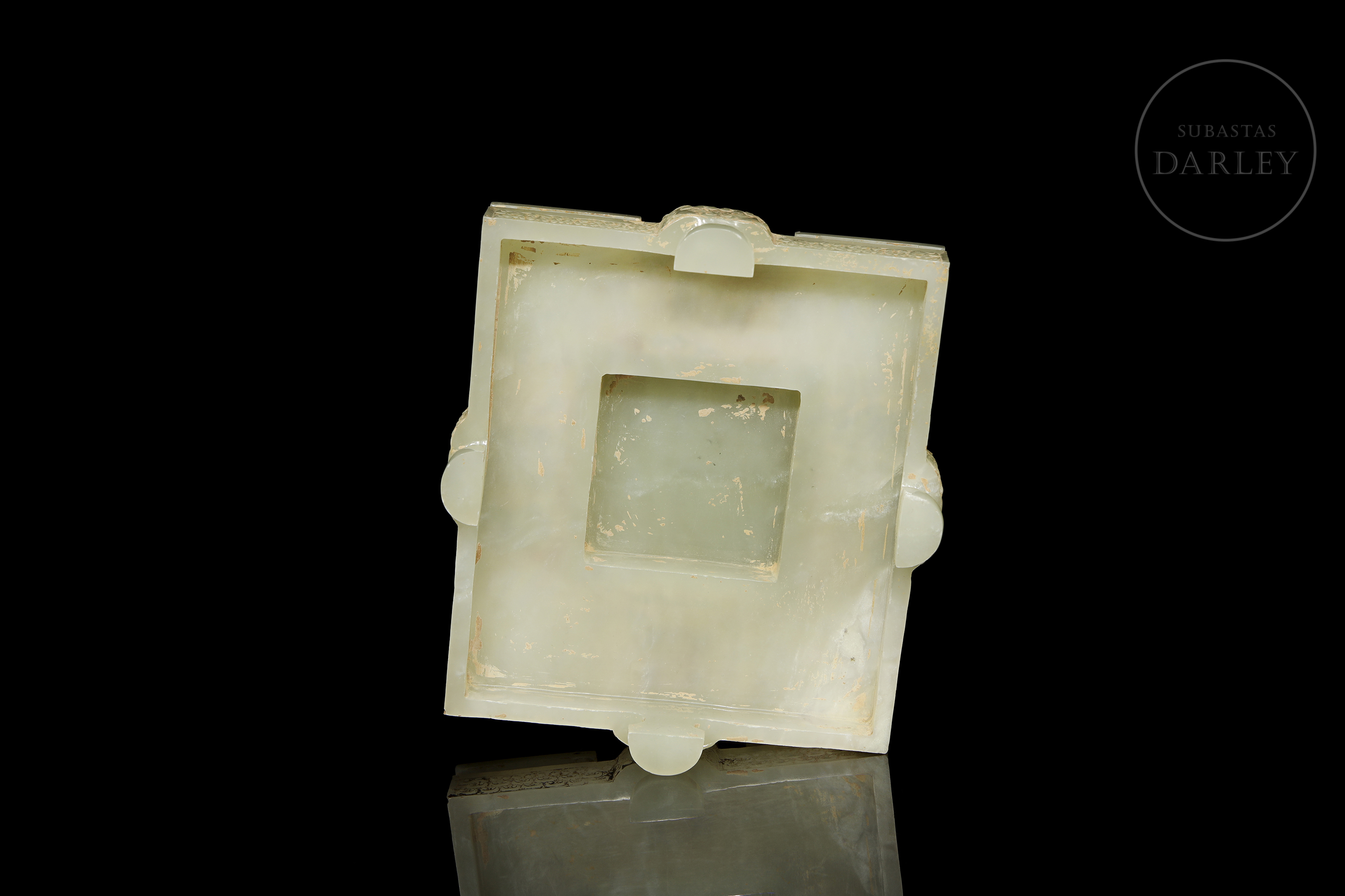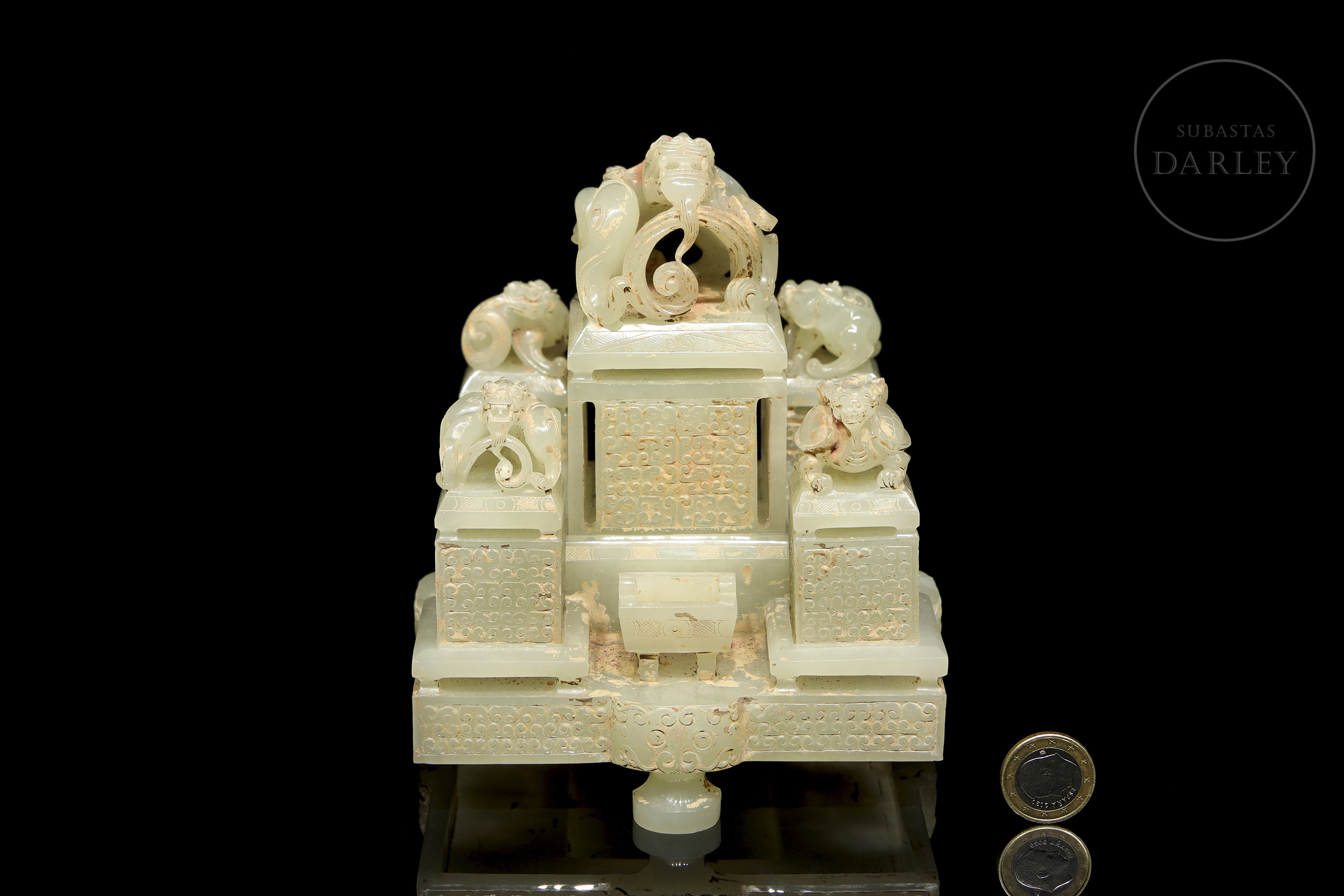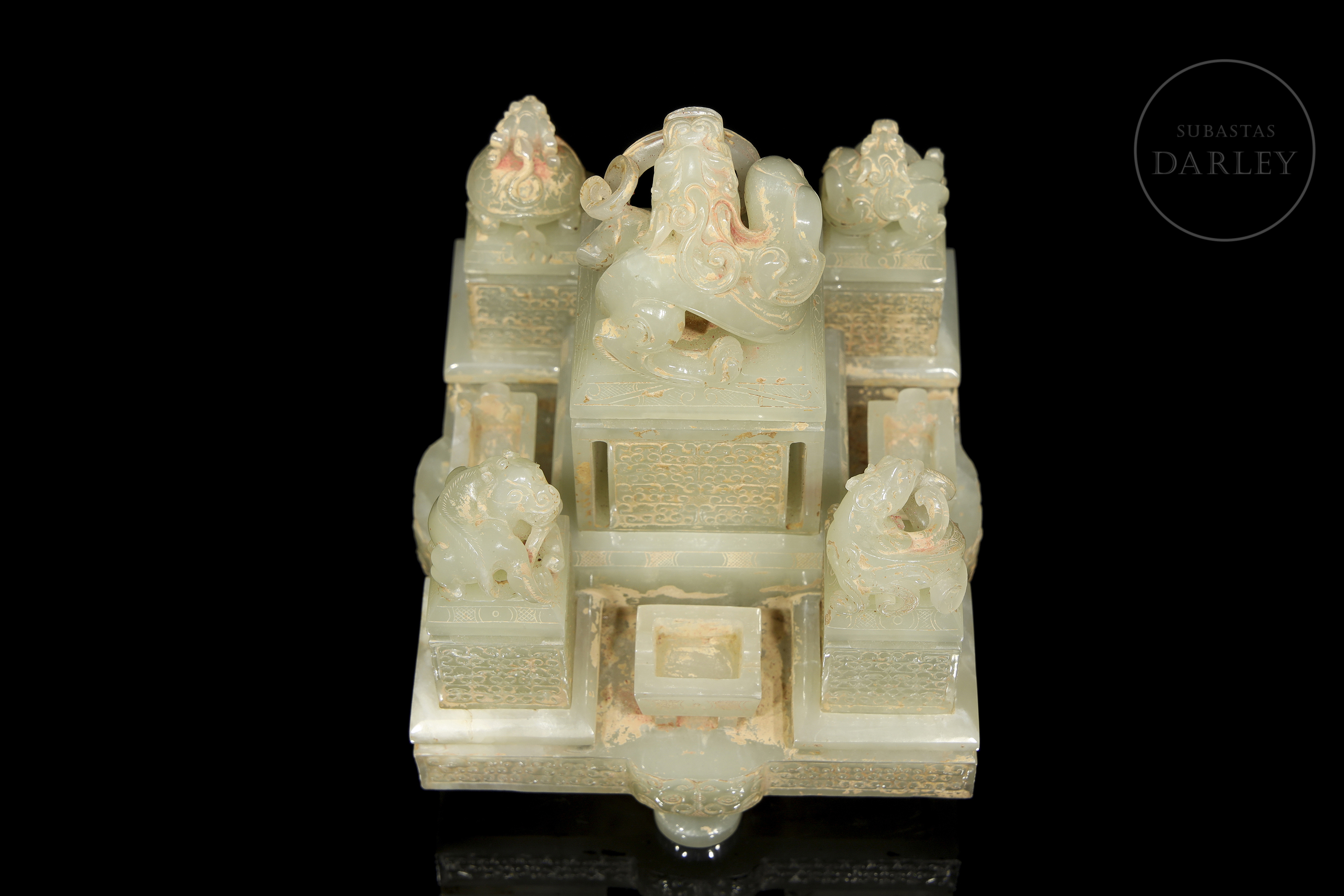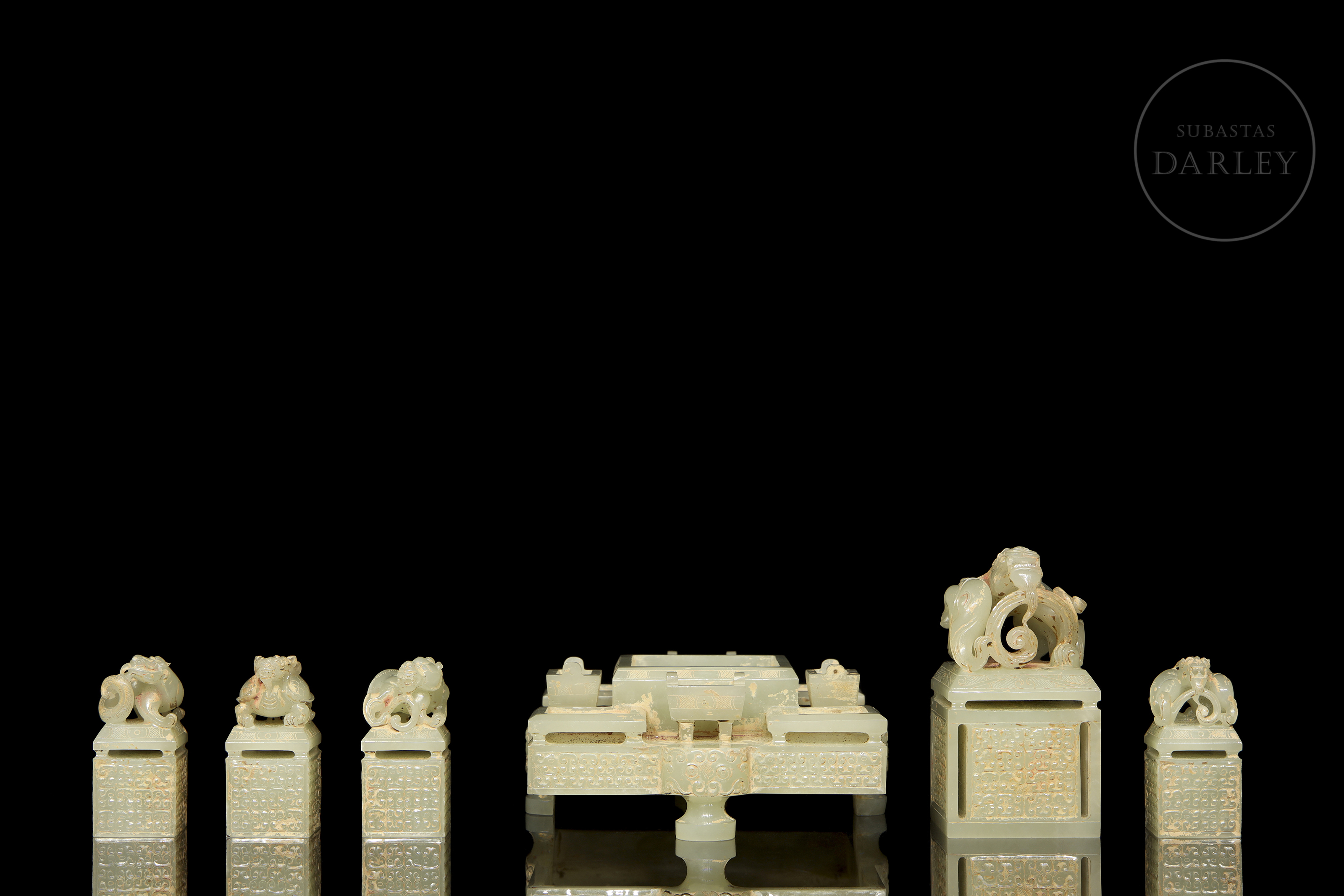 Excepcional conjunto de cinco sellos con base, tallado en jade amarillo de tono verde-amarillento pálido. La pieza es una soberbia representación del orden cosmológico imperial, con el poder central (el Emperador) flanqueado por los cuatro guardianes direccionales.