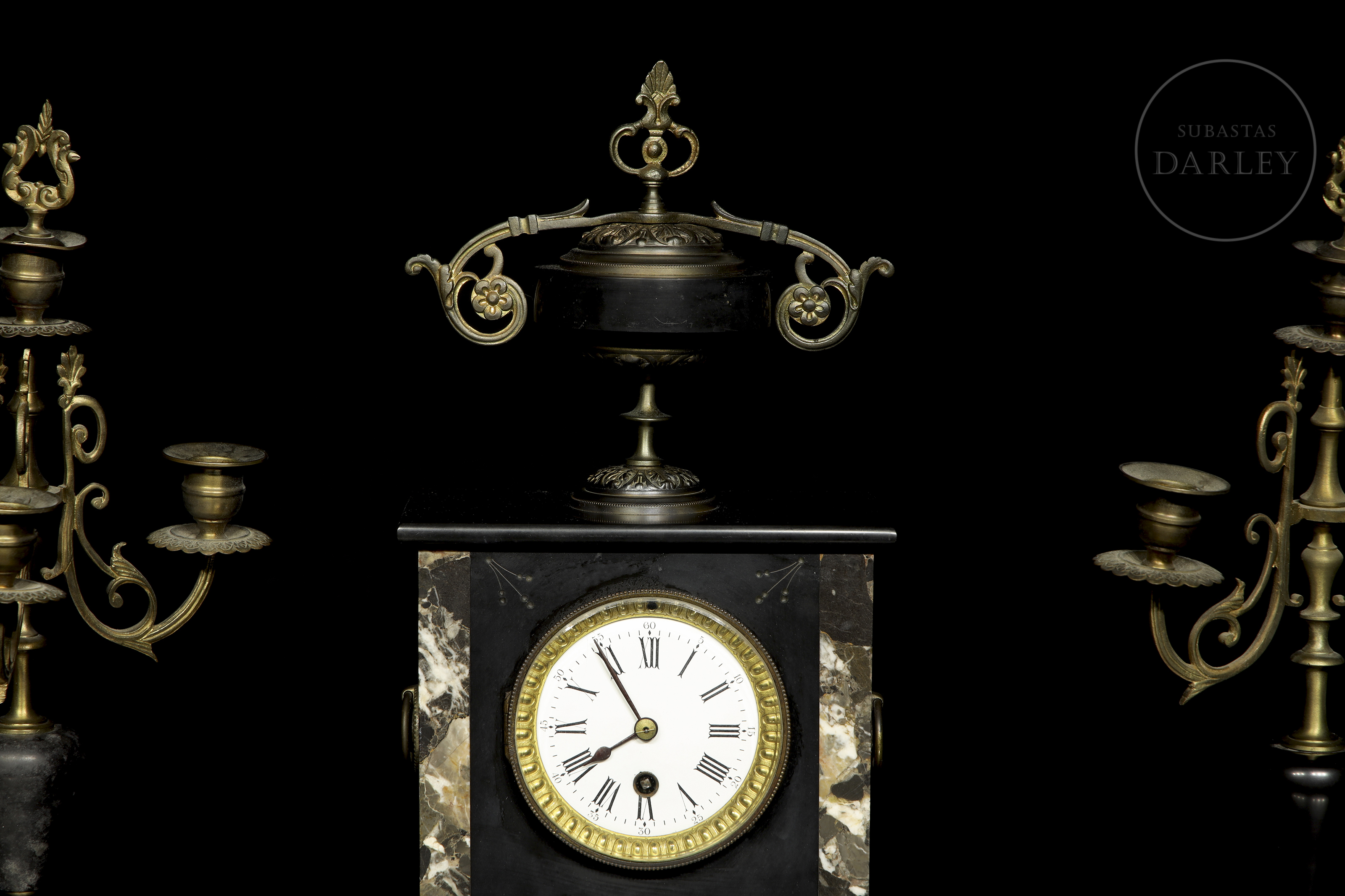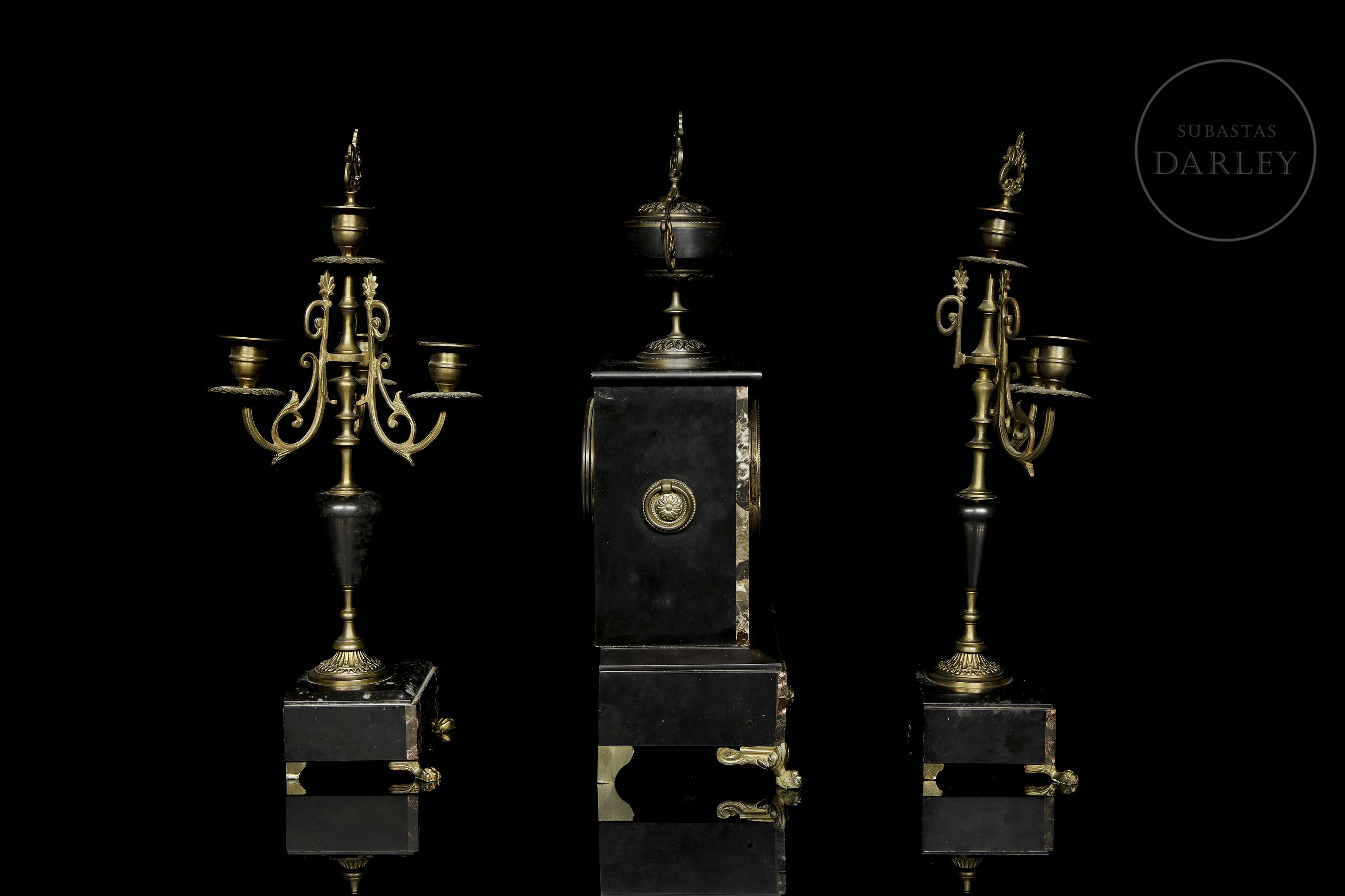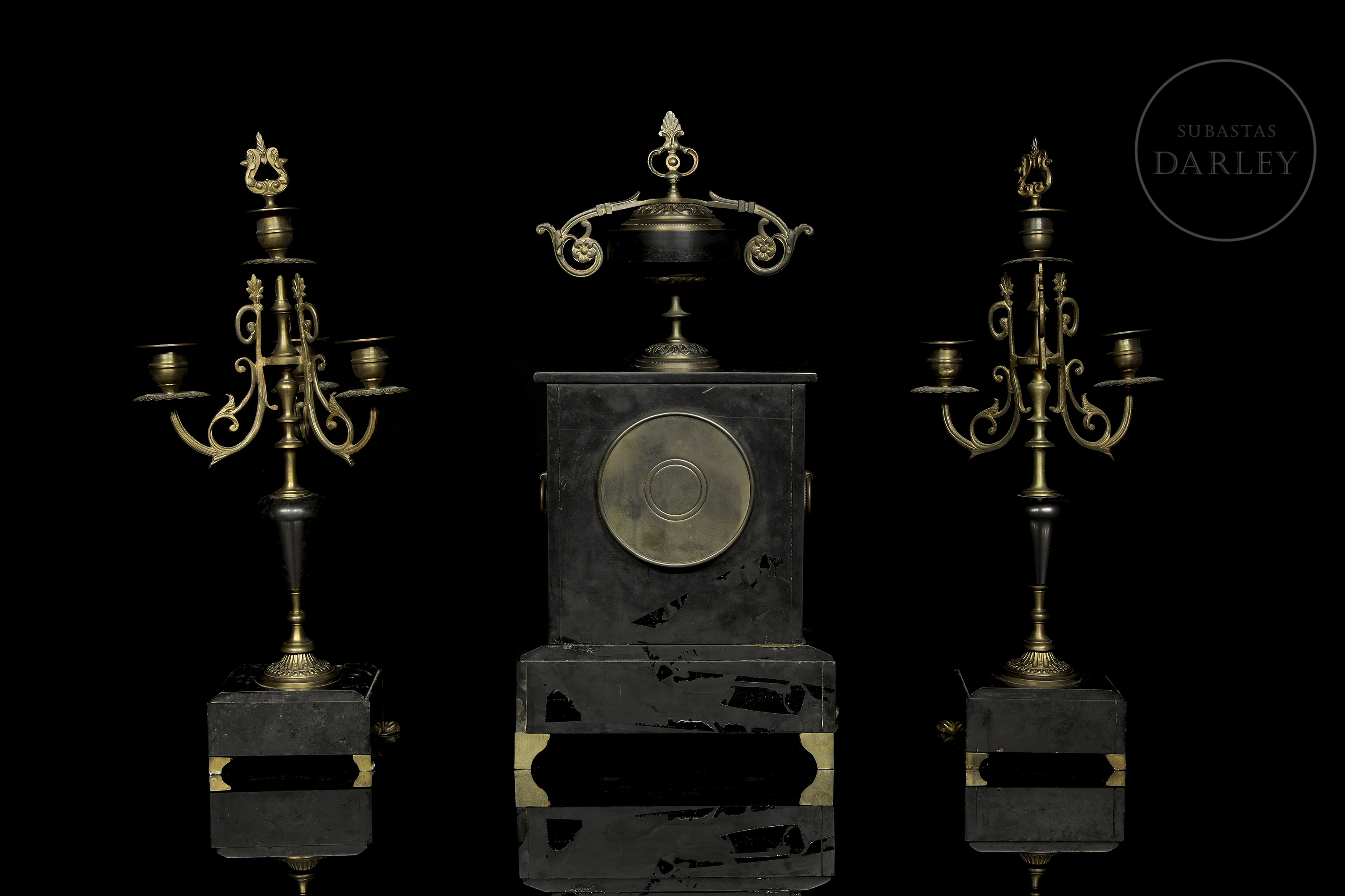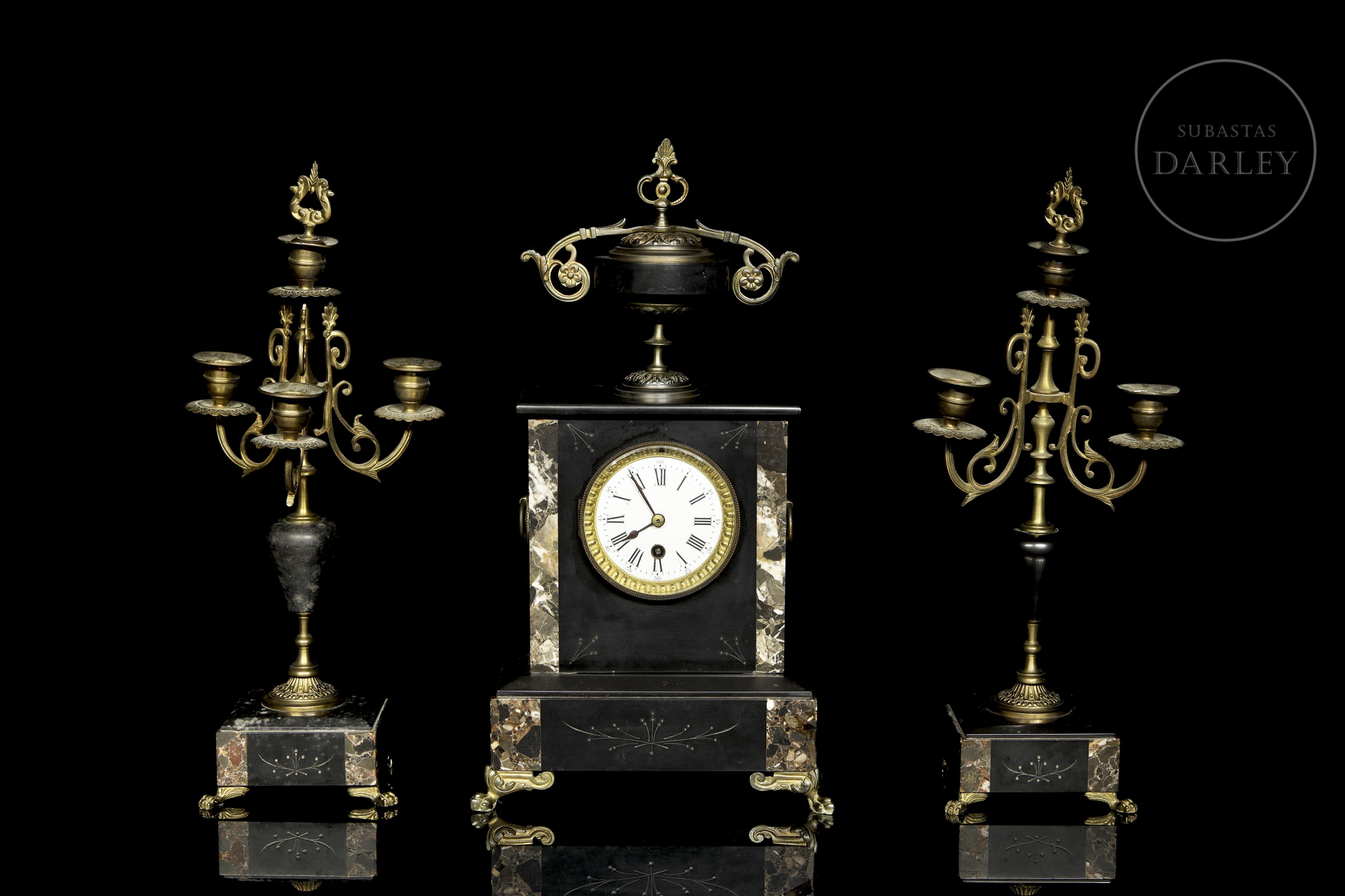 Guarnición de chimenea francesa, reloj y pareja de candelabros