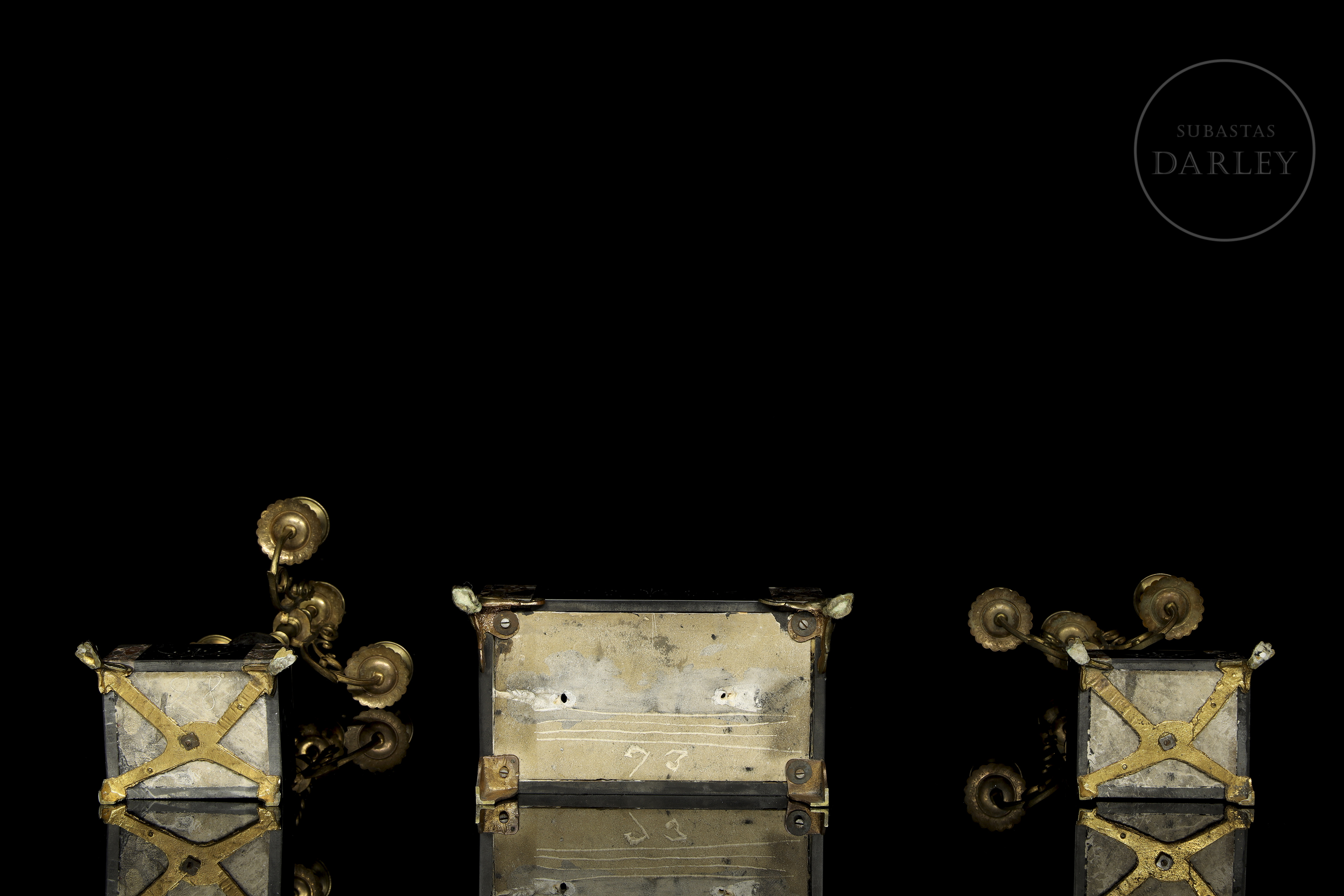 Medidas reloj: 47 x 14,4 x 25 cm; Medidas candelabros: 45 x 11 x 13,5 cm (x2).