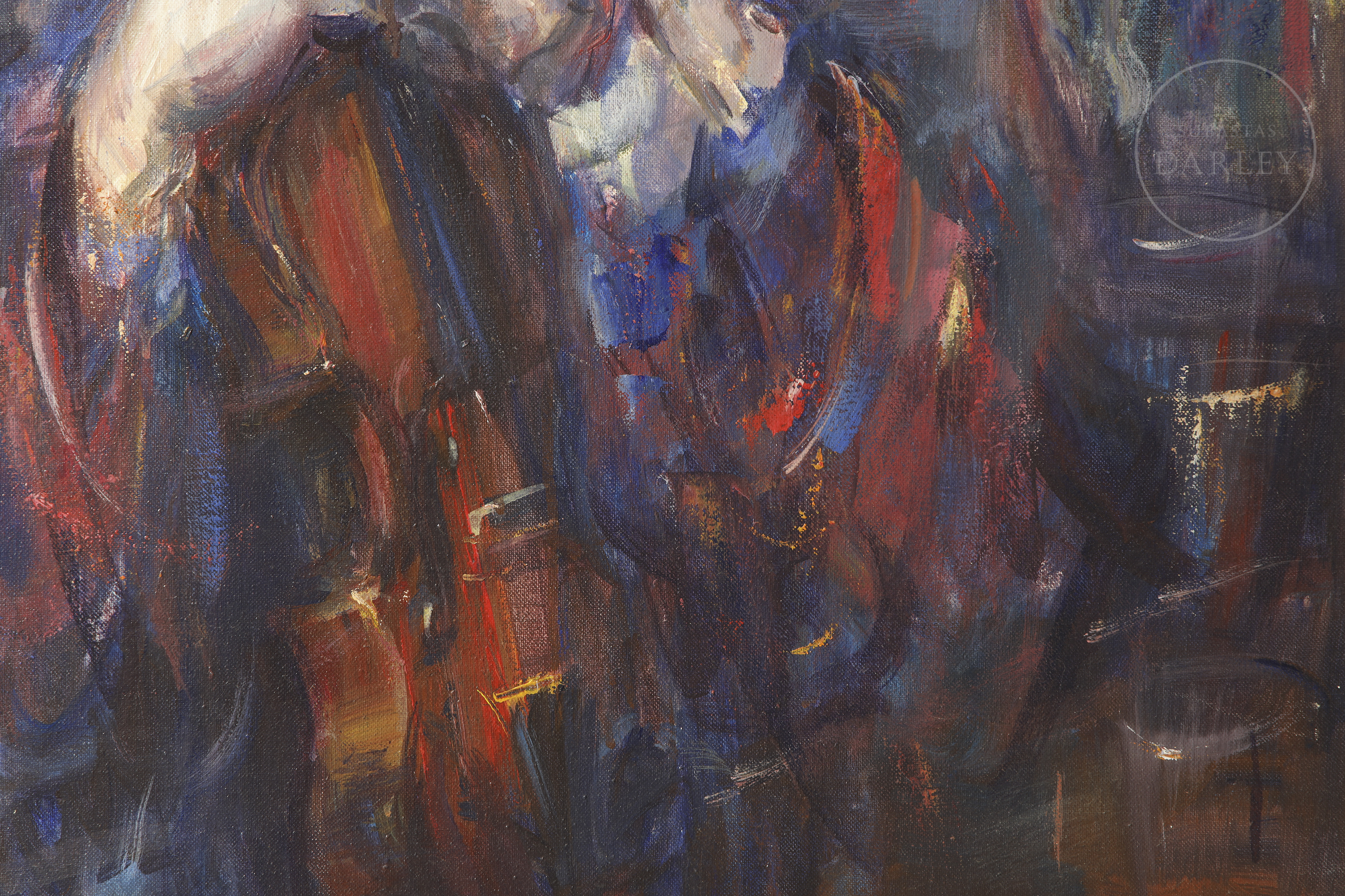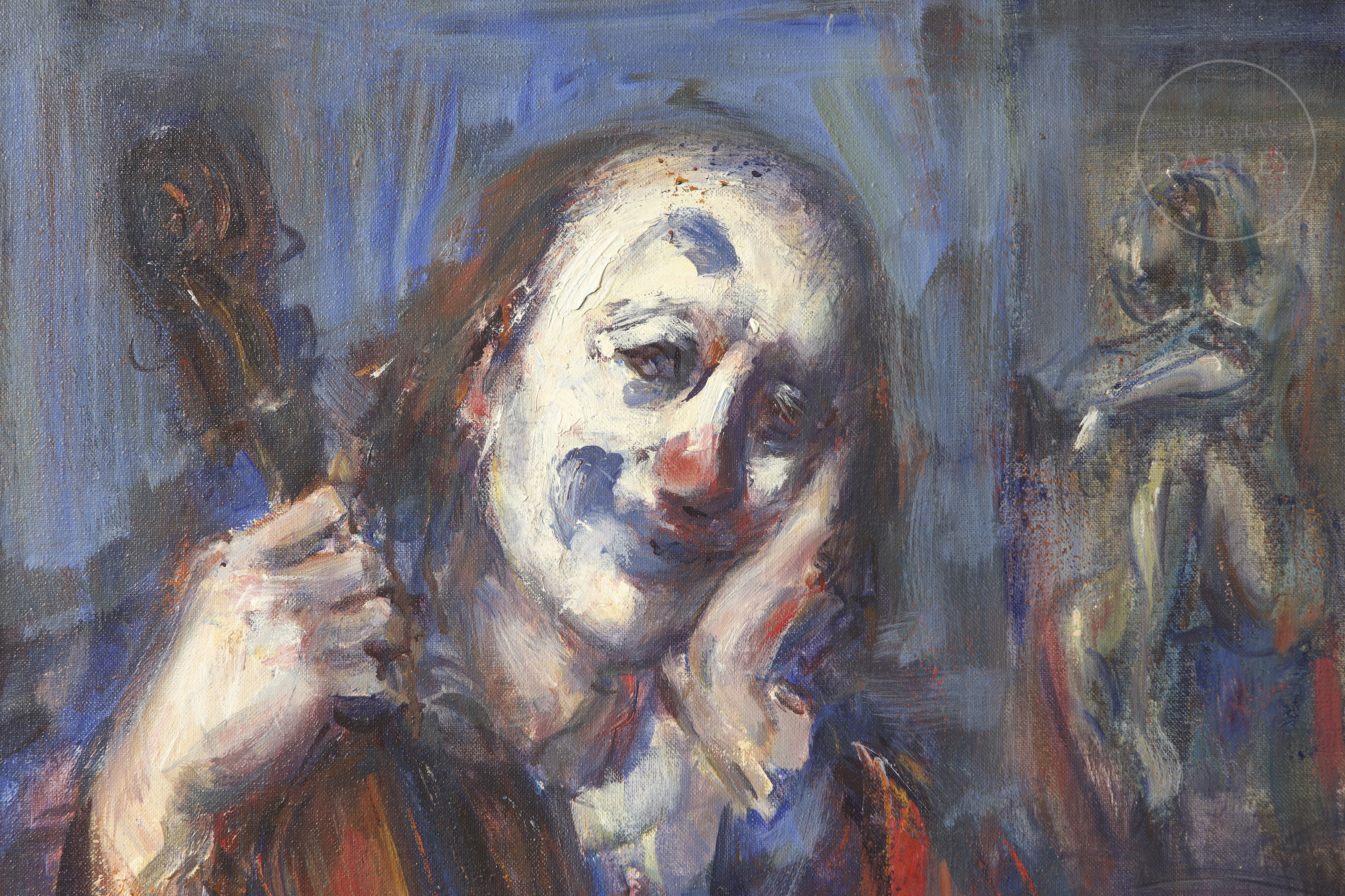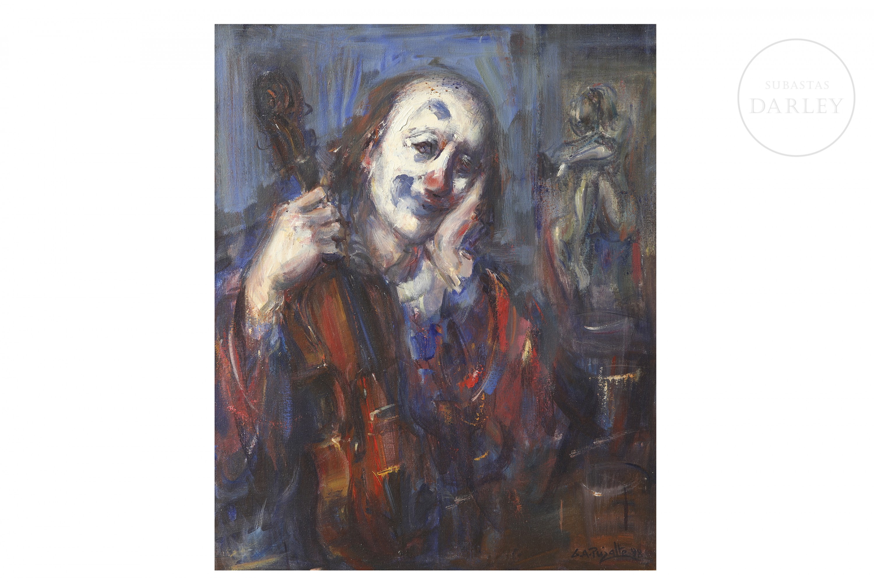 Retrato de un payaso de carácter melancólico sosteniendo un instrumento de cuerda. Destaca por una factura suelta y expresionista. Firmado y fechado "G.A. Pujalte 98" en la esquina inferior derecha.