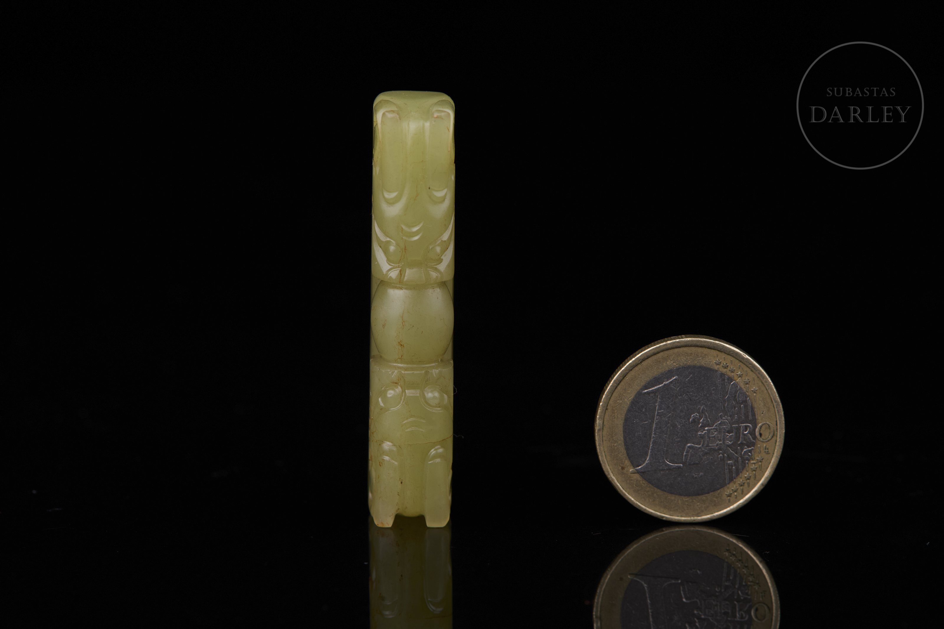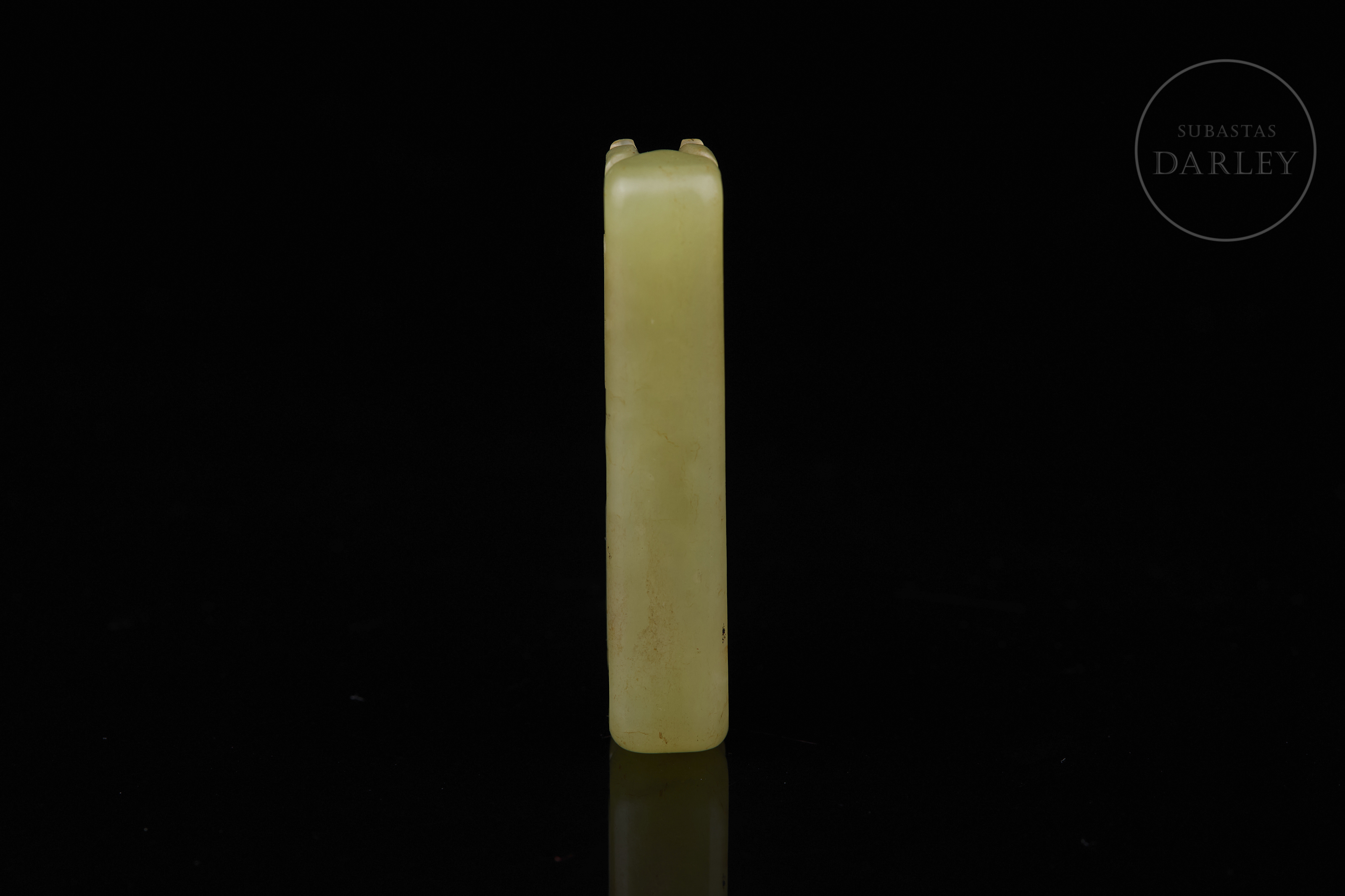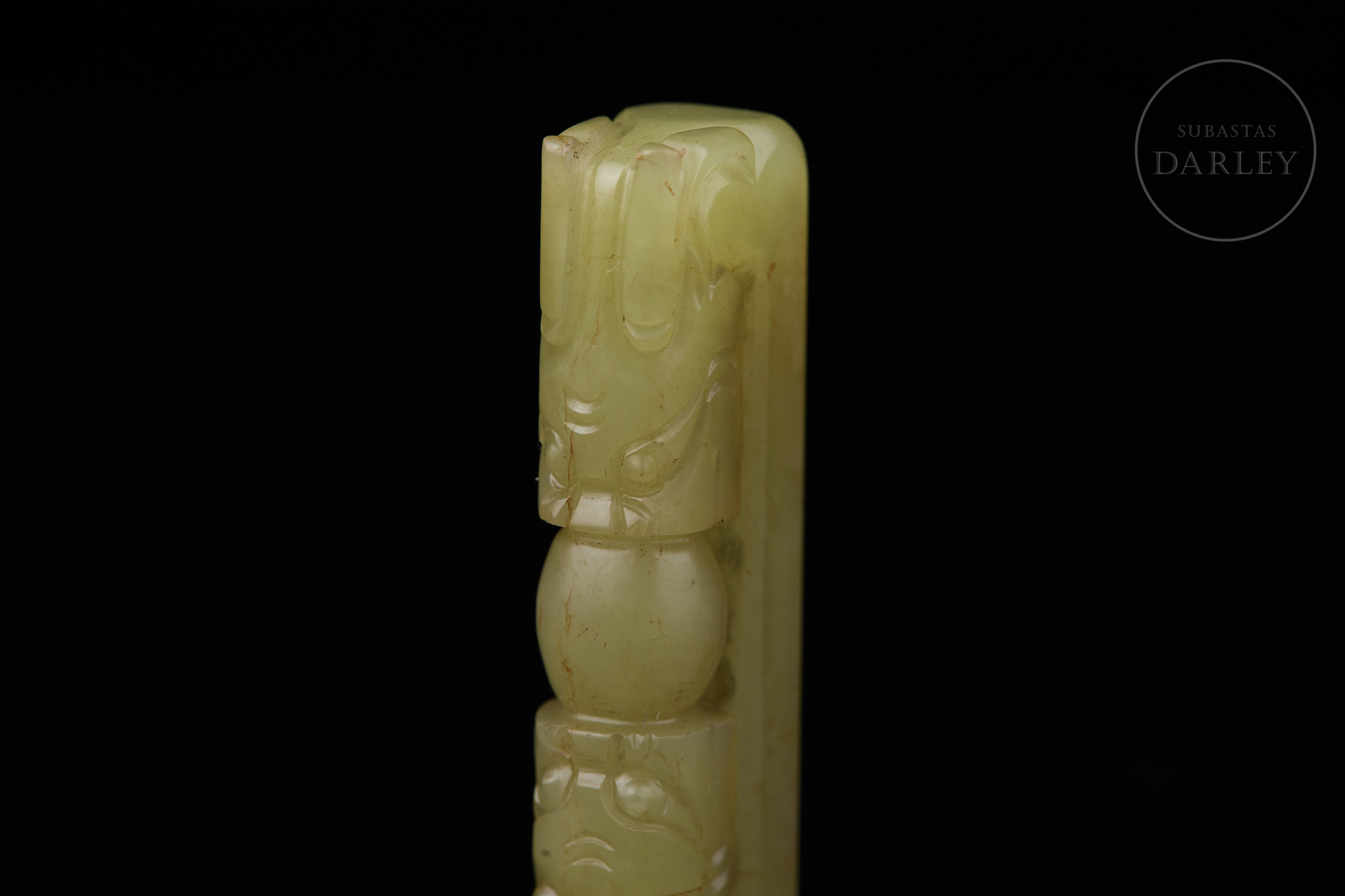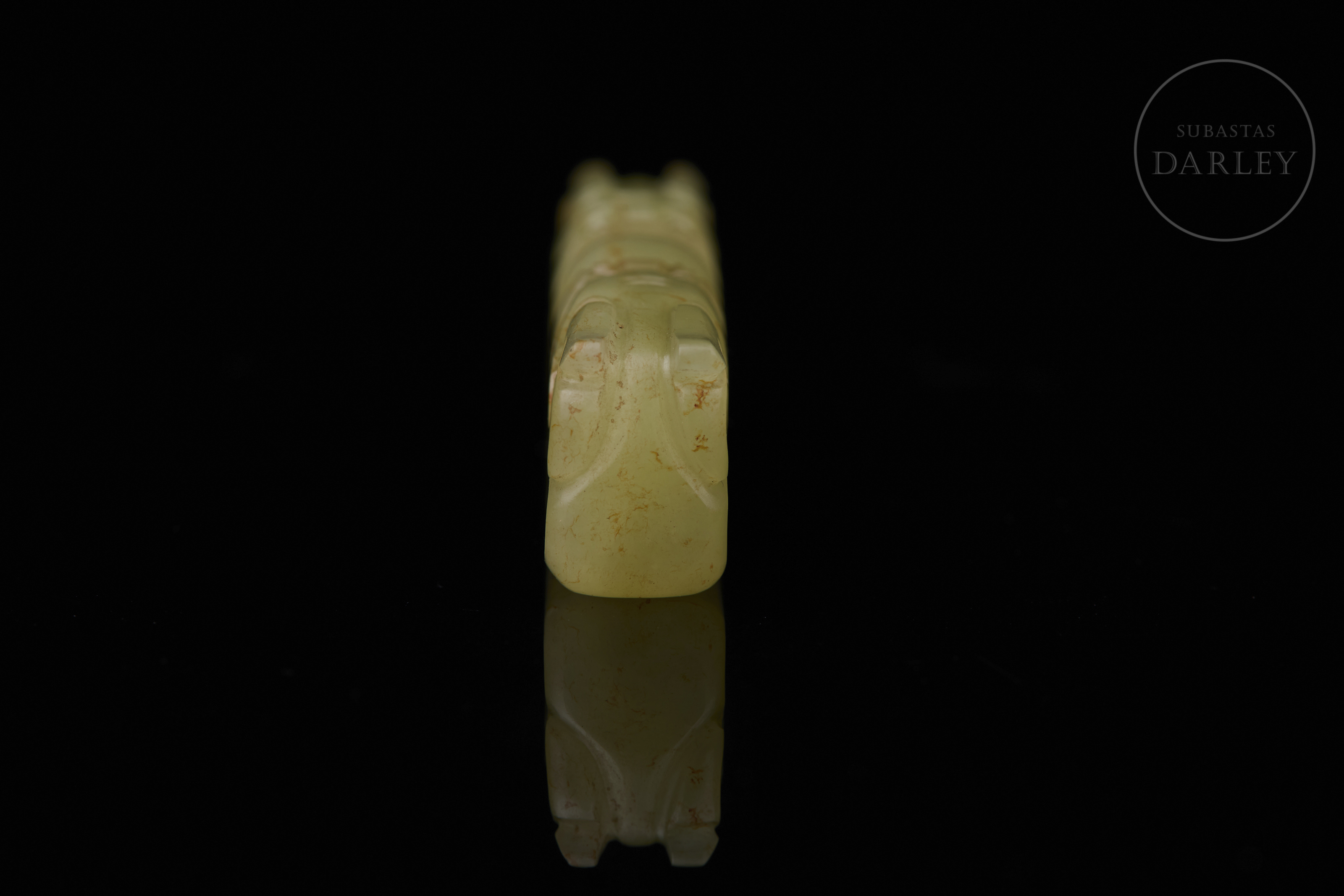 Jade de tonalidad amarillo-verdoso. La pieza presenta un formato rectangular alargado con extremos redondeados. Destaca por su composición simétrica, de dos dragones enfrentados en los extremos que convergen hacia una "perla" central, tallada en bulto redondo sobresaliente. Las cabezas de los dragones muestran rasgos arcaizantes con ojos prominentes y mandíbulas marcadas. Muestra pátina por antigüedad. Dinastía Qing (1644–1911).