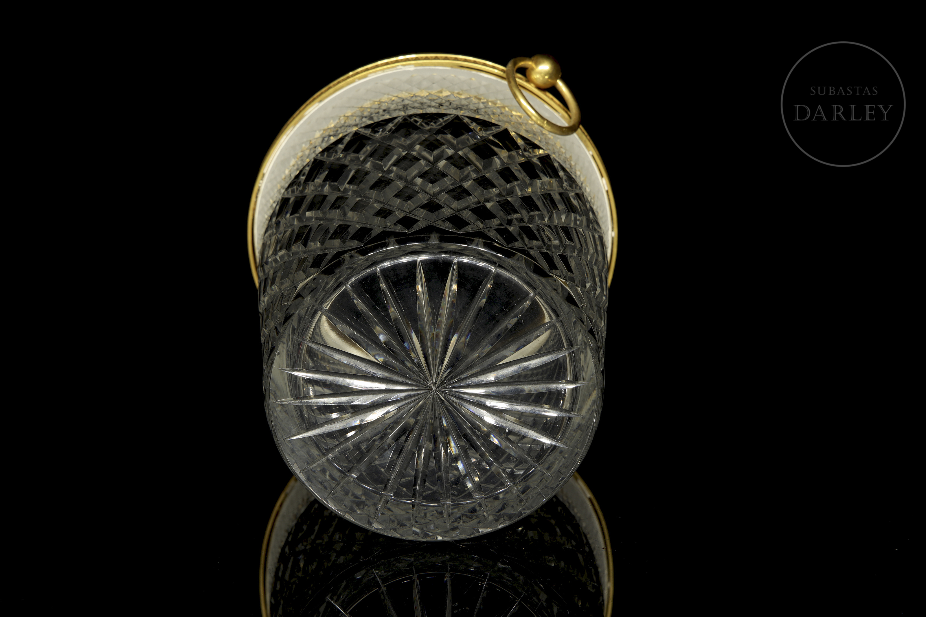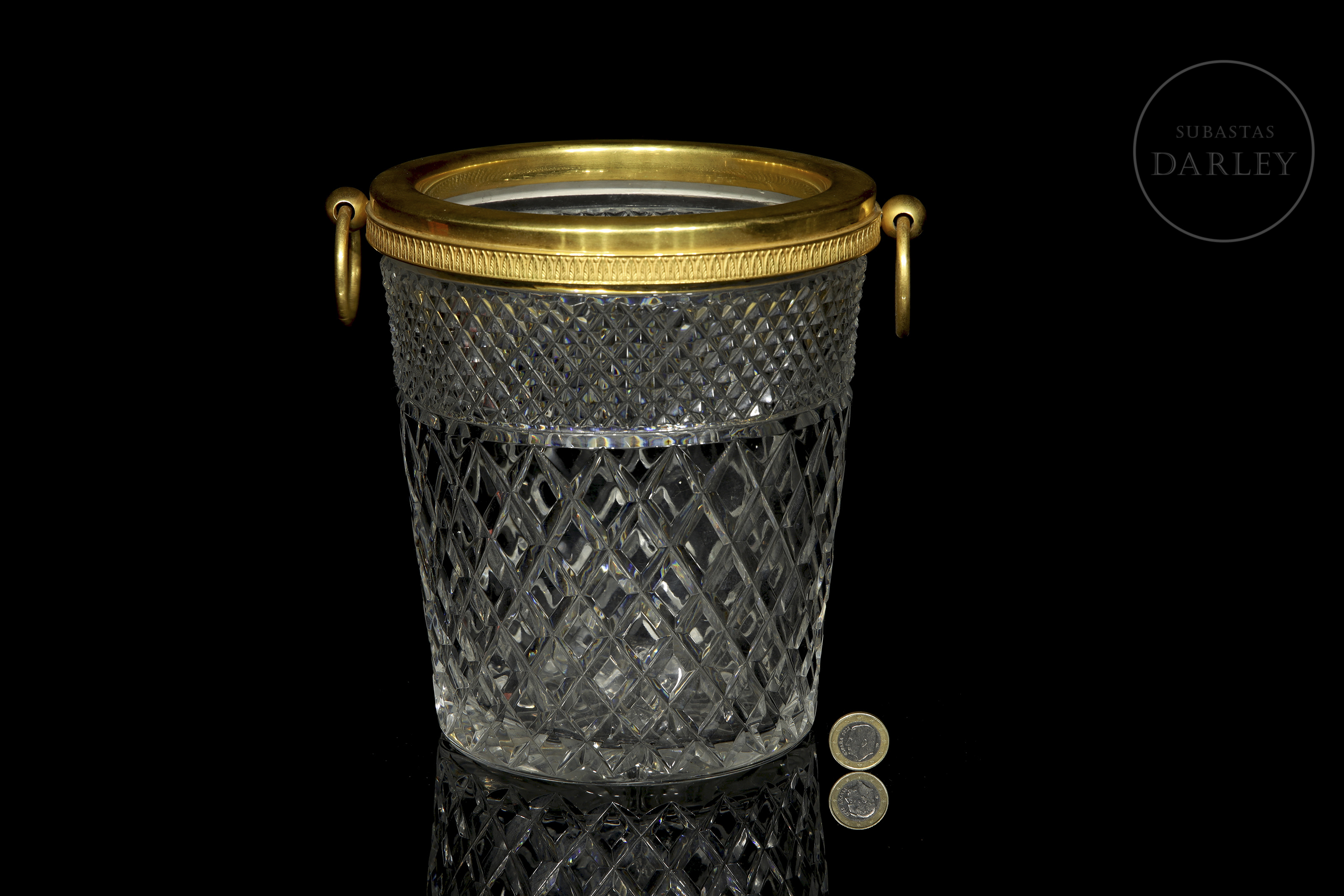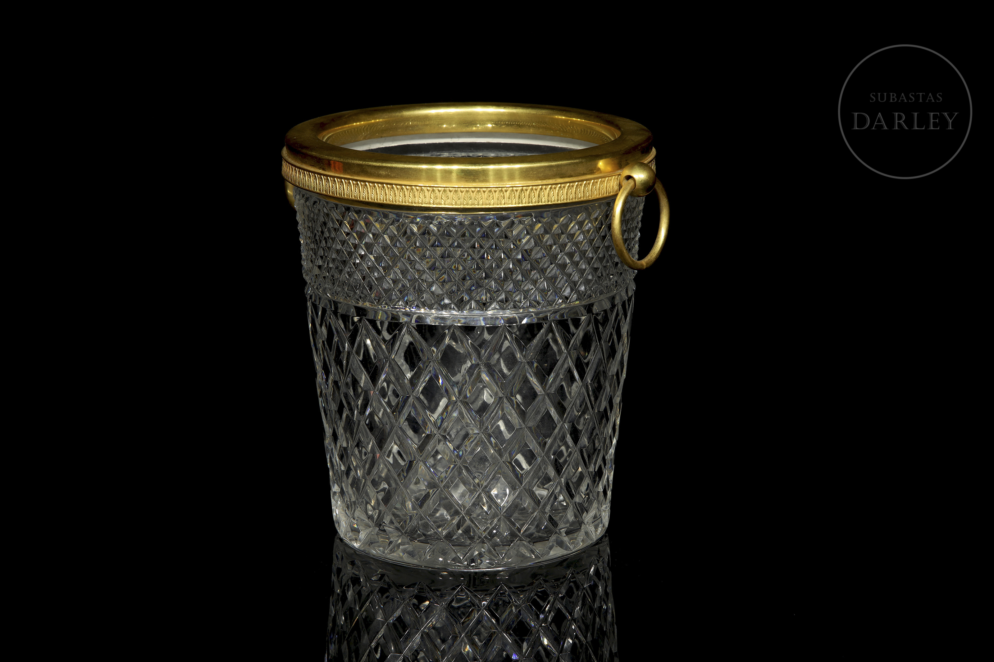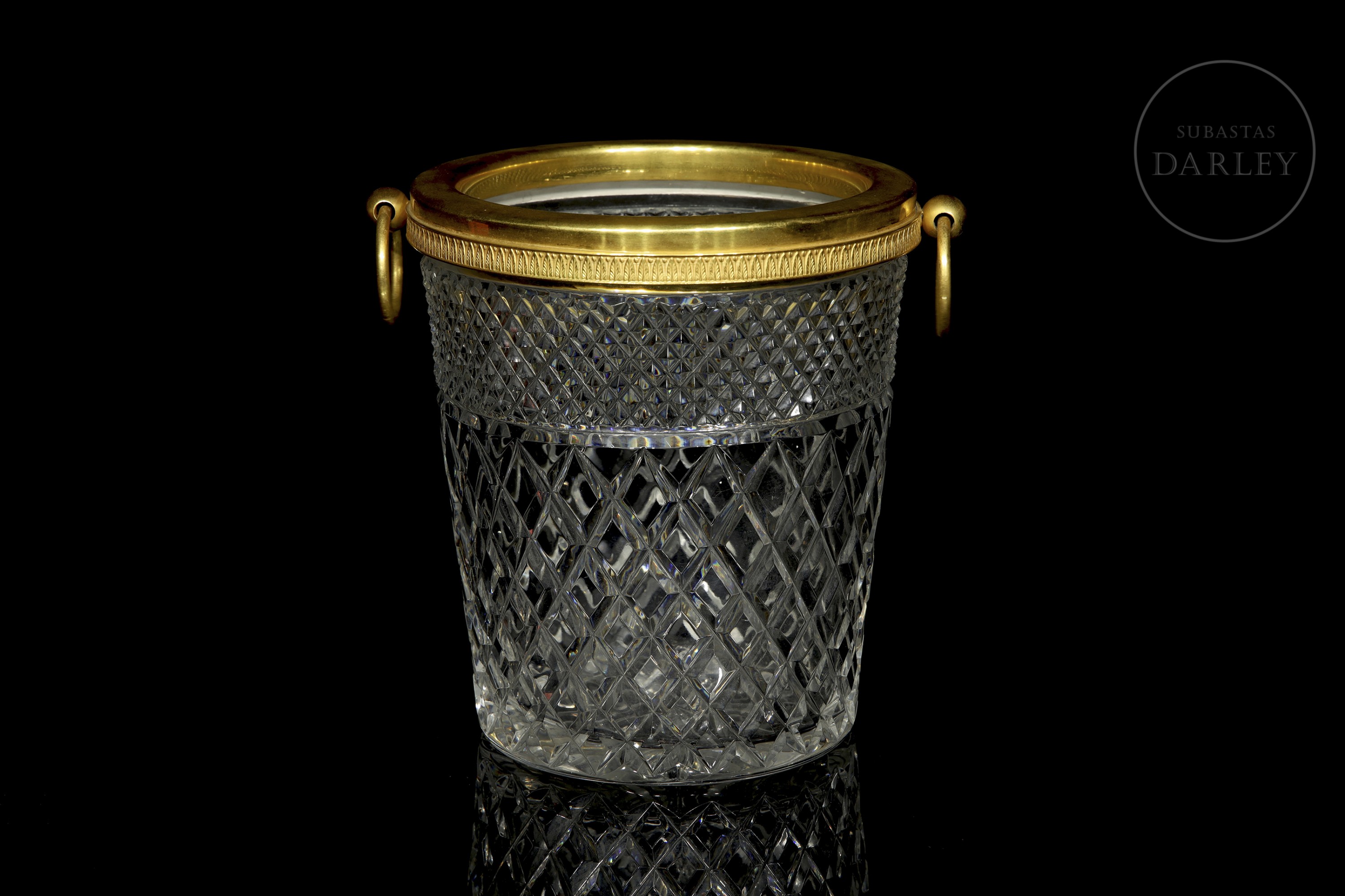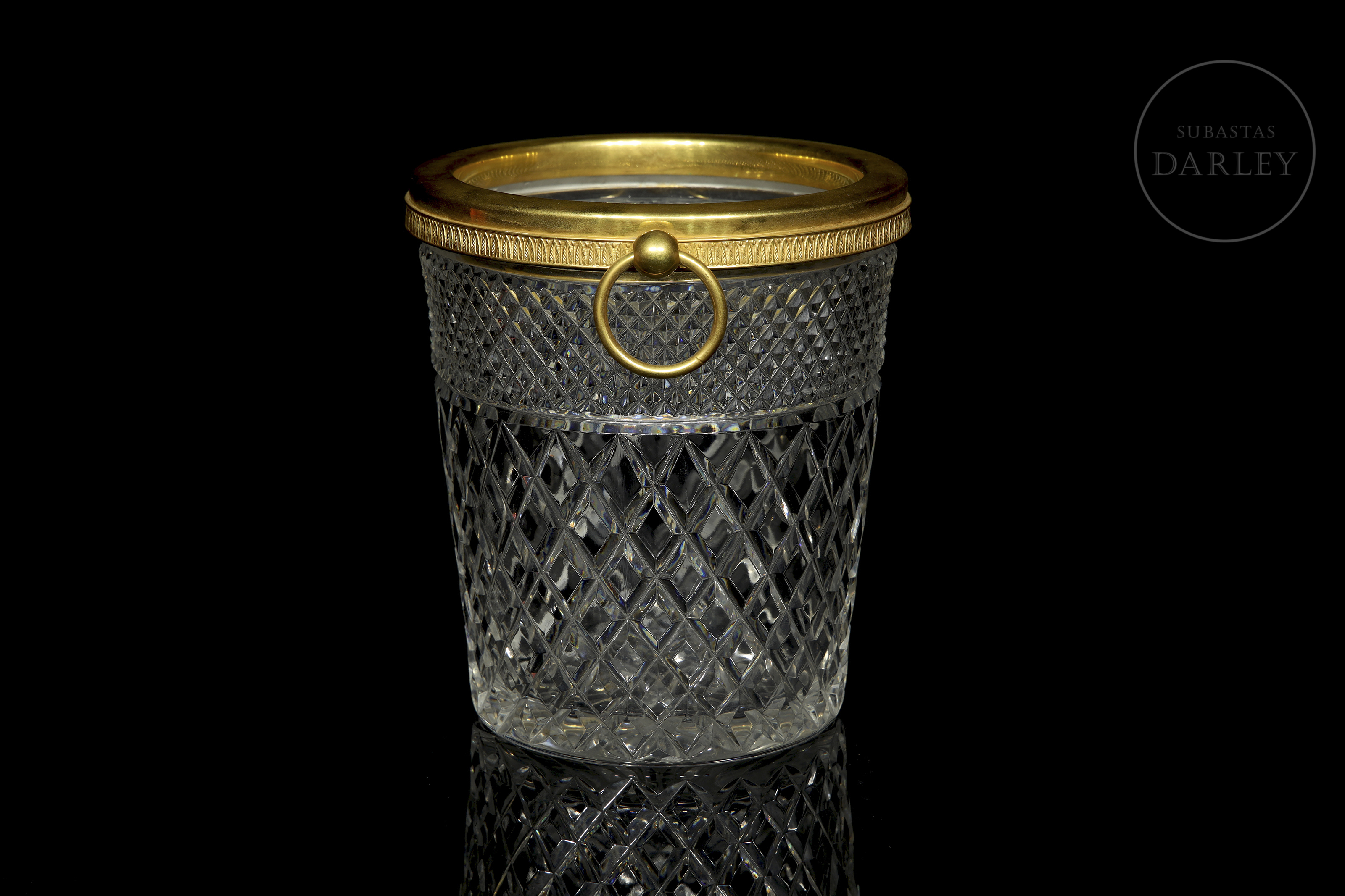 Pieza de cristalería francesa de alta calidad destinada al servicio de mesa. Presenta un cuerpo cilíndrico de cristal con dos tipos de tallado geométrico y un aro superior metálico con asas móviles.