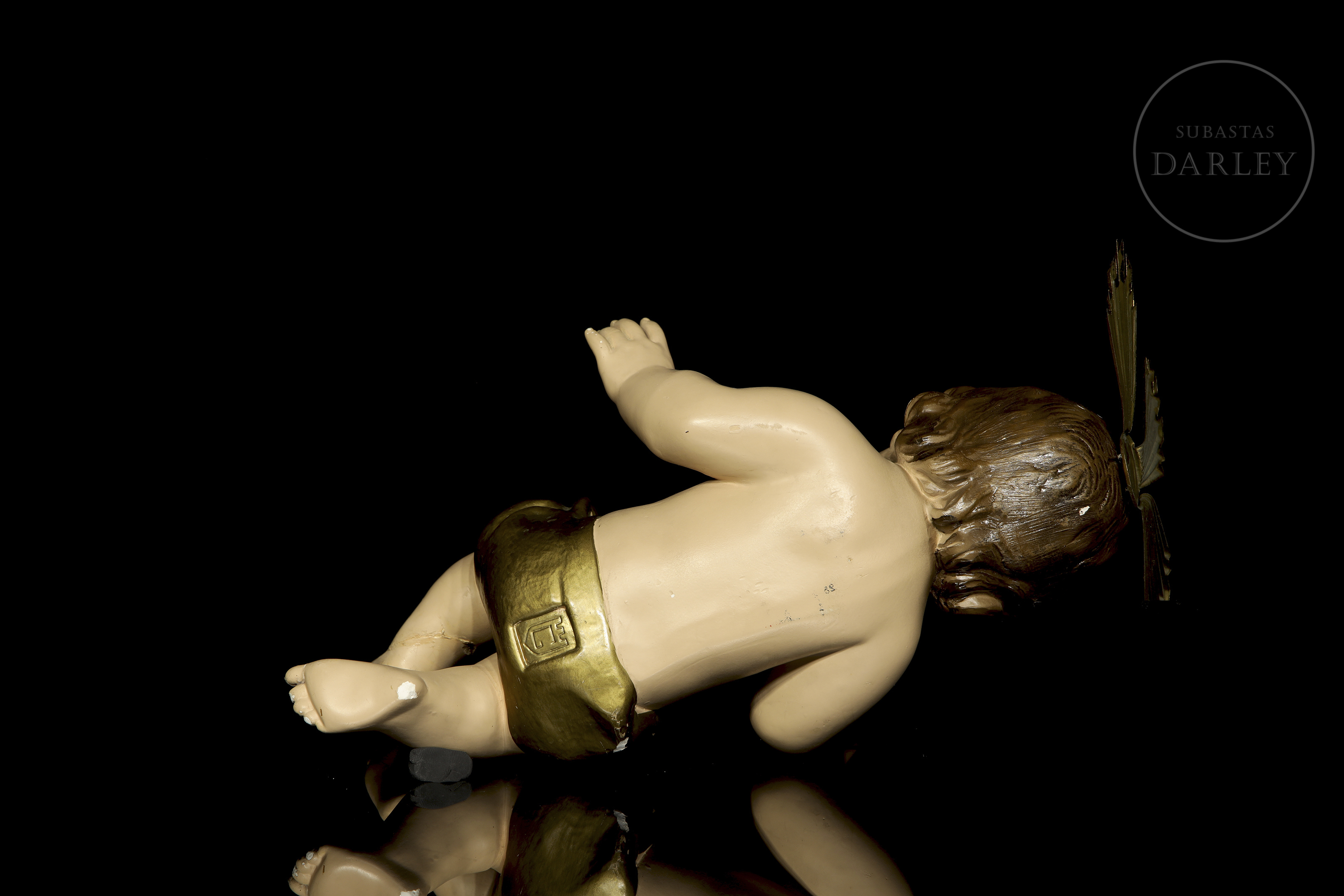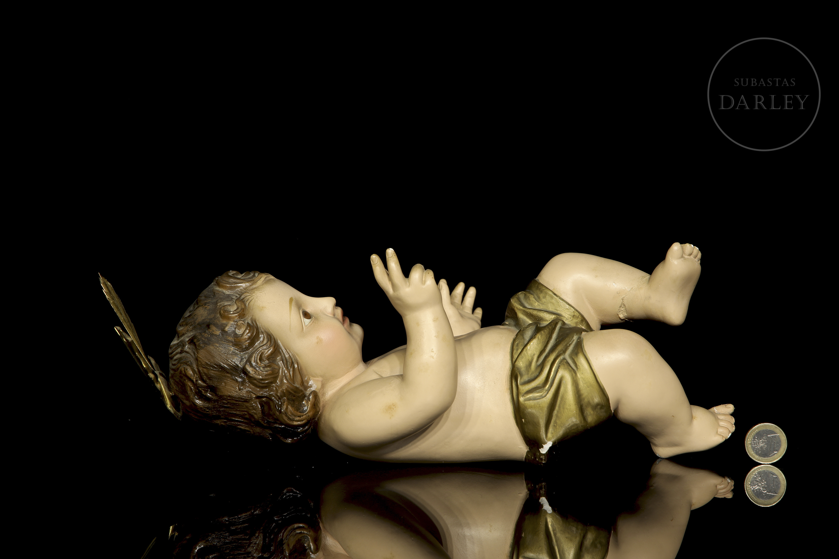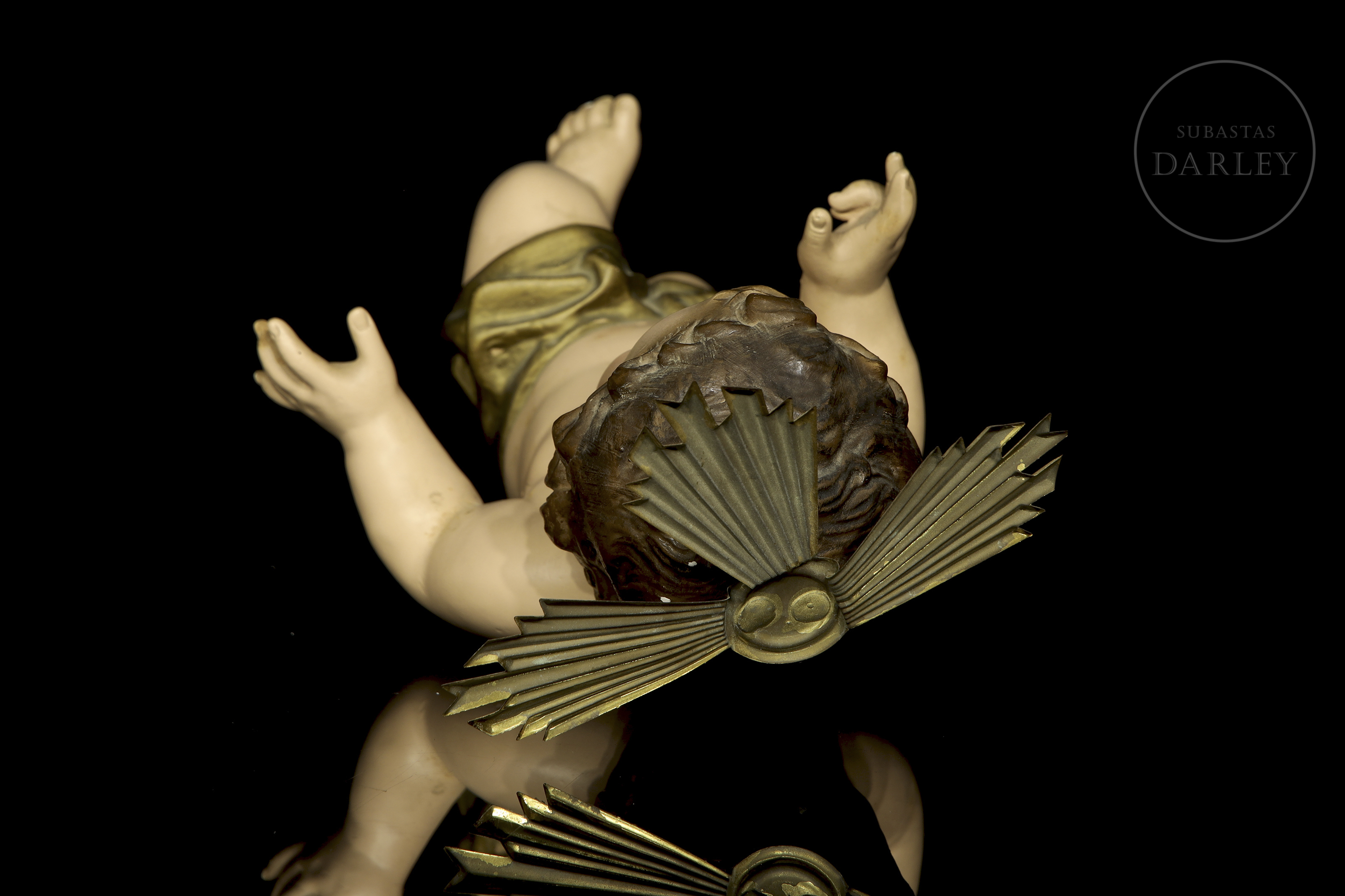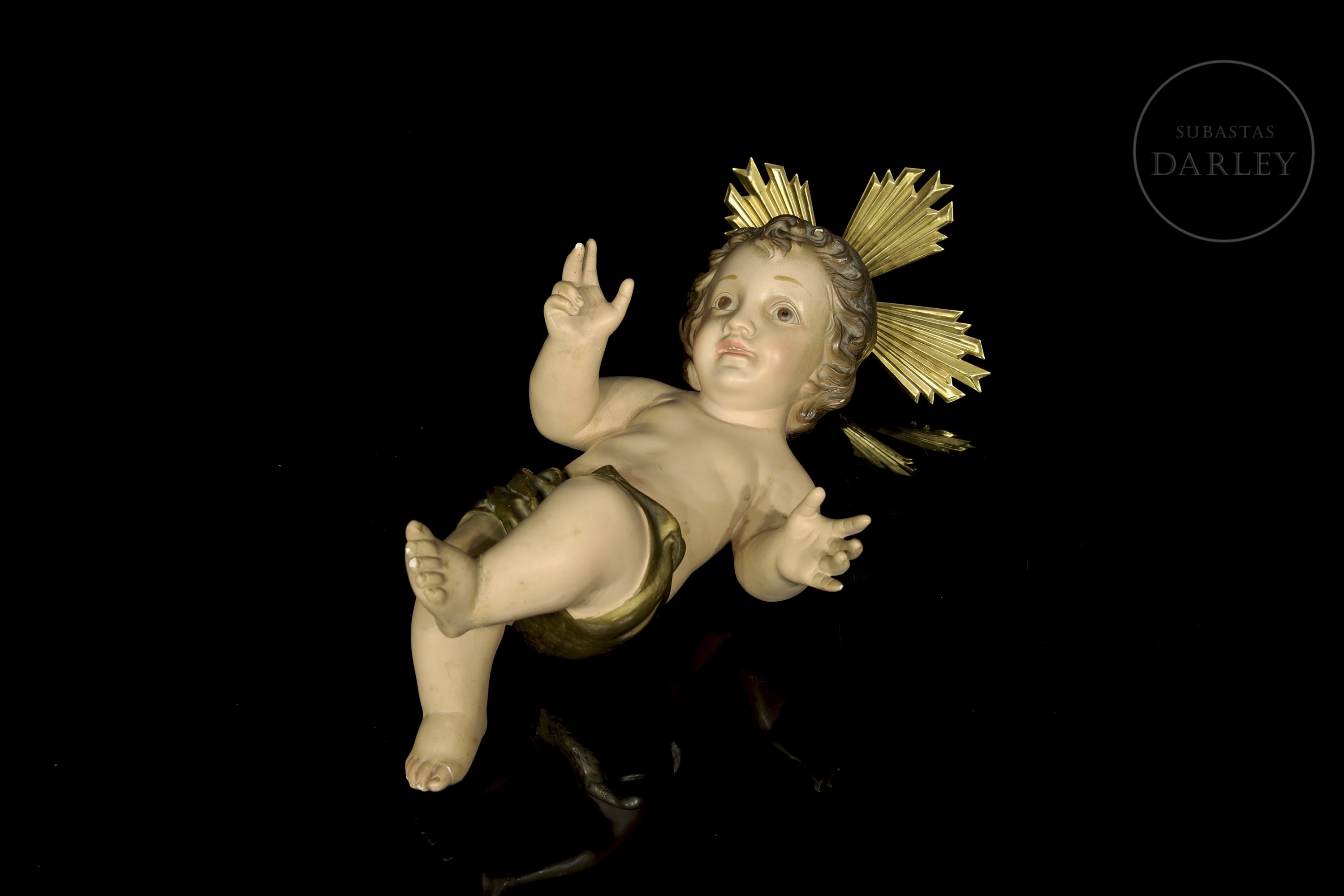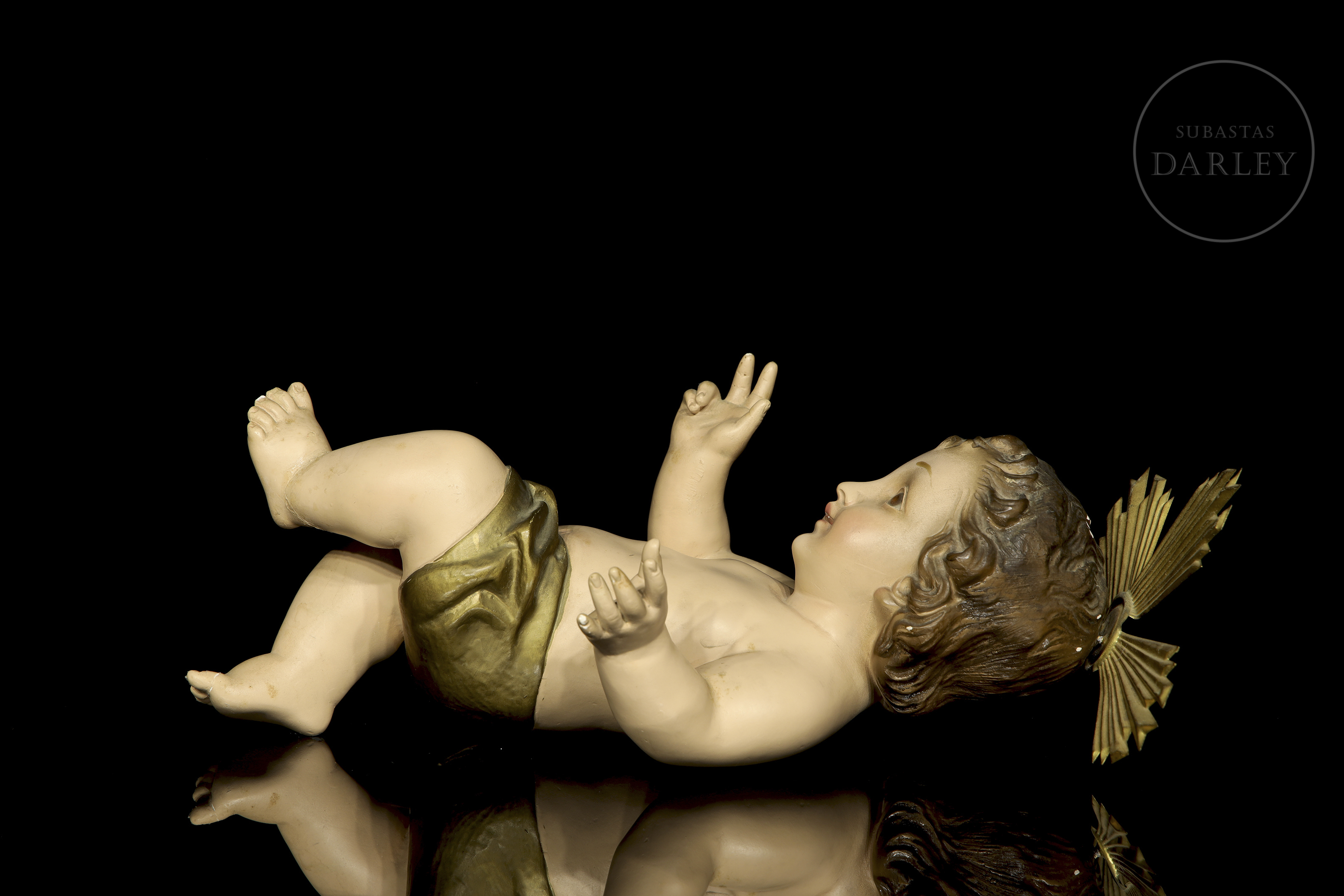 Realizada en porcelana, representa al Niño Jesús en actitud bendiciente. La pieza destaca por su acabado vítreo, el uso de ojos de cristal para mayor realismo y la inclusión de potencias metálicas doradas.