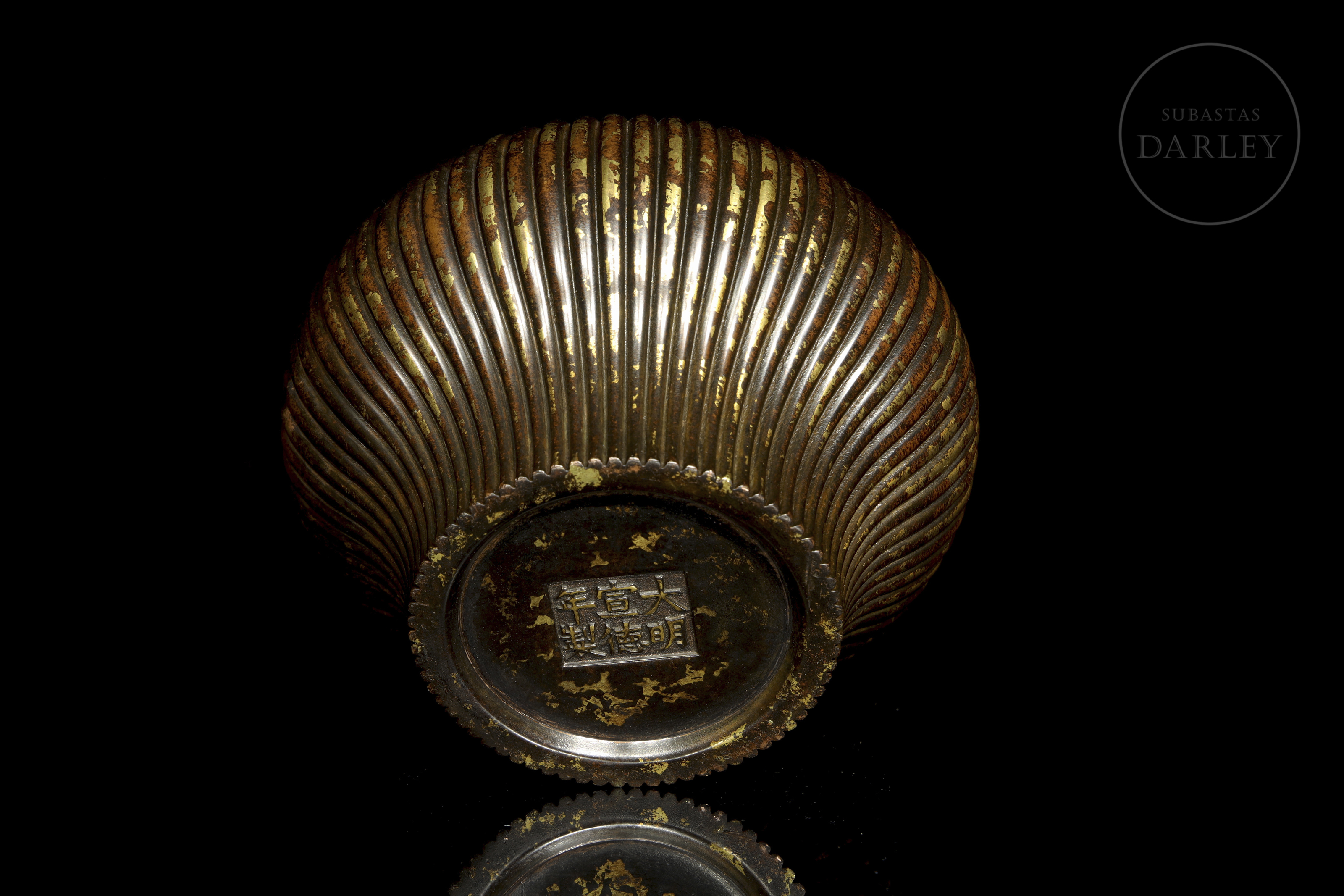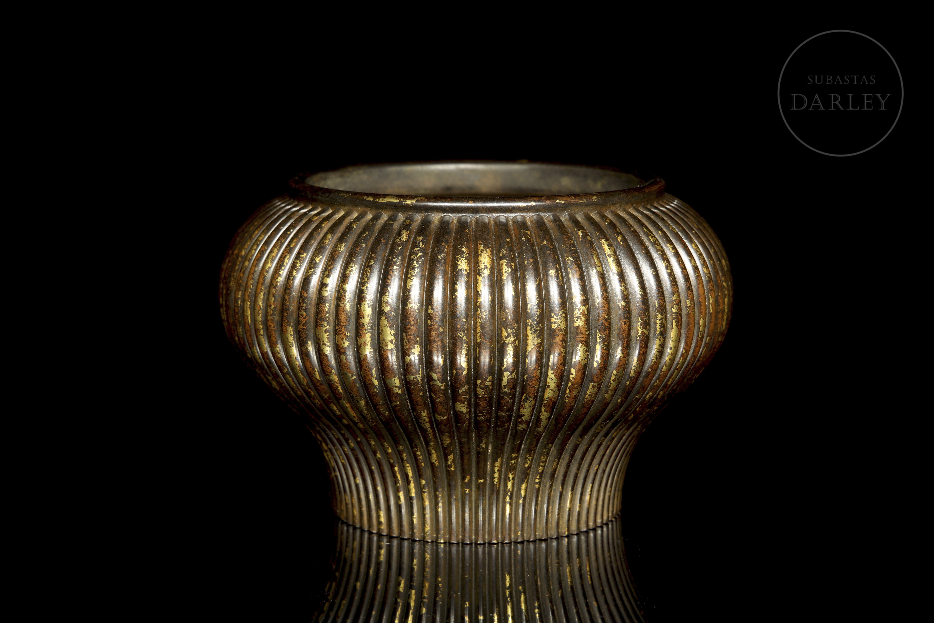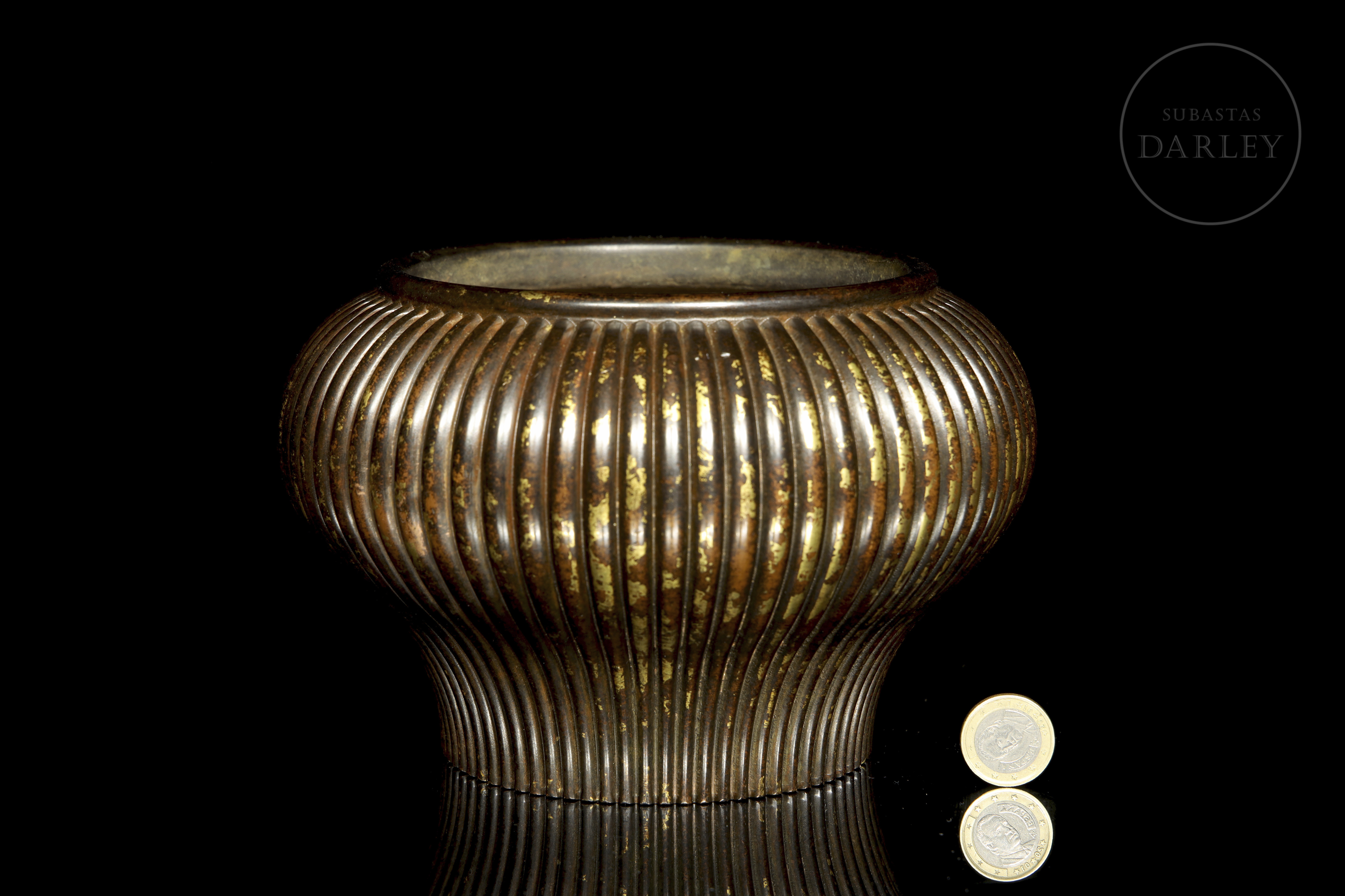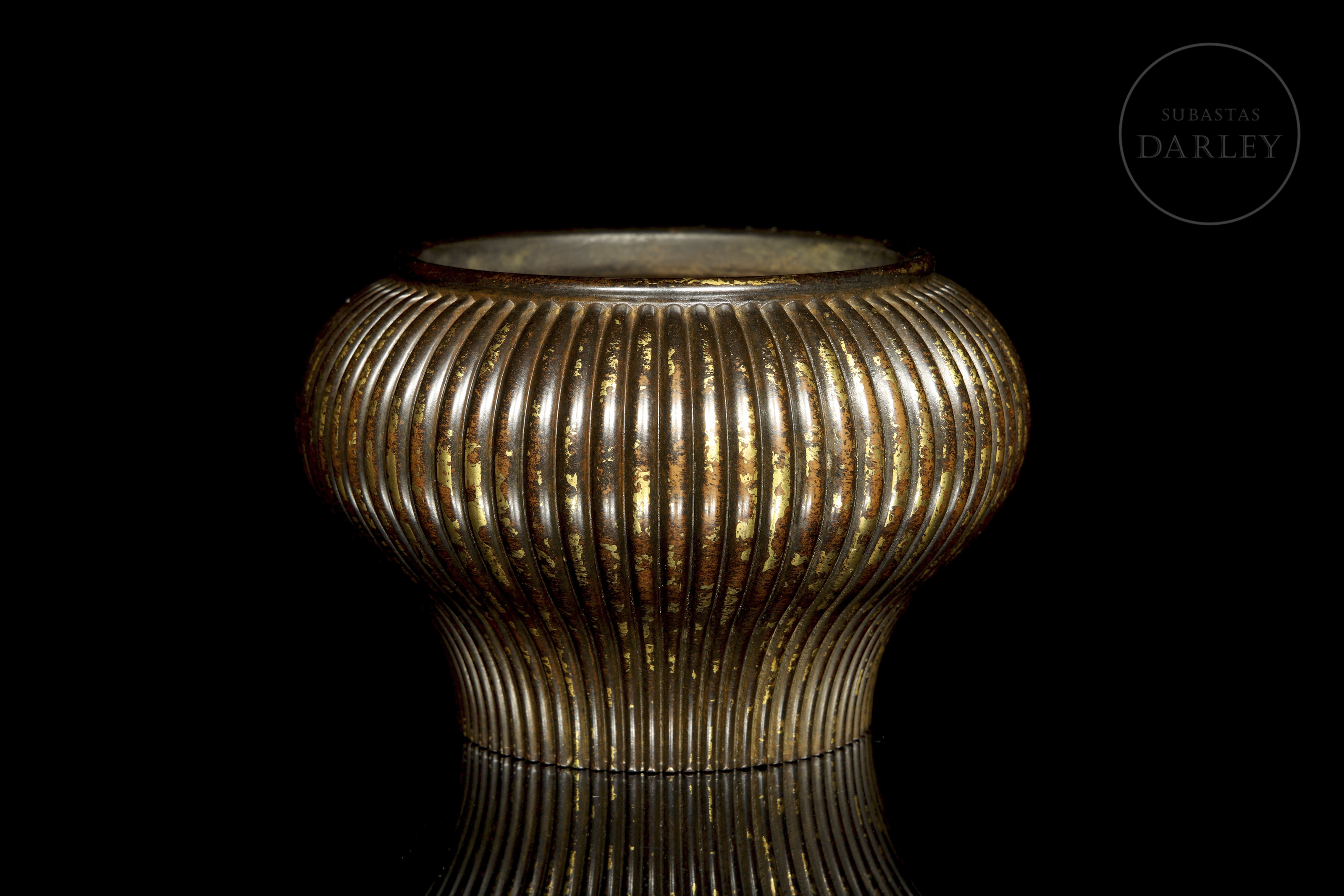 Incensario de bronce dorado, de cuerpo globular y robusto con un perfil cubierto de líneas verticales en relieve, que recorren toda la superficie desde el borde hasta la base. El exterior, de tono bronce oscuro, muestra restos del dorado original creando un hermoso contraste. En la base se dispone un sello de seis caracteres "大明宣德年制" en un recuadro rectangular. Dinastía Ming (1368-1644).