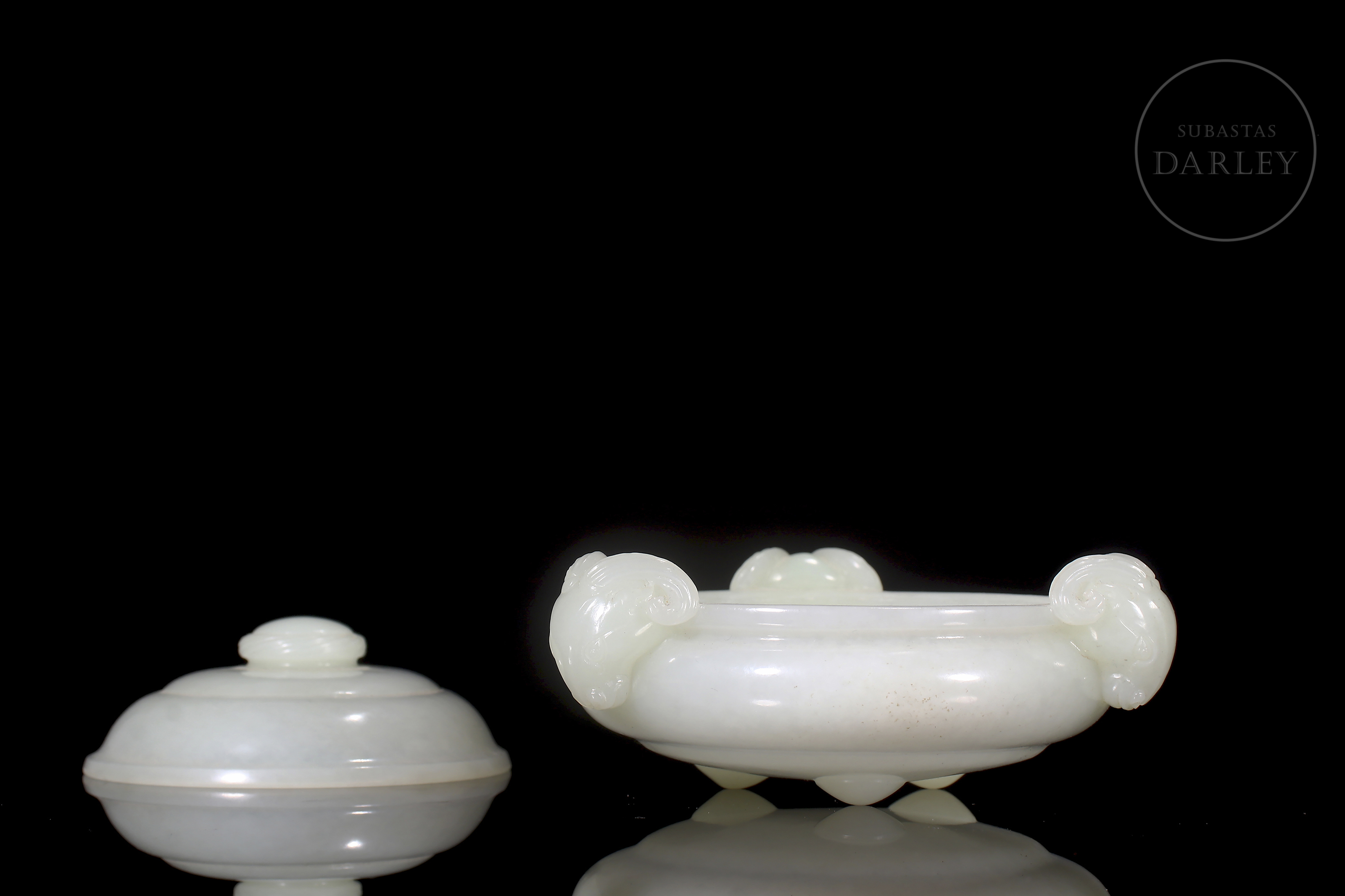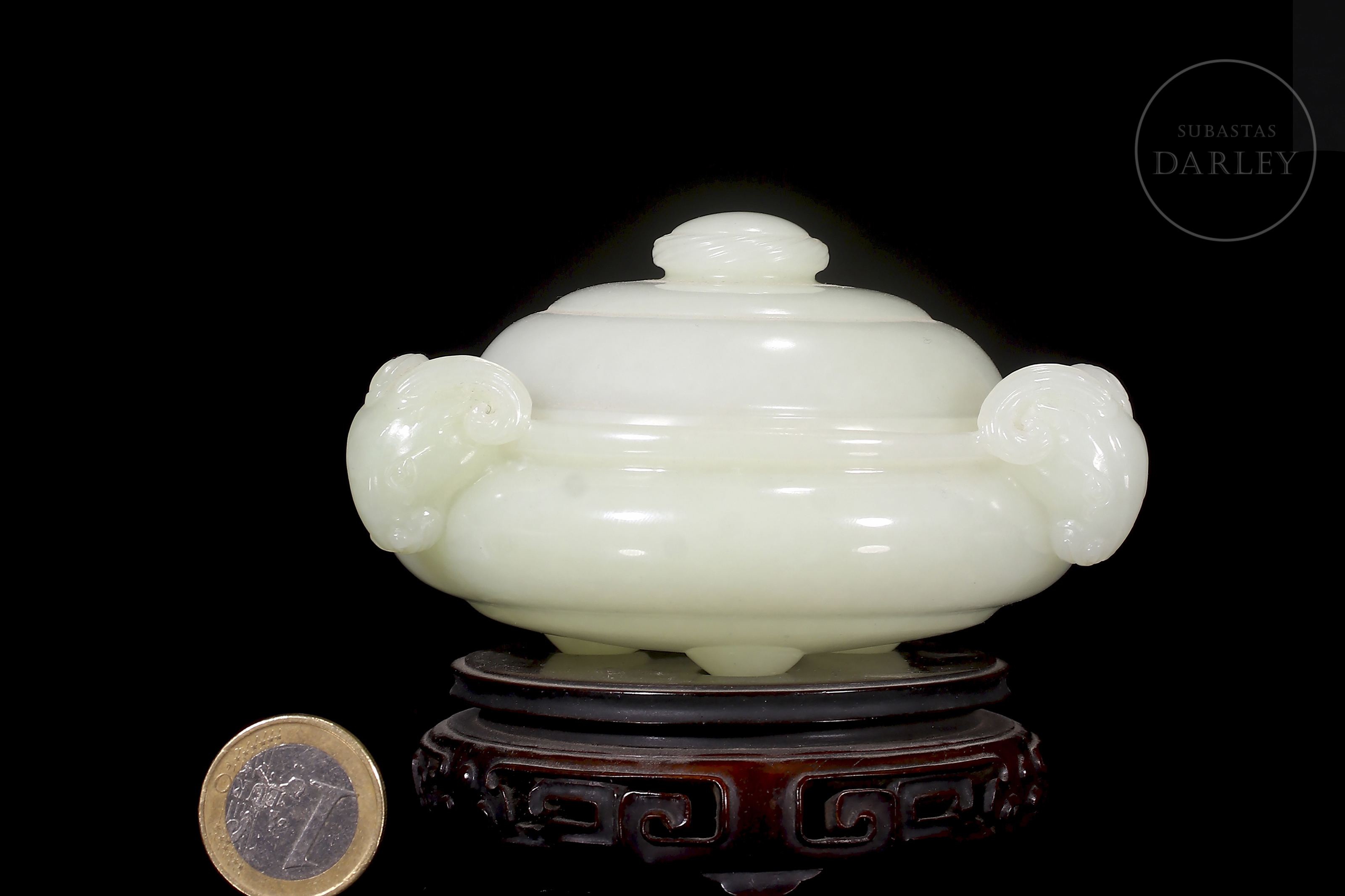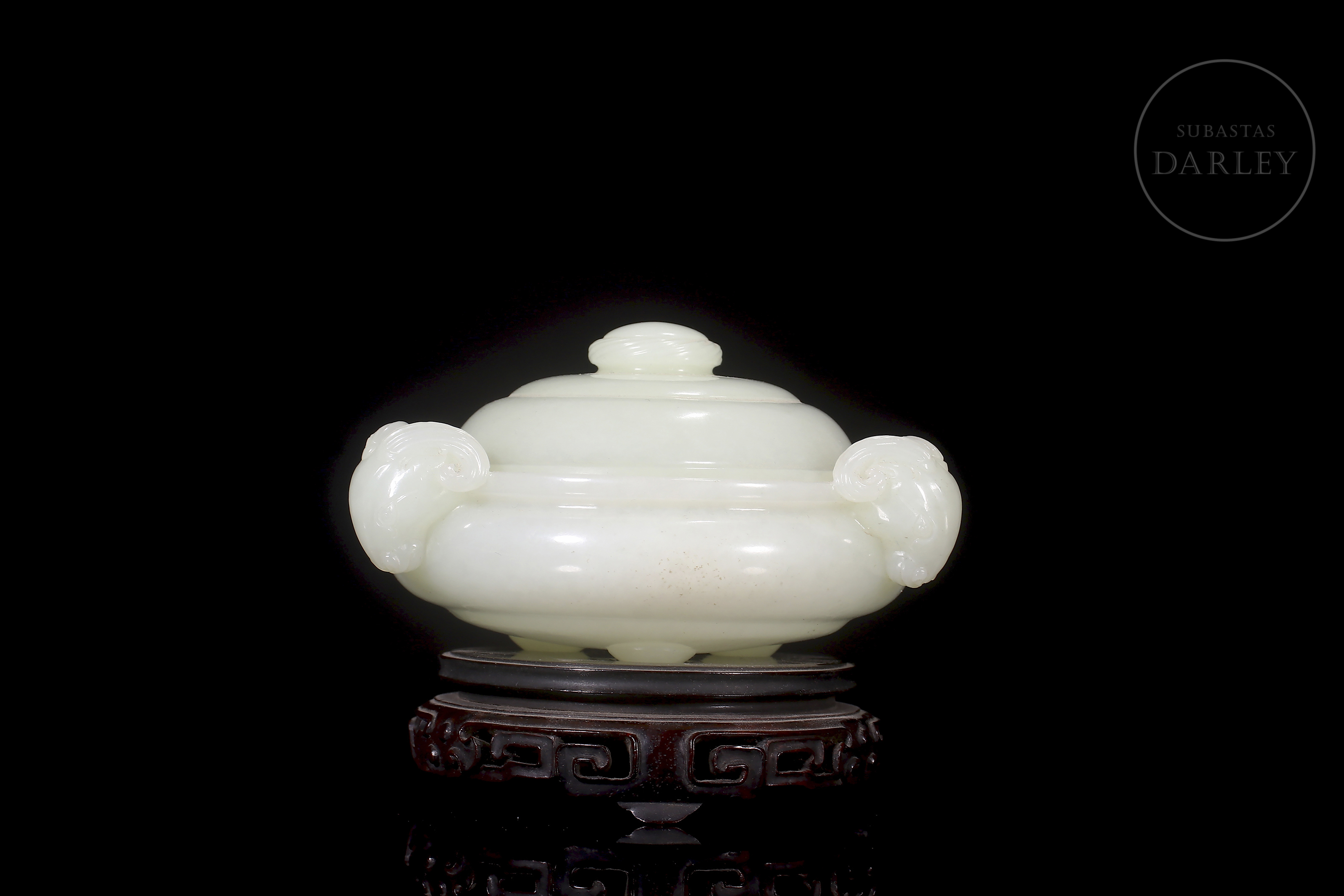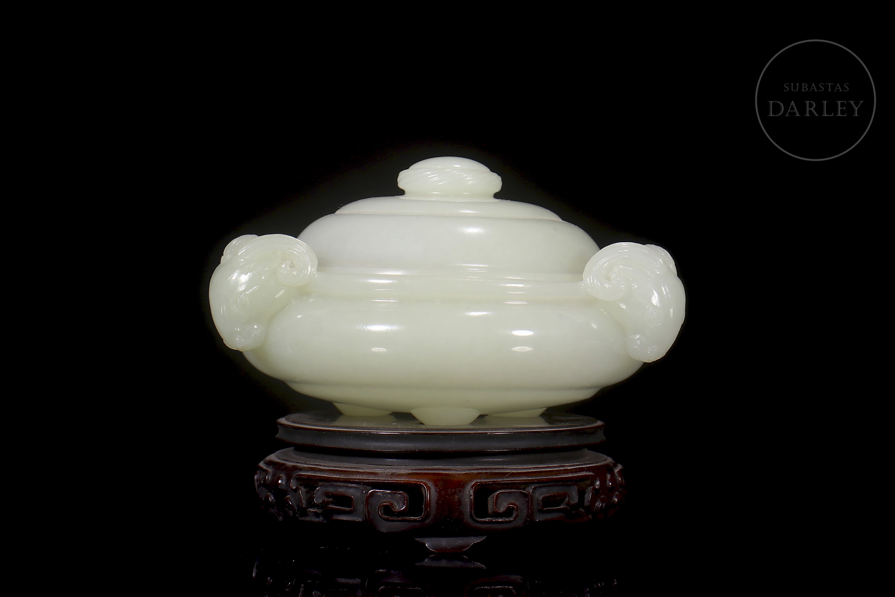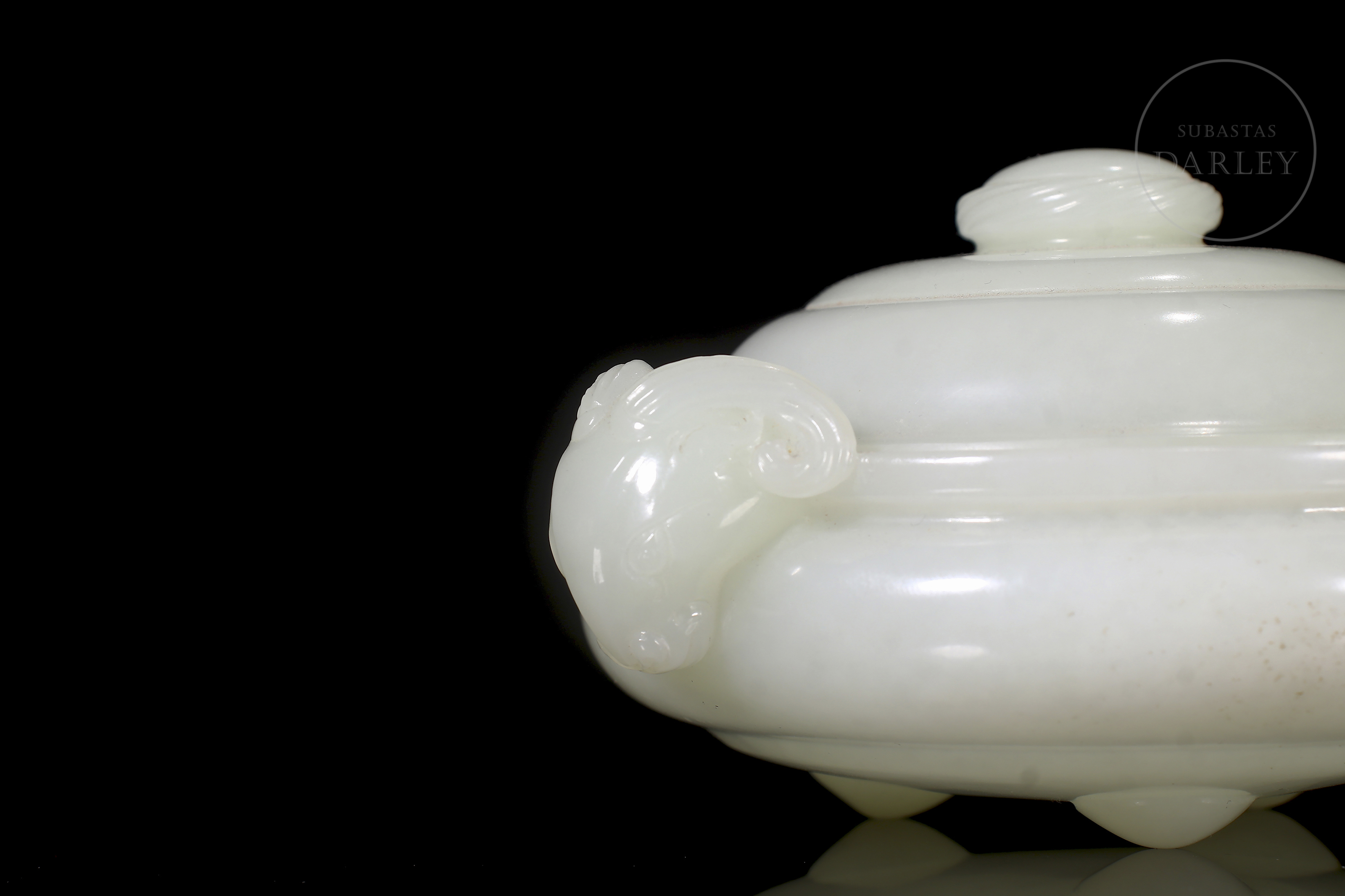 Incensario tallado de jade blanco de Hetian, de forma chata y redondeada, con tapa y tres patas cortas y redondeadas. El jade es de color blanco pálido y cremoso con un acabado altamente pulido. Se encuentra adornado por dos cabezas de carnero con cuernos enroscados tallados en altorrelieve, que funcionan como asas. La tapa es abovedada y se remata con un pomo simple. Se presenta sobre una base de madera tallada con un patrón calado de volutas ruyi. Dinastía Qing (1644–1912).