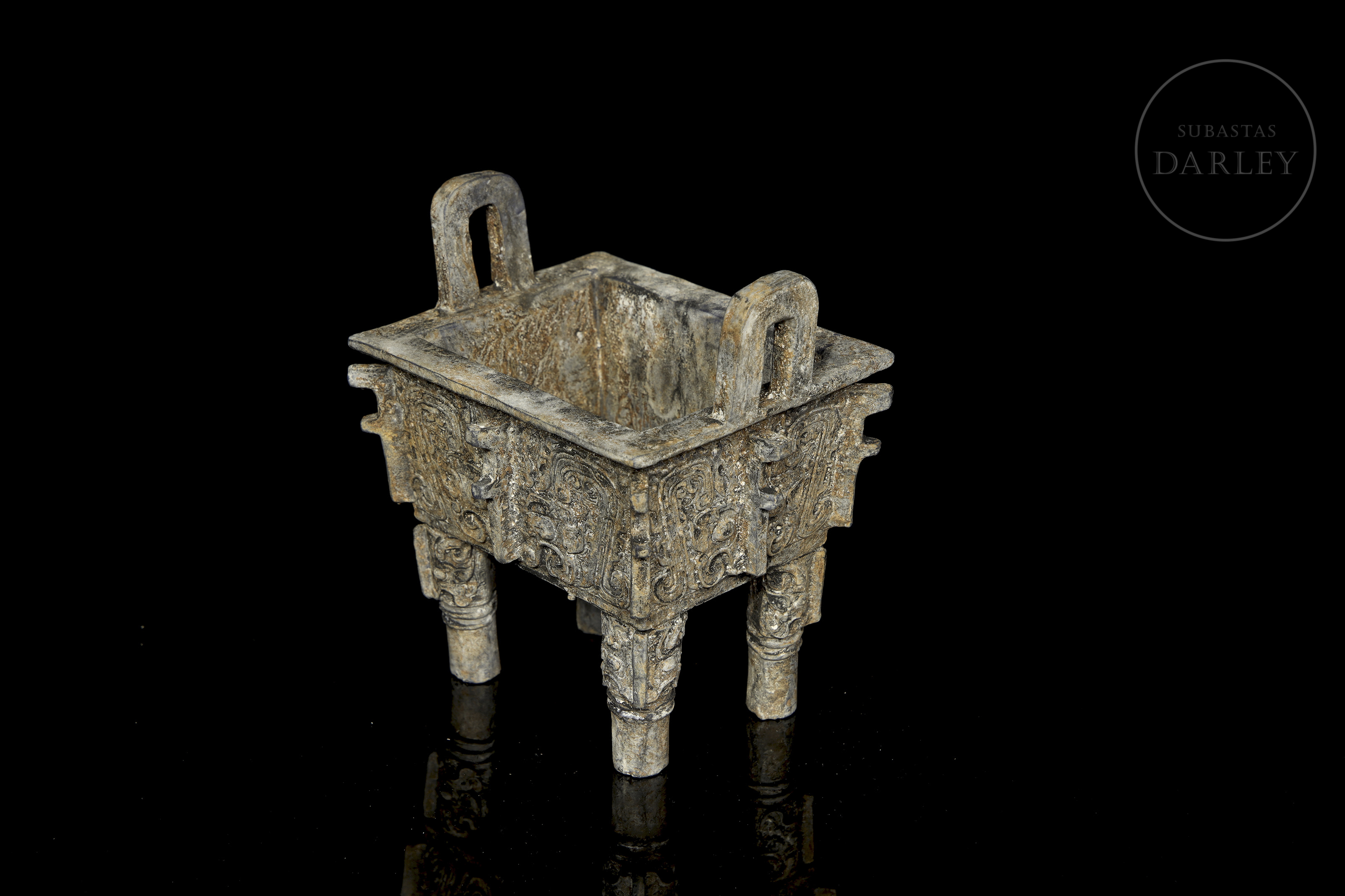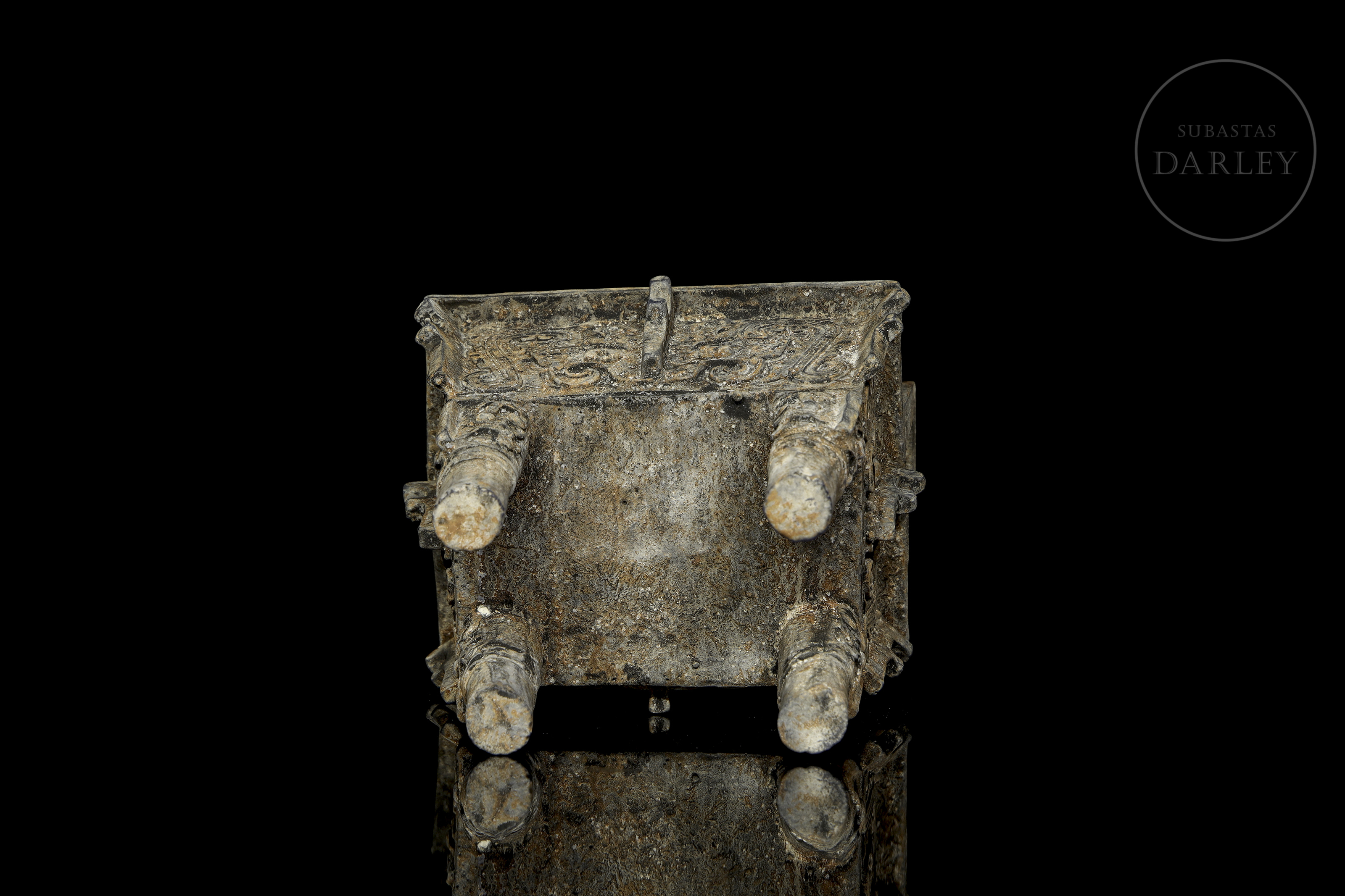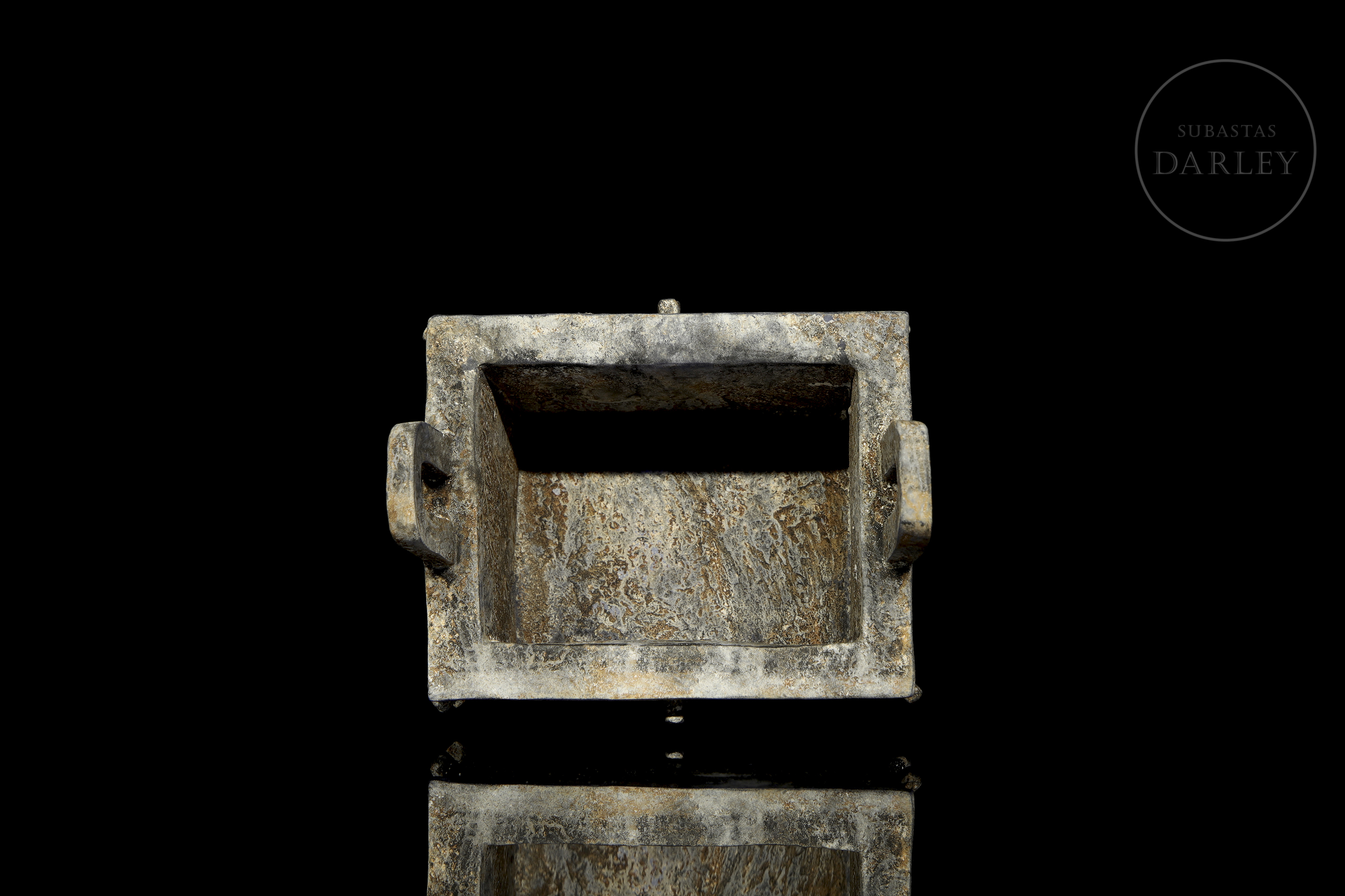 Incensario ritual de forma rectangular de Liulí "琉璃" de intenso color azul cobalto. La morfología es de un recipiente de boca cuadrada, cuerpo profundo y plano, sostenido por cuatro patas cilíndricas que descienden verticalmente. El borde superior está rematado por dos asas en forma de U opuestas. La decoración muestra en alto y bajo relieve máscaras zoomorfas "Taotie" representadas simétricamente con grandes ojos y un diseño de volutas entrelazadas de nubes y criaturas míticas, un estilo decorativo característico de los bronces rituales. El color azul ha sido cubierto por la pátina de corrosión y enterramiento. Dinastía Han (206 a.C. - 220 d.C.).