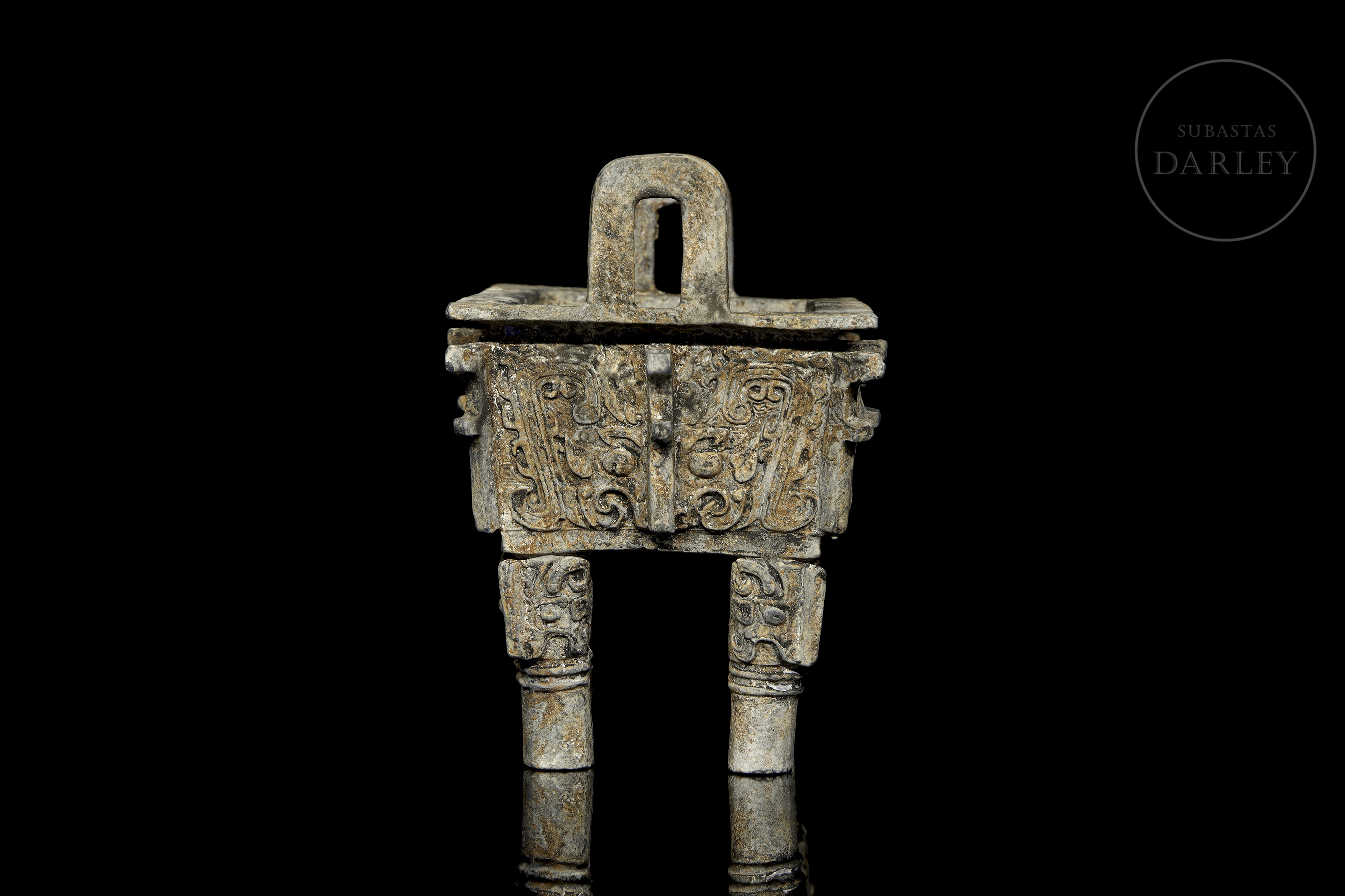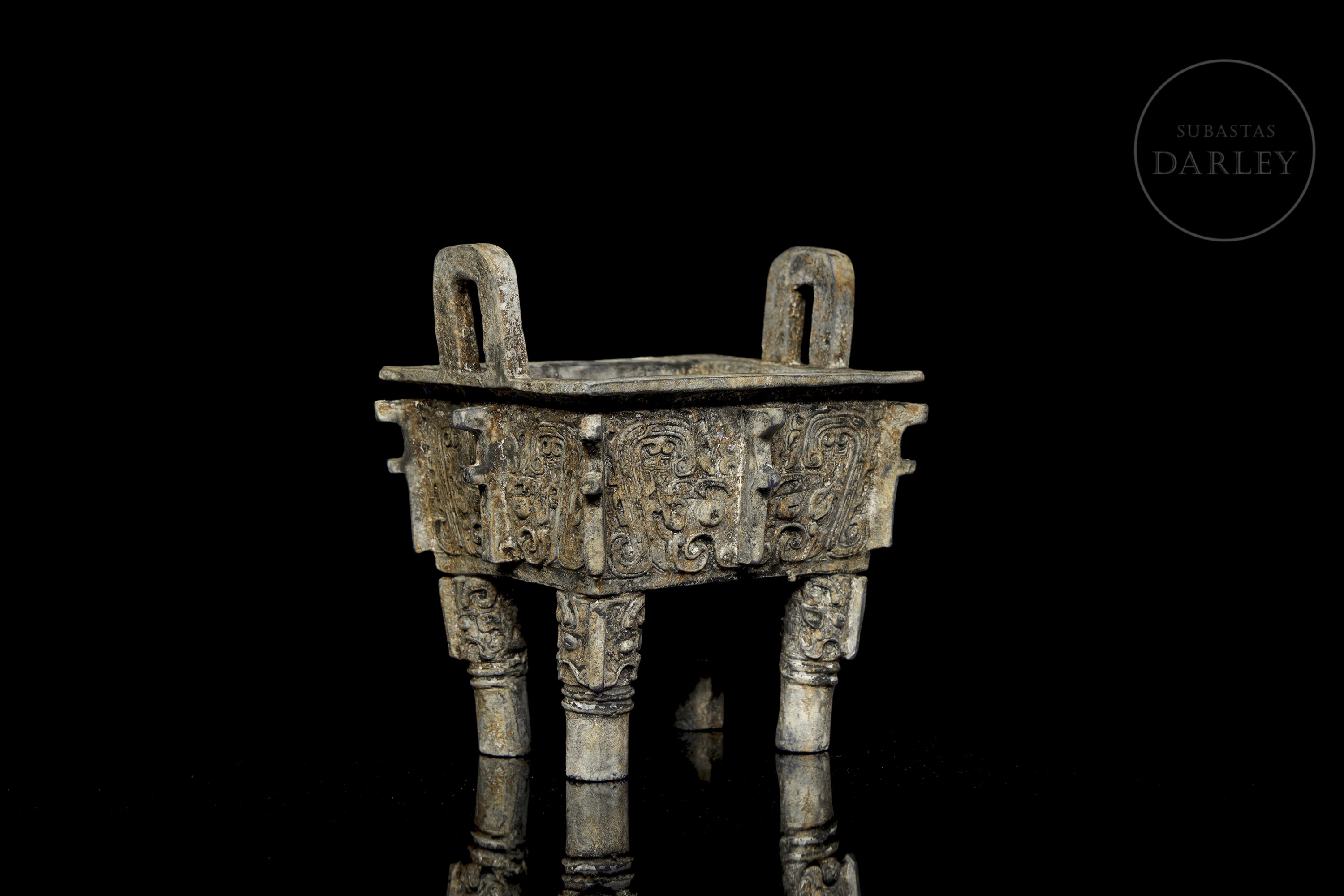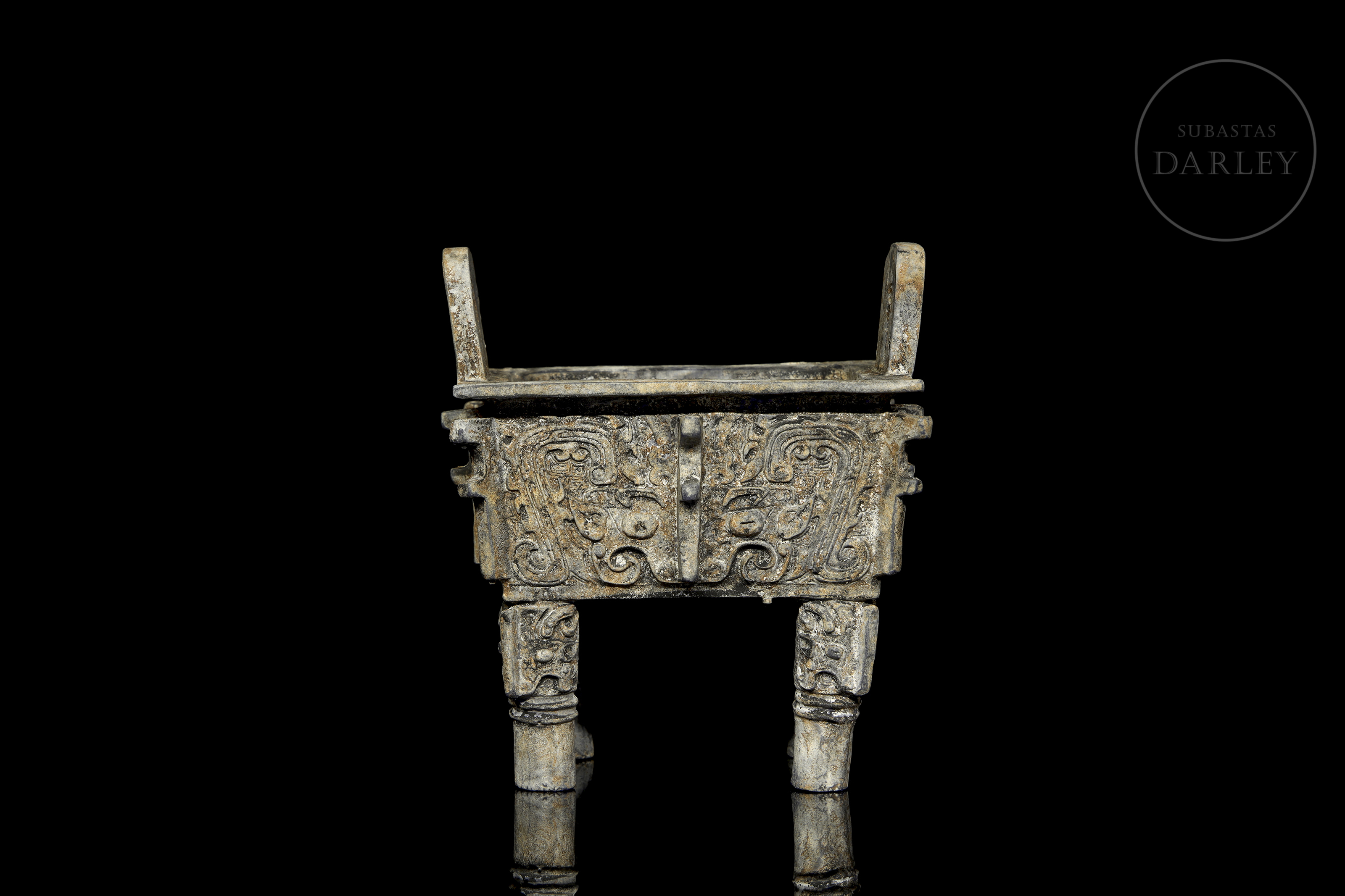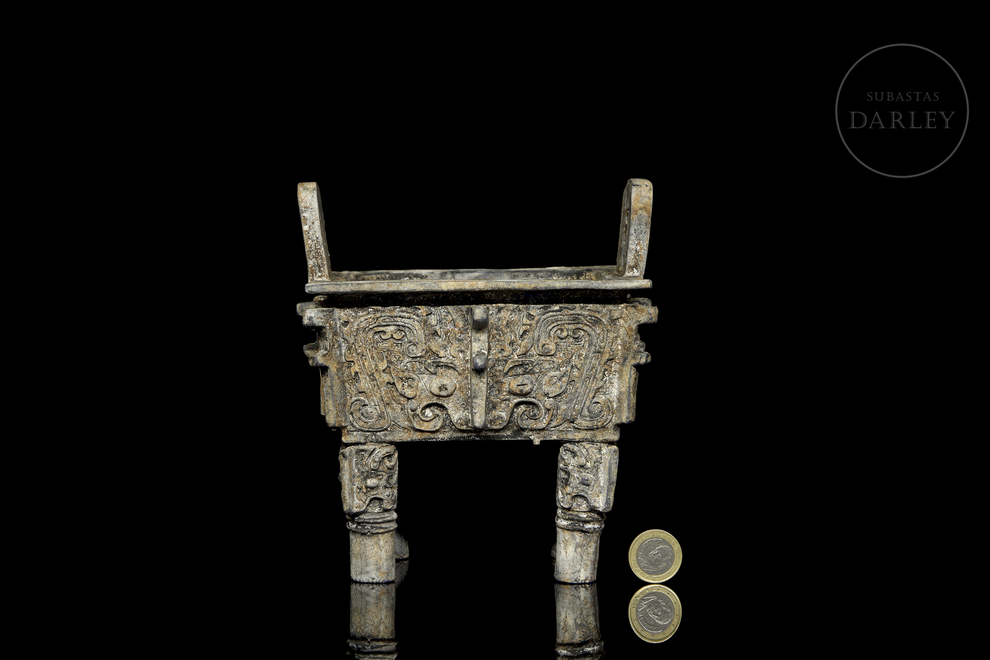 Incensario ritual de forma rectangular de Liulí "琉璃" de intenso color azul cobalto. La morfología es de un recipiente de boca cuadrada, cuerpo profundo y plano, sostenido por cuatro patas cilíndricas que descienden verticalmente. El borde superior está rematado por dos asas en forma de U opuestas. La decoración muestra en alto y bajo relieve máscaras zoomorfas "Taotie" representadas simétricamente con grandes ojos y un diseño de volutas entrelazadas de nubes y criaturas míticas, un estilo decorativo característico de los bronces rituales. El color azul ha sido cubierto por la pátina de corrosión y enterramiento. Dinastía Han (206 a.C. - 220 d.C.).