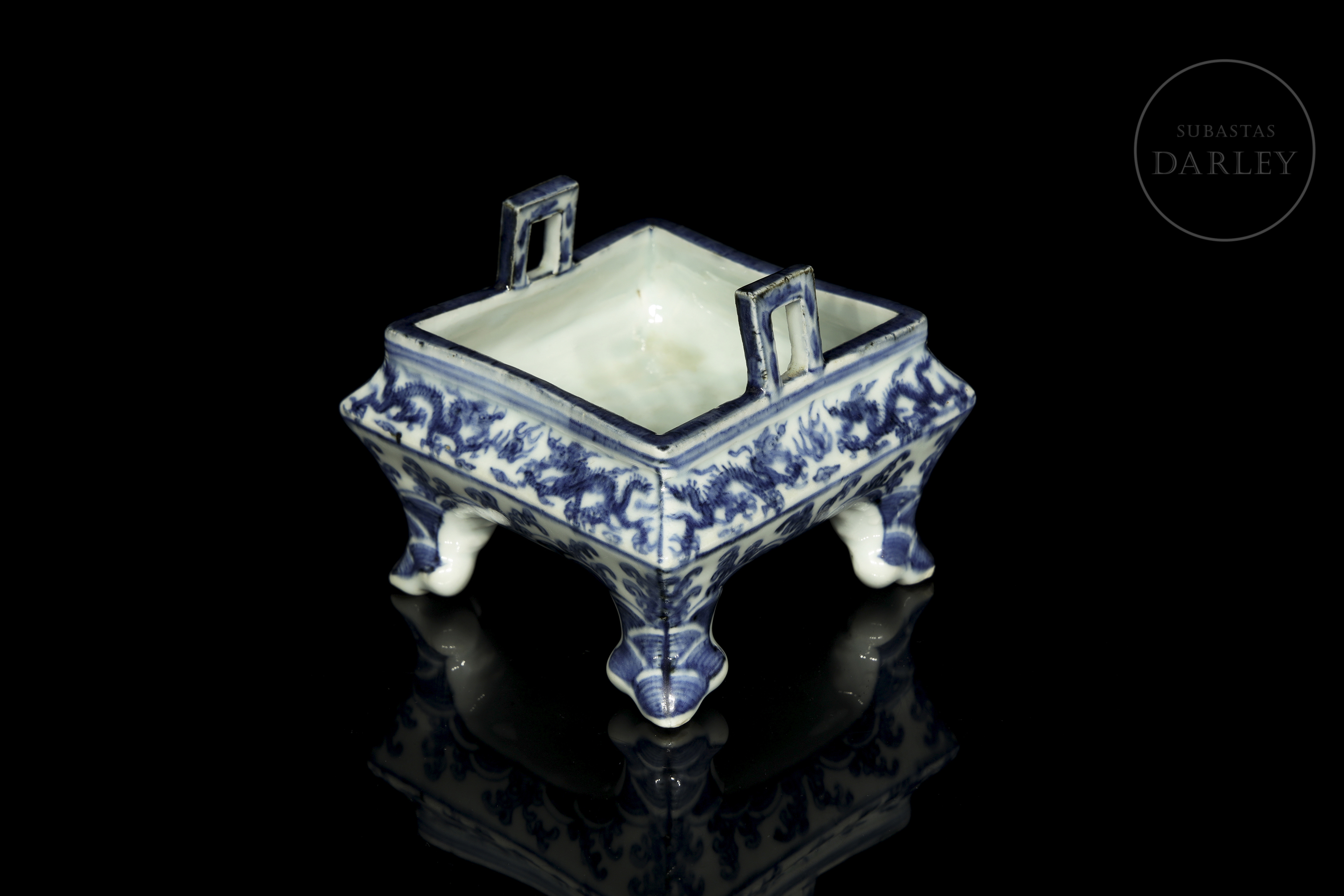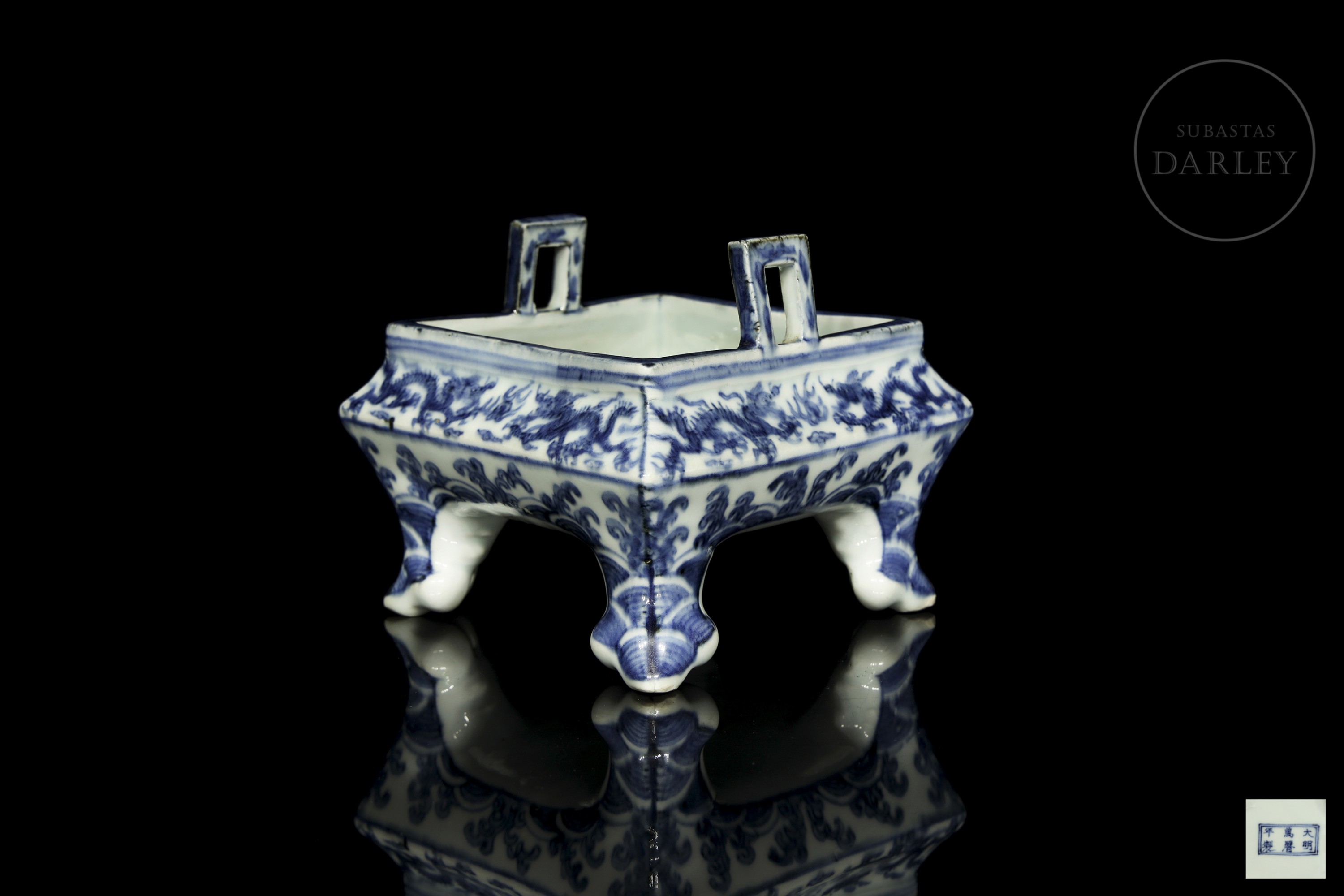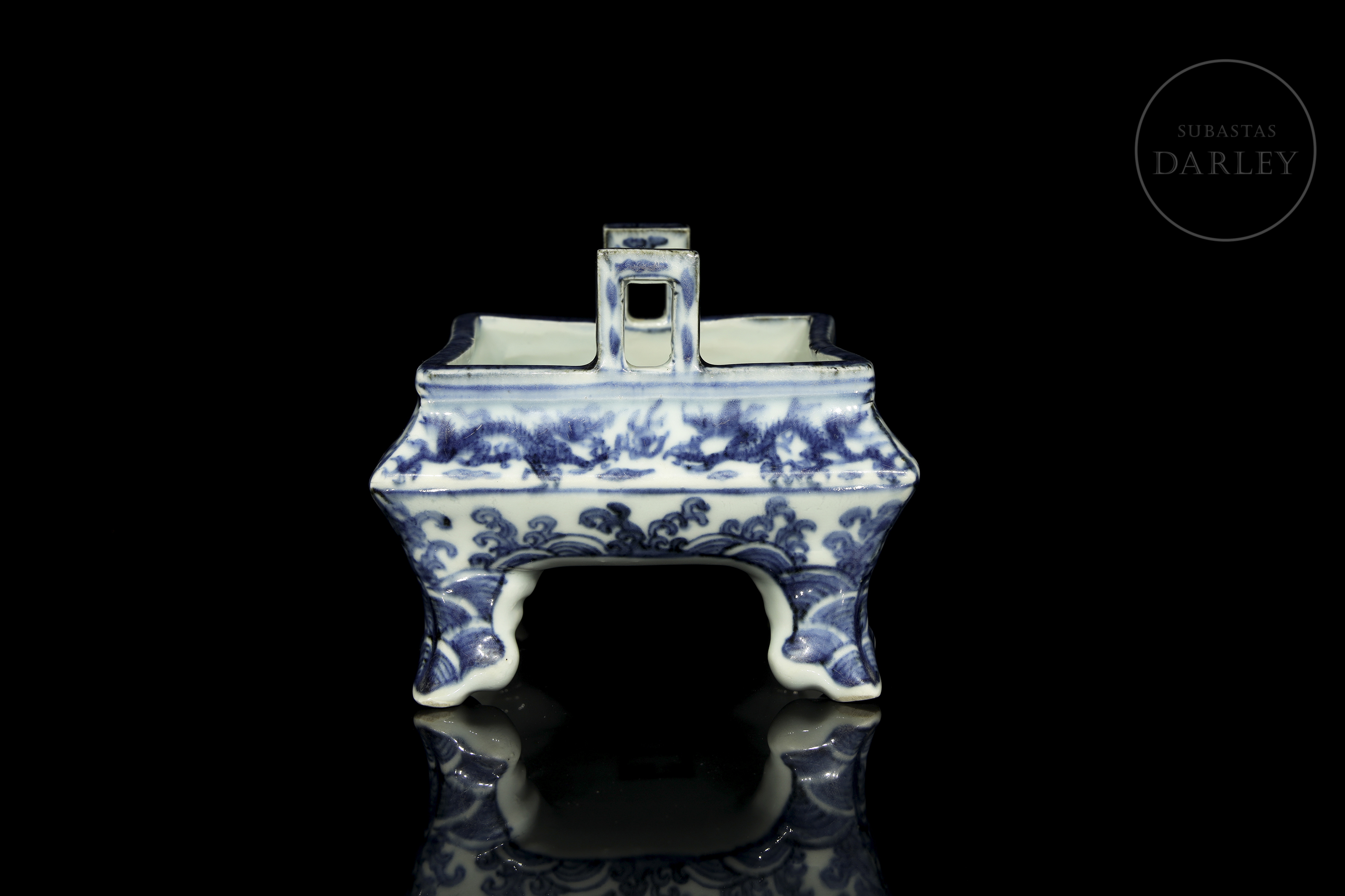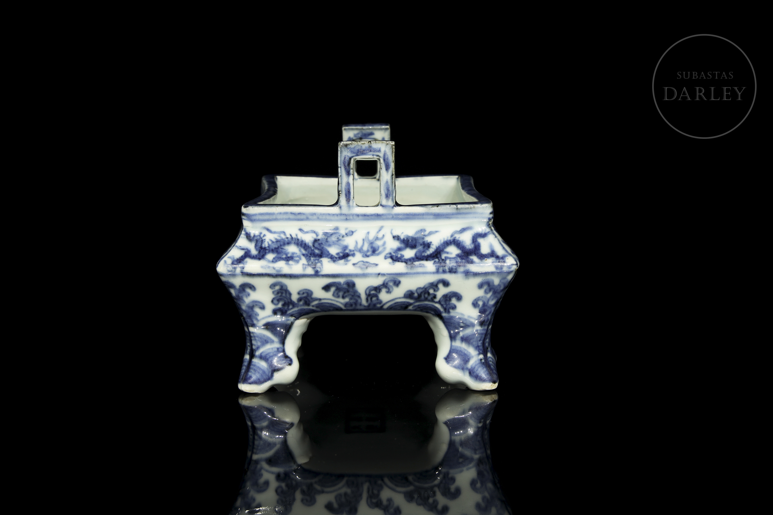 Porcelana esmaltada en azul cobalto sobre fondo blanco bajo vidriado. Posee una estructura rectangular de vientre abultado y esquinas suavizadas, que descansa sobre cuatro patas cortas lobuladas y sutilmente curvadas. El estrecho borde presenta dos asas rectangulares de interior hueco. La superficie está profusamente decorada con dragones imperiales que persiguen la perla flamígera entre nubes y llamas. La composición se adapta a las caras del recipiente. La base, presenta una marca de seis caracteres "大明万历年制".