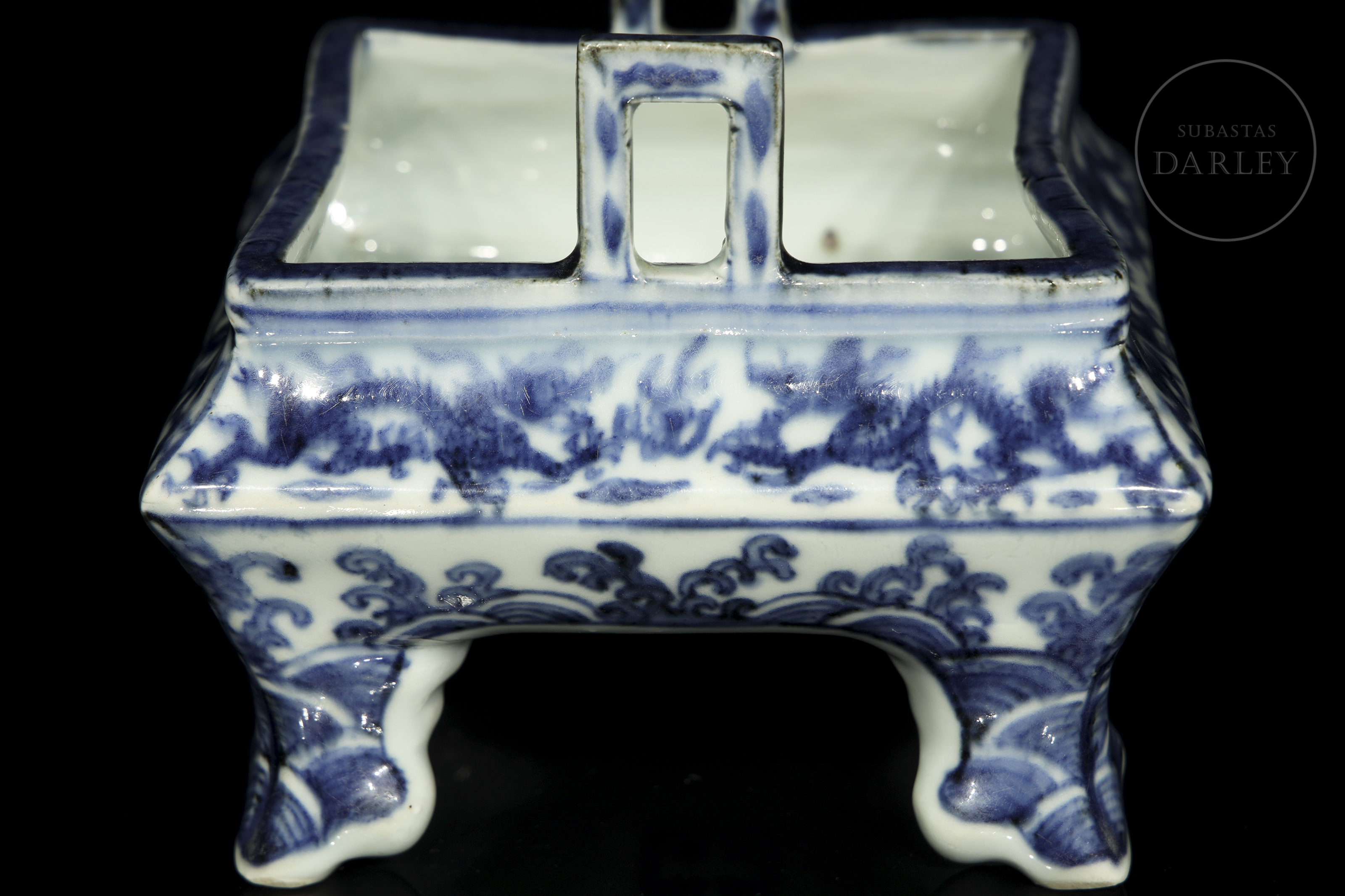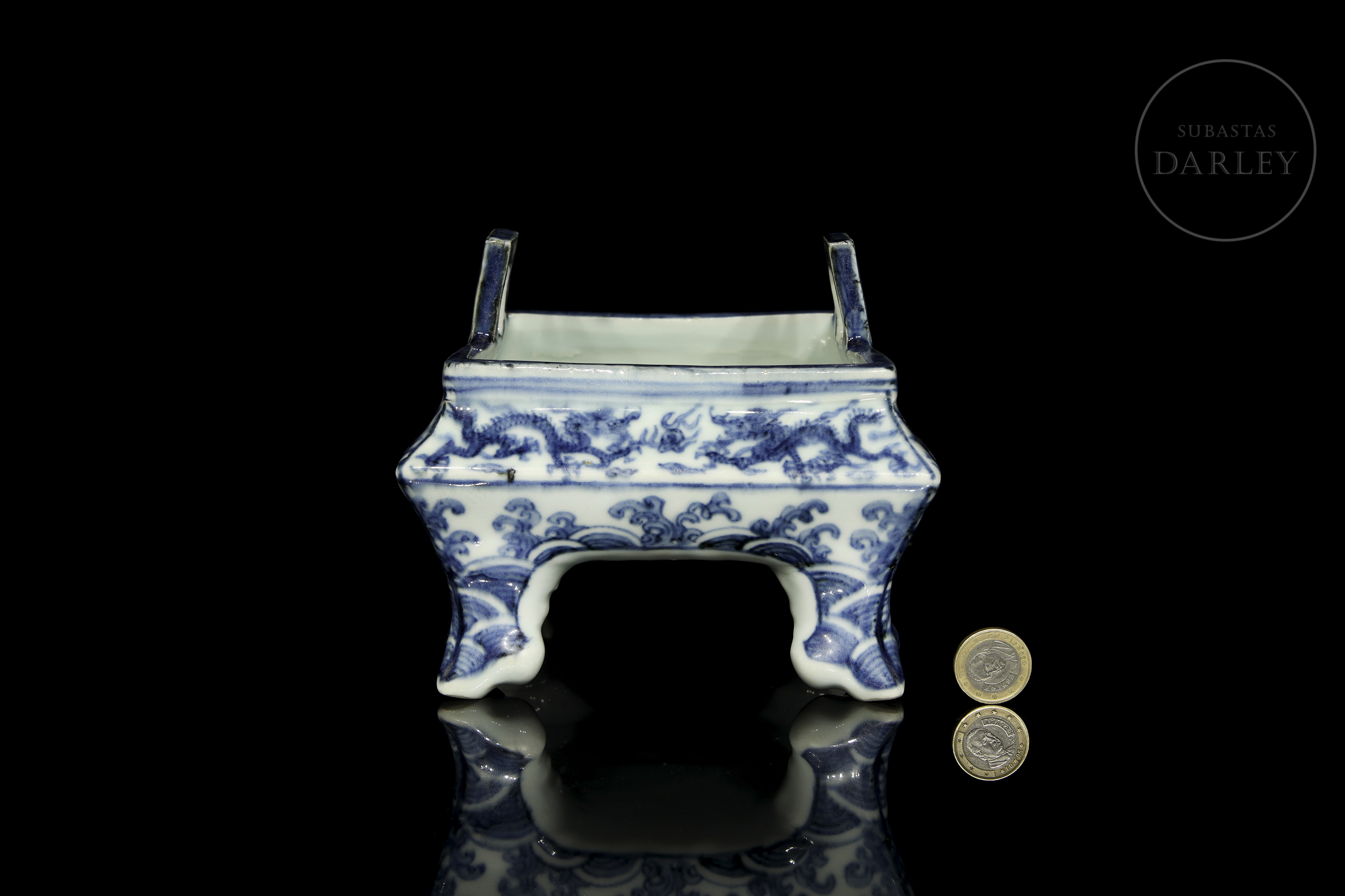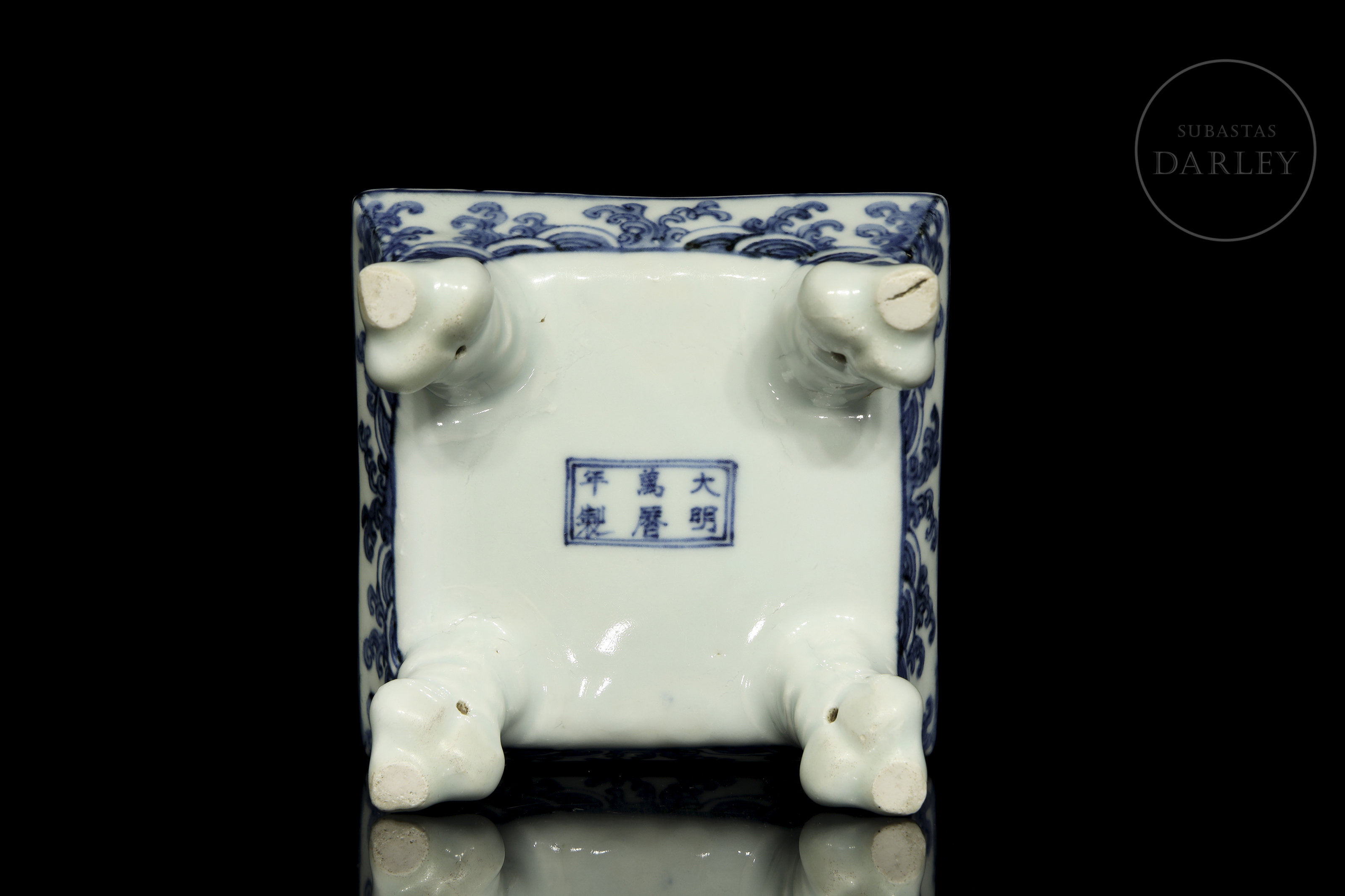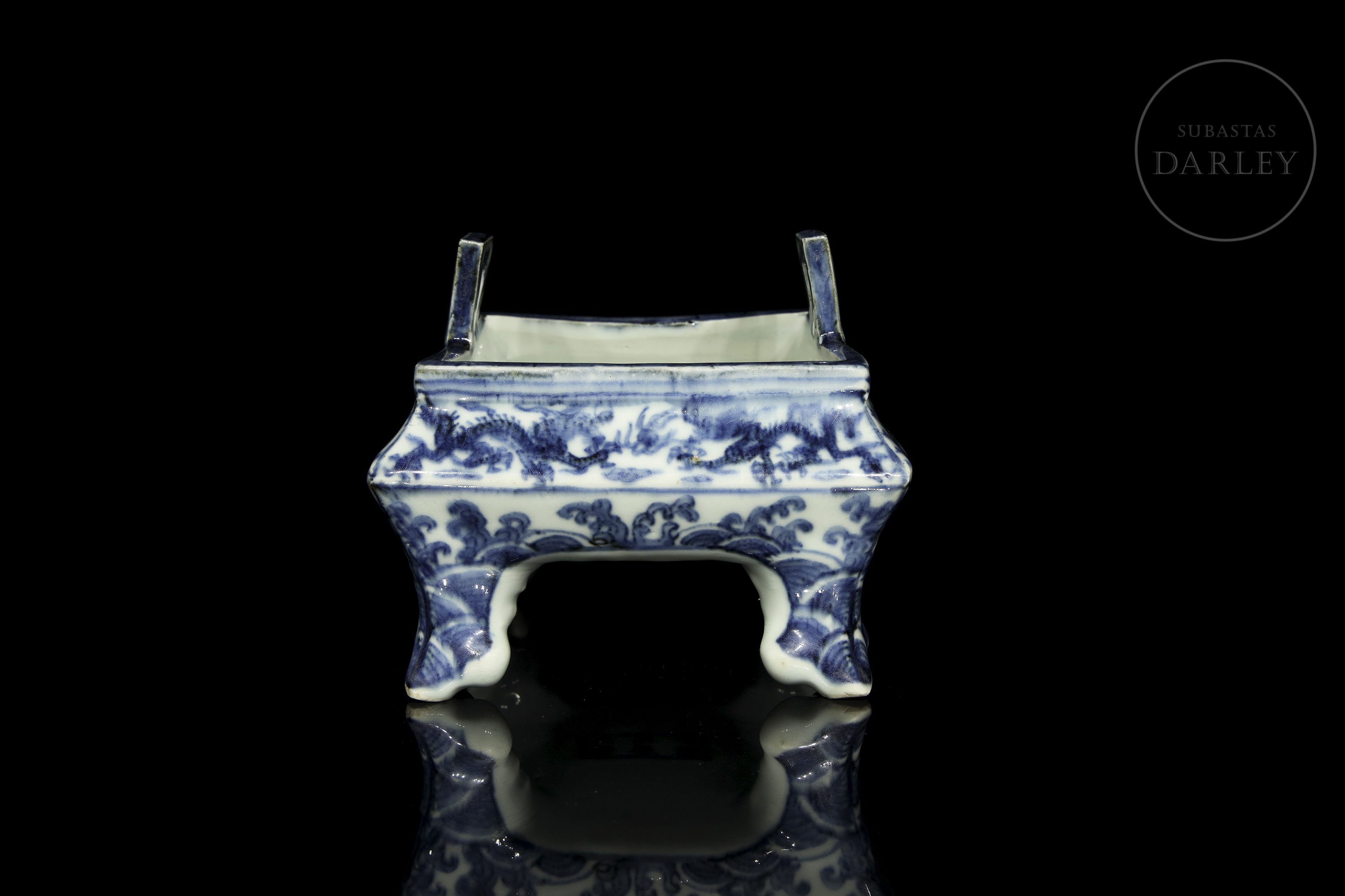 Porcelana esmaltada en azul cobalto sobre fondo blanco bajo vidriado. Posee una estructura rectangular de vientre abultado y esquinas suavizadas, que descansa sobre cuatro patas cortas lobuladas y sutilmente curvadas. El estrecho borde presenta dos asas rectangulares de interior hueco. La superficie está profusamente decorada con dragones imperiales que persiguen la perla flamígera entre nubes y llamas. La composición se adapta a las caras del recipiente. La base, presenta una marca de seis caracteres "大明万历年制".