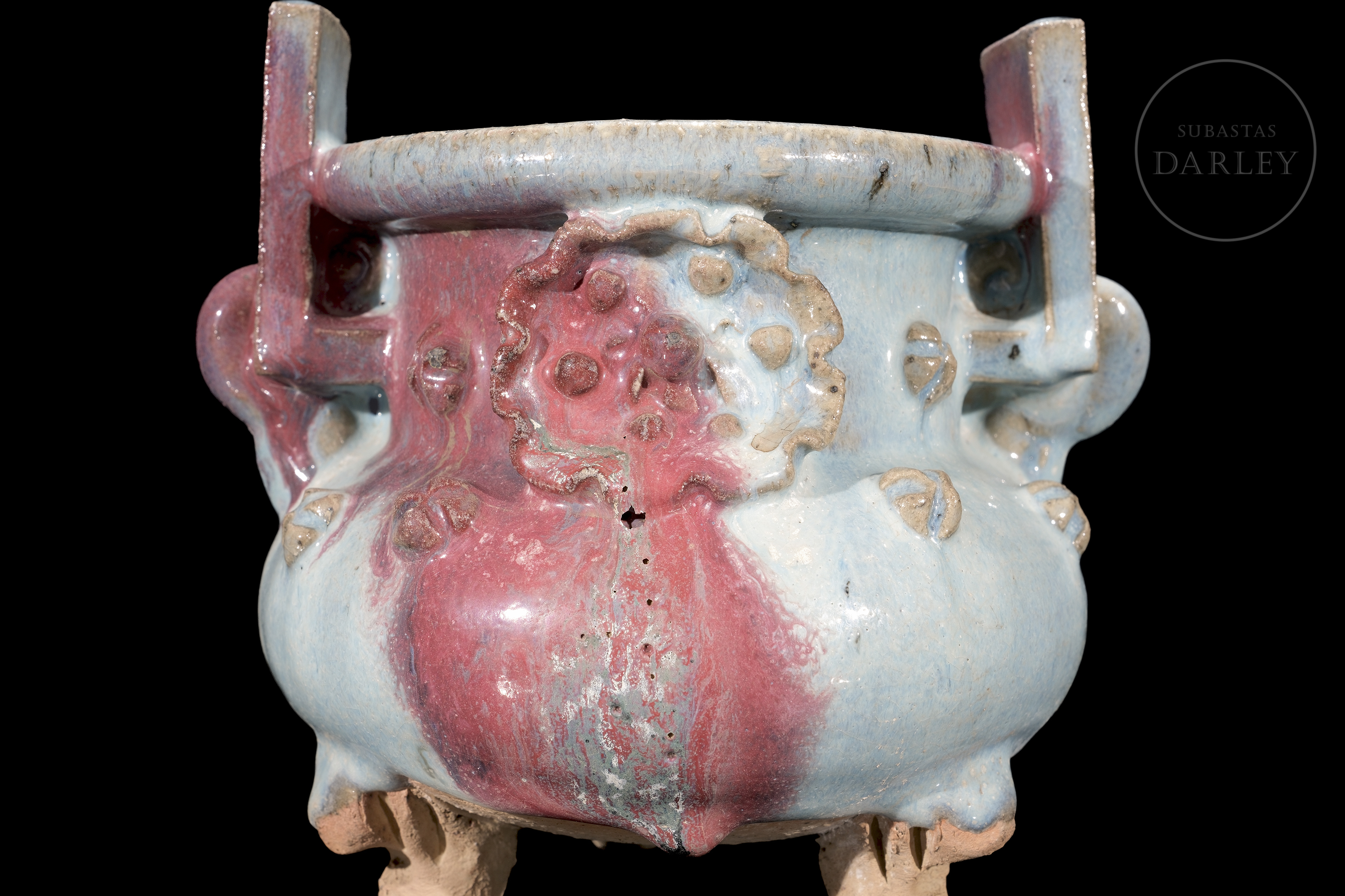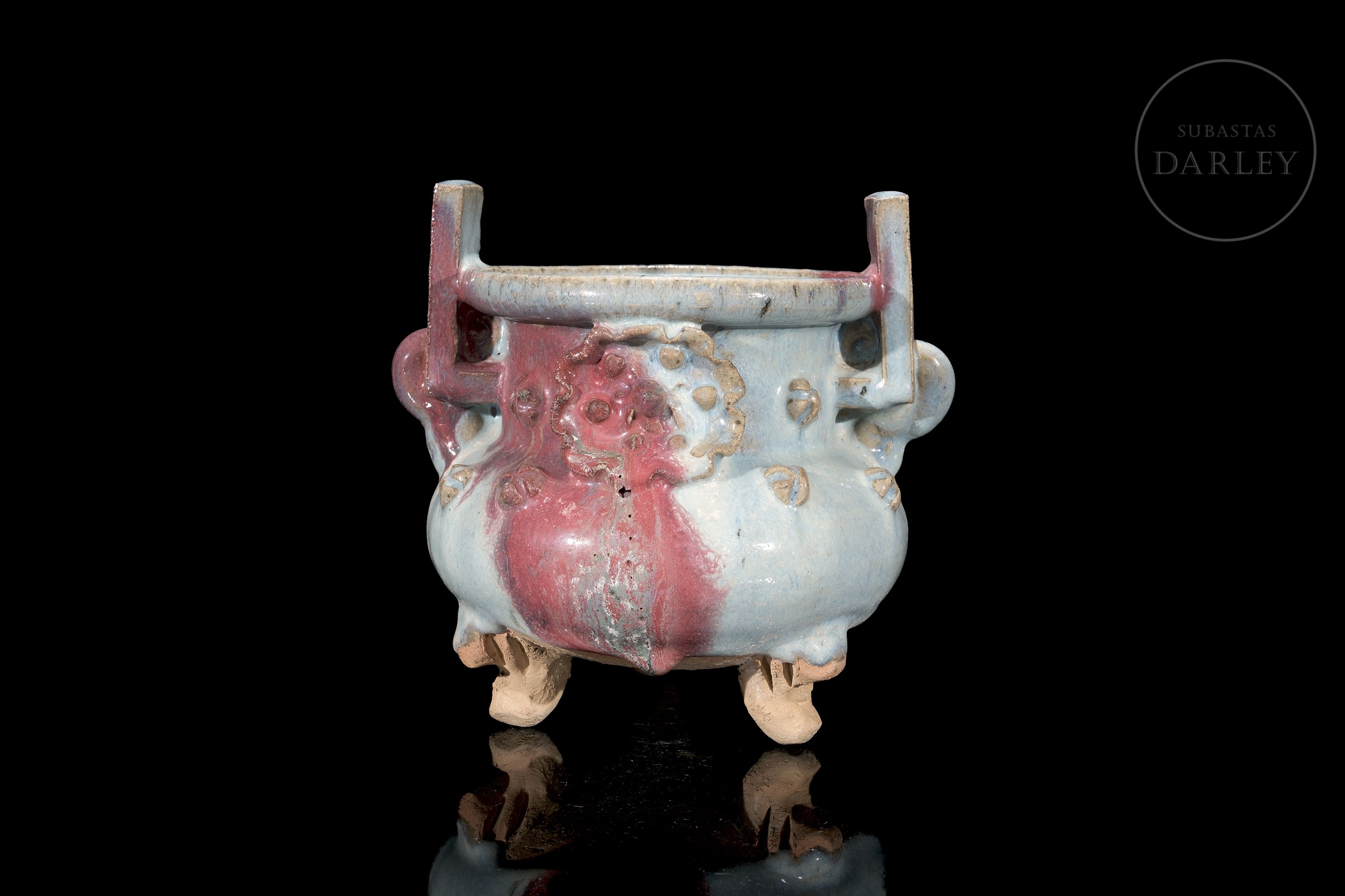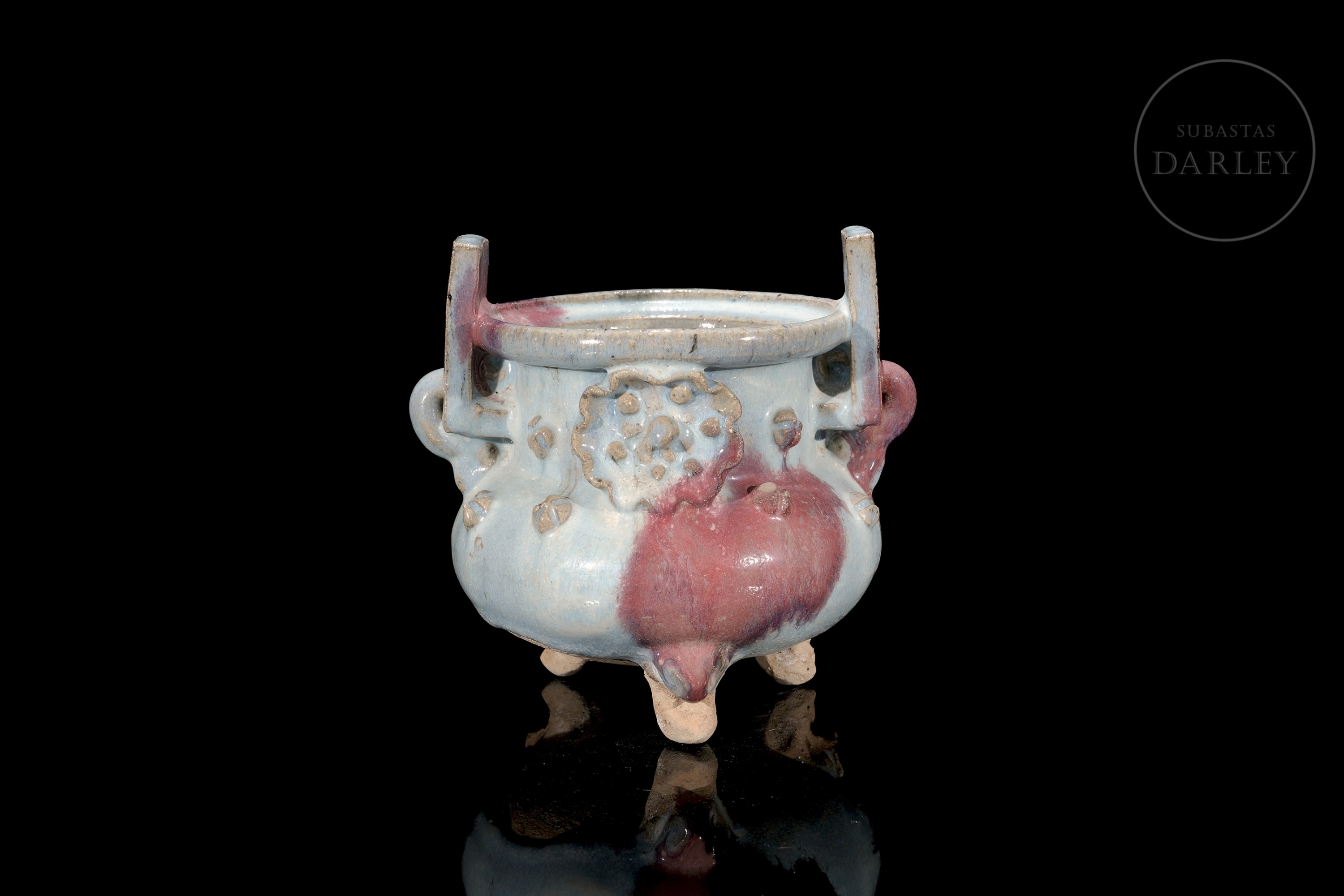 Incensario trípode de cerámica, con un cuerpo globular, cuello cilíndrico, dos asas rectangulares y tres patas cortas. La pieza está cubierta por un grueso esmalte de tipo Jun de fondo de color celeste opalescente, y grandes salpicaduras irregulares en tonos rojo y púrpura, y en su vientre se disponen pequeñas flores modeladas. La base se presenta sin esmaltar.