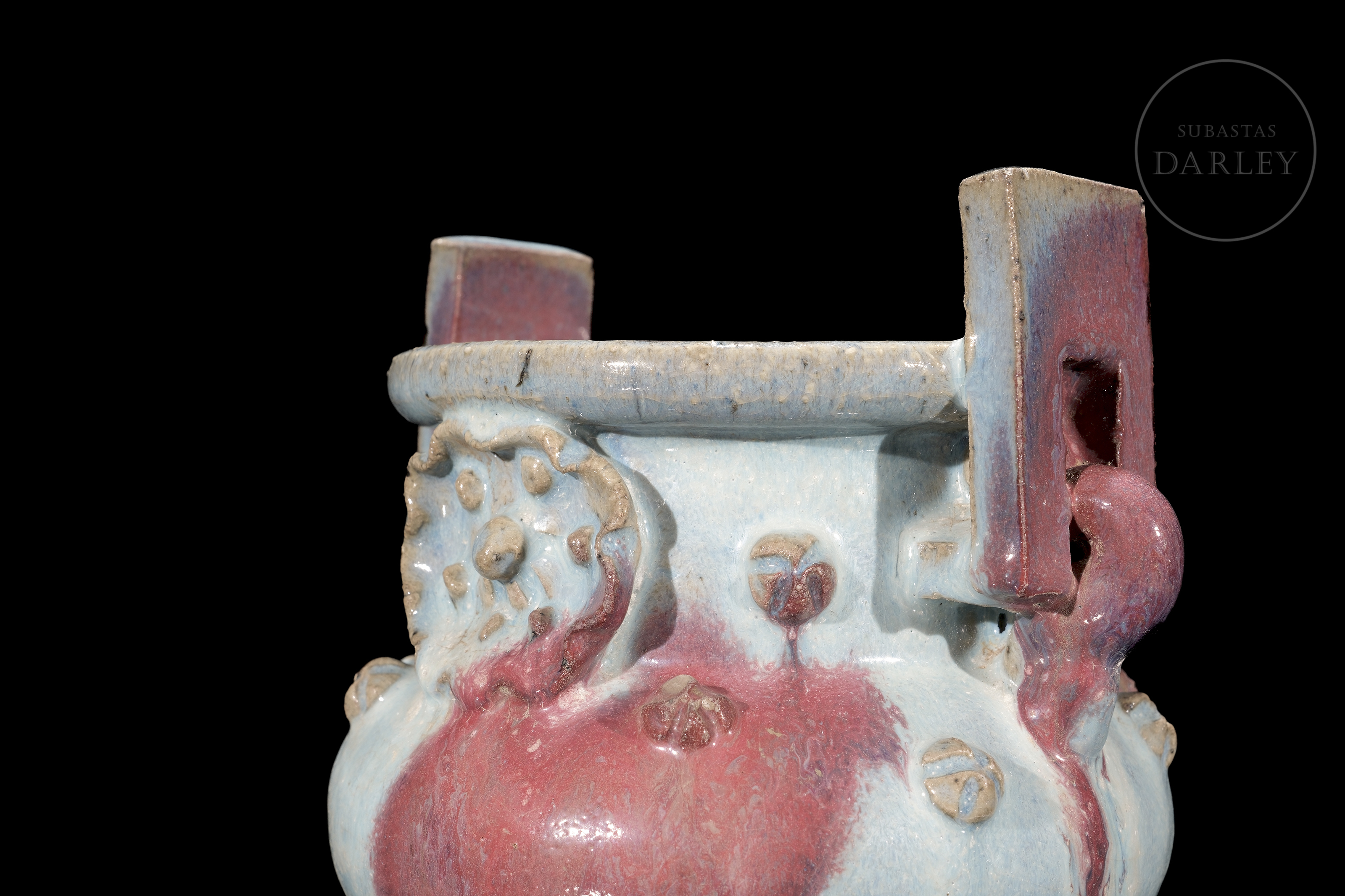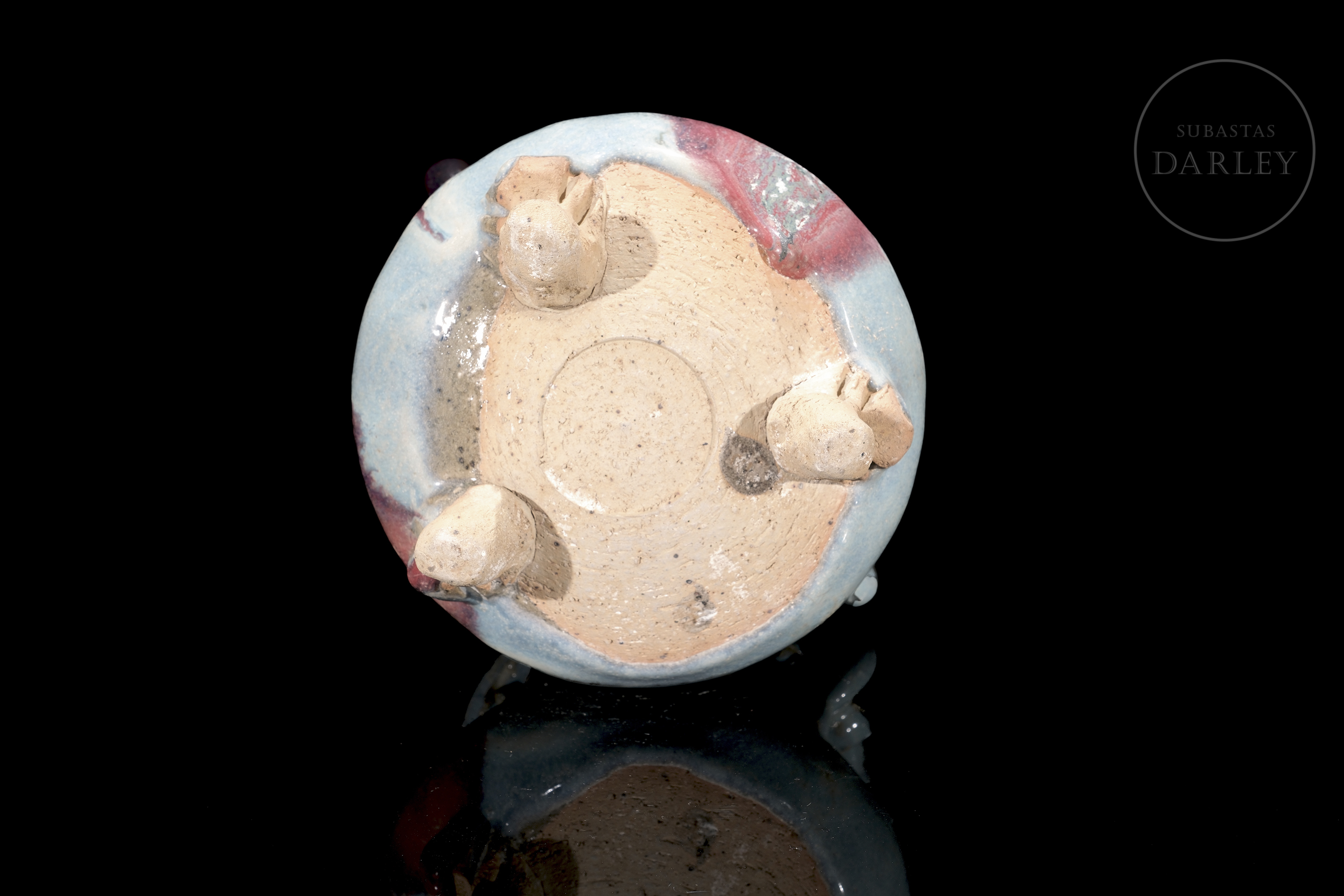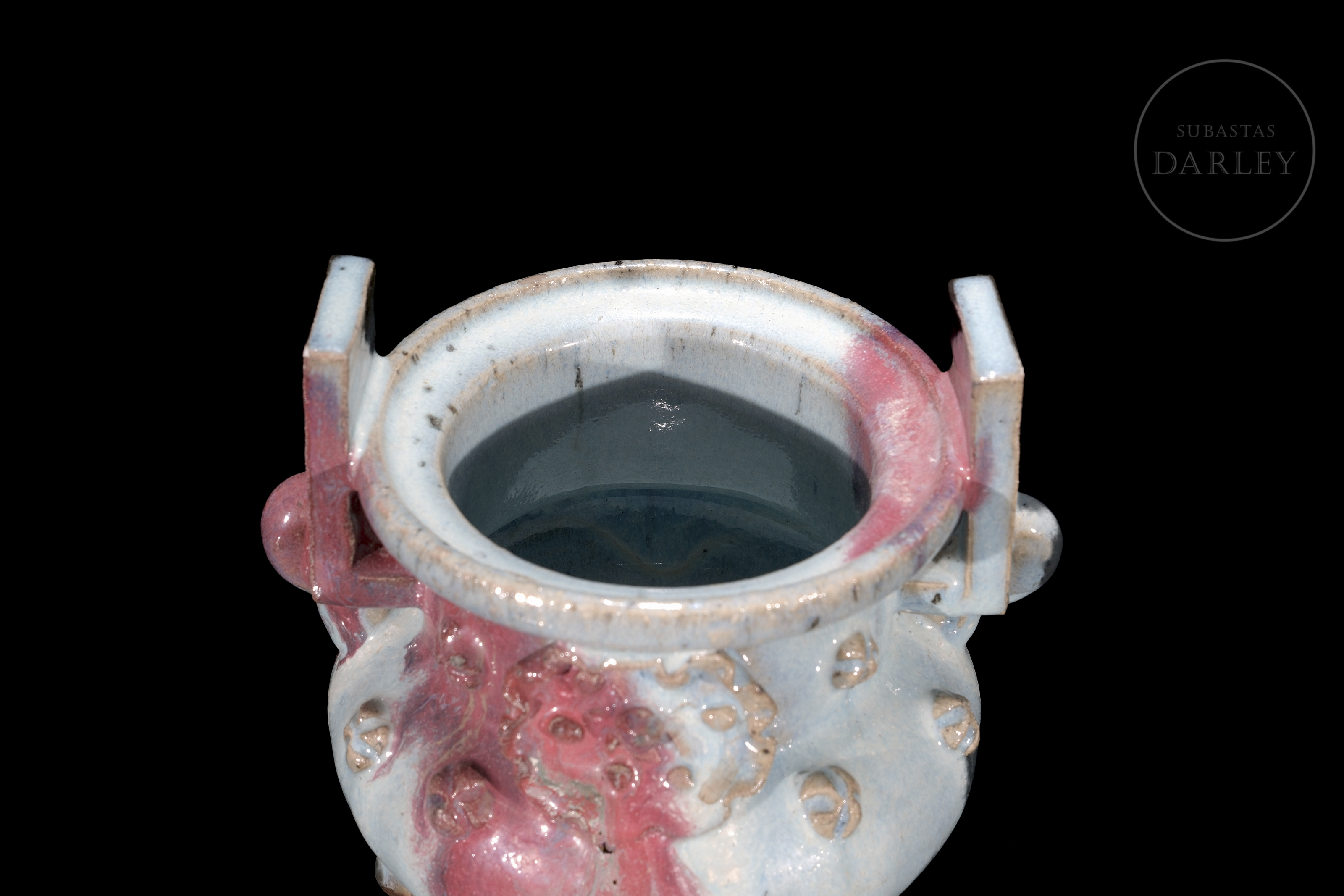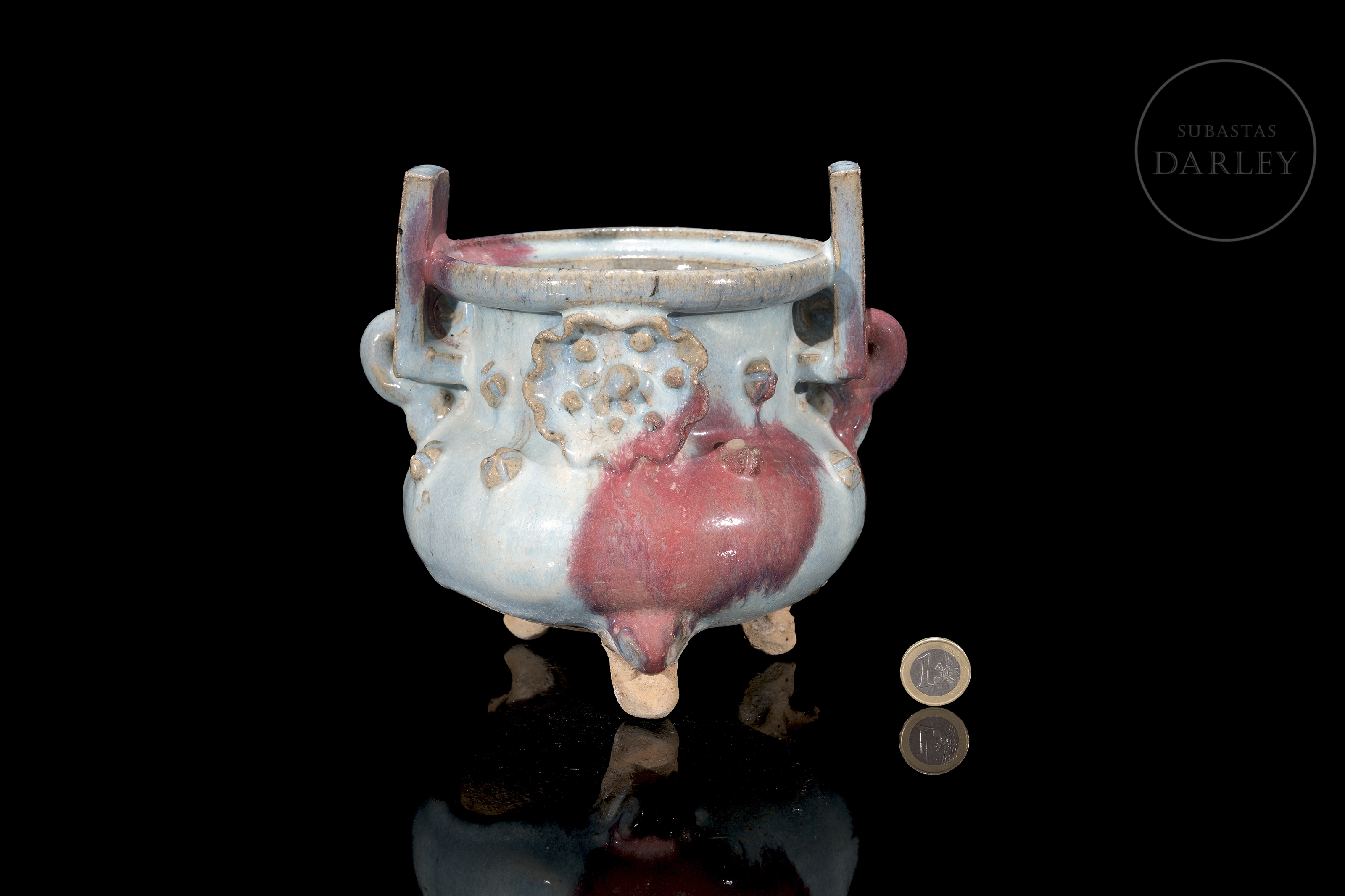 Incensario trípode de cerámica, con un cuerpo globular, cuello cilíndrico, dos asas rectangulares y tres patas cortas. La pieza está cubierta por un grueso esmalte de tipo Jun de fondo de color celeste opalescente, y grandes salpicaduras irregulares en tonos rojo y púrpura, y en su vientre se disponen pequeñas flores modeladas. La base se presenta sin esmaltar.