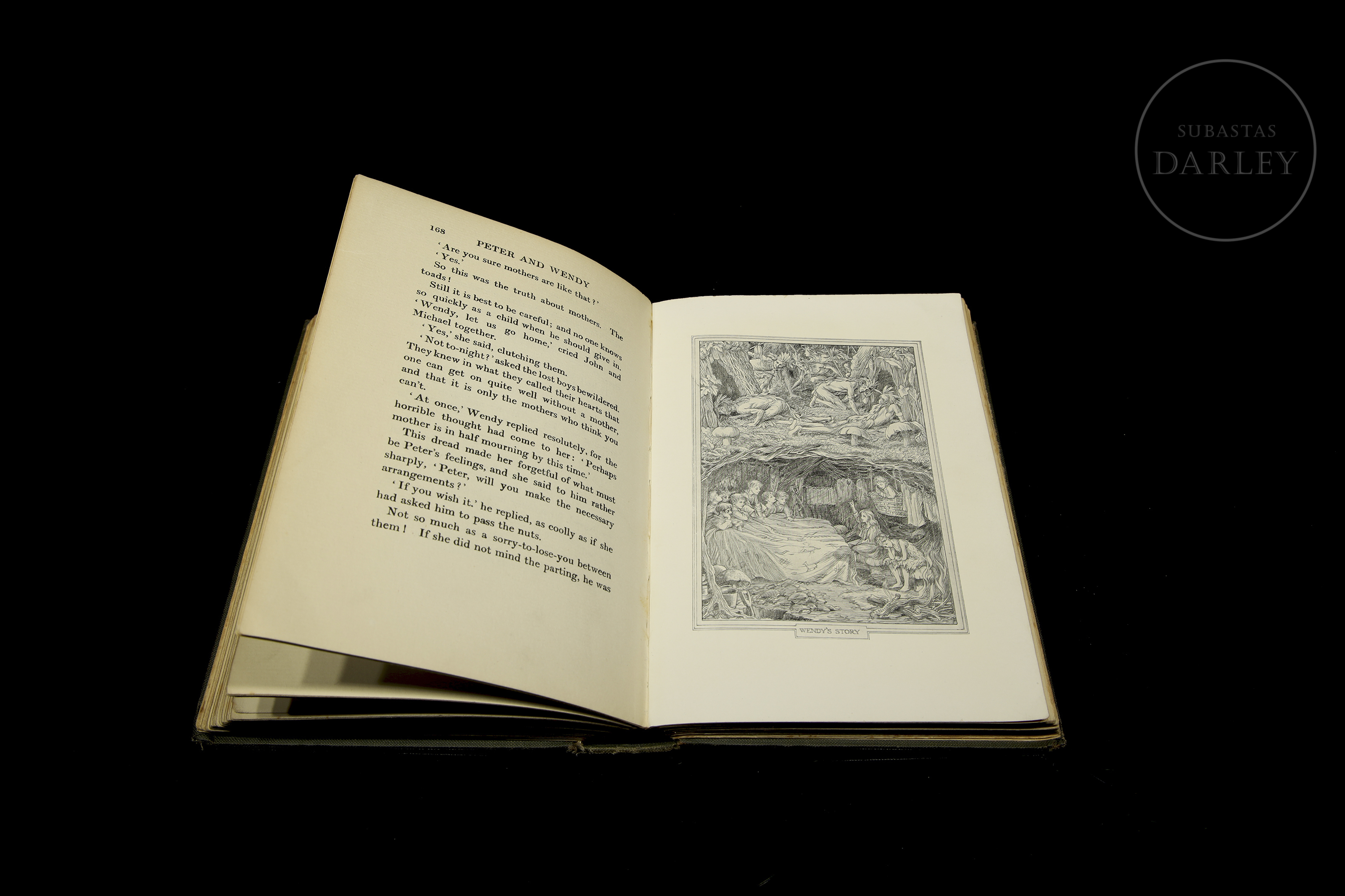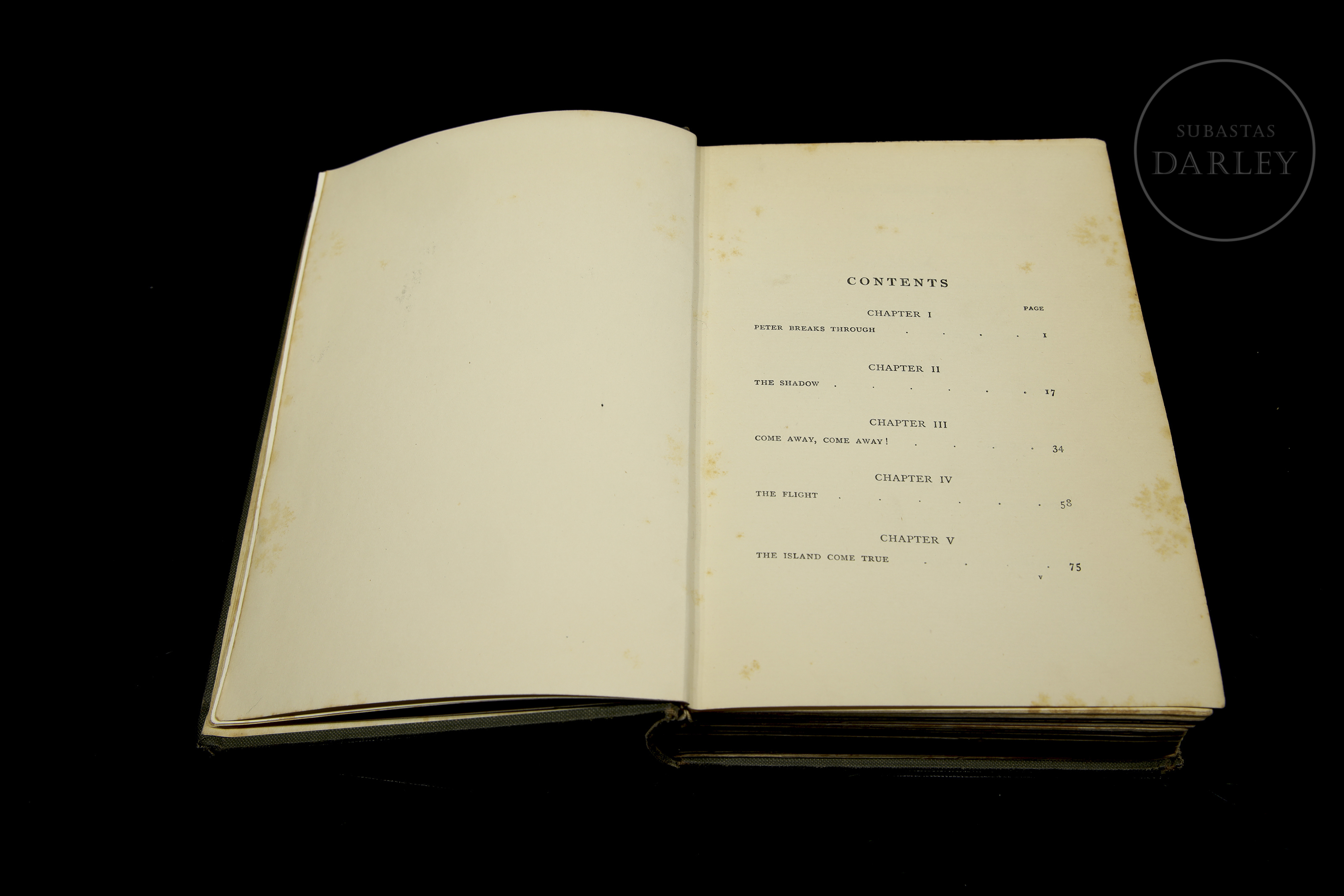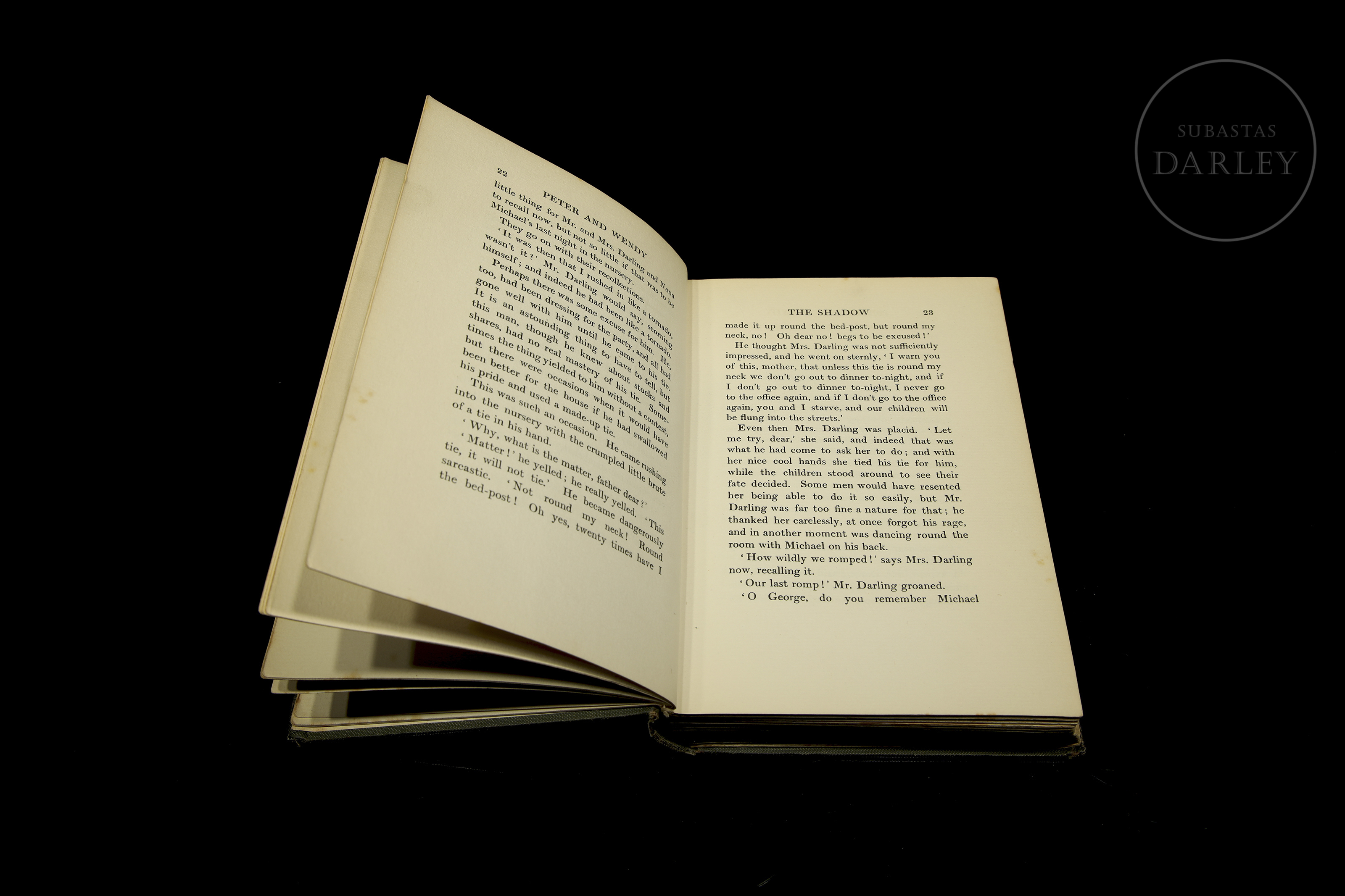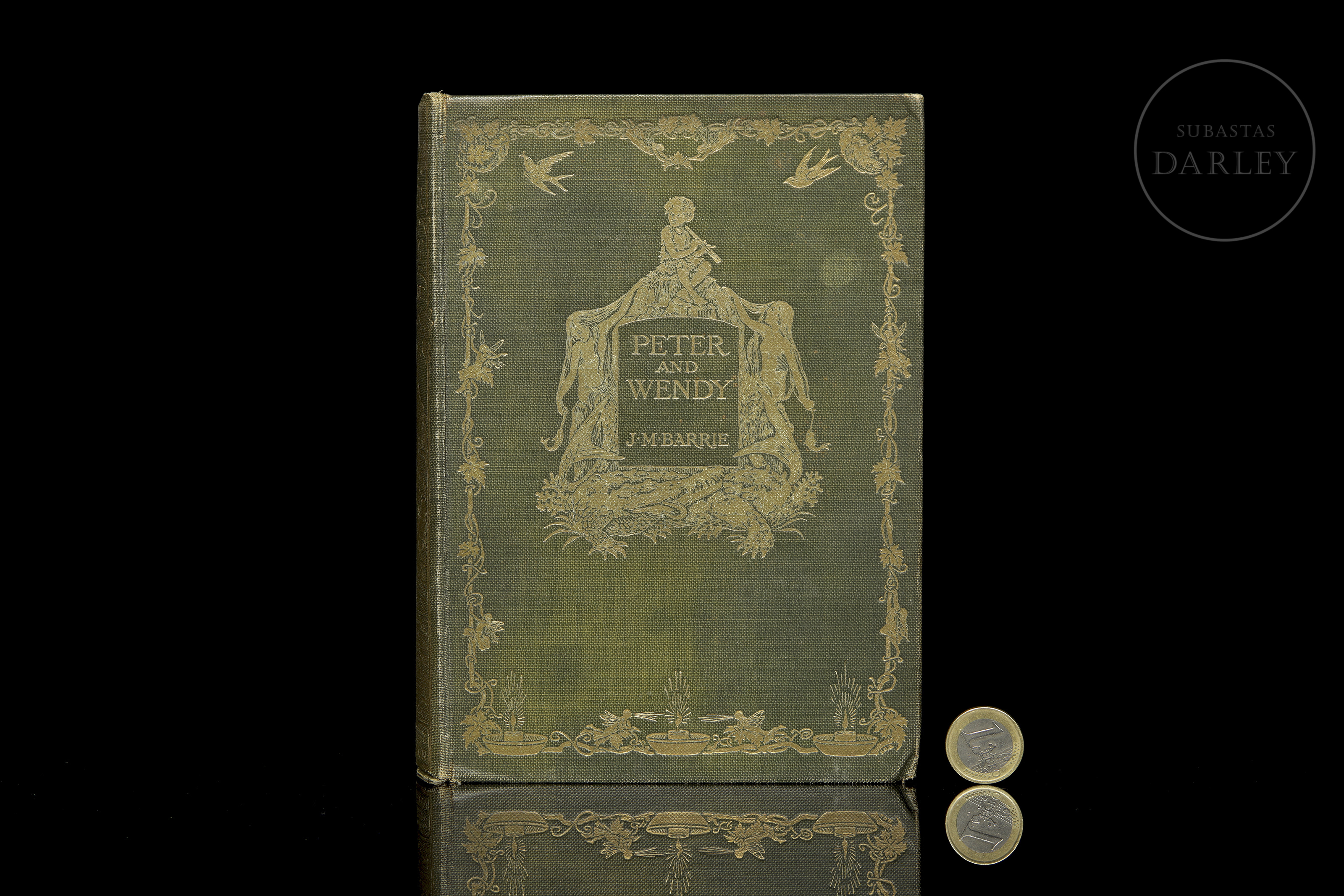 Ejemplar de la Primera Edición de la inmortal novela infantil Peter and Wendy del autor escocés J. M. Barrie. Publicado por Hodder & Stoughton, Londres, 1911, este volumen presenta una significativa encuadernación de tela verde oliva con una profusa decoración de grabado dorado. El libro está ilustrado por F. D. Bedford, cuyas planchas a blanco y negro complementan la narrativa. Impresión realizada por T. and A. Constable en la Imprenta de la Universidad de Edimburgo. Se aprecia en el reverso una etiqueta del "The Times (Book Club) / LONDON" y anotaciones manuscritas, documentando su procedencia.