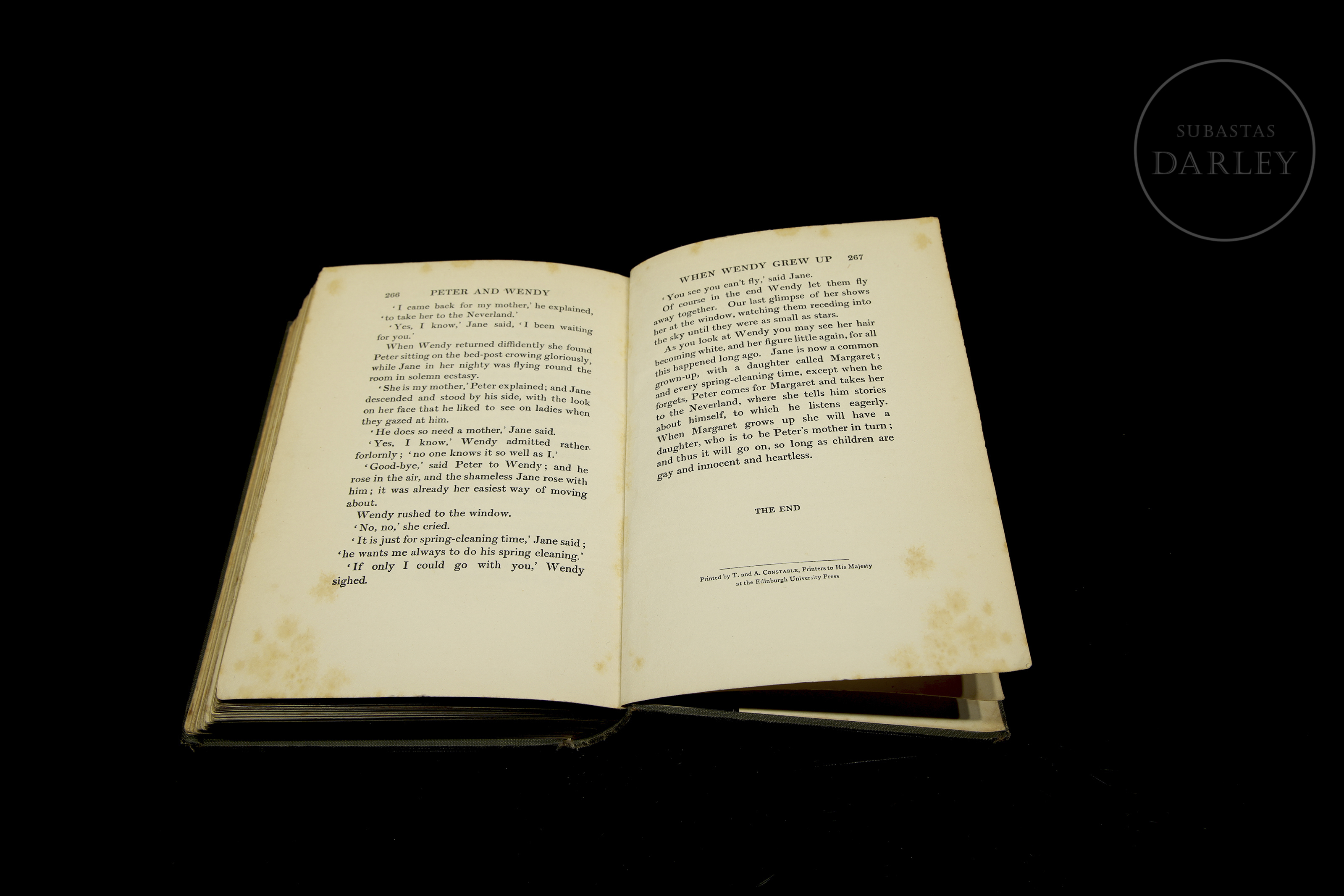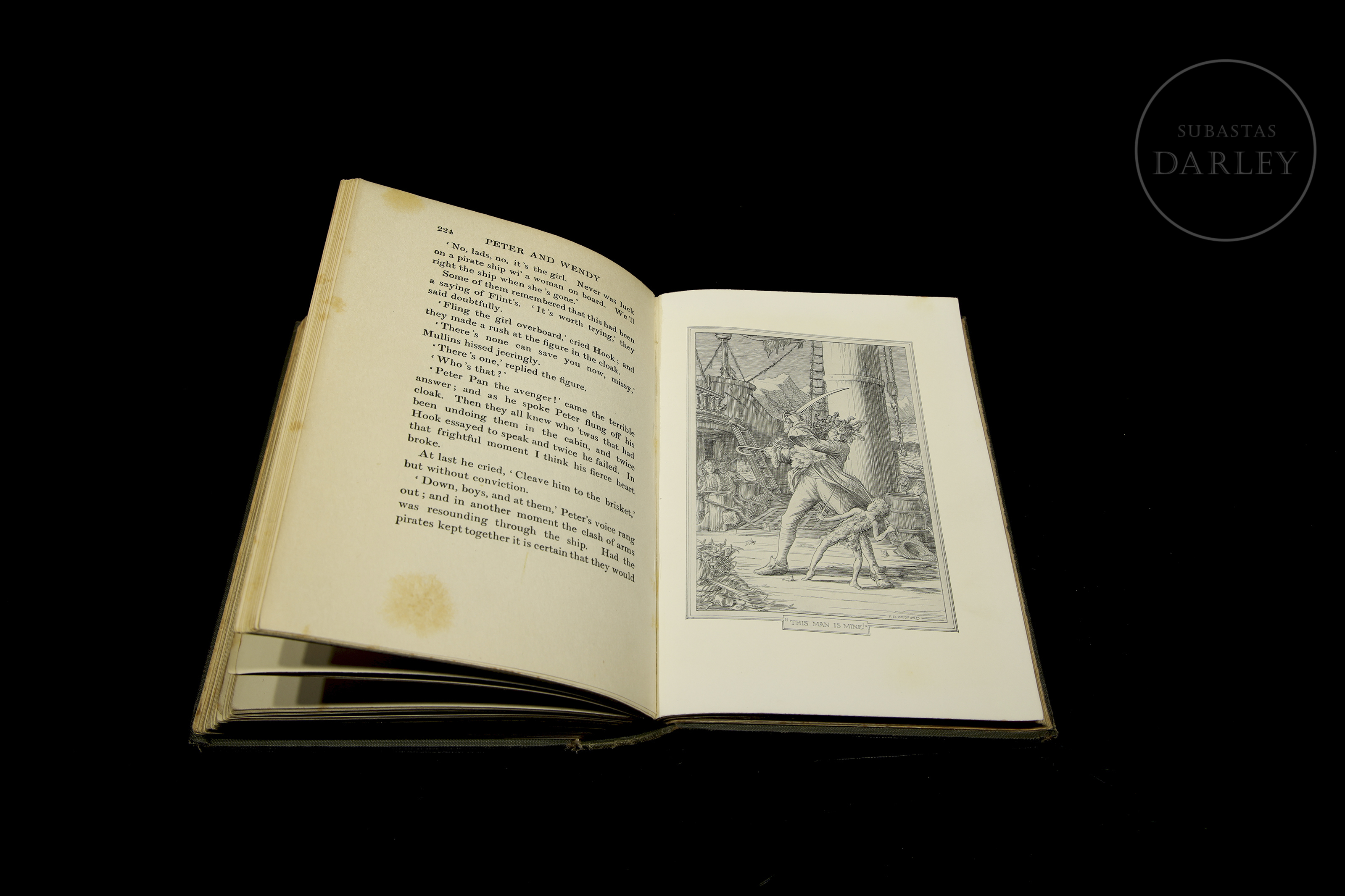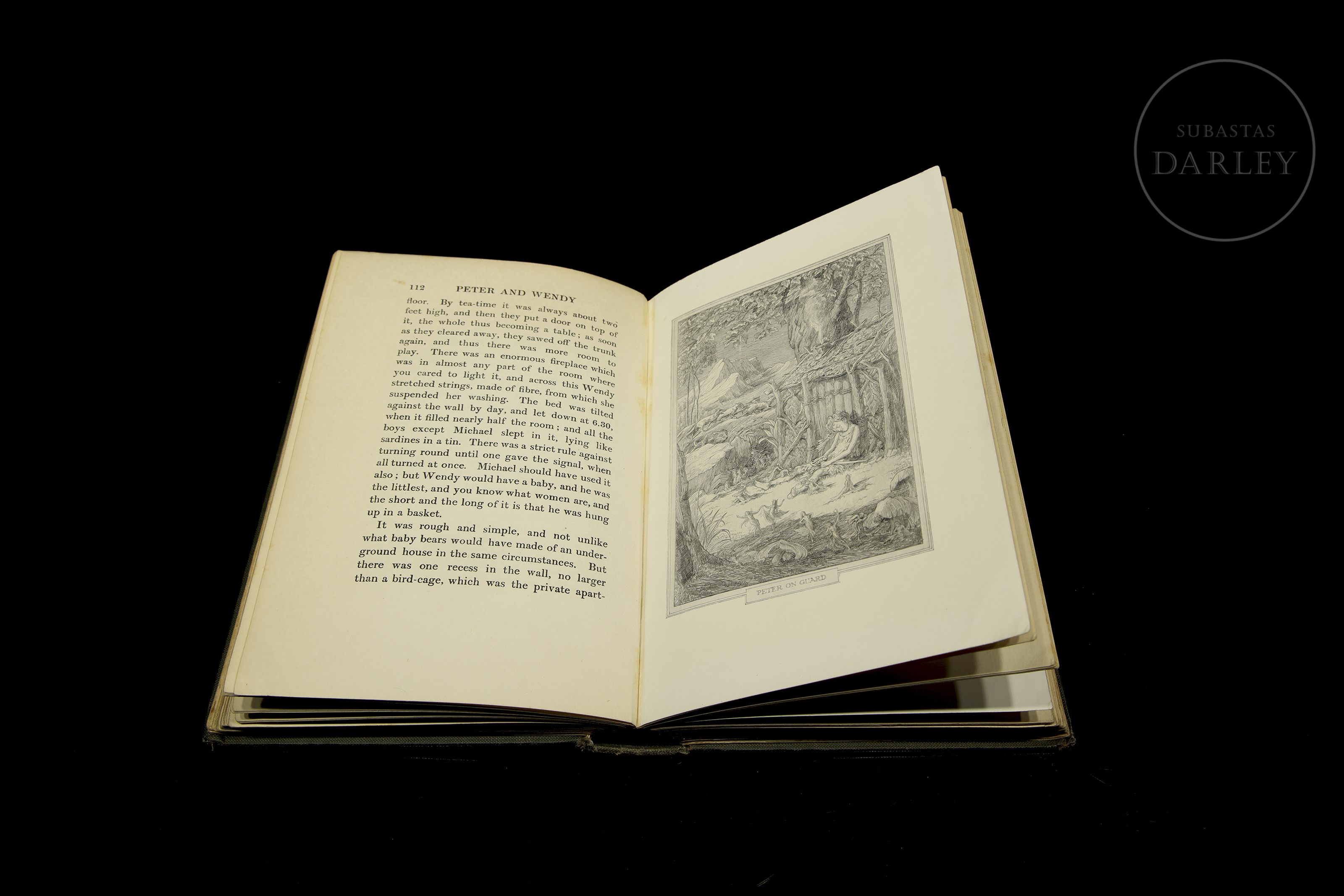 Ejemplar de la Primera Edición de la inmortal novela infantil Peter and Wendy del autor escocés J. M. Barrie. Publicado por Hodder & Stoughton, Londres, 1911, este volumen presenta una significativa encuadernación de tela verde oliva con una profusa decoración de grabado dorado. El libro está ilustrado por F. D. Bedford, cuyas planchas a blanco y negro complementan la narrativa. Impresión realizada por T. and A. Constable en la Imprenta de la Universidad de Edimburgo. Se aprecia en el reverso una etiqueta del "The Times (Book Club) / LONDON" y anotaciones manuscritas, documentando su procedencia.