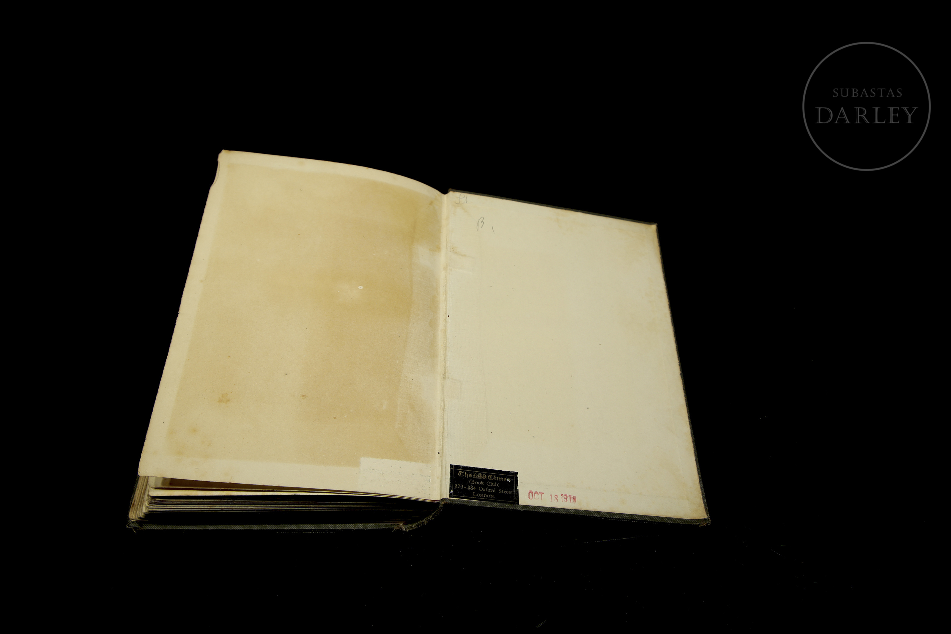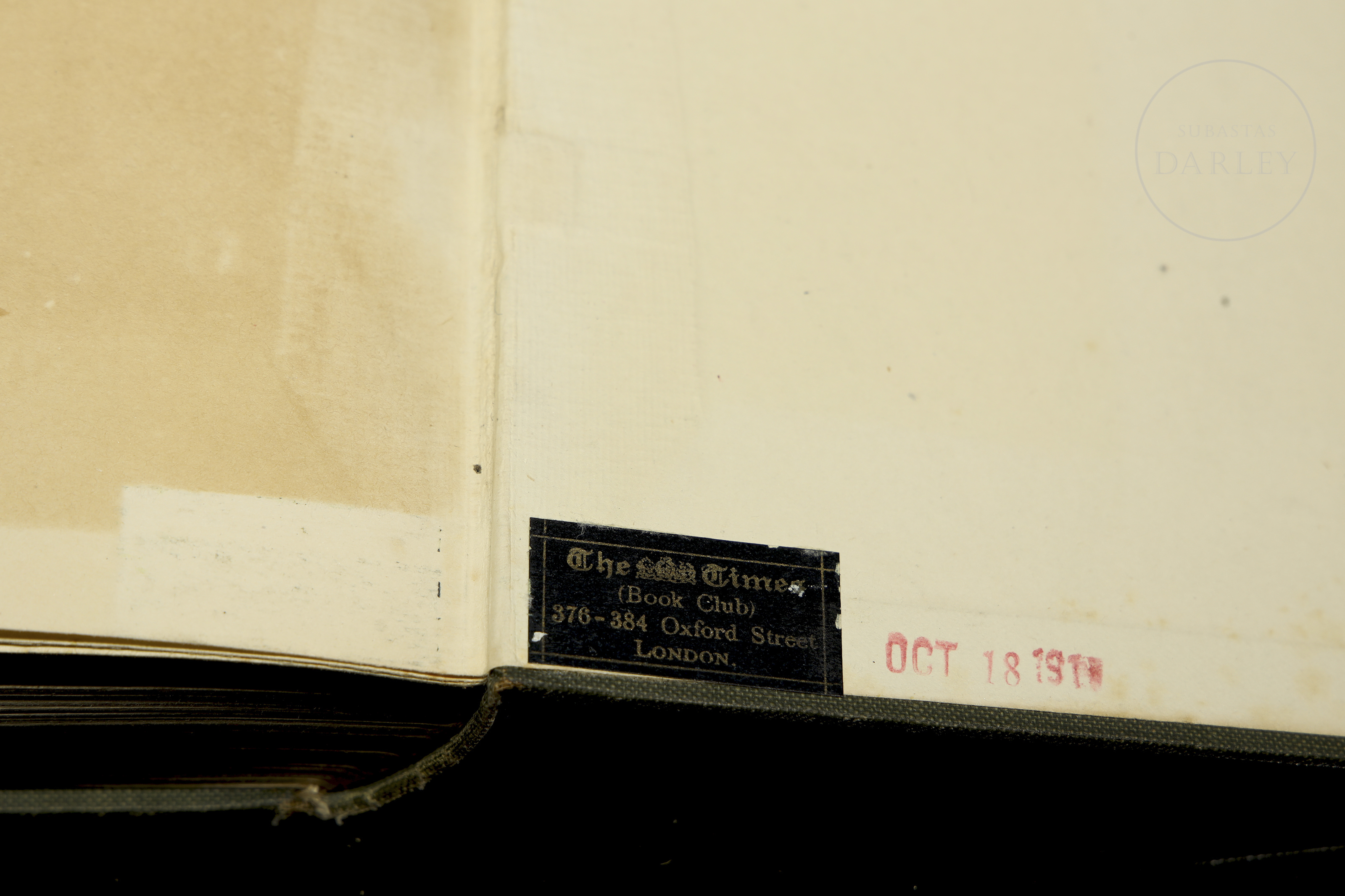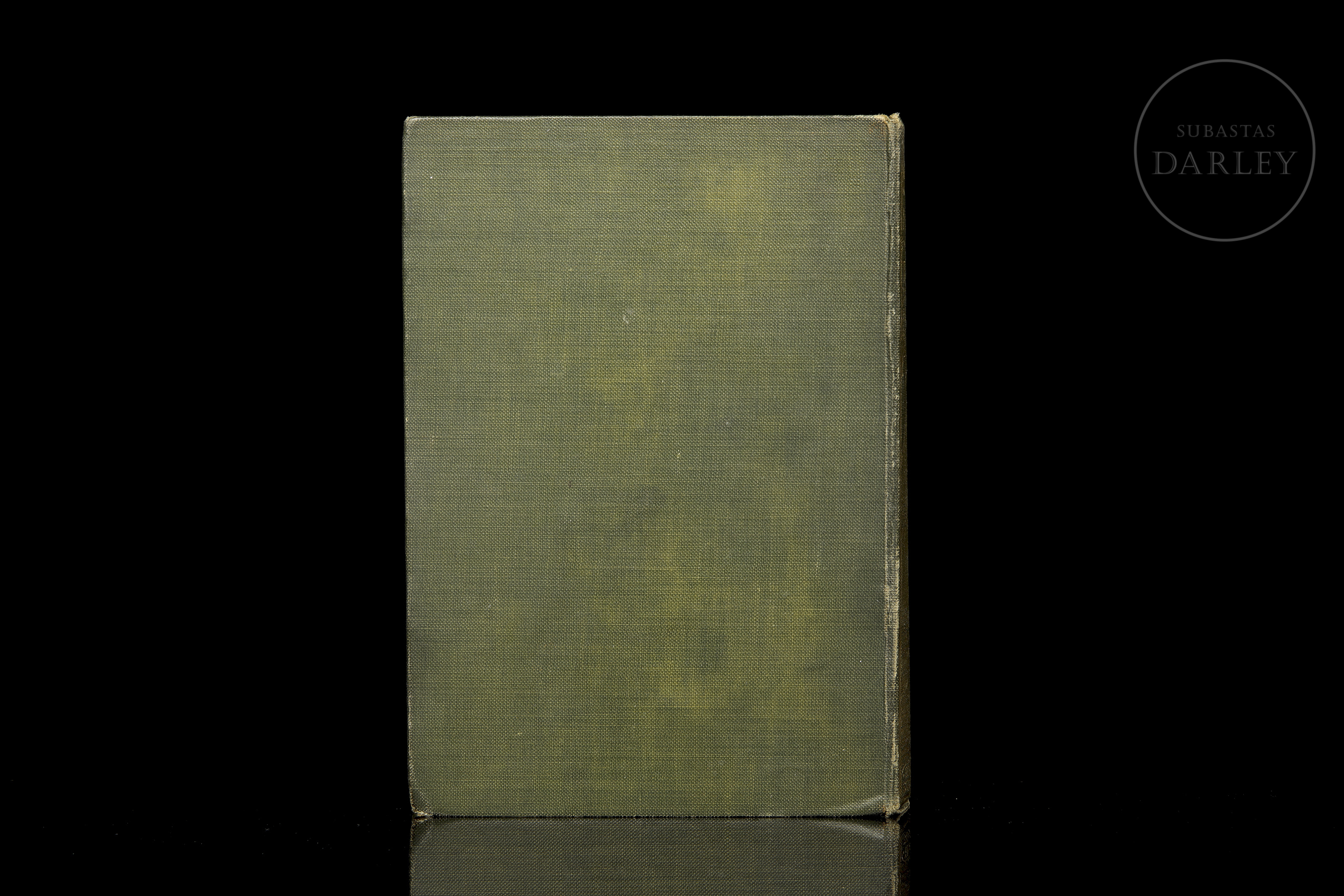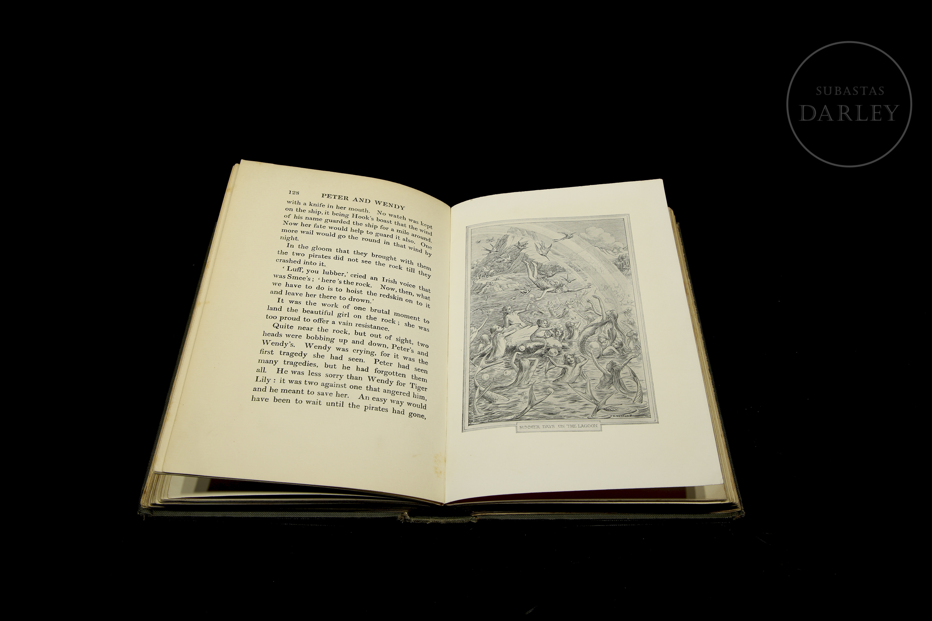 Ejemplar de la Primera Edición de la inmortal novela infantil Peter and Wendy del autor escocés J. M. Barrie. Publicado por Hodder & Stoughton, Londres, 1911, este volumen presenta una significativa encuadernación de tela verde oliva con una profusa decoración de grabado dorado. El libro está ilustrado por F. D. Bedford, cuyas planchas a blanco y negro complementan la narrativa. Impresión realizada por T. and A. Constable en la Imprenta de la Universidad de Edimburgo. Se aprecia en el reverso una etiqueta del "The Times (Book Club) / LONDON" y anotaciones manuscritas, documentando su procedencia.