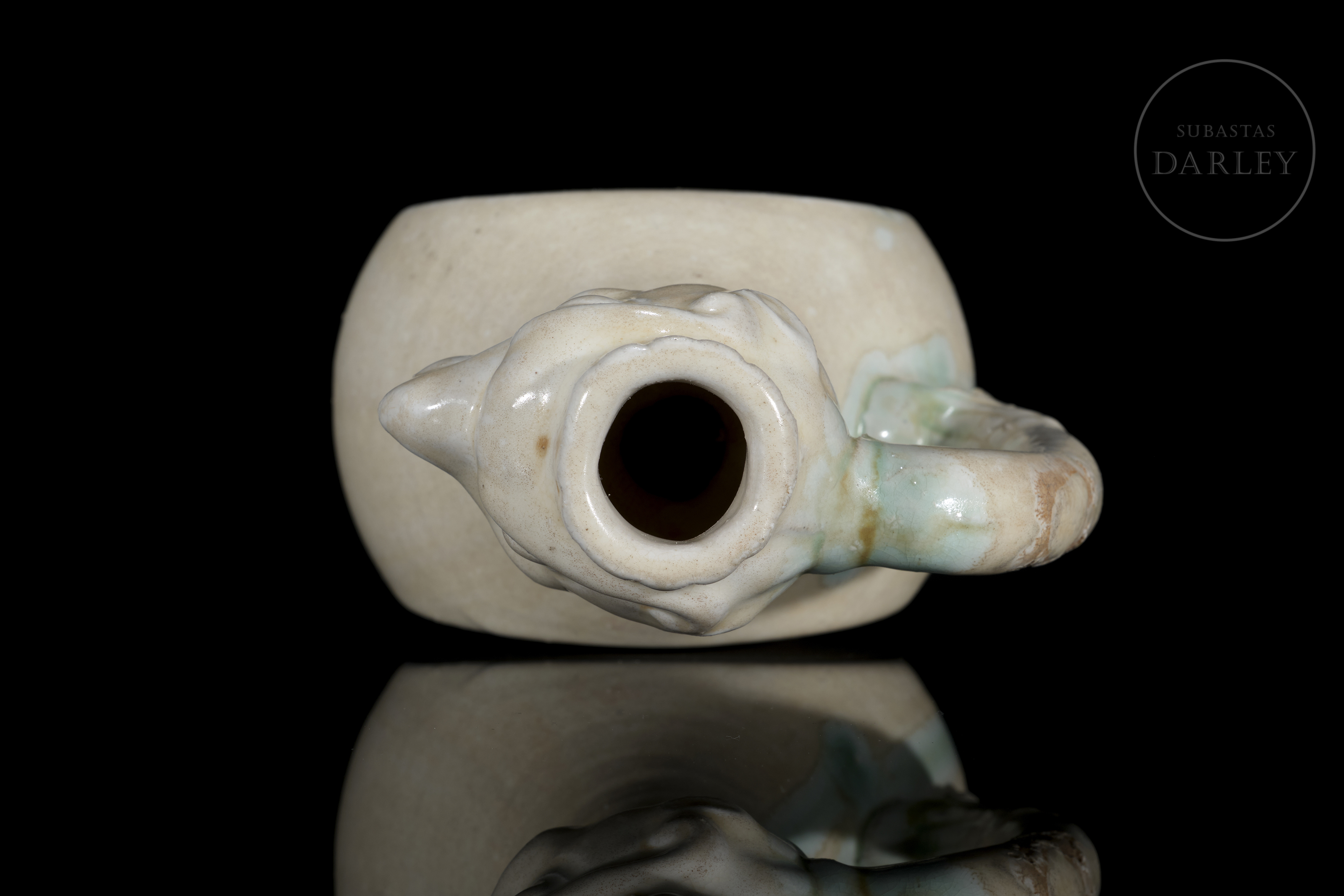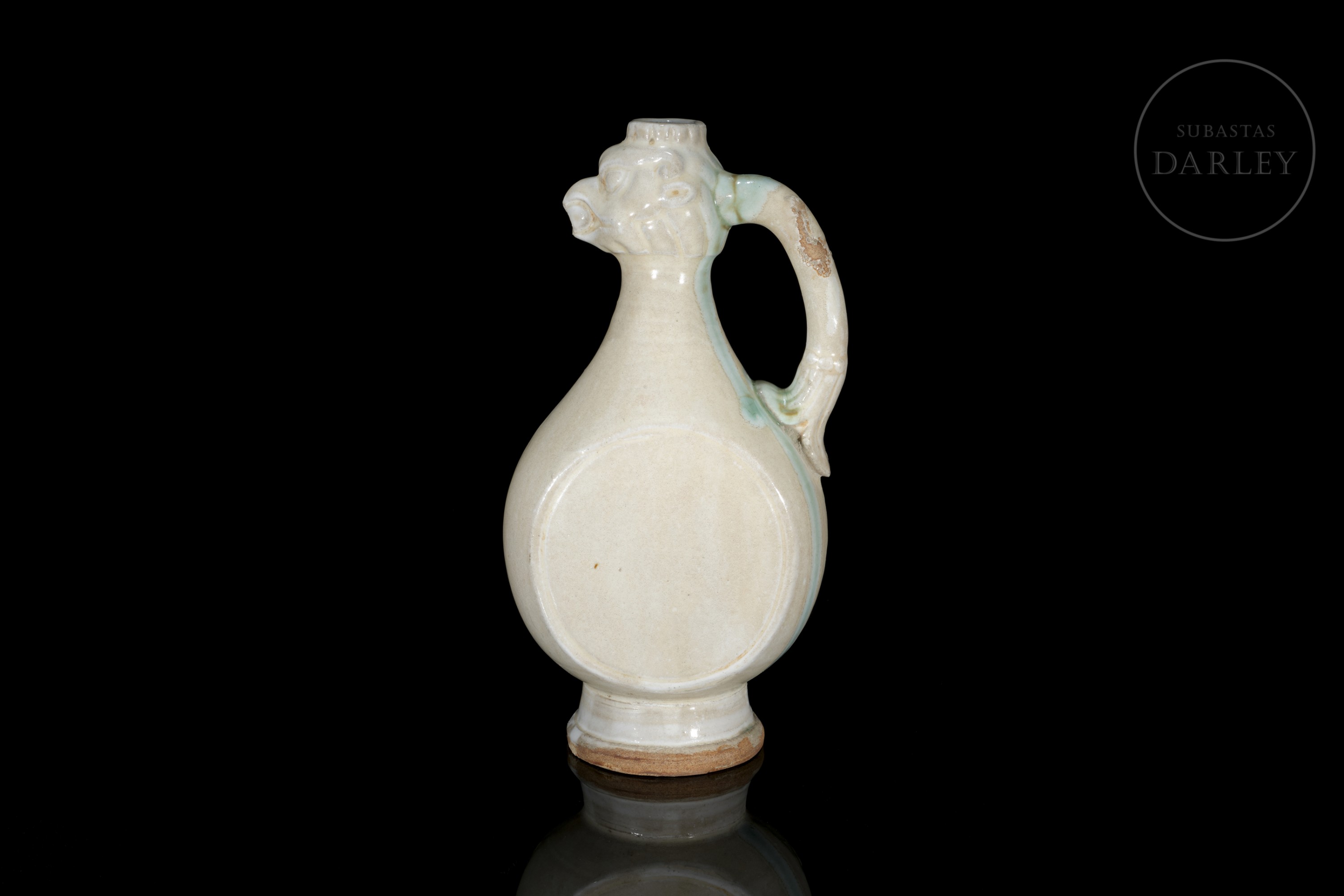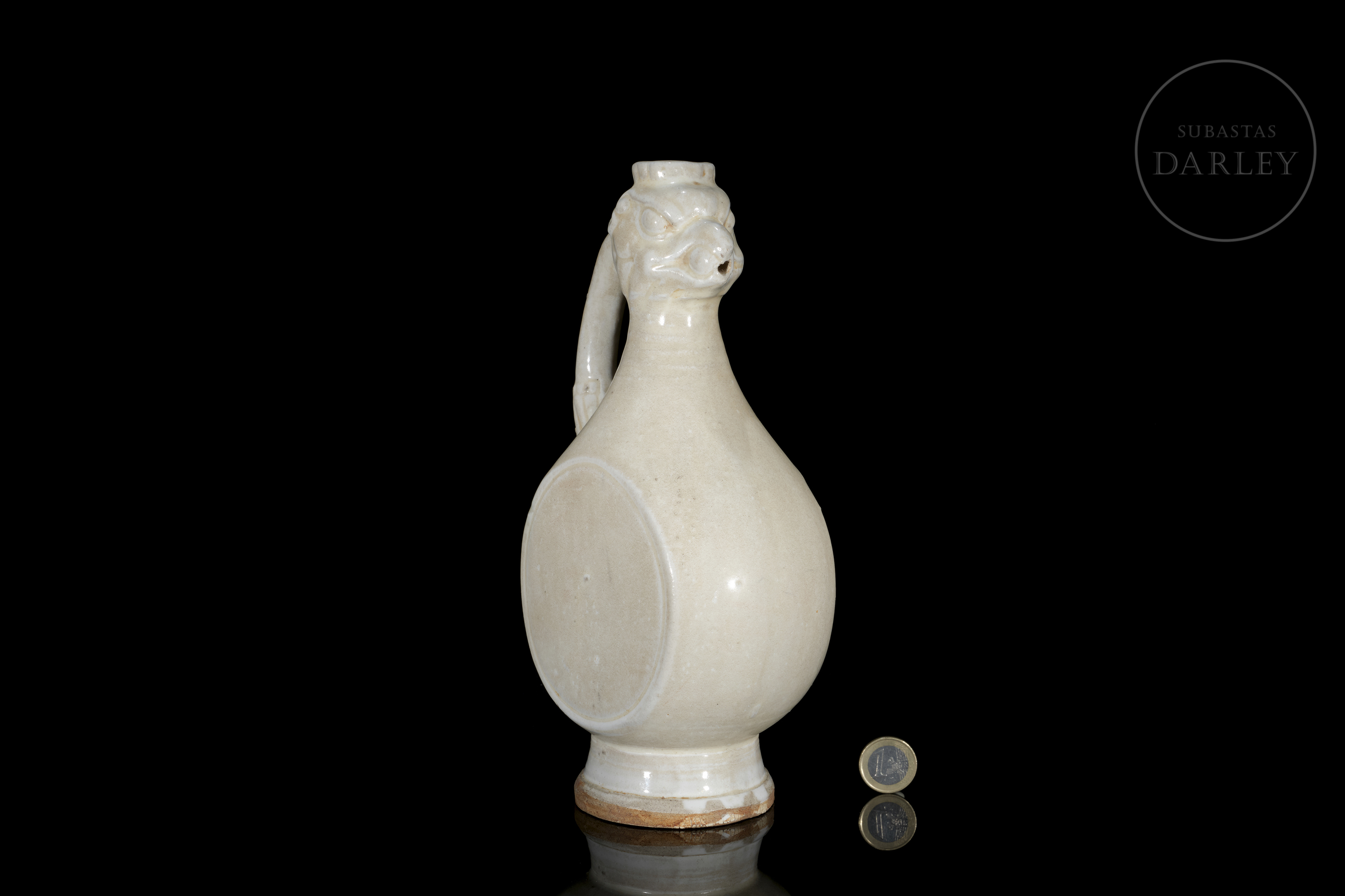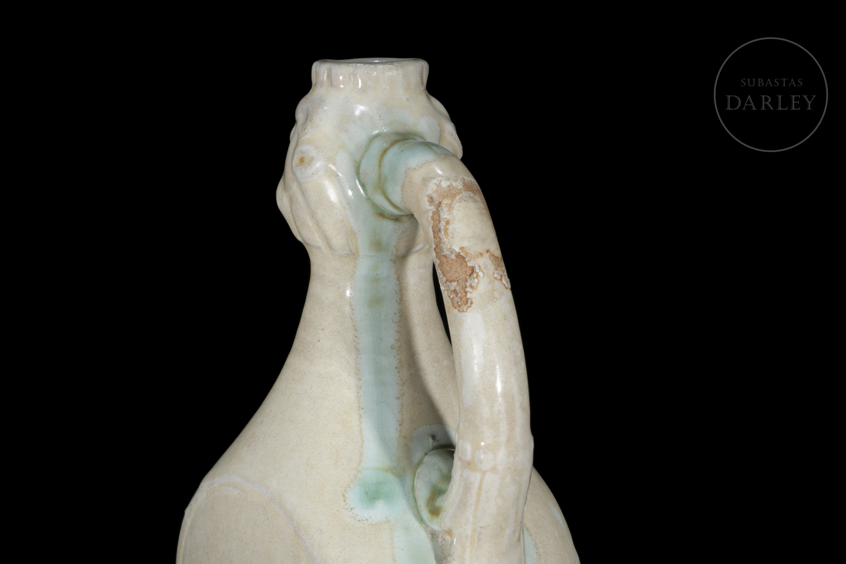 Realizada en pasta de gres, cubierta por un vidriado de tonalidad blanca, con motas celestes, característico de los hornos Xing yao. Presenta un cuerpo piriforme aplanado con dos medallones circulares lisos en el vientre. El cuello está rematado en forma de cabeza de ave fénix, con el pico abierto como vertedero. El asa, con forma de tallo vegetal o bambú, une la nuca de la criatura con el hombro de la jarra. Se asienta sobre un pie circular ligeramente acampanado, cuya base muestra la pasta cerámica al desnudo. Horno Xing Yao; finales de la dinastía Tang (618–907) o posterior.